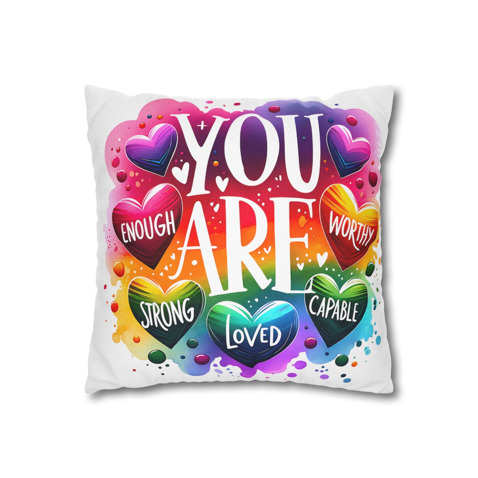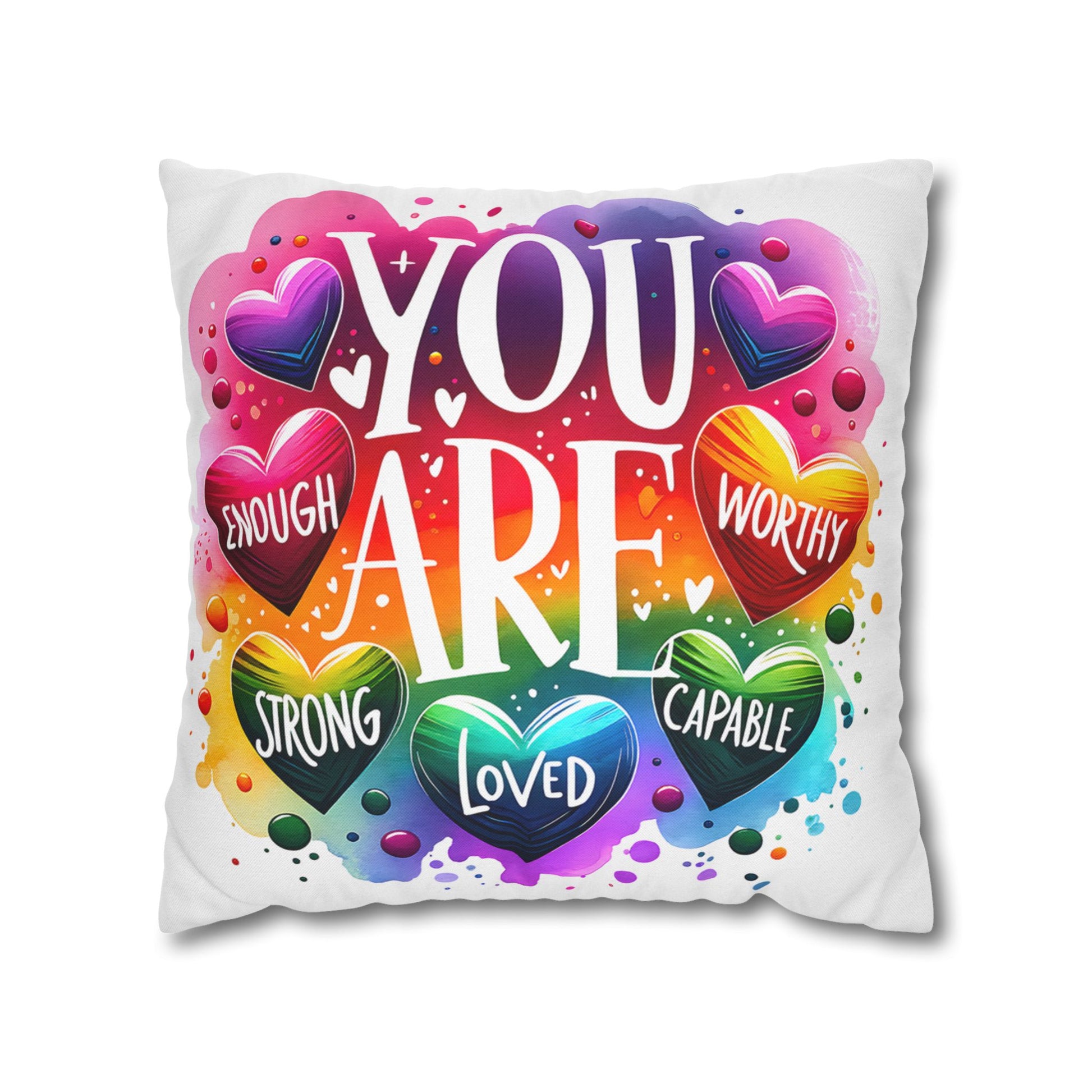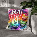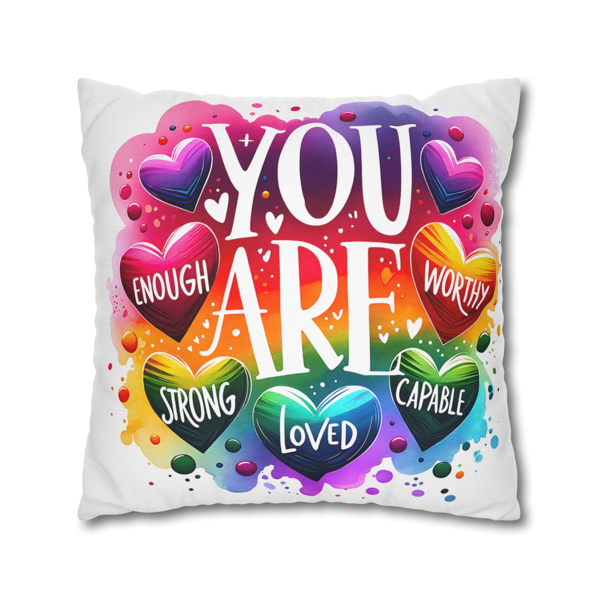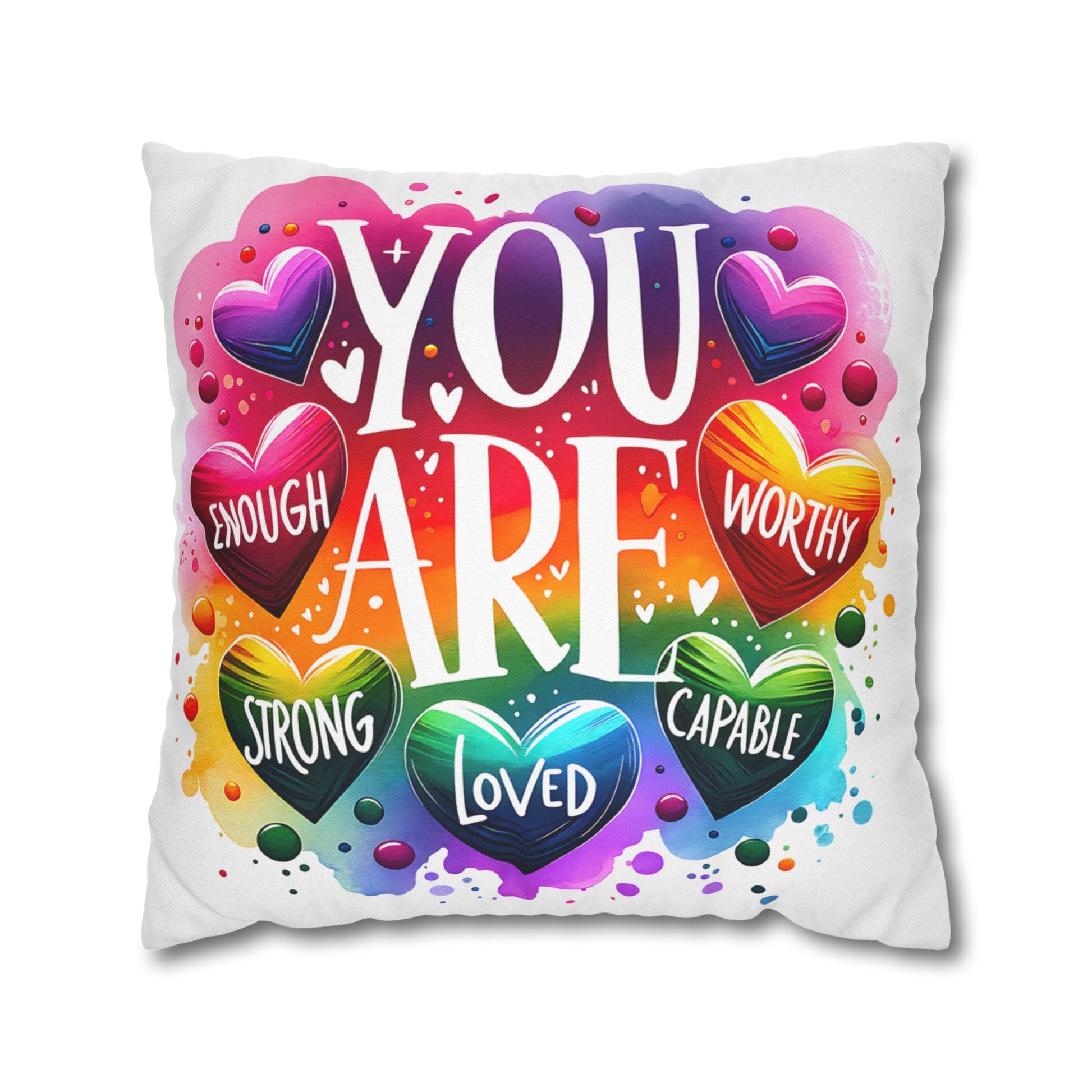 A bright, heart-filled pillowcase that reads “YOU ARE” surrounded by colorful hearts and uplifting words—strong, loved, worthy, capable, enough. The vibrant watercolor rainbow background and playful lettering bring warmth and encouragement to a bedroom, reading nook, or cozy couch. Slip this double-sided spun polyester cover over your favorite square insert to create a pocket of positivity that lights up a space and reminds someone (or yourself) of strength and worth each day.