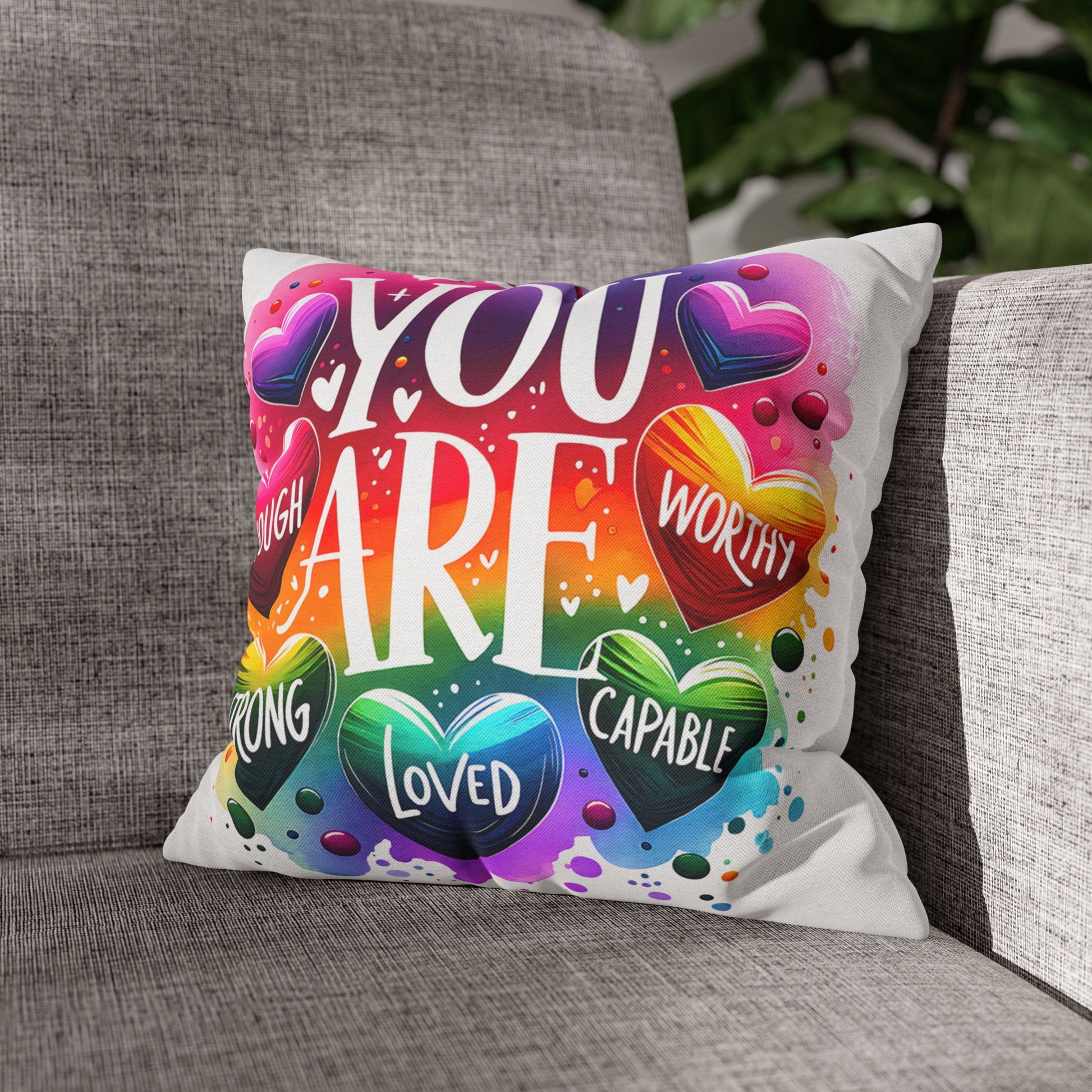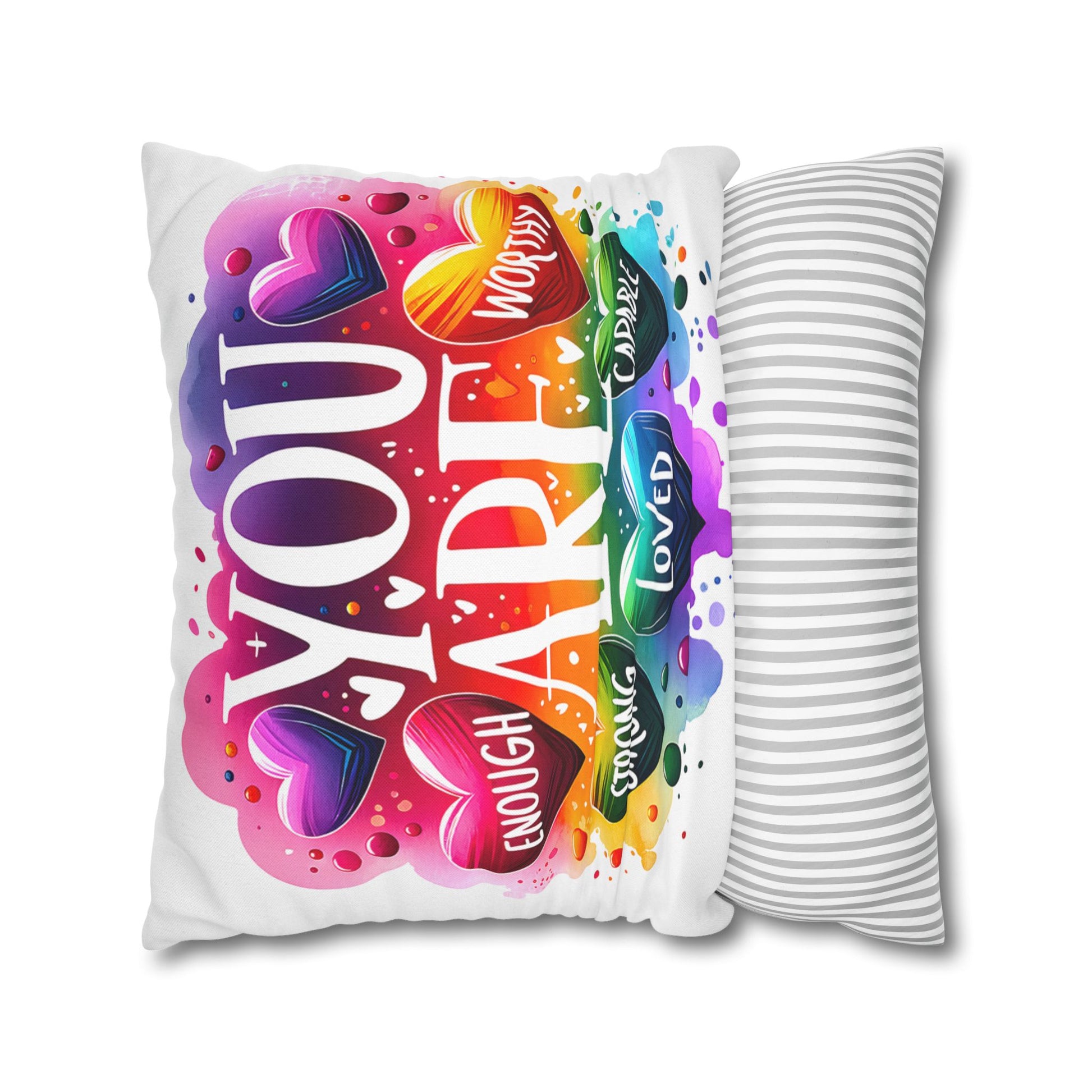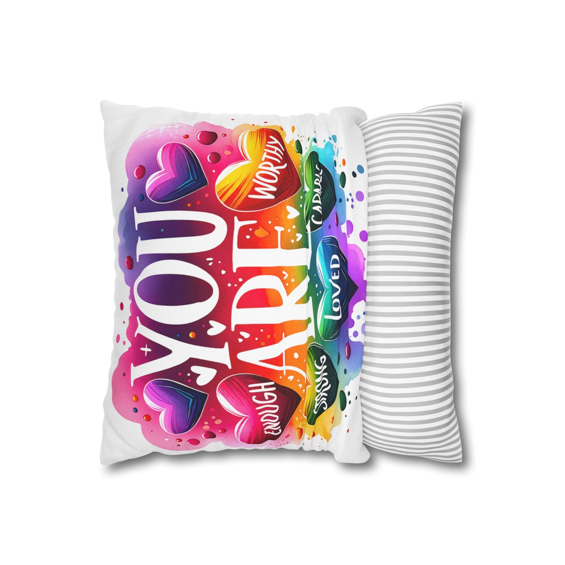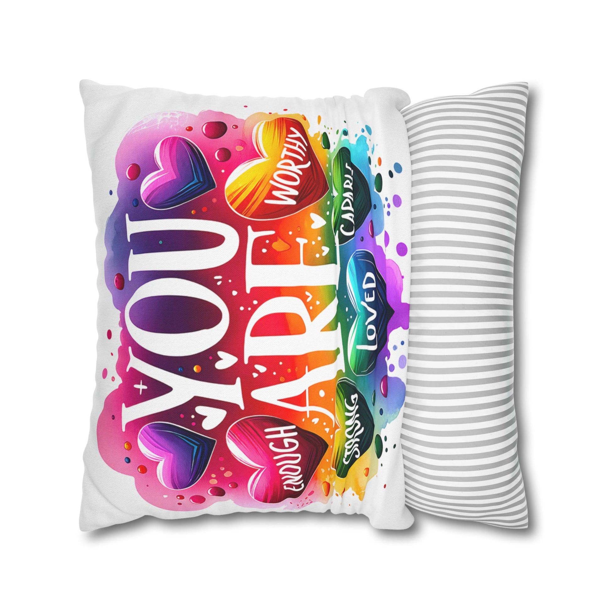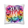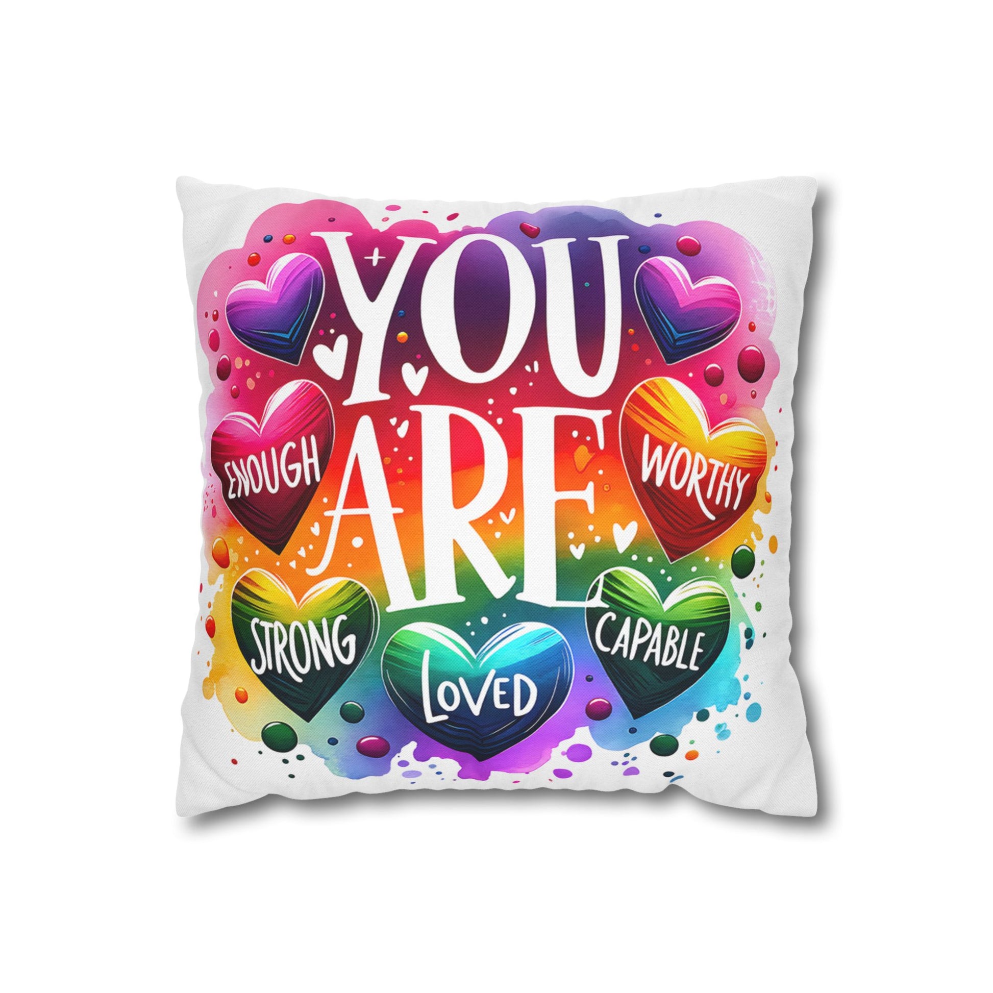 A bright, heart-filled pillowcase that reads “YOU ARE” surrounded by colorful hearts and uplifting words—strong, loved, worthy, capable, enough. The vibrant watercolor rainbow background and playful lettering bring warmth and encouragement to a bedroom, reading nook, or cozy couch. Slip this double-sided spun polyester cover over your favorite square insert to create a pocket of positivity that lights up a space and reminds someone (or yourself) of strength and worth each day.