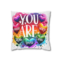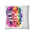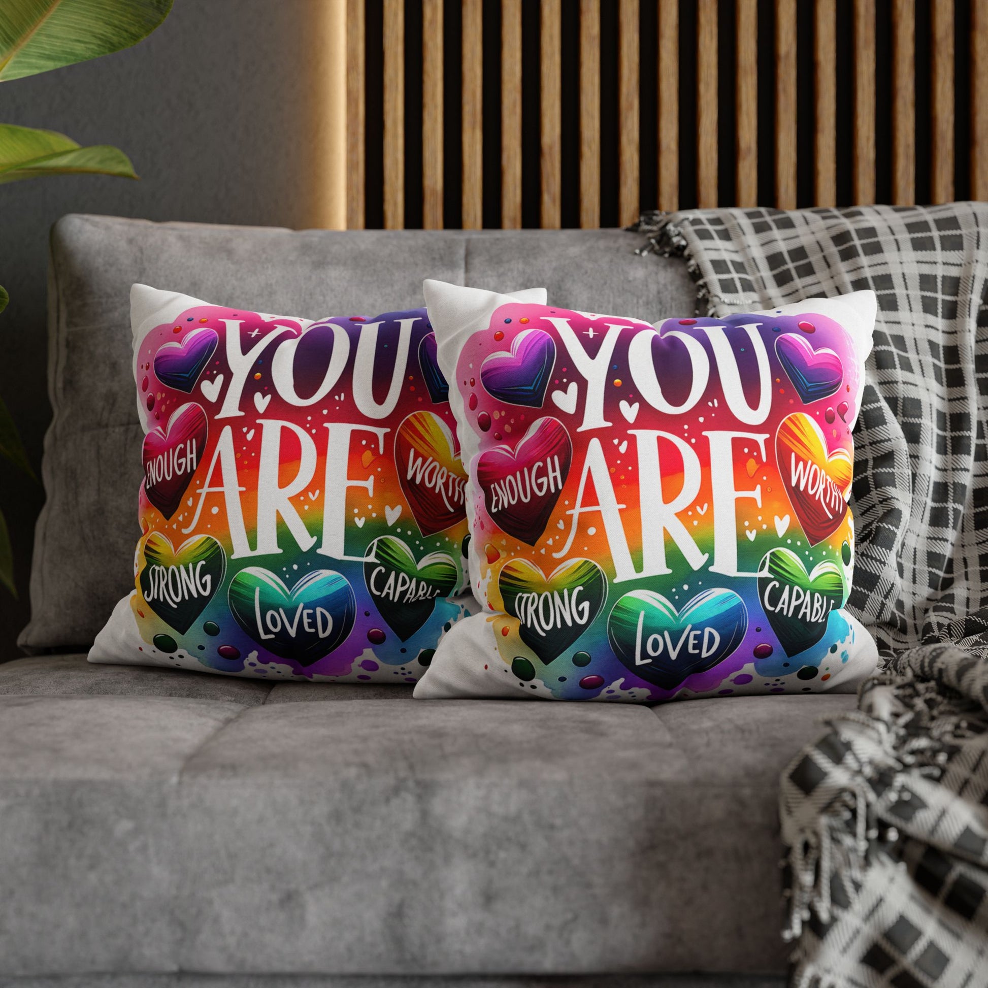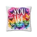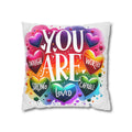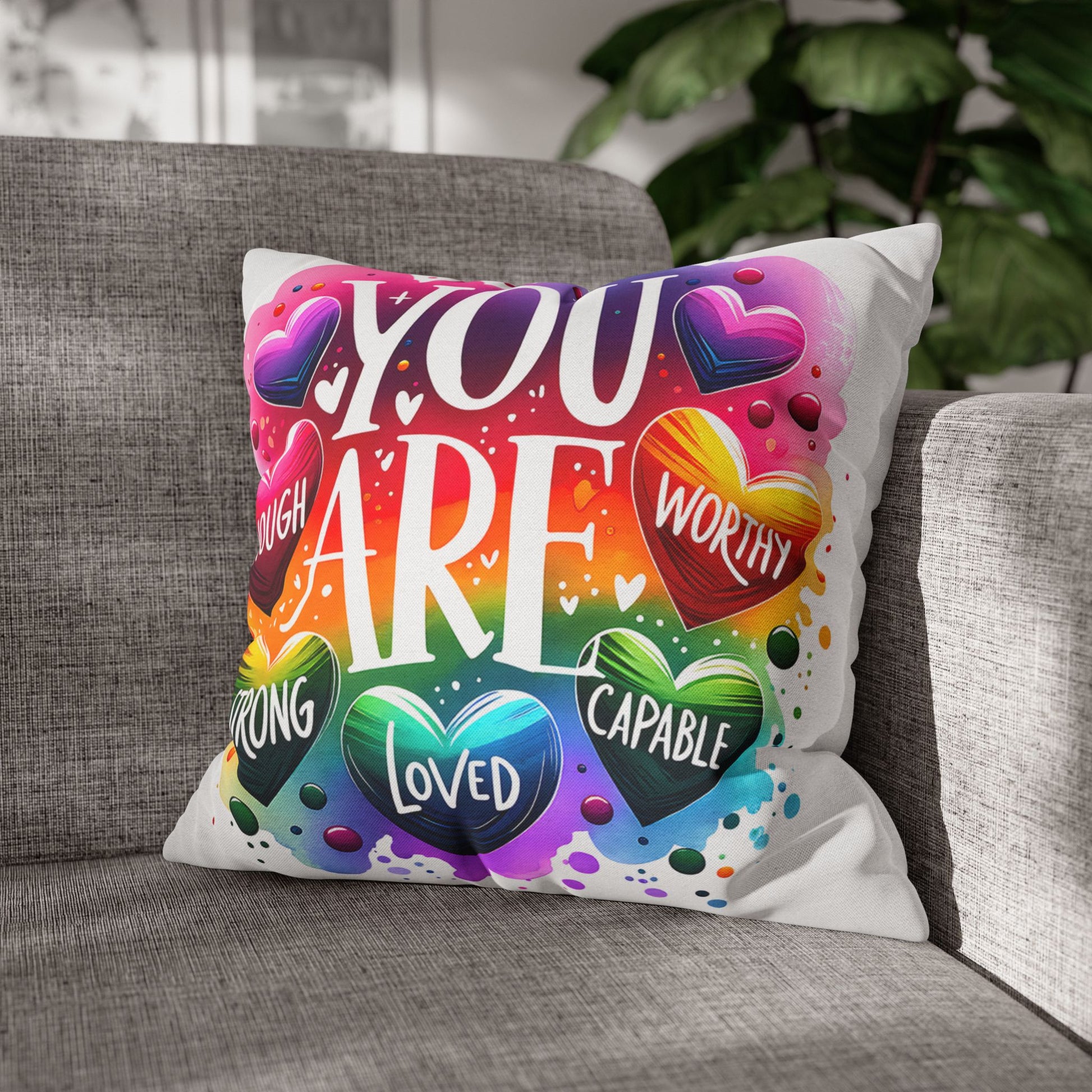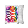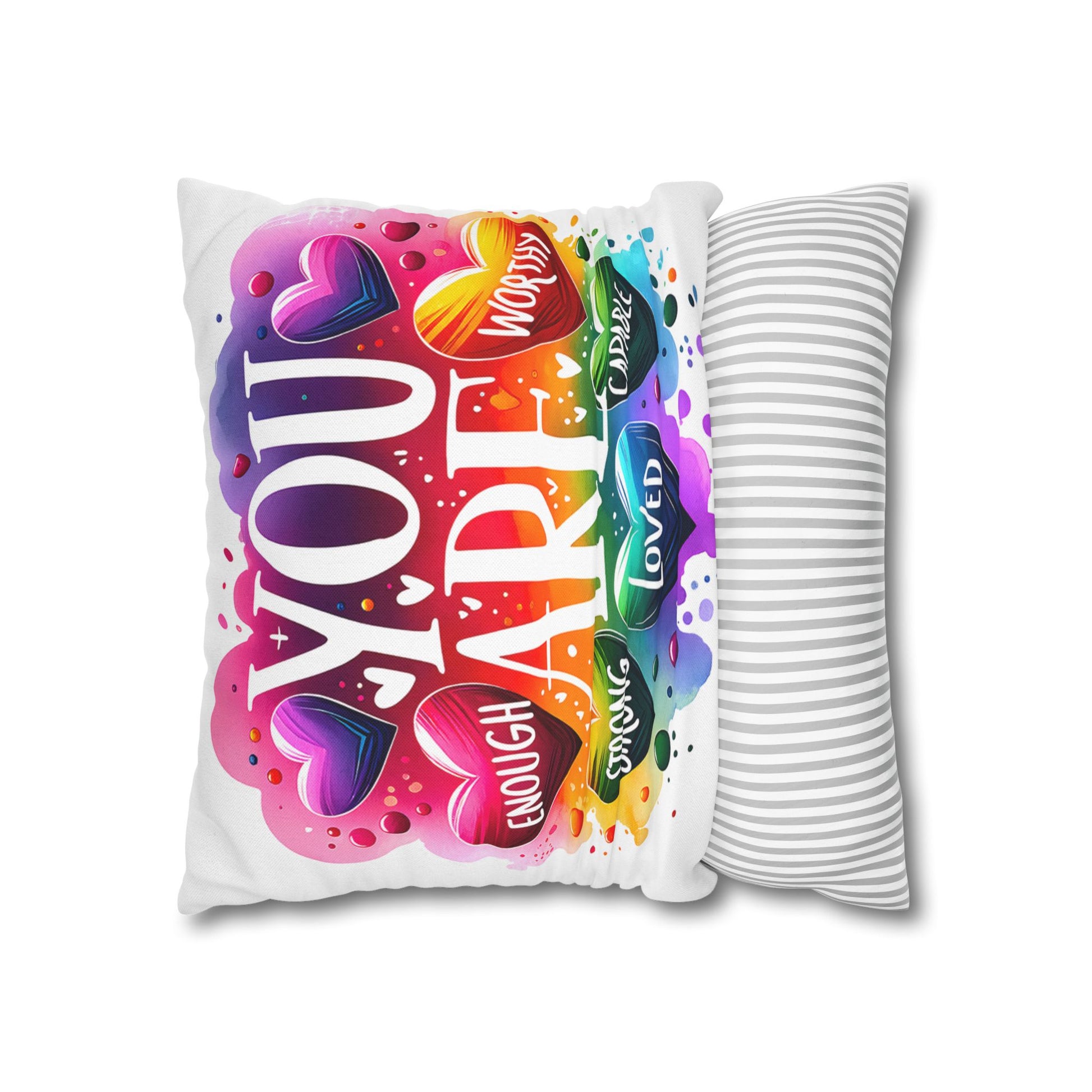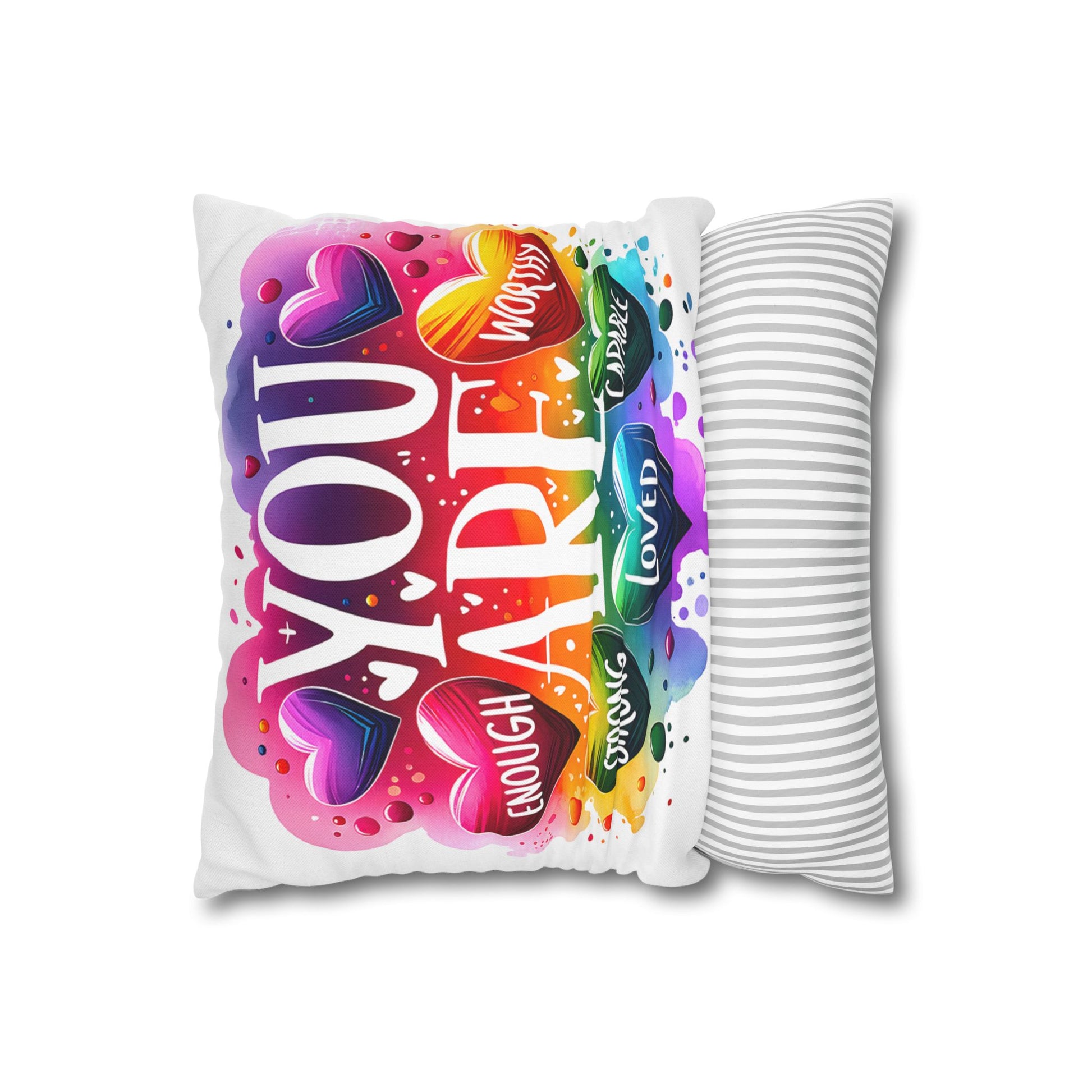 A bright, heart-filled pillowcase that reads “YOU ARE” surrounded by colorful hearts and uplifting words—strong, loved, worthy, capable, enough. The vibrant watercolor rainbow background and playful lettering bring warmth and encouragement to a bedroom, reading nook, or cozy couch. Slip this double-sided spun polyester cover over your favorite square insert to create a pocket of positivity that lights up a space and reminds someone (or yourself) of strength and worth each day.