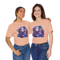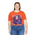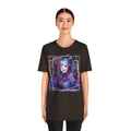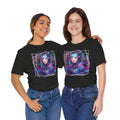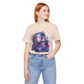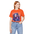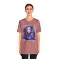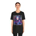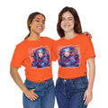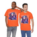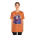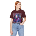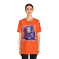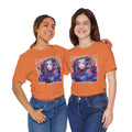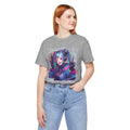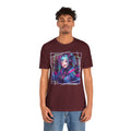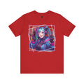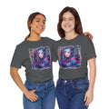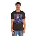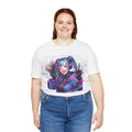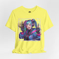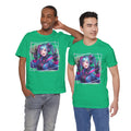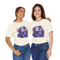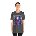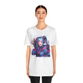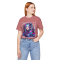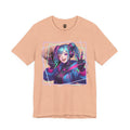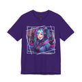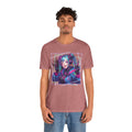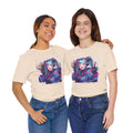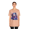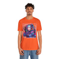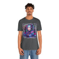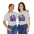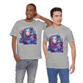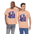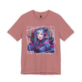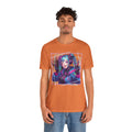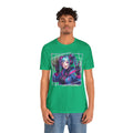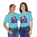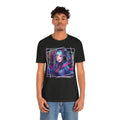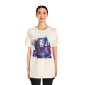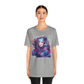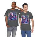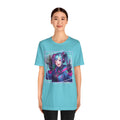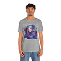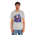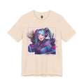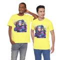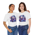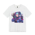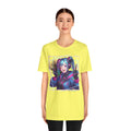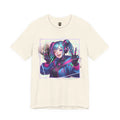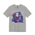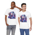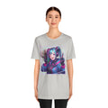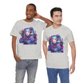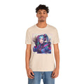A soft, breathable tee that brings neon-pop energy to everyday wear. The lightweight Airlume combed cotton feels smooth against the skin while the retail crew neckline keeps the look tidy and easy to layer. A vibrant full-front illustration pops in electric cyan, magenta and purple — playful, confident, and a little rebellious. This shirt sits comfortably through long convention days, casual hangouts, or late-night streaming sessions. It’s built to hold its shape: side seams and shoulder tape keep the fit consistent, and the ribbed collar bounces back wash after wash. The tear-away label reduces irritation so the focus stays on the art and the moment.