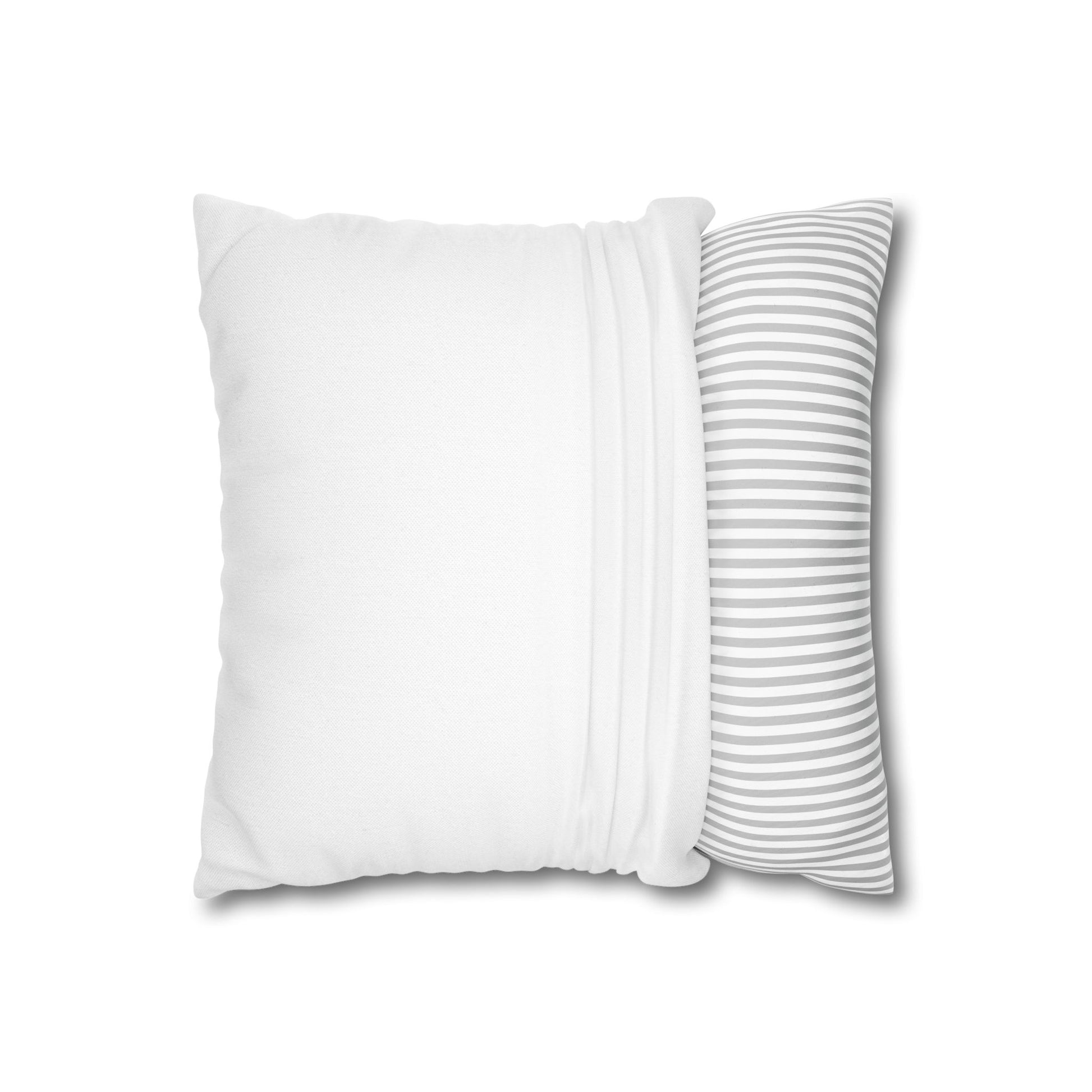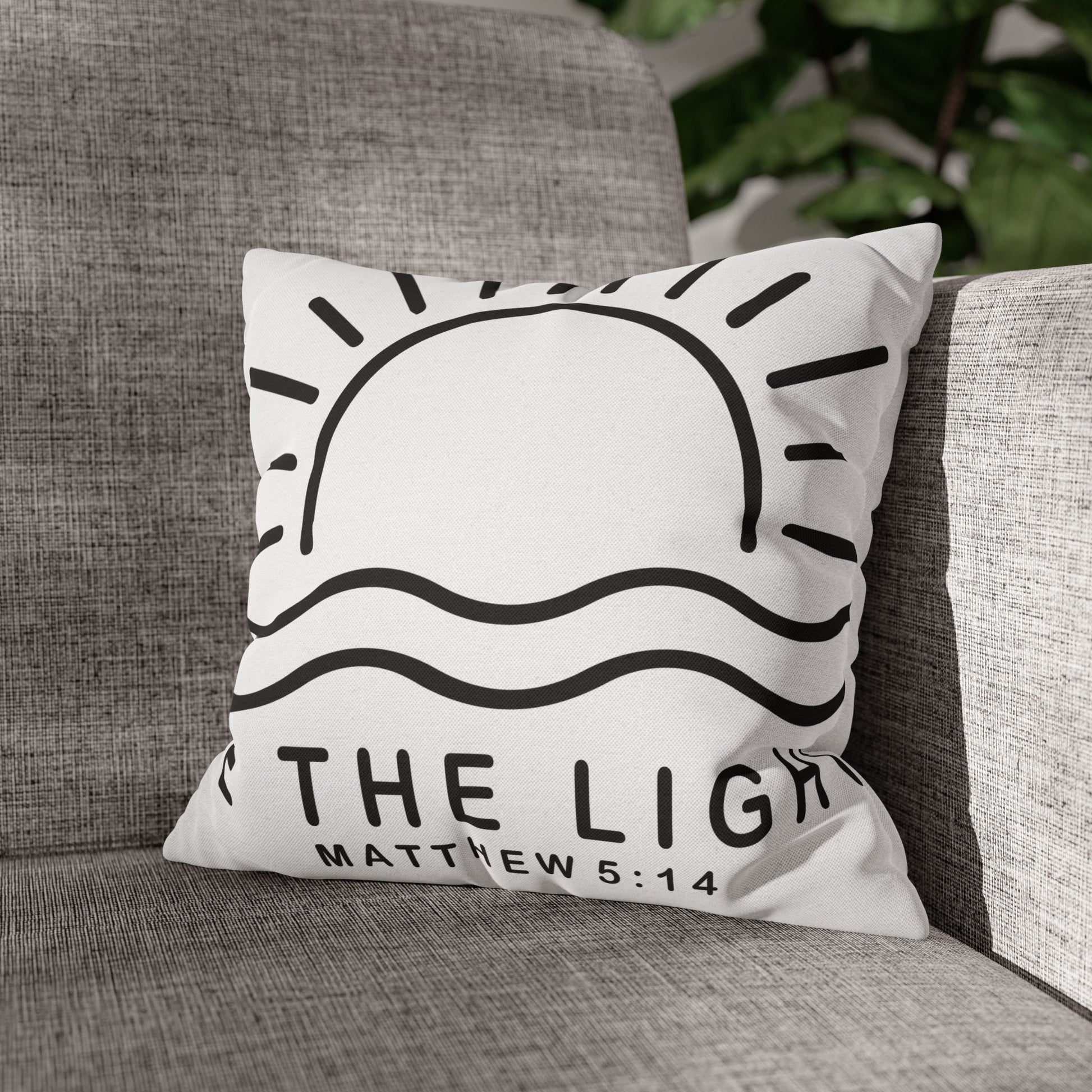 A bright, simple throw pillow cover that gently reminds the room to breathe and shine. The front shows a clean line-art sun rising over soft waves with the words “Be The Light” and Matthew 5:14 tucked beneath — a quiet, hopeful message that reads like a gentle invitation. The reverse has narrow gray-and-white stripes for a calm, modern contrast that pairs easily with layered textures. The spun polyester keeps the cover smooth and unwrinkled, and the concealed beige zipper keeps the silhouette tidy. Slip this cover over your own insert to add a subtle, faith-forward accent to a reading nook, nursery, or living room corner.