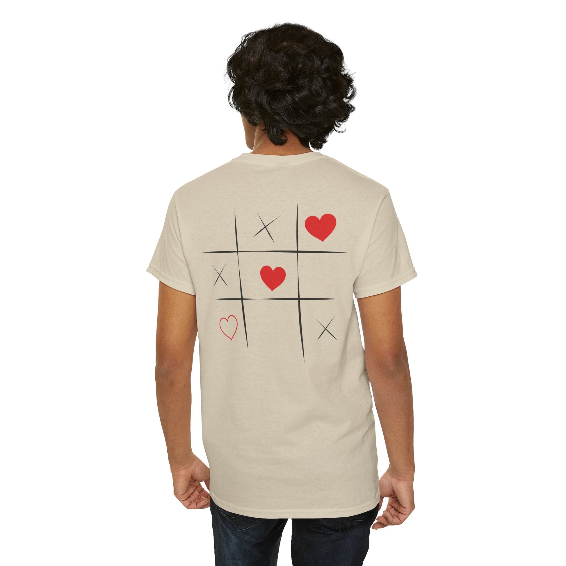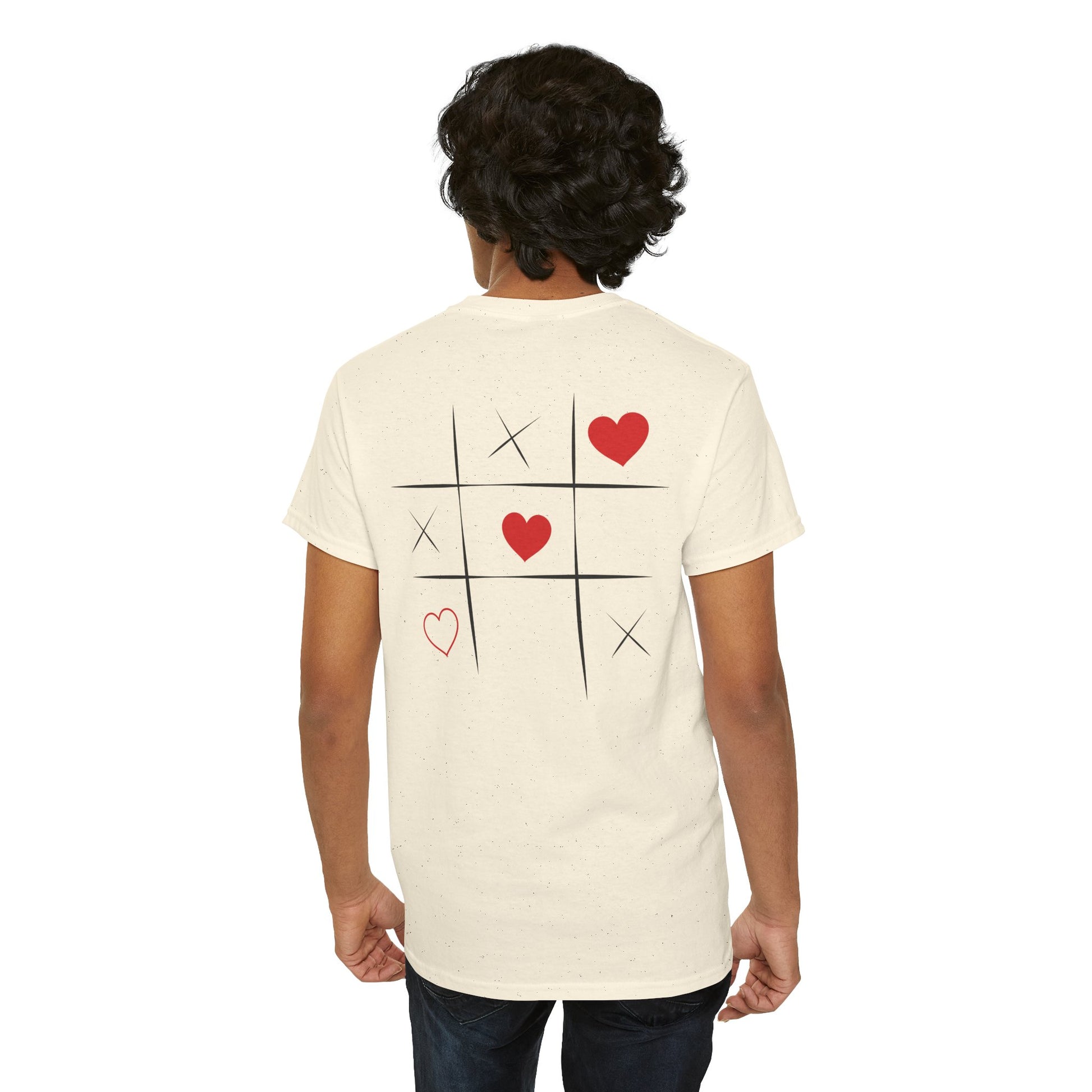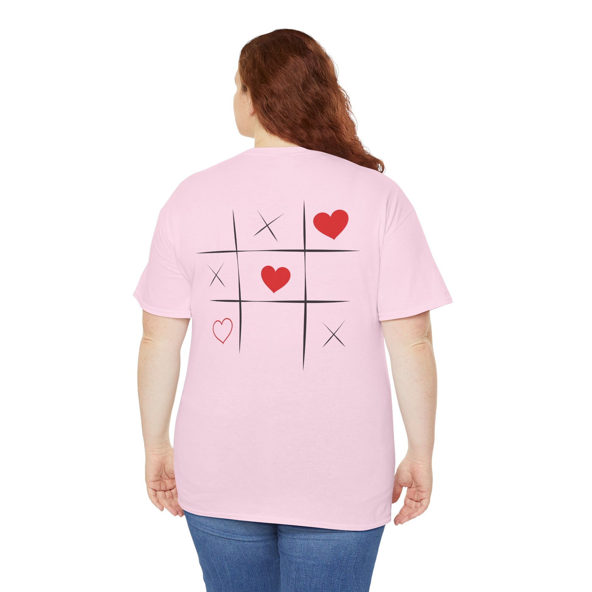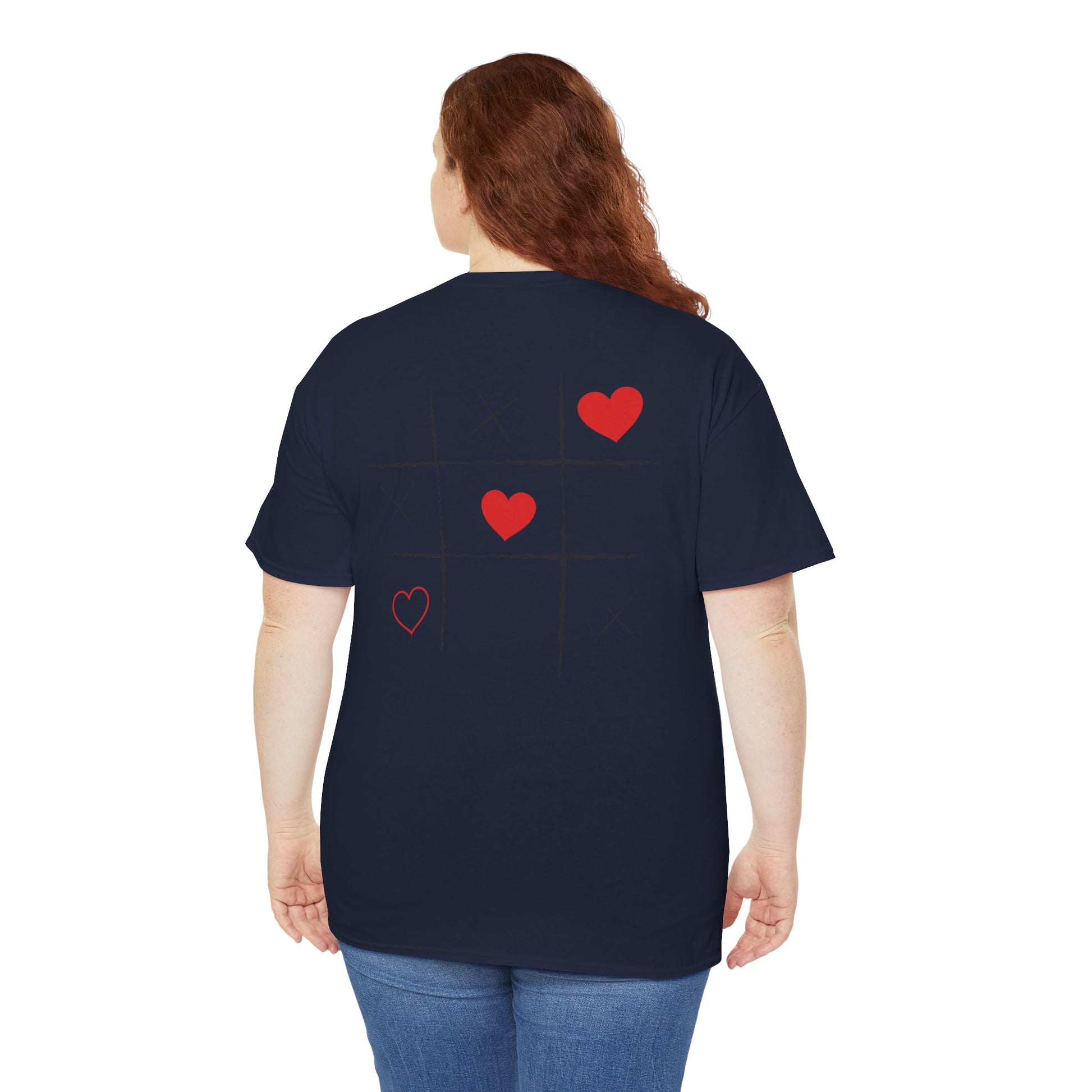 Soft, casual tee that reads like a playful note from someone who loves clever, low-key romance. The front shows bold, slightly vintage lettering reading “Cuter Than Cupid” with a small heart accent, framed by tiny patterned borders. The back keeps things light: a minimalist tic‑tac‑toe grid dotted with little hearts and Xs — simple, sweet, and a touch cheeky. It feels like a warm, easygoing layer you pull on for coffee dates, school events, or evenings out when you want to wink without saying a word. The fabric has enough weight to hang nicely while staying breathable, and the ribbed collar plus shoulder taping keep the shape after washing so the print stays centered and crisp. This tee sits comfortably in wardrobes that favor casual charm and quietly romantic statements.