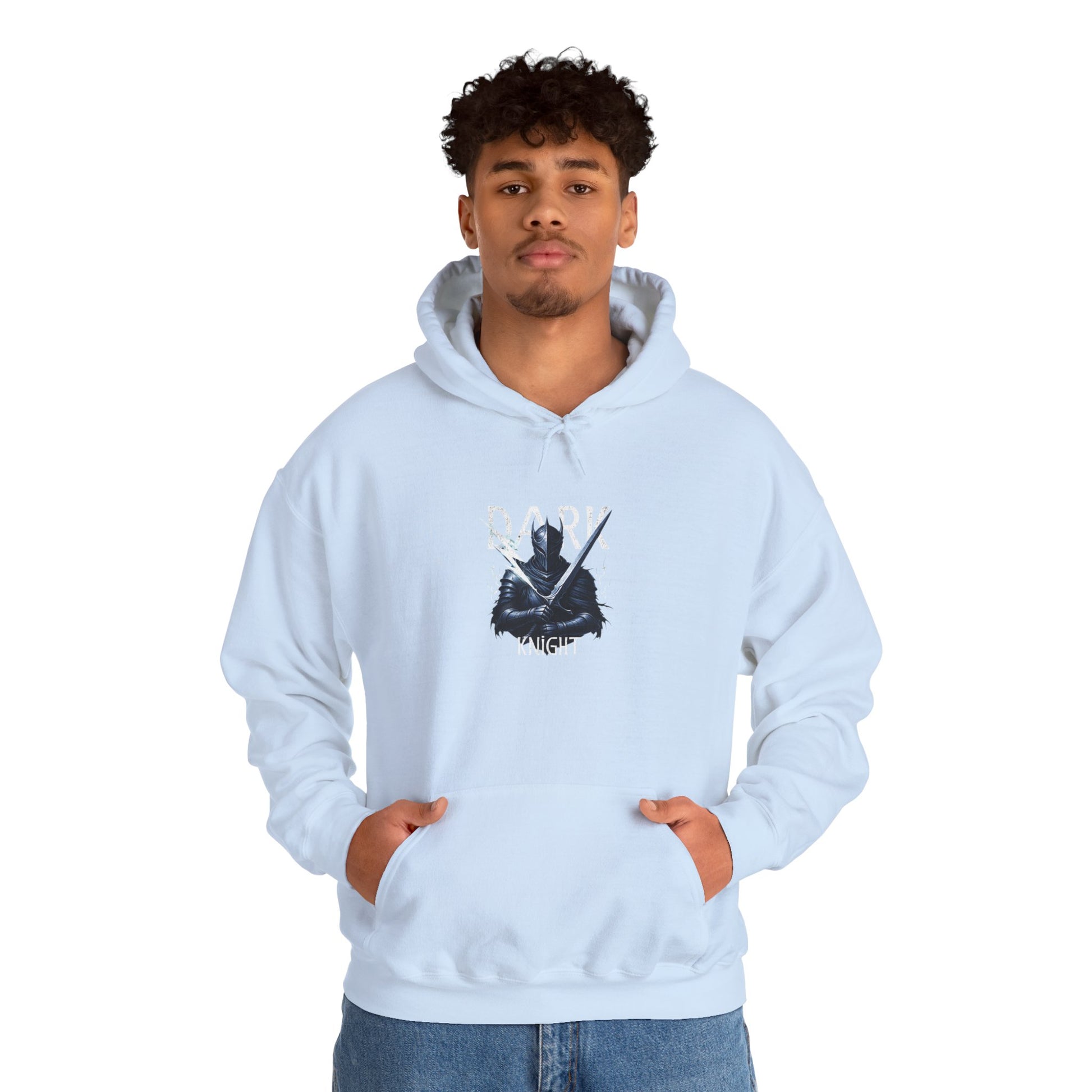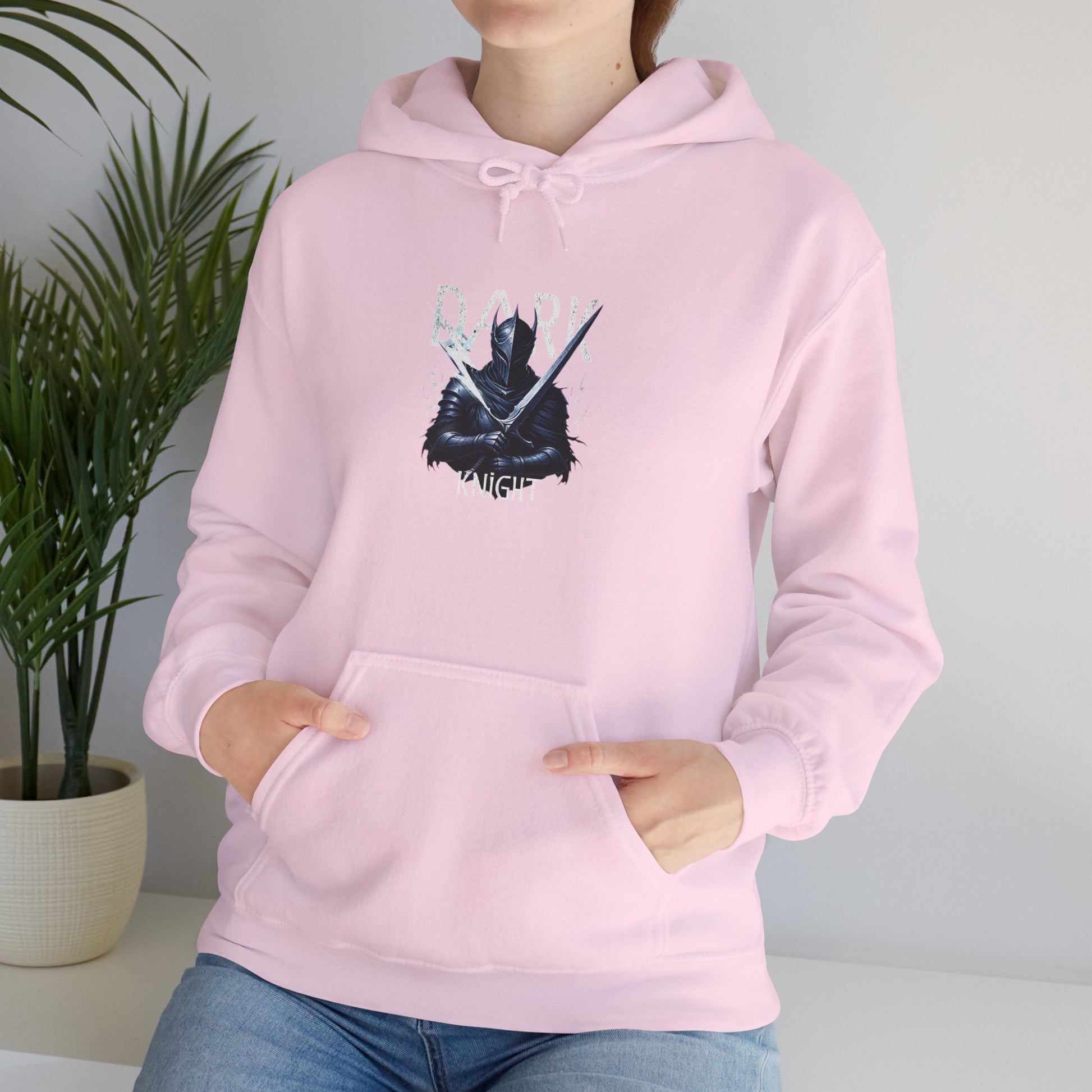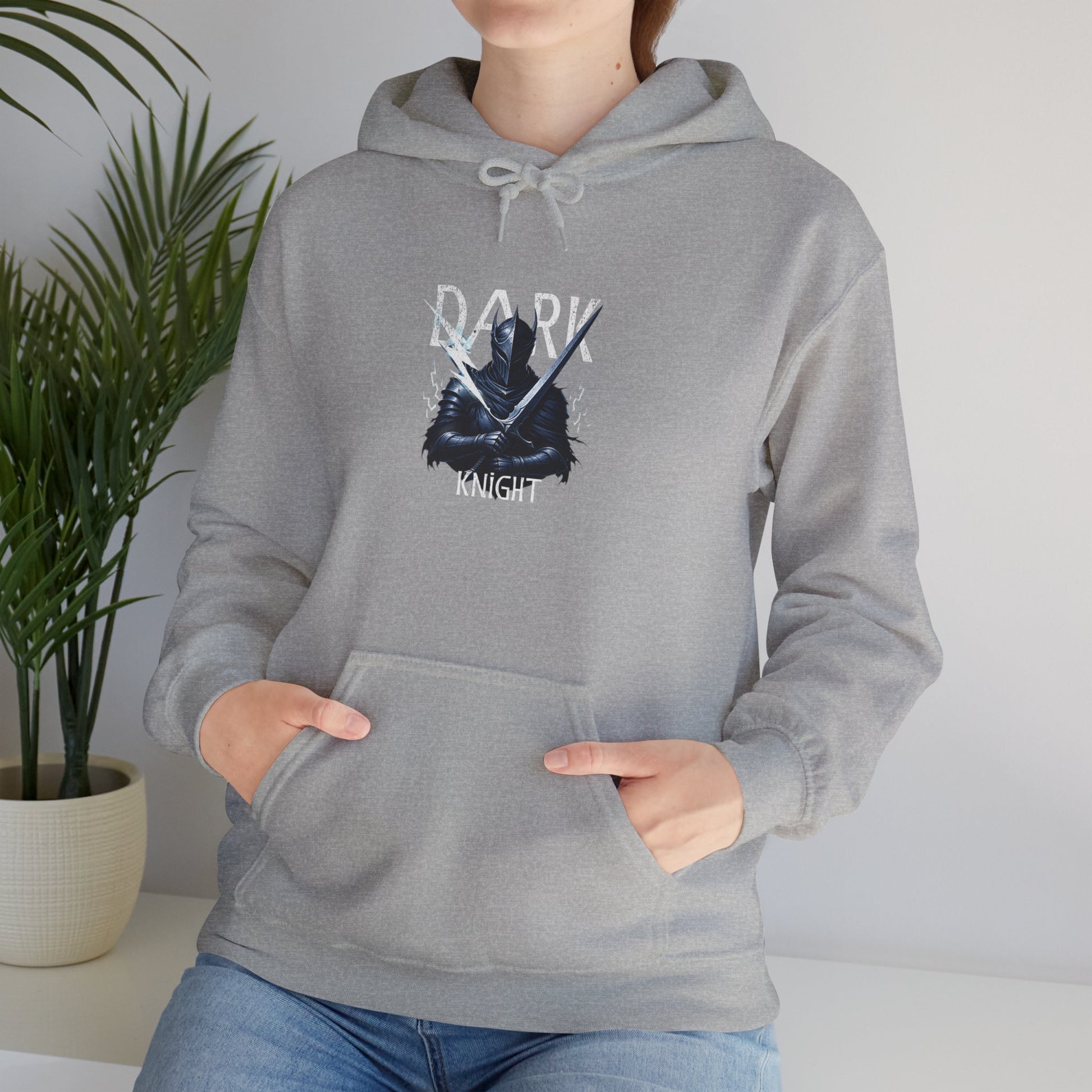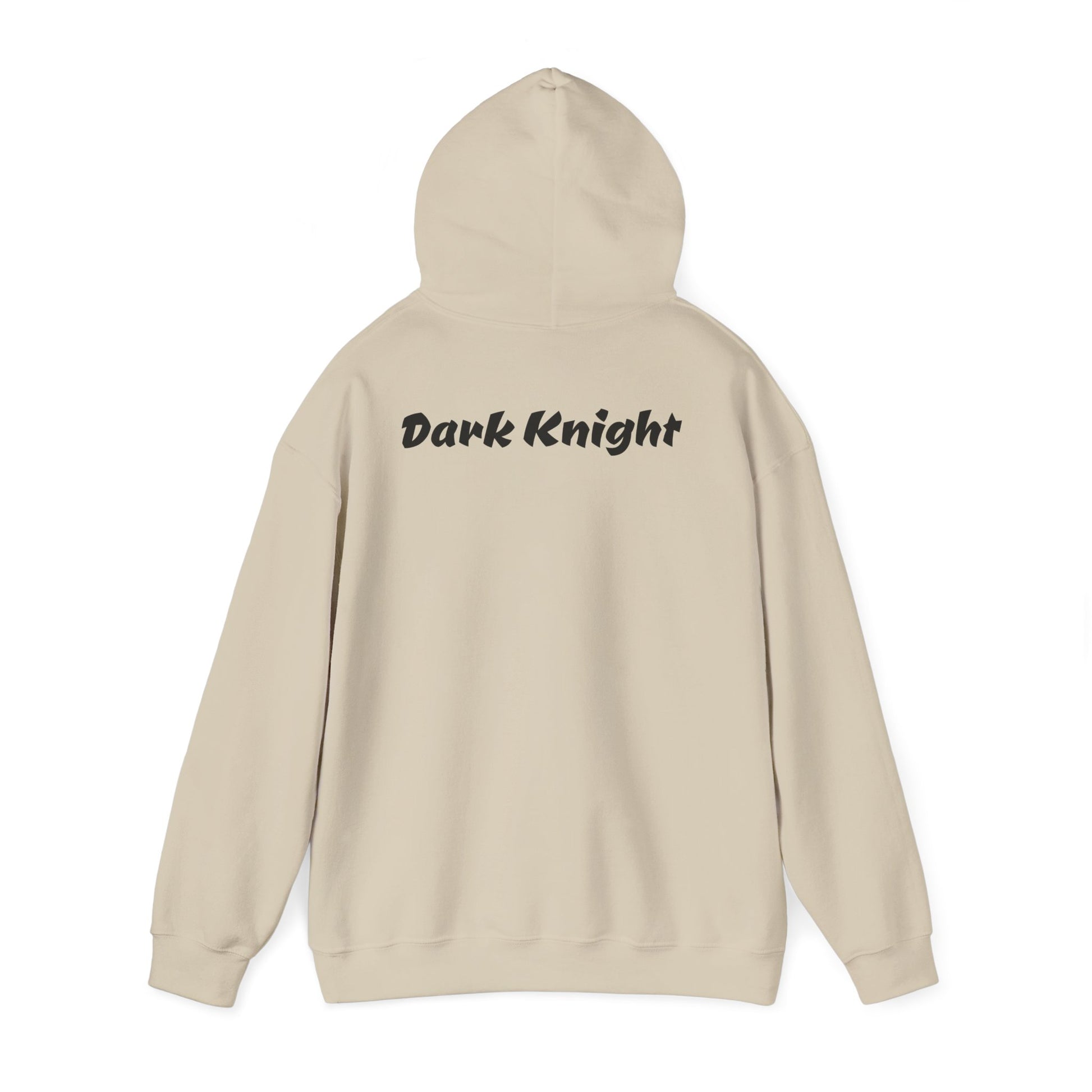 Wrap yourself in a quiet, cinematic kind of comfort. This soft, medium-heavy hoodie carries a moody graphic — a lone, armored silhouette framed by shards of light and the word “DARK” above a smaller “KNIGHT” — that feels like a night walk through neon rain or the final scene of a midnight film. The pouch pocket warms your hands; the double-lined hood and color-matched drawcord add subtle, durable detailing. It’s the layer you reach for when you want to feel grounded, low-key bold, and a little mysterious.