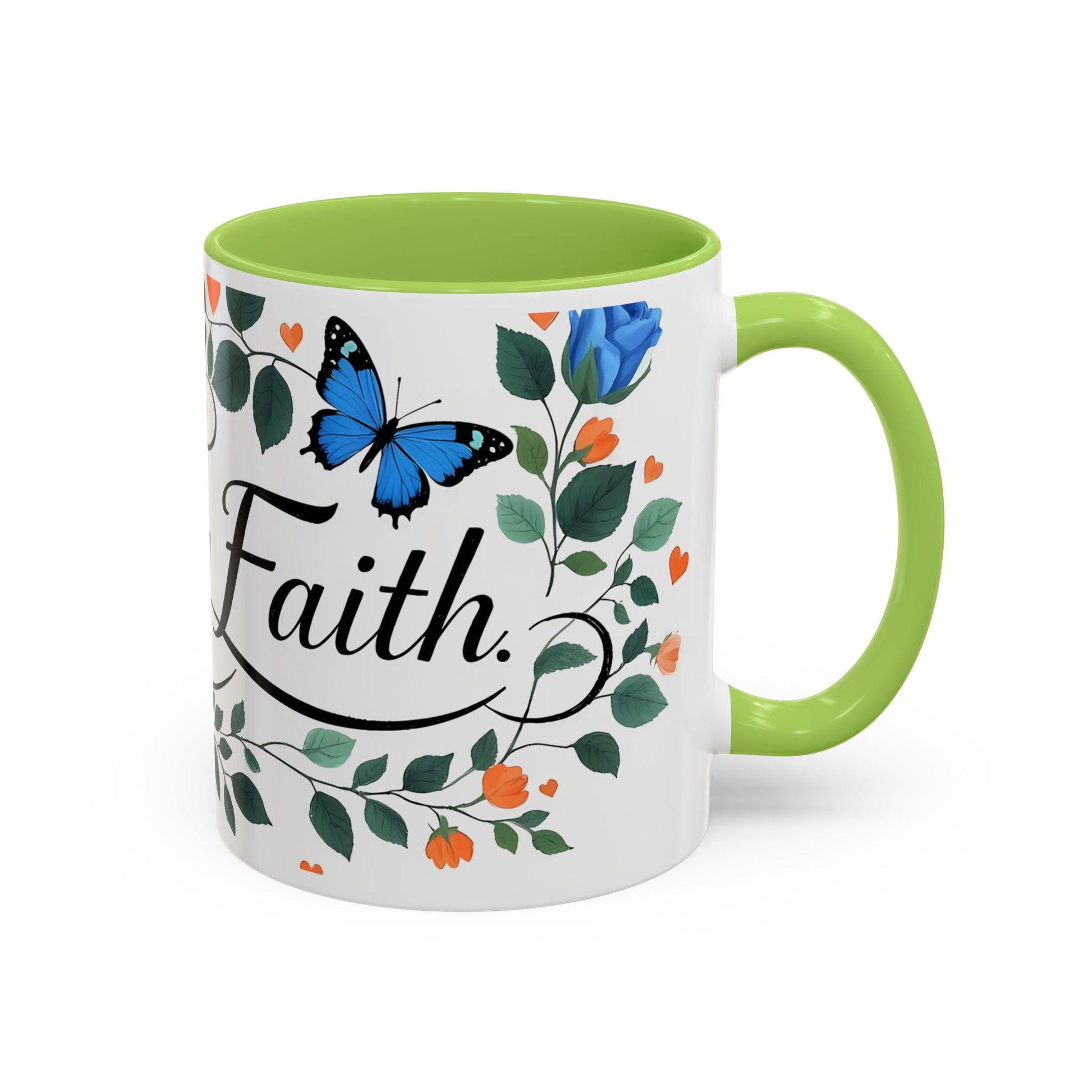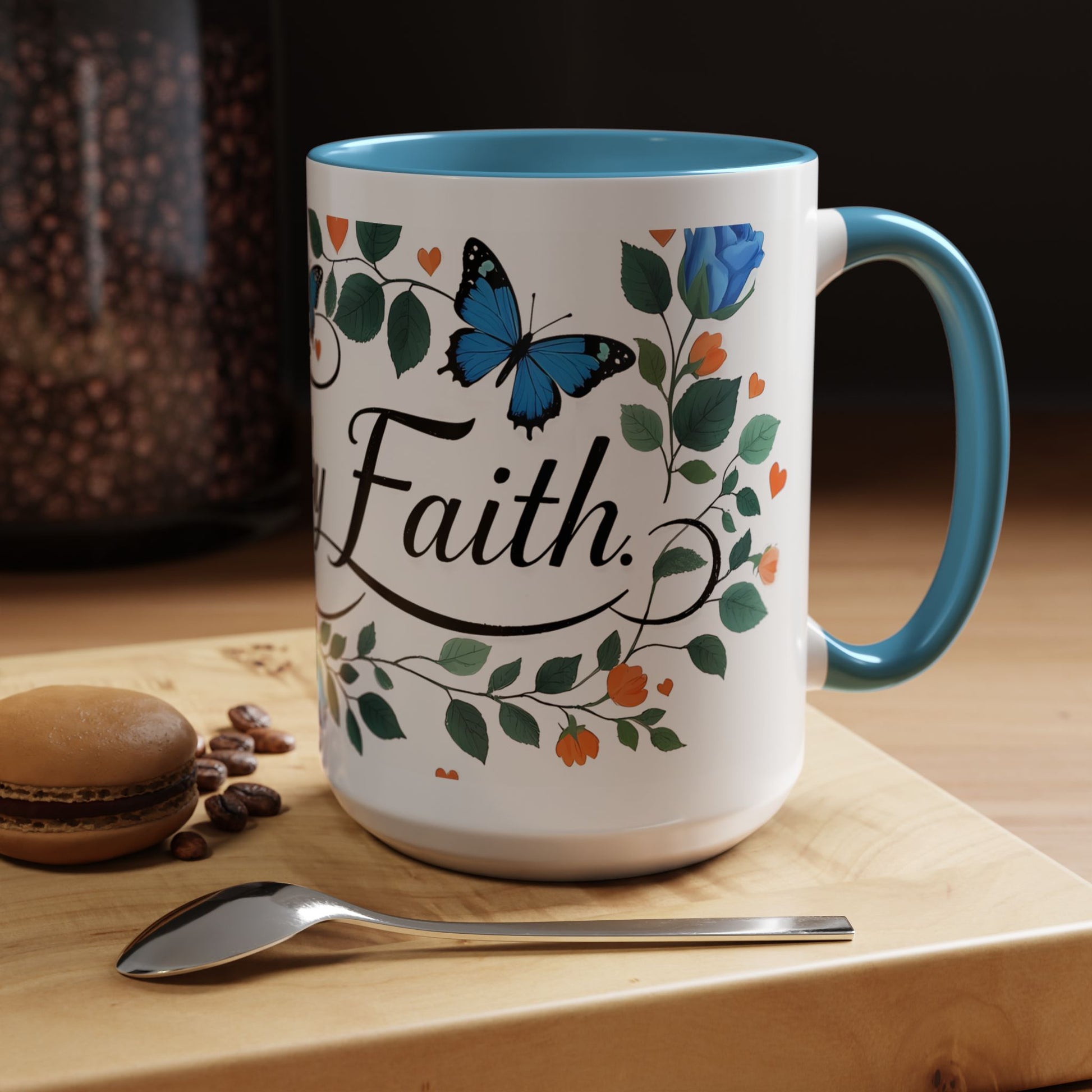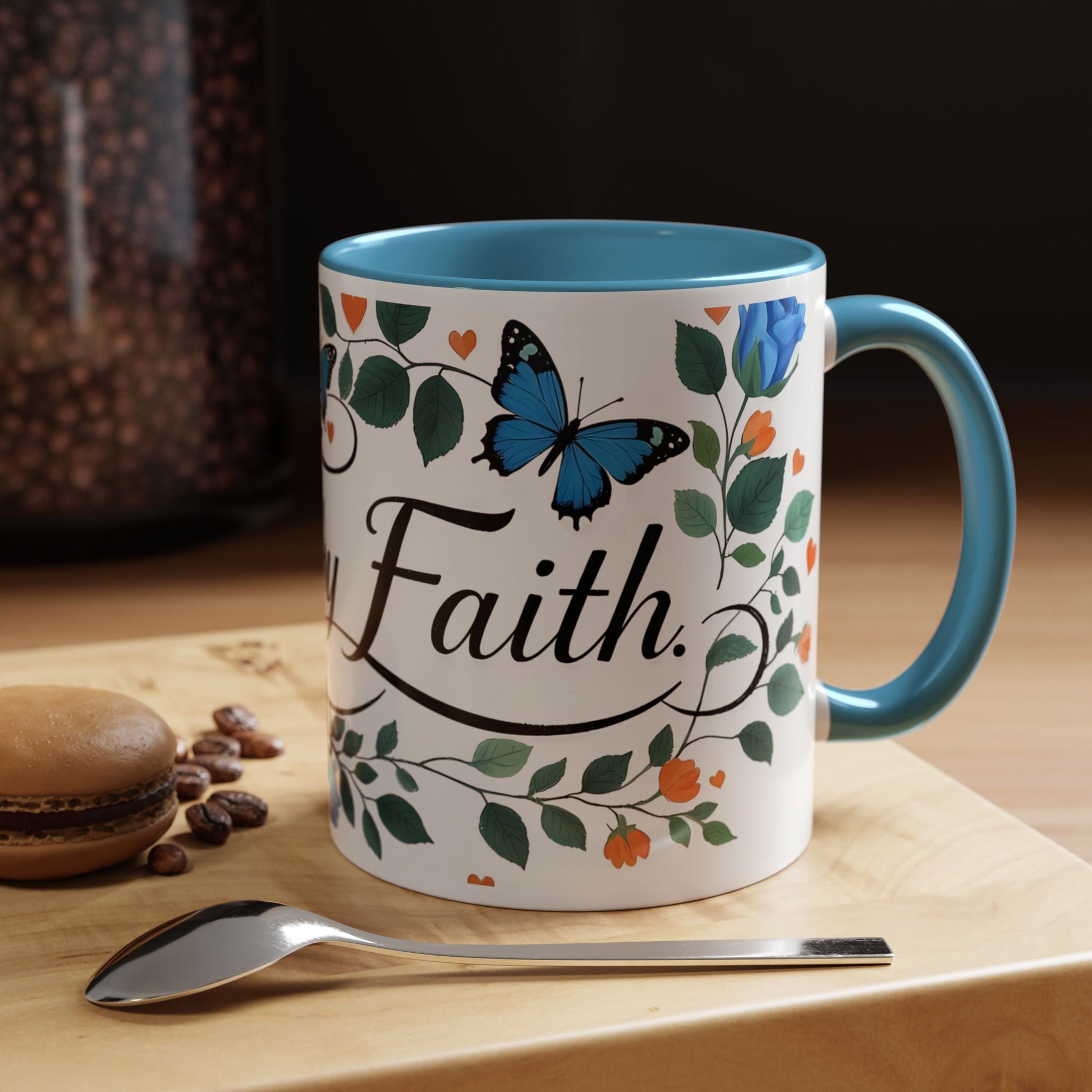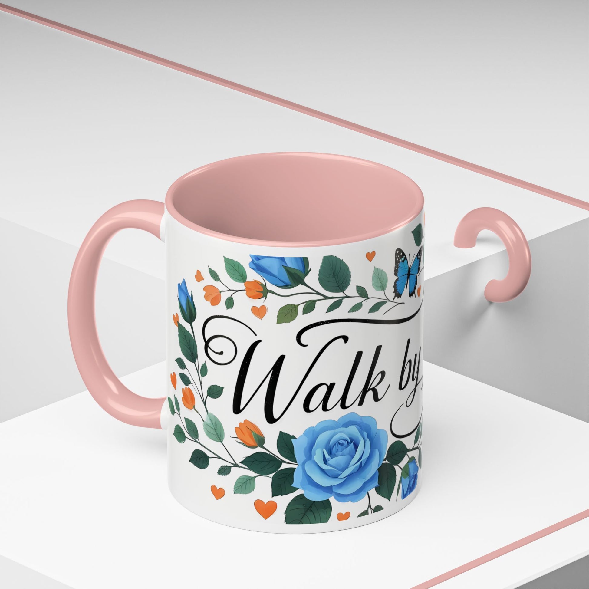 Warm, quiet mornings with a favorite book and a steady ritual. This ceramic mug brings a gentle, hopeful presence to that moment — soft blue roses and fluttering butterflies weave around graceful lettering that invites calm and reflection. The colored interior and handle add a playful contrast that lifts the design without shouting. It feels like a small altar for daily intention: sip slowly, breathe, and carry a little faith into the day.