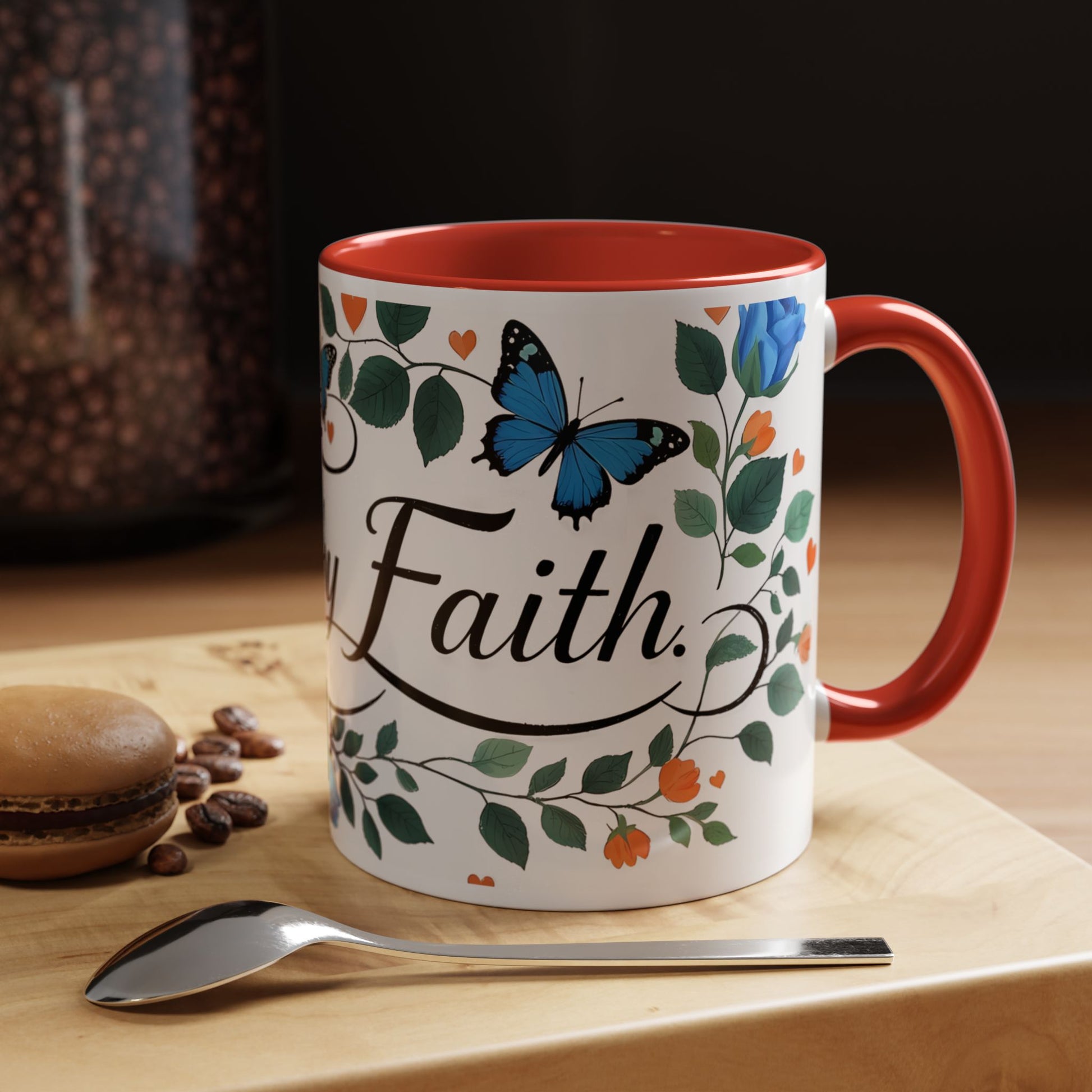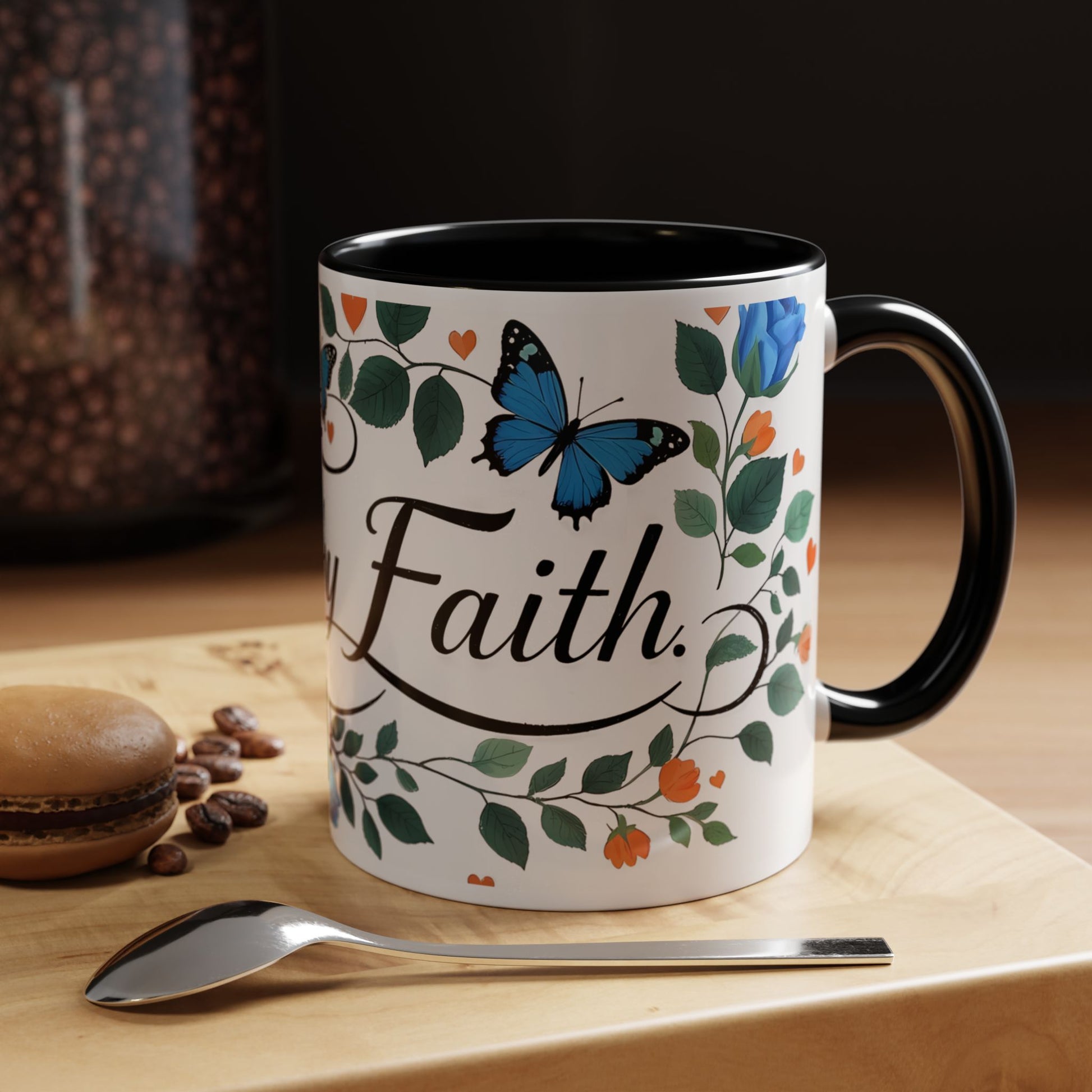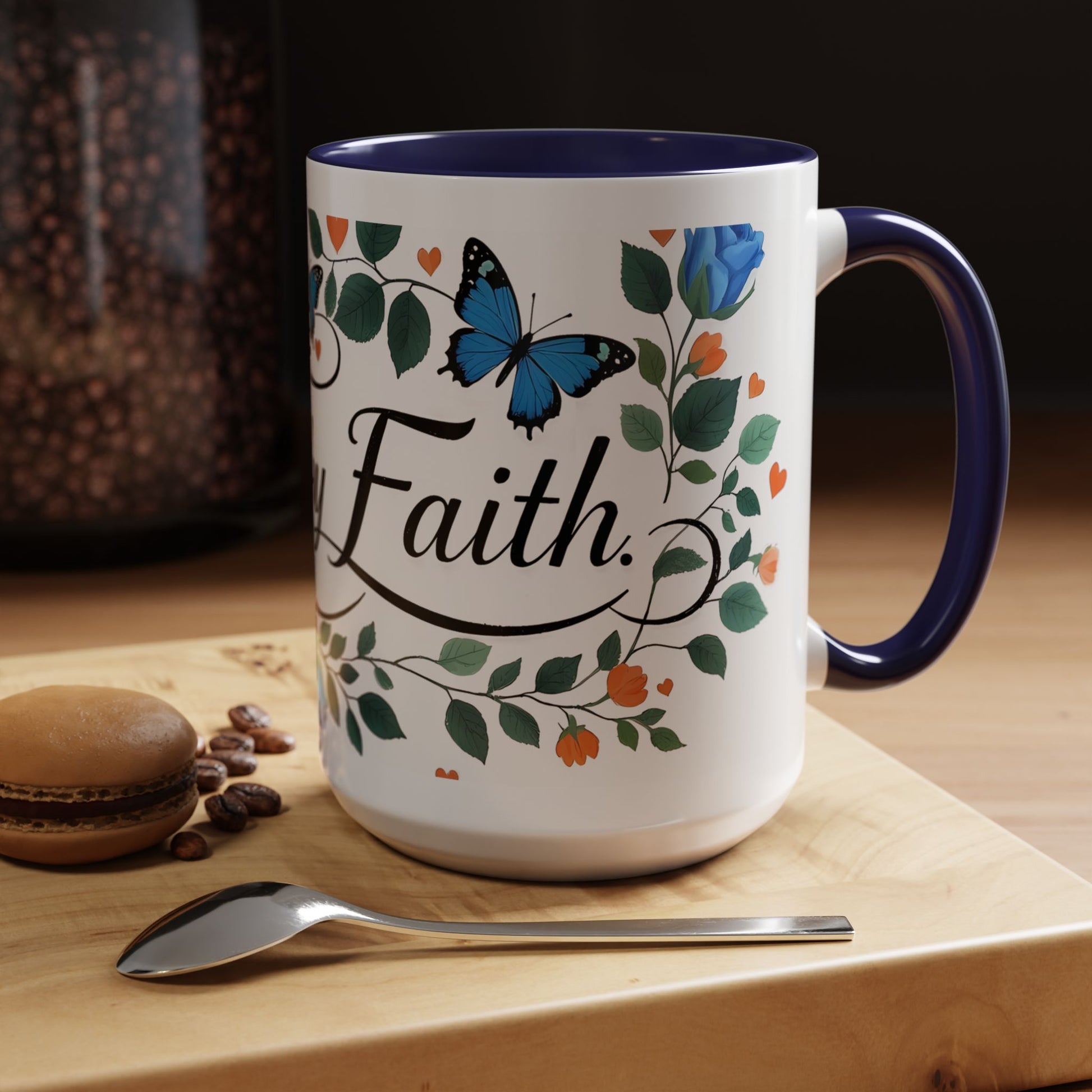 Warm, quiet mornings with a favorite book and a steady ritual. This ceramic mug brings a gentle, hopeful presence to that moment — soft blue roses and fluttering butterflies weave around graceful lettering that invites calm and reflection. The colored interior and handle add a playful contrast that lifts the design without shouting. It feels like a small altar for daily intention: sip slowly, breathe, and carry a little faith into the day.