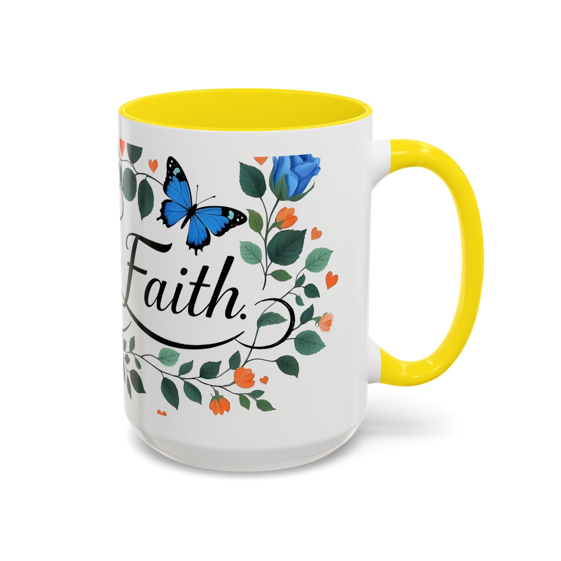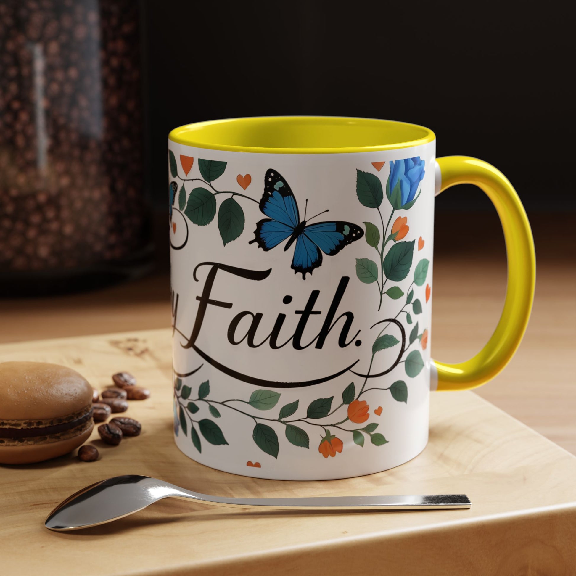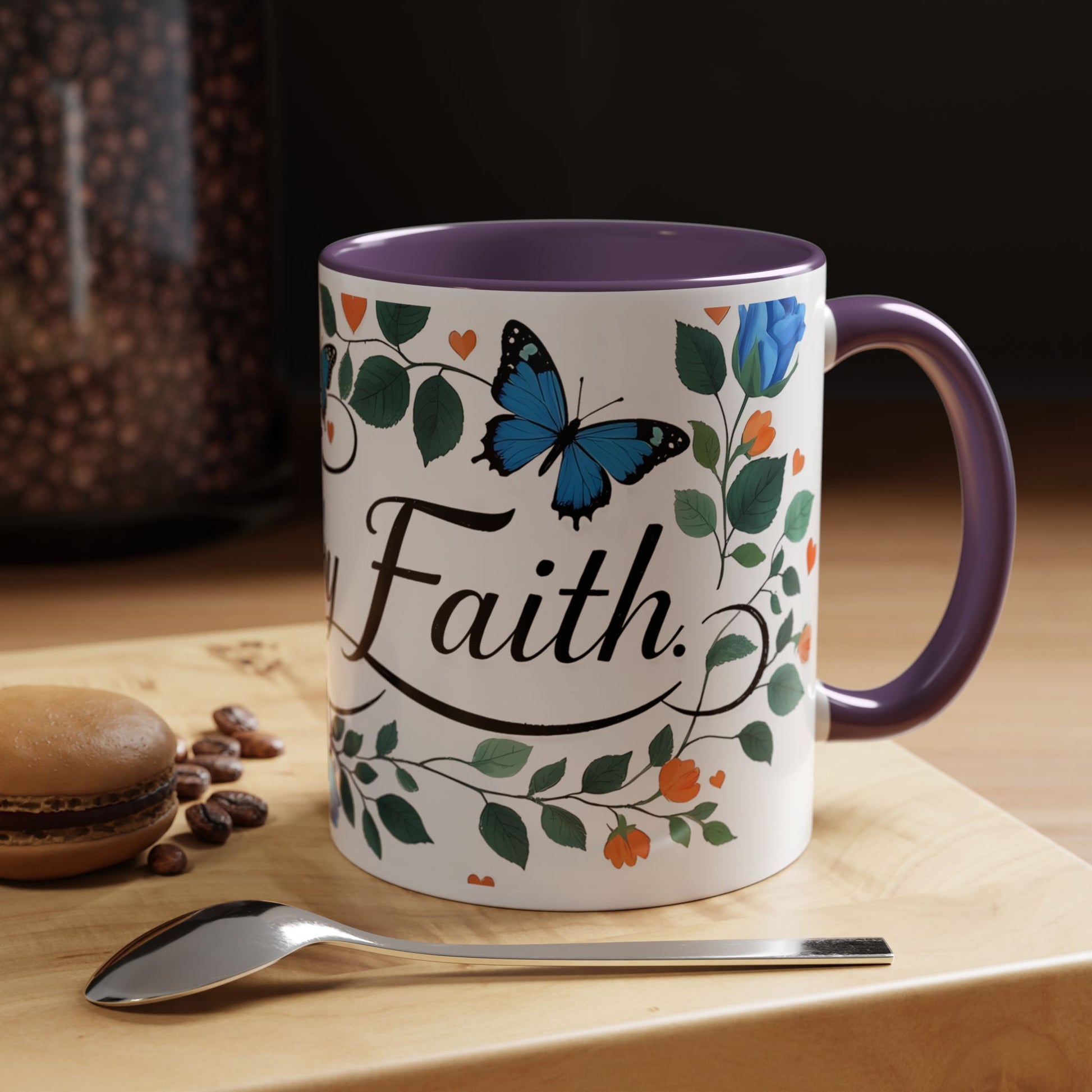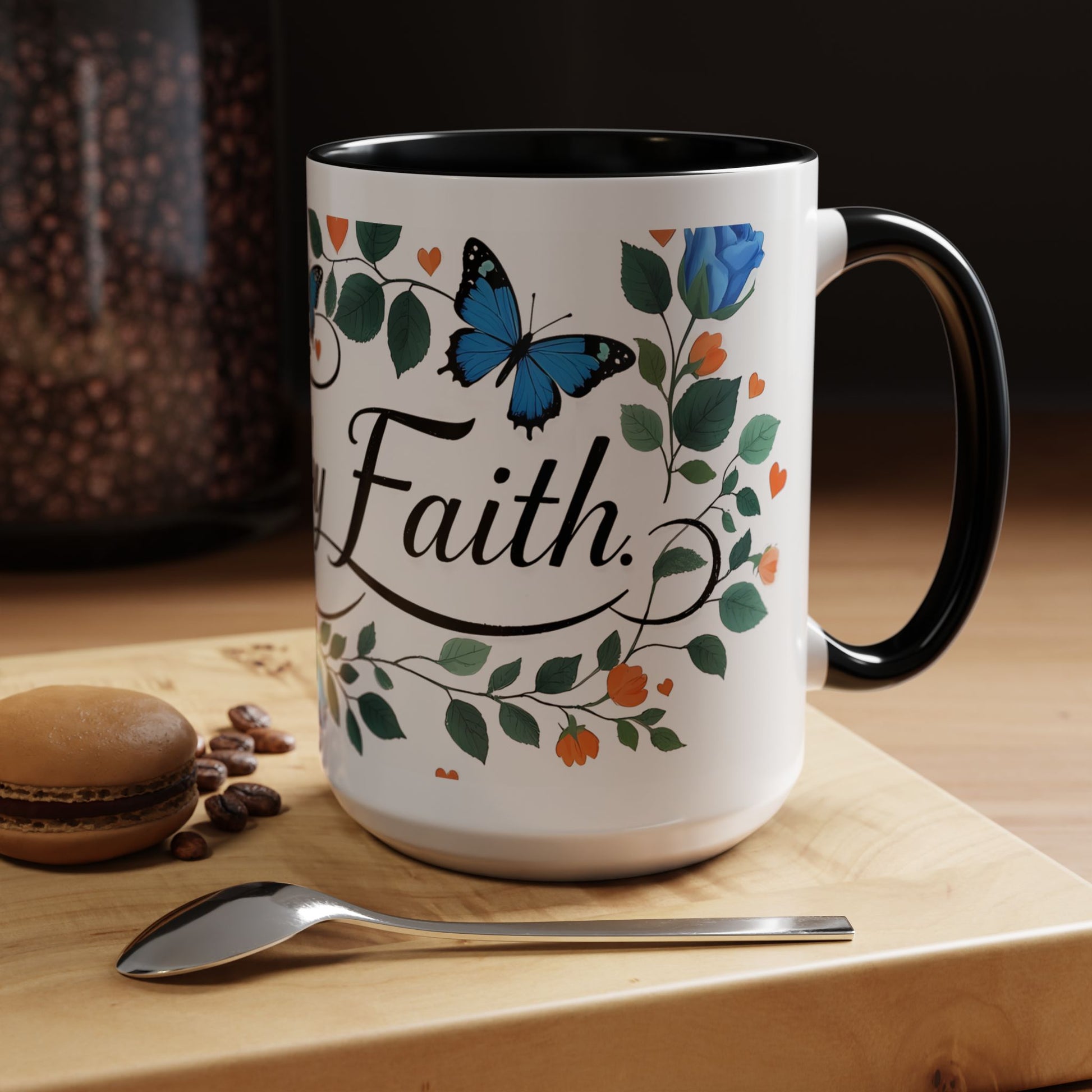 Warm, quiet mornings with a favorite book and a steady ritual. This ceramic mug brings a gentle, hopeful presence to that moment — soft blue roses and fluttering butterflies weave around graceful lettering that invites calm and reflection. The colored interior and handle add a playful contrast that lifts the design without shouting. It feels like a small altar for daily intention: sip slowly, breathe, and carry a little faith into the day.