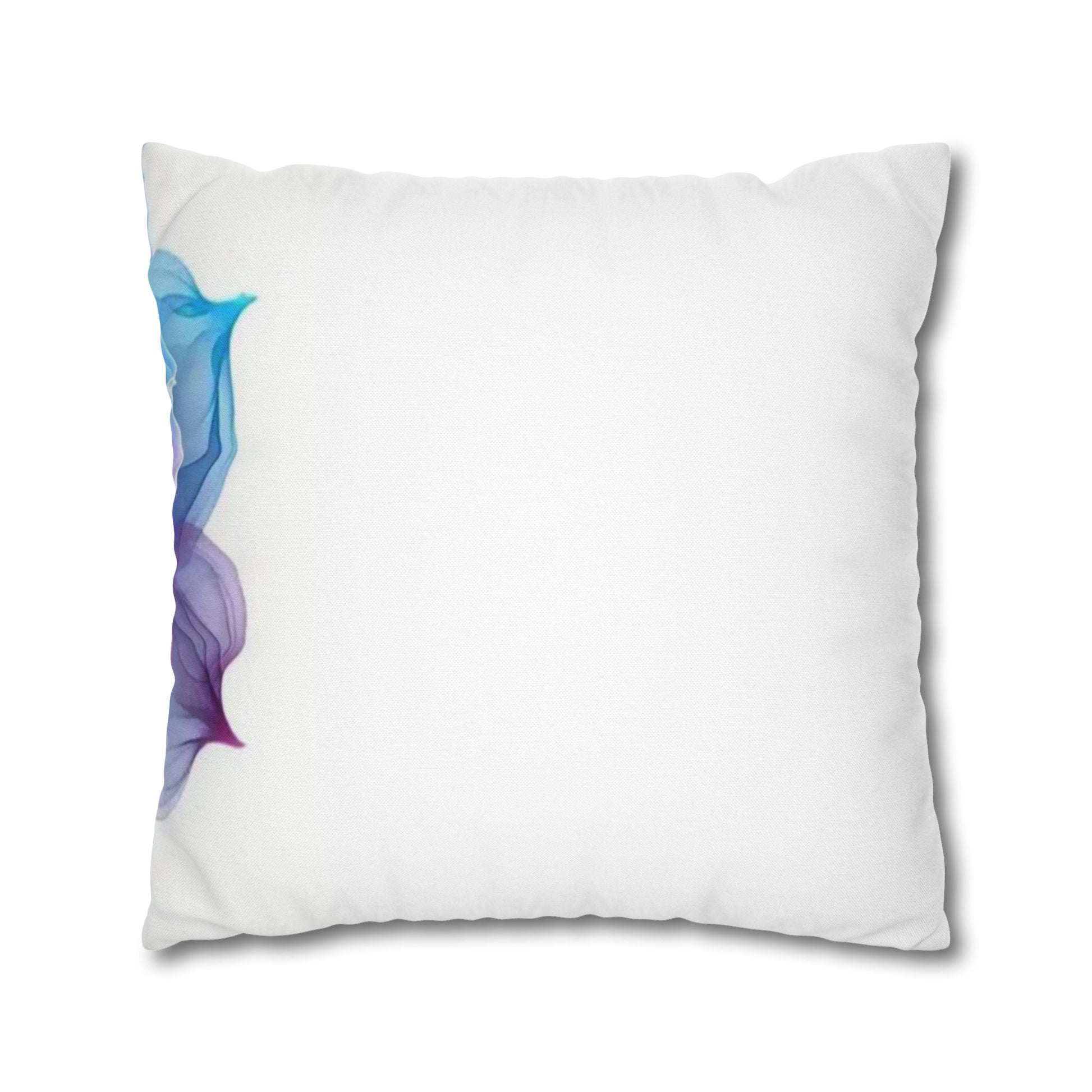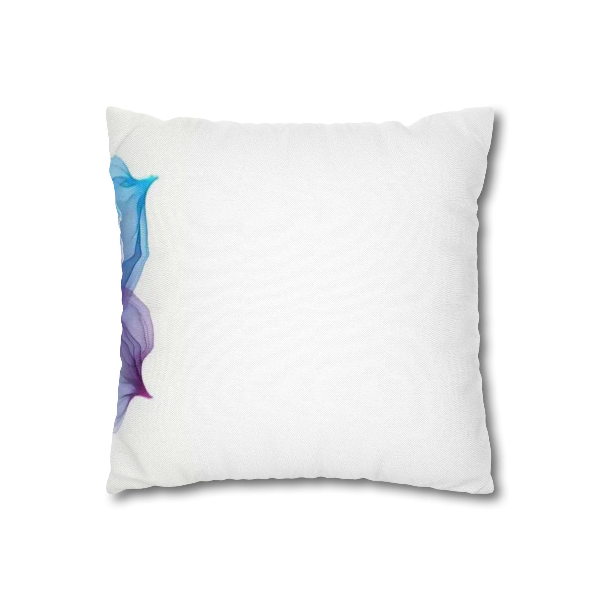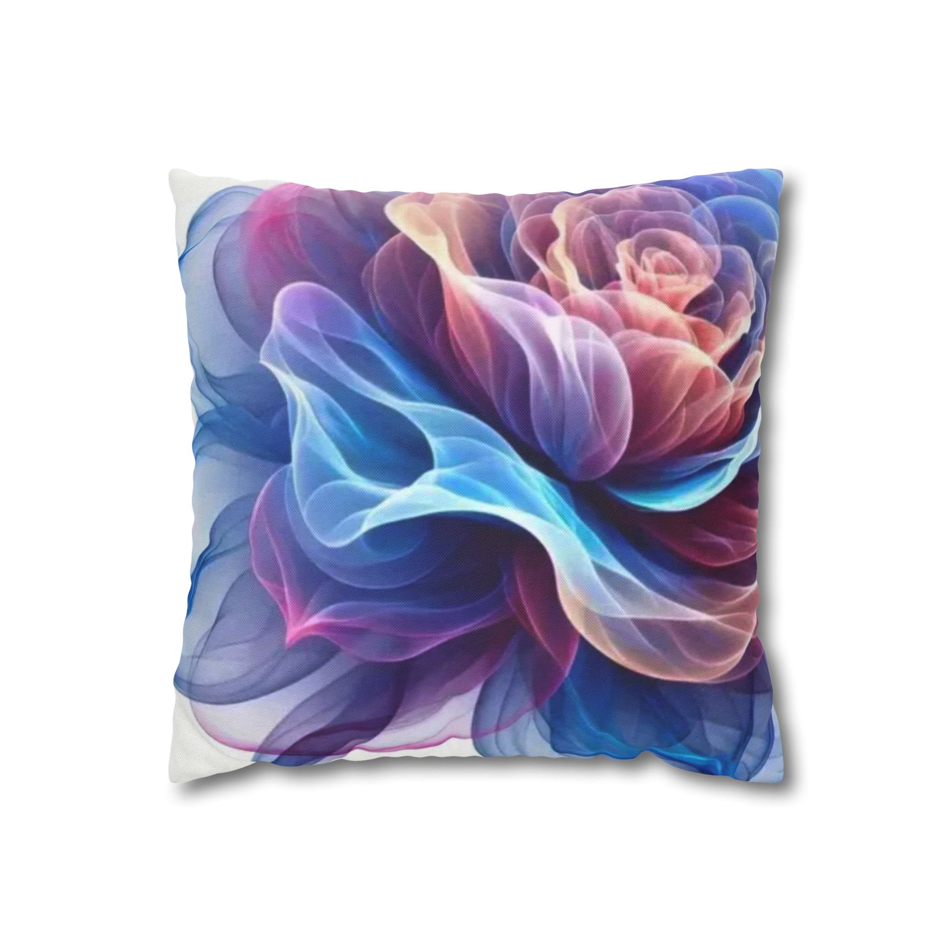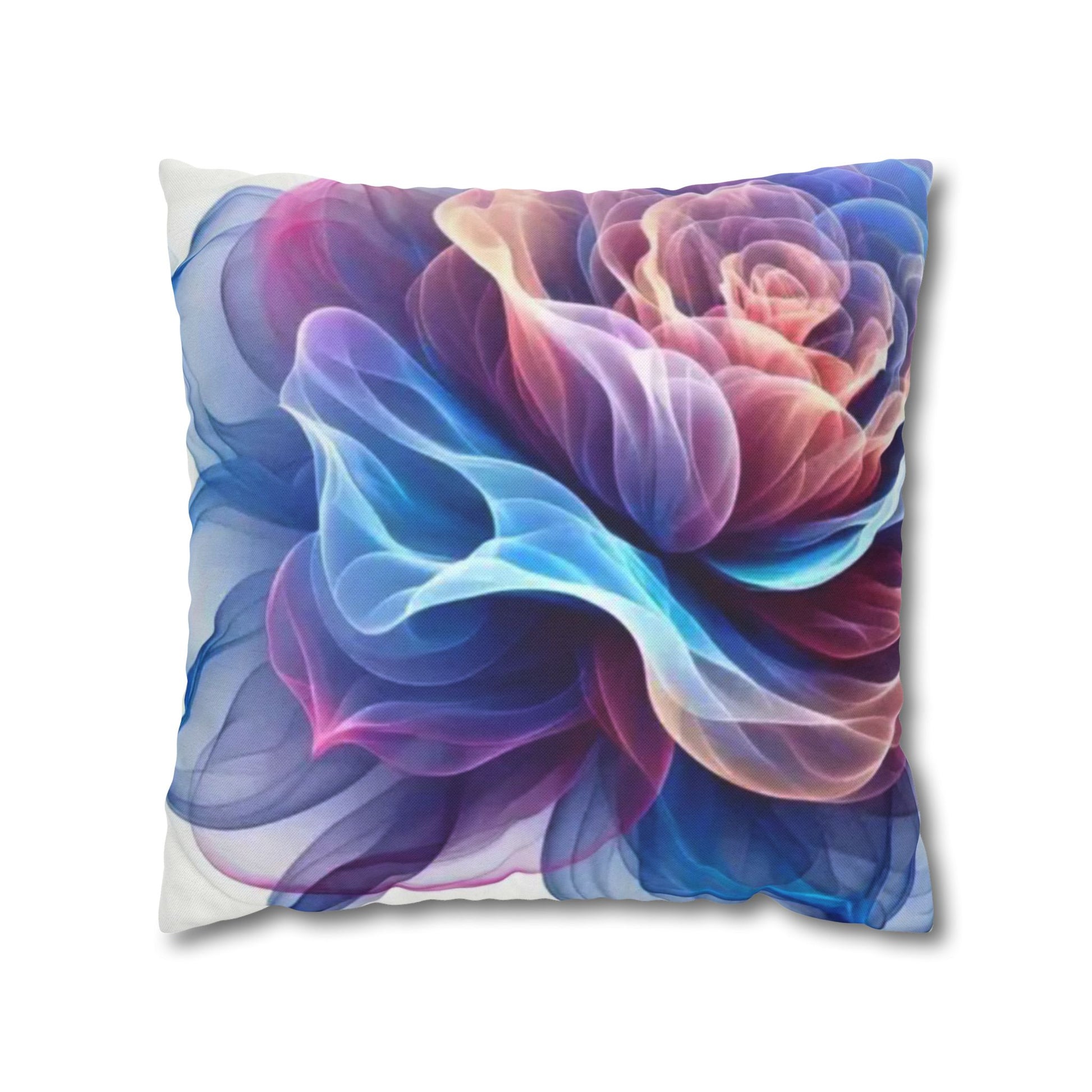 A luminous decorative pillow cover that brings soft, flowing color to your favorite chair or sofa. The double-sided print shows swirling, rose-like forms in blues, purples and warm pinks — like wisps of silk caught in a slow dance. The spun polyester keeps the surface smooth and wrinkle-free, while a concealed beige zipper keeps the silhouette clean. It layers beautifully over a neutral cushion insert or mixed among textured throws to add a painterly, contemporary accent to a living room, bedroom, or reading nook.