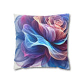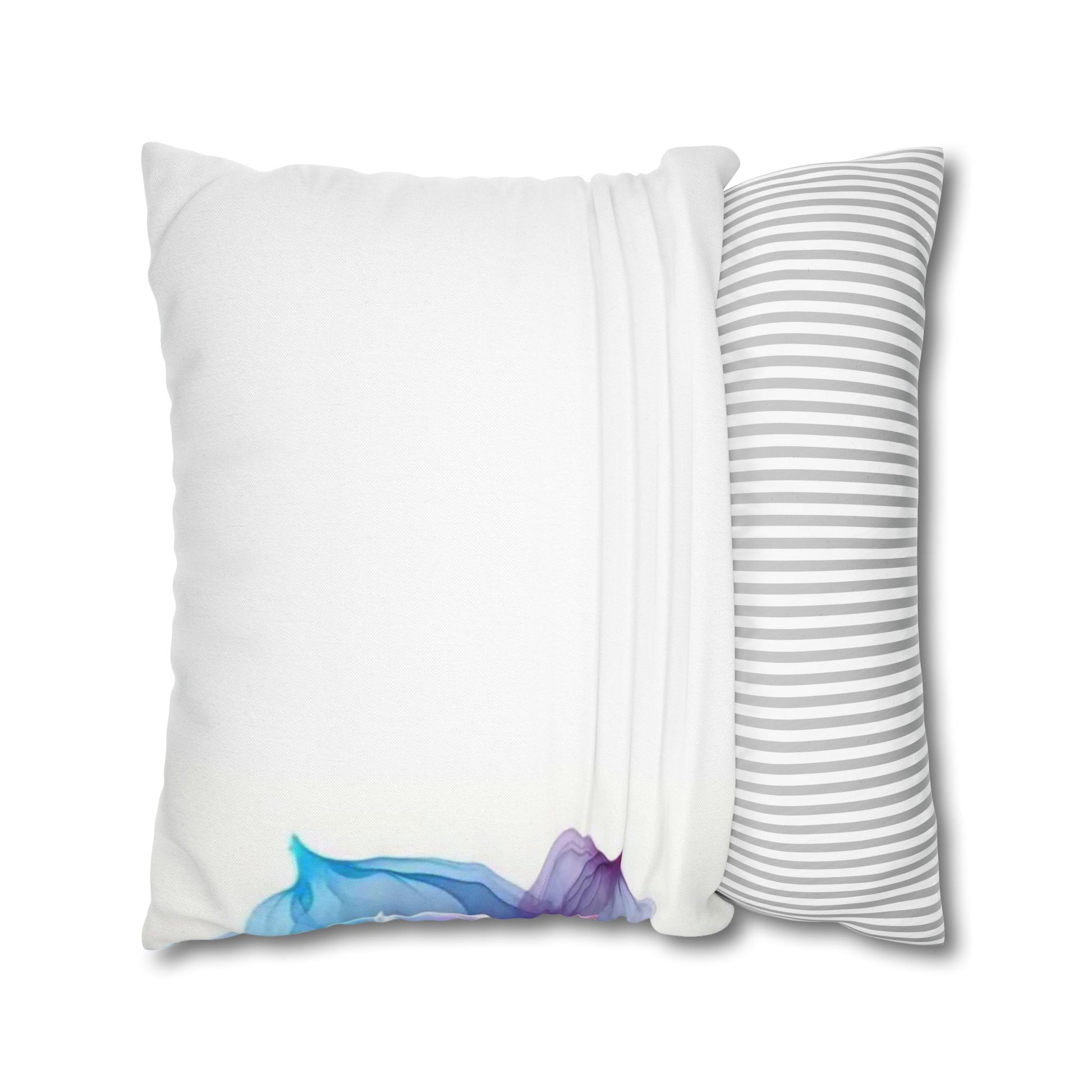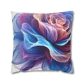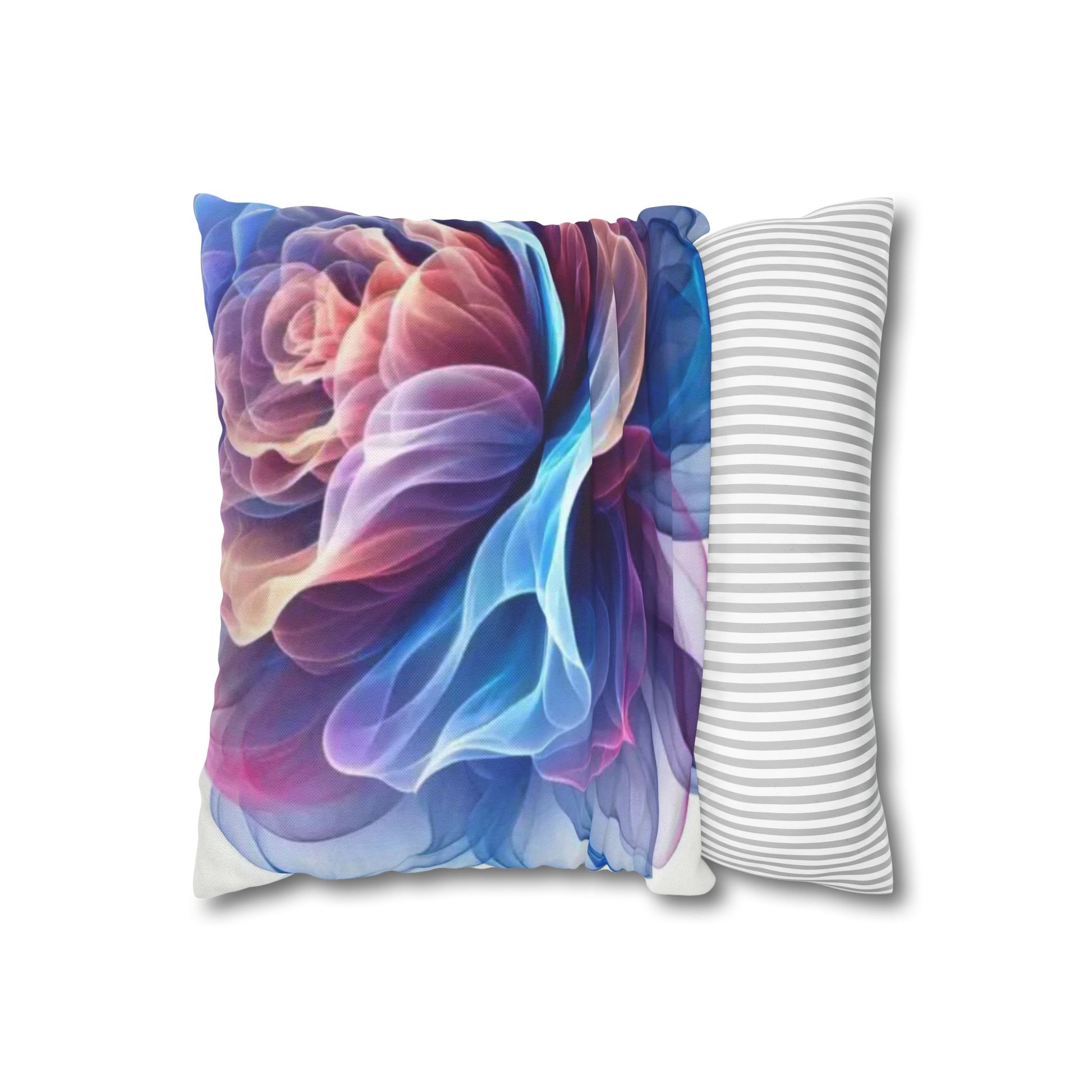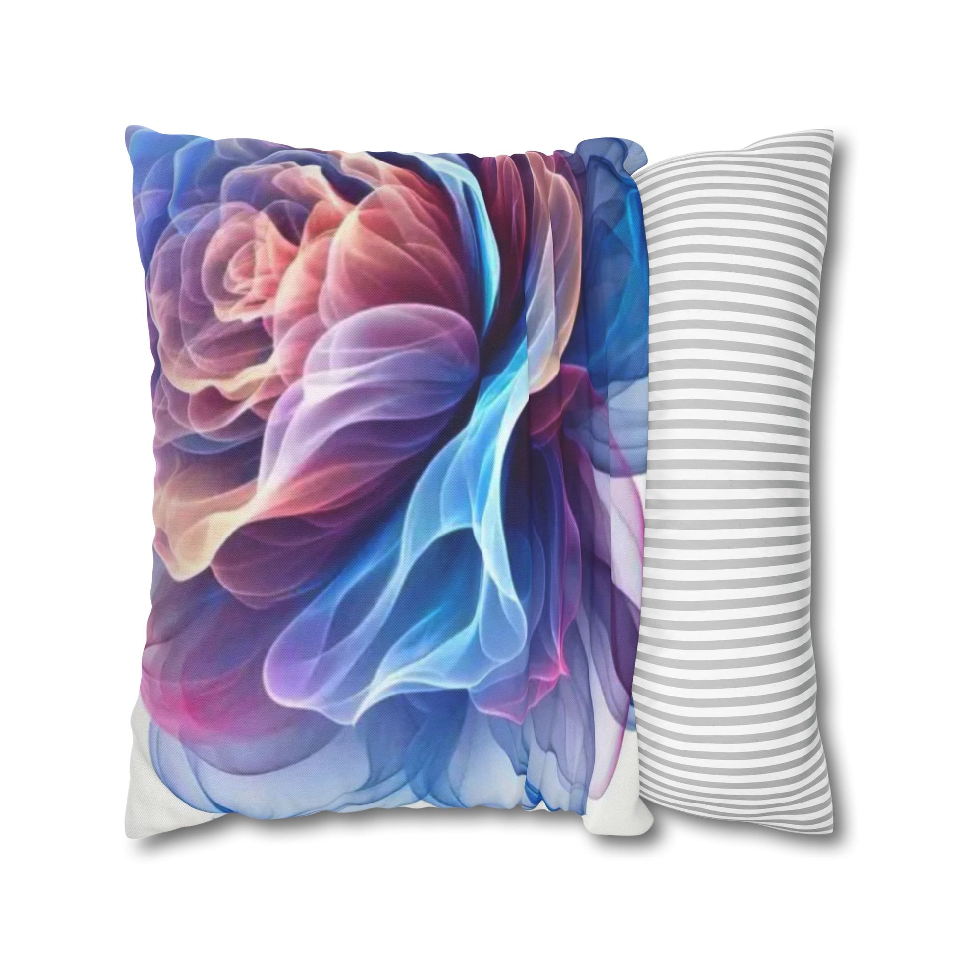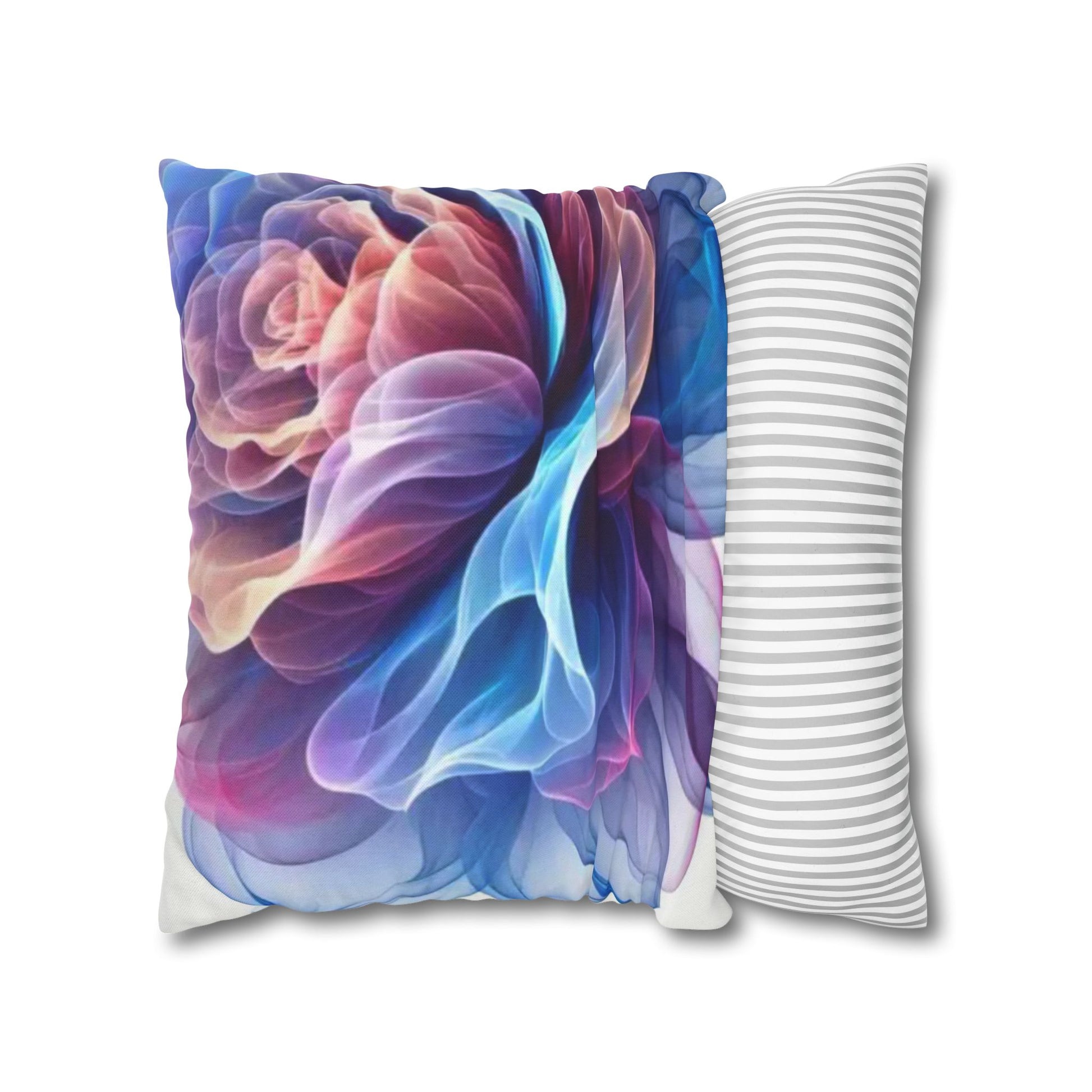 A luminous decorative pillow cover that brings soft, flowing color to your favorite chair or sofa. The double-sided print shows swirling, rose-like forms in blues, purples and warm pinks — like wisps of silk caught in a slow dance. The spun polyester keeps the surface smooth and wrinkle-free, while a concealed beige zipper keeps the silhouette clean. It layers beautifully over a neutral cushion insert or mixed among textured throws to add a painterly, contemporary accent to a living room, bedroom, or reading nook.