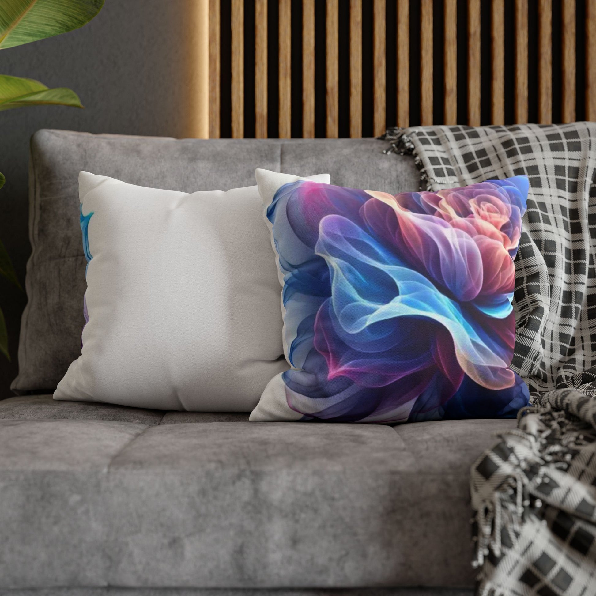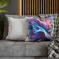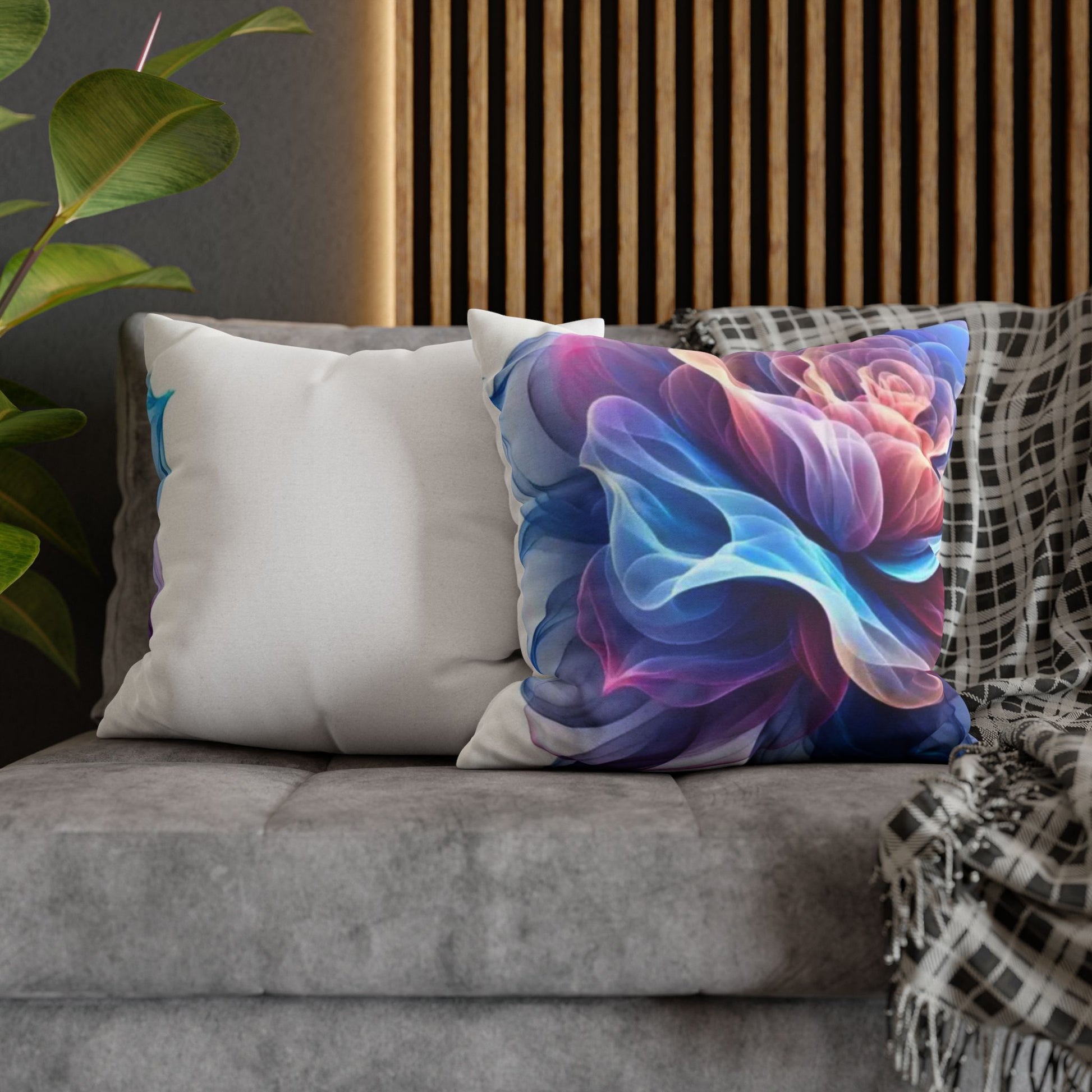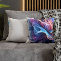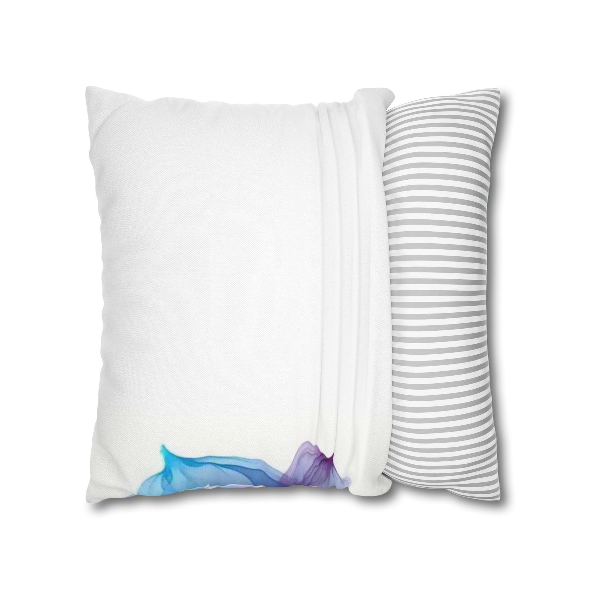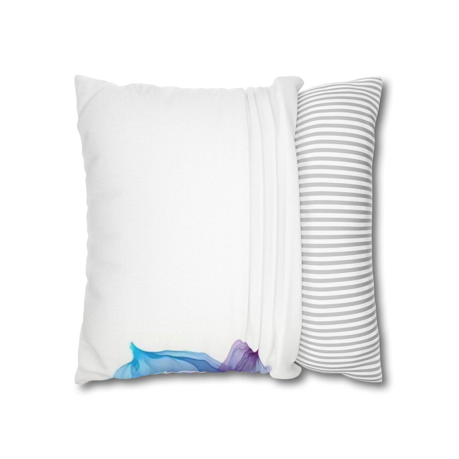 A luminous decorative pillow cover that brings soft, flowing color to your favorite chair or sofa. The double-sided print shows swirling, rose-like forms in blues, purples and warm pinks — like wisps of silk caught in a slow dance. The spun polyester keeps the surface smooth and wrinkle-free, while a concealed beige zipper keeps the silhouette clean. It layers beautifully over a neutral cushion insert or mixed among textured throws to add a painterly, contemporary accent to a living room, bedroom, or reading nook.
