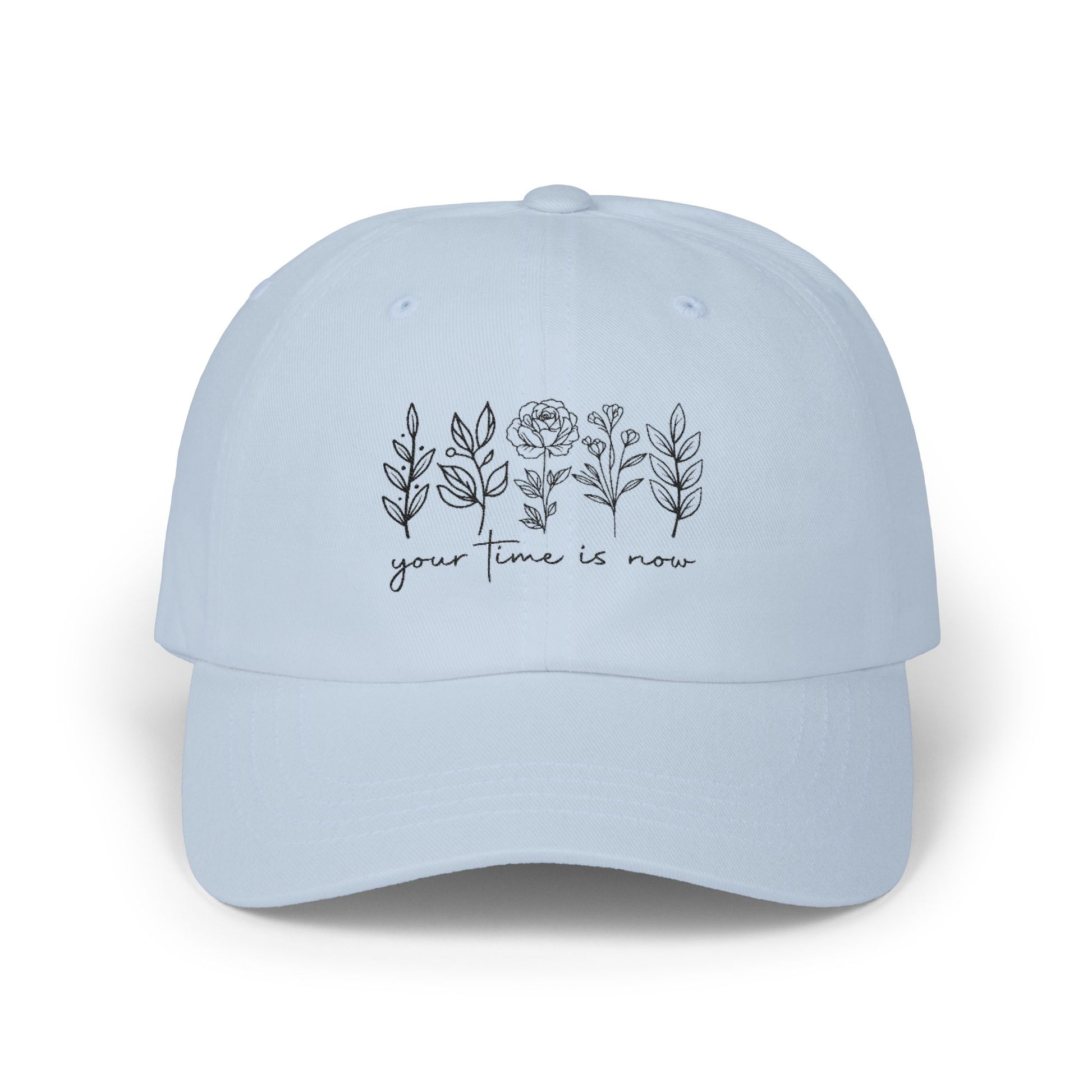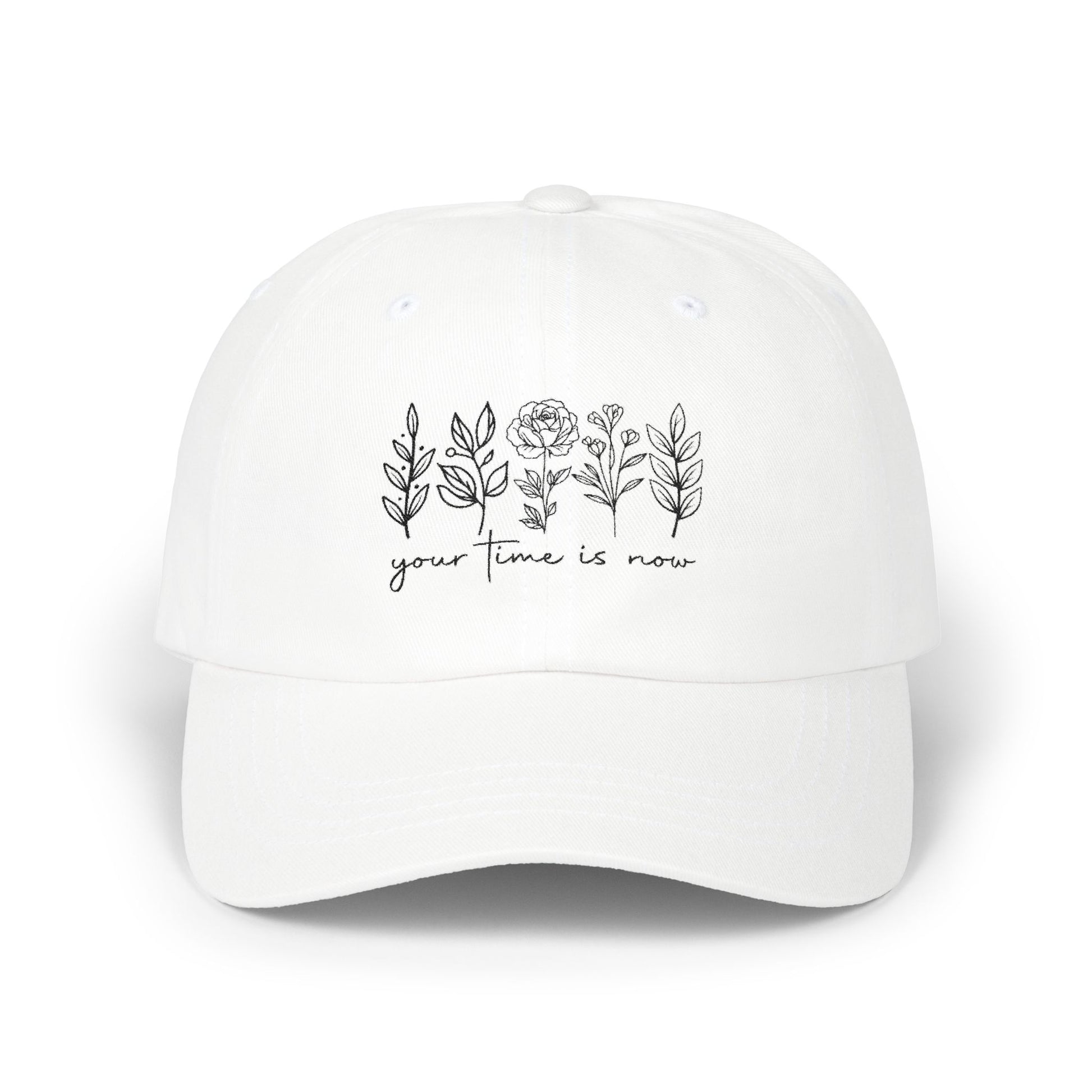 Lightweight, lived-in, and quietly confident — this dad cap carries a small, hand-drawn garden across the front: delicate wildflowers and leaves arch over the handwritten phrase “your time is now.” The low-profile, unstructured silhouette settles easily on the head and the precurved visor softens your look while shielding the sun. An antique-brass hideaway strap lets you tune the fit without fuss. Wear it on slow morning walks, farmer’s market runs, or when you need a gentle reminder to show up for yourself. This cap blends everyday comfort with a subtle, intentional message for those who prefer low-key style and meaningful details.