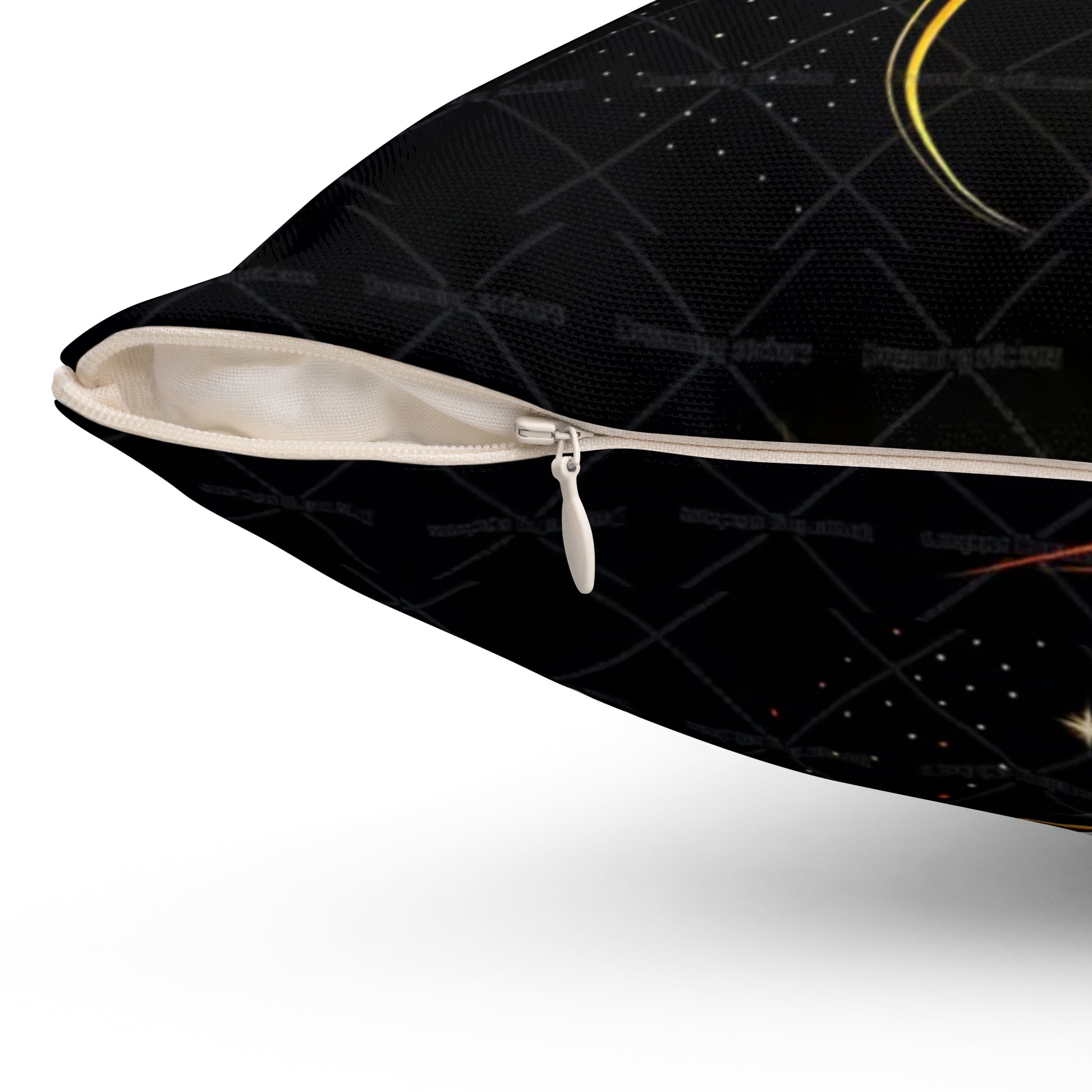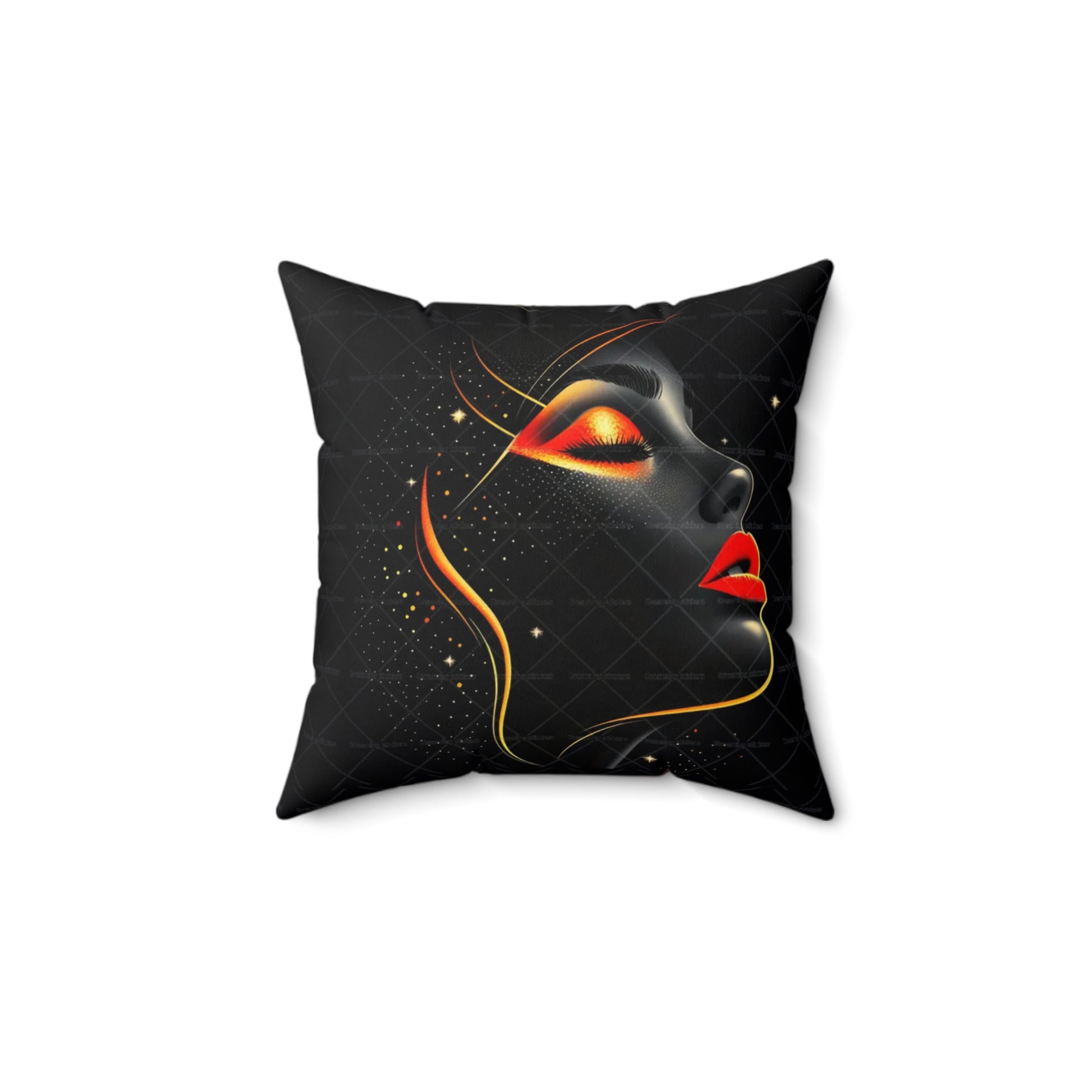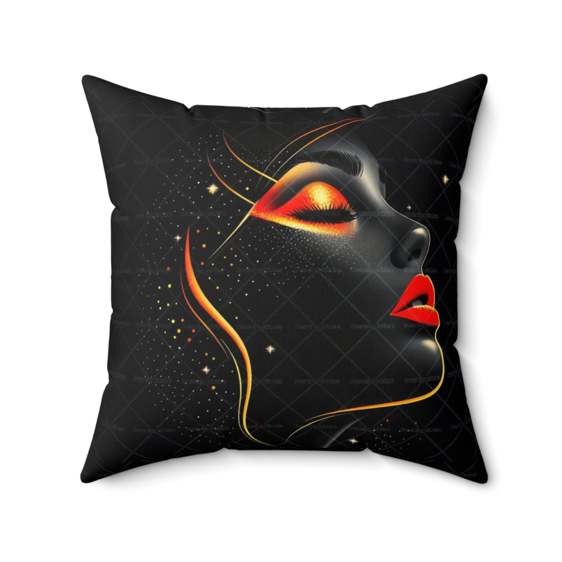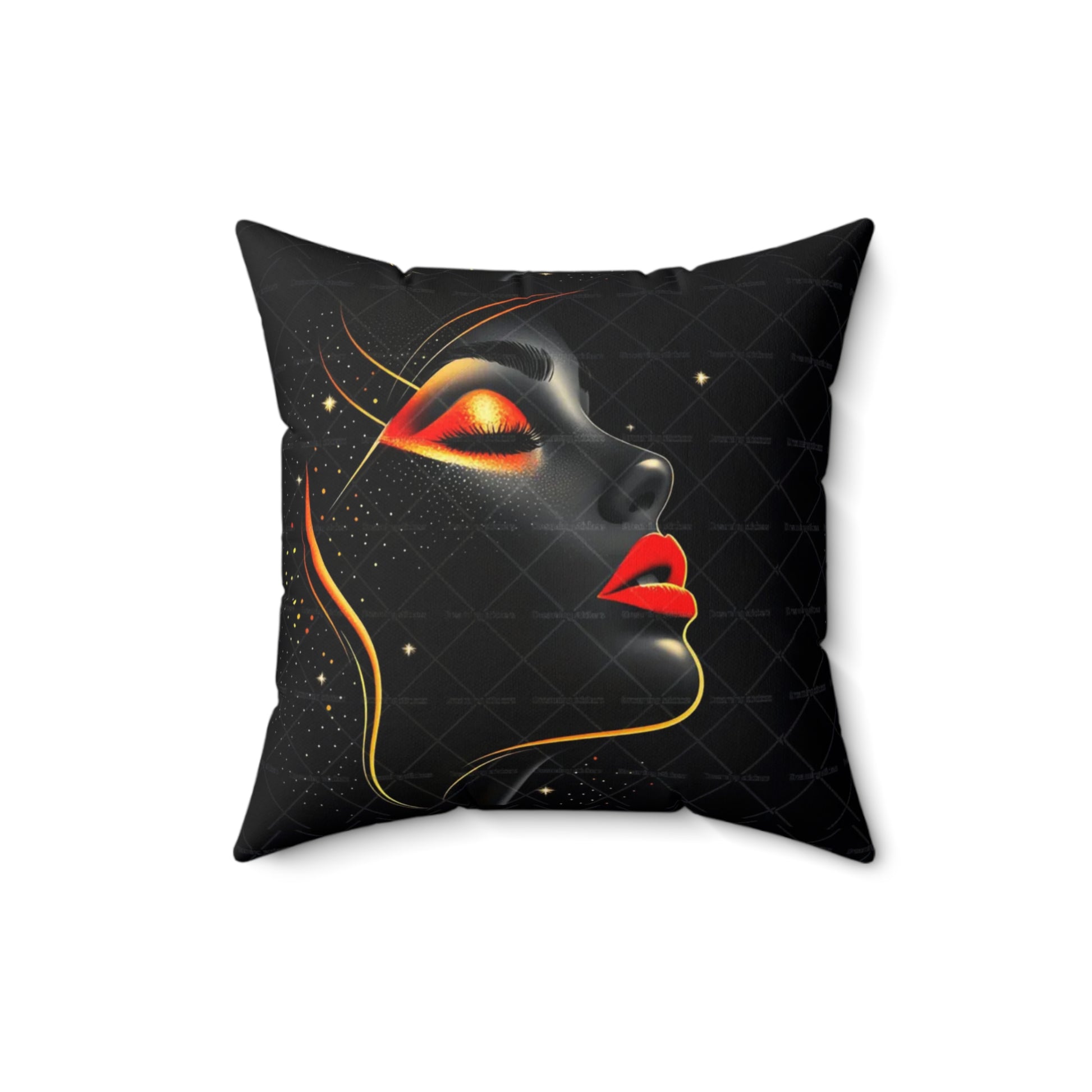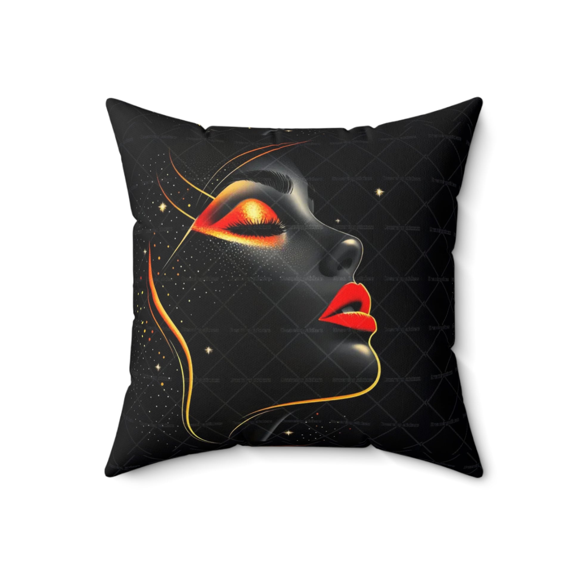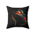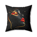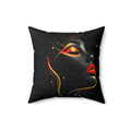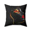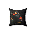 A bold decorative pillow that brings sultry, modern glamour to living spaces. The double-sided print showcases a stylized profile of a woman's face in dramatic black with luminous gold accents and striking red lips, creating a moody, art-gallery vibe. Soft spun polyester holds the shape and resists wrinkles, while a concealed beige zipper keeps the silhouette clean. The generously filled recycled-polyester insert ships compressed and puffs up to give a full, sculpted look once assembled. Place it on a sofa, reading chair, or boudoir to add a touch of cinematic elegance and confident, contemporary style.