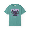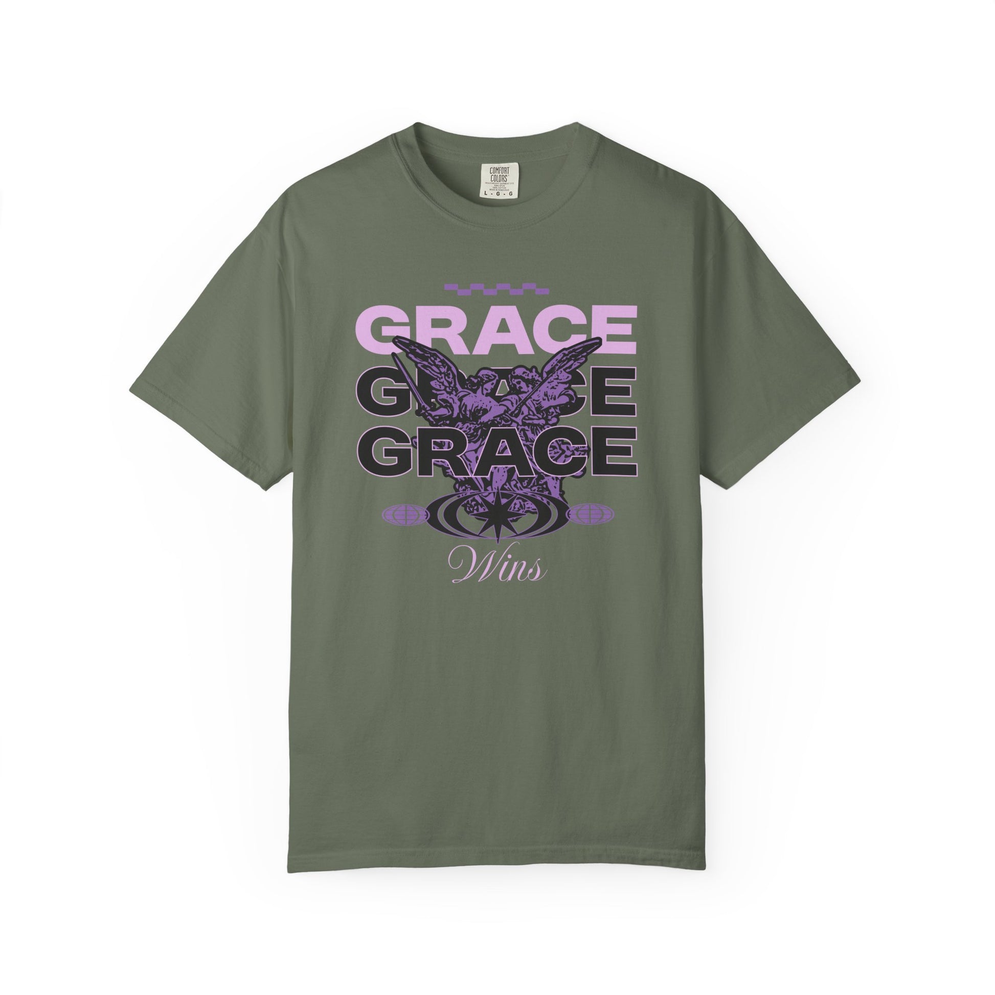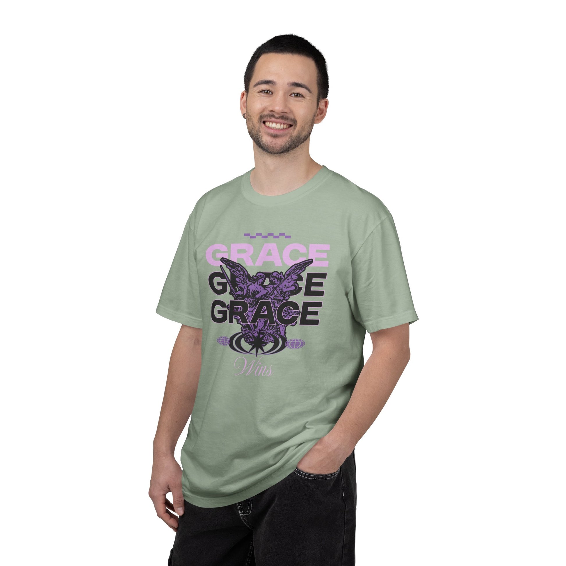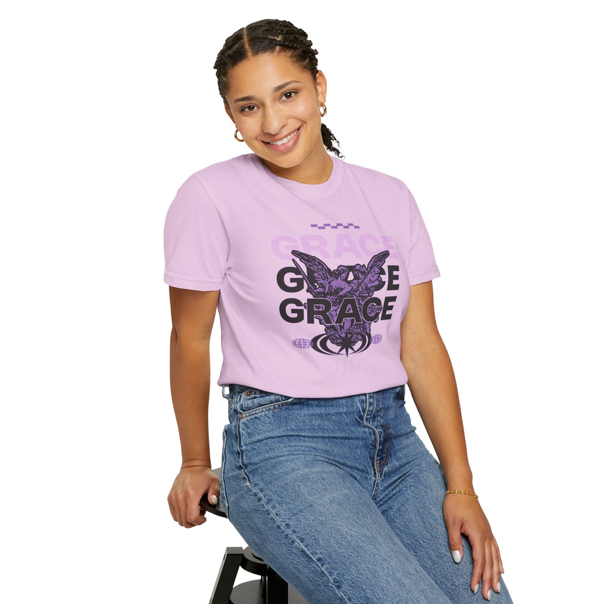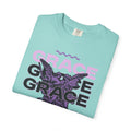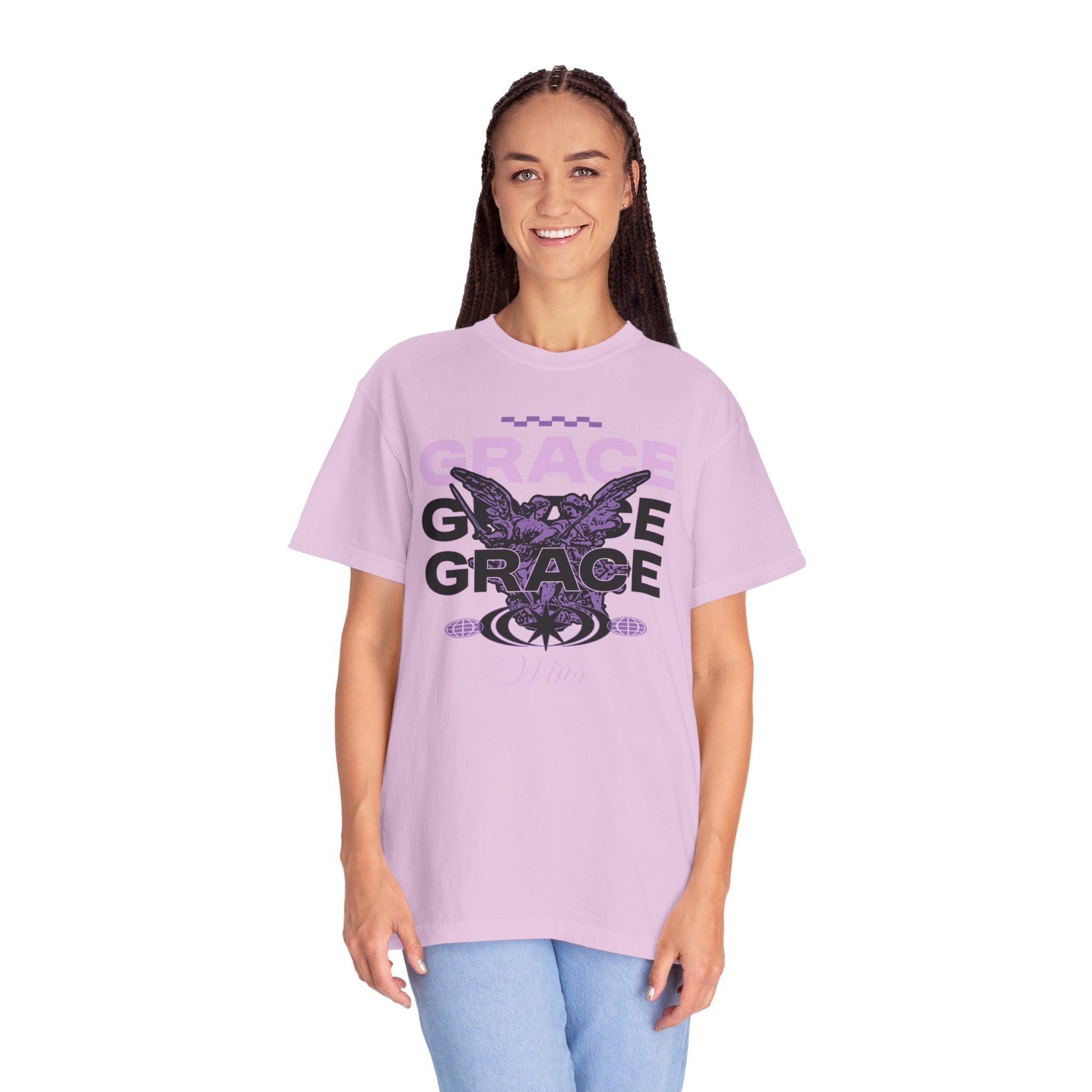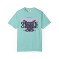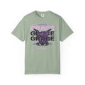 This garment-dyed tee brings a soft, lived-in feel to a bold graphic aesthetic. The relaxed fit and heavyweight 100% ring-spun cotton sit like a familiar favorite, while the layered “GRACE” text and ornate central illustration add a slightly gothic, artful edge. Wear it on slow mornings at the coffee shop or out late at a show — the muted dye and sturdy construction keep it comfortable and dependable as you move through your day. The look reads like street-ready vintage with a thoughtful, handcrafted touch; it settles in easily with denim, layered jackets, or tucked into high-waist bottoms for an effortless, intentional vibe.
