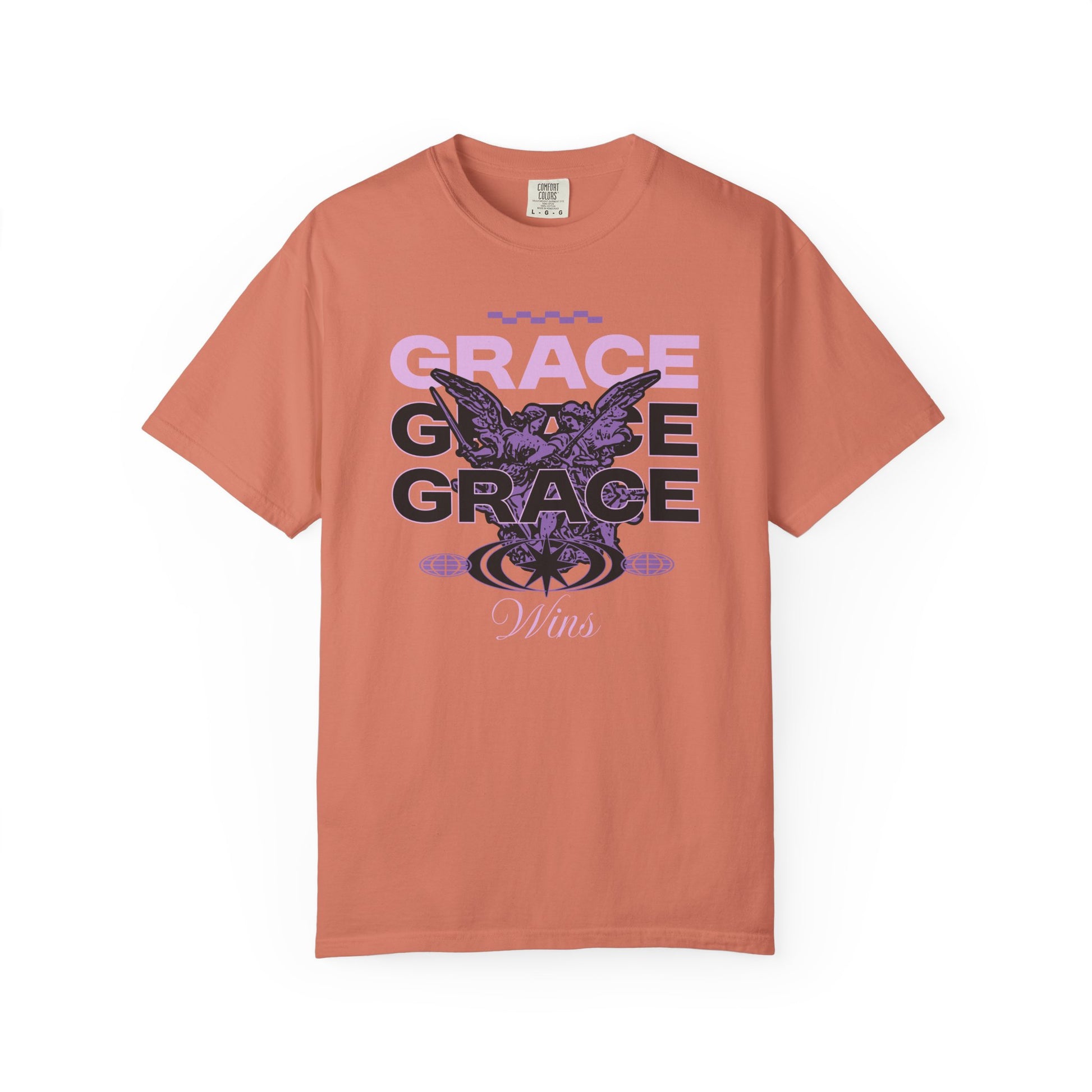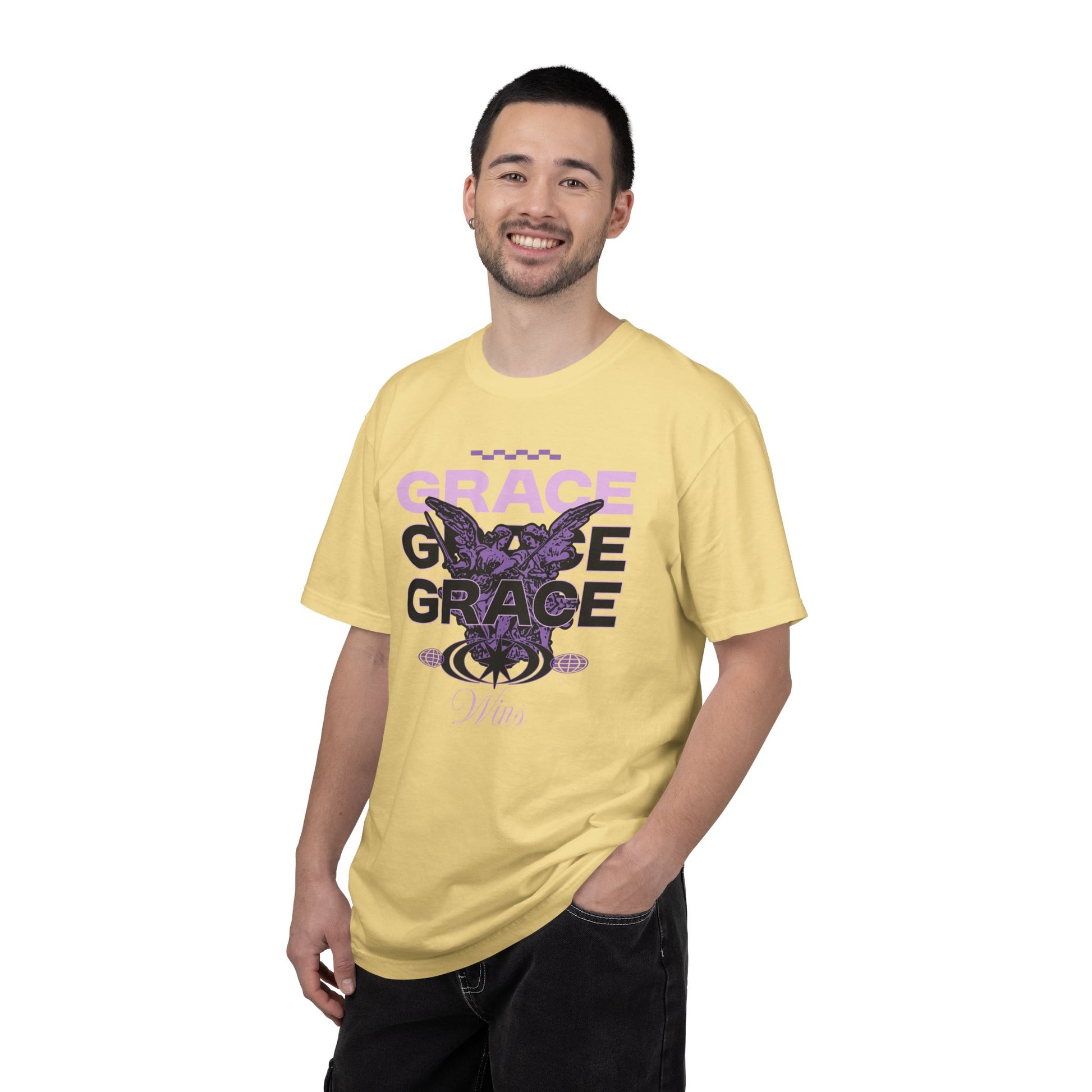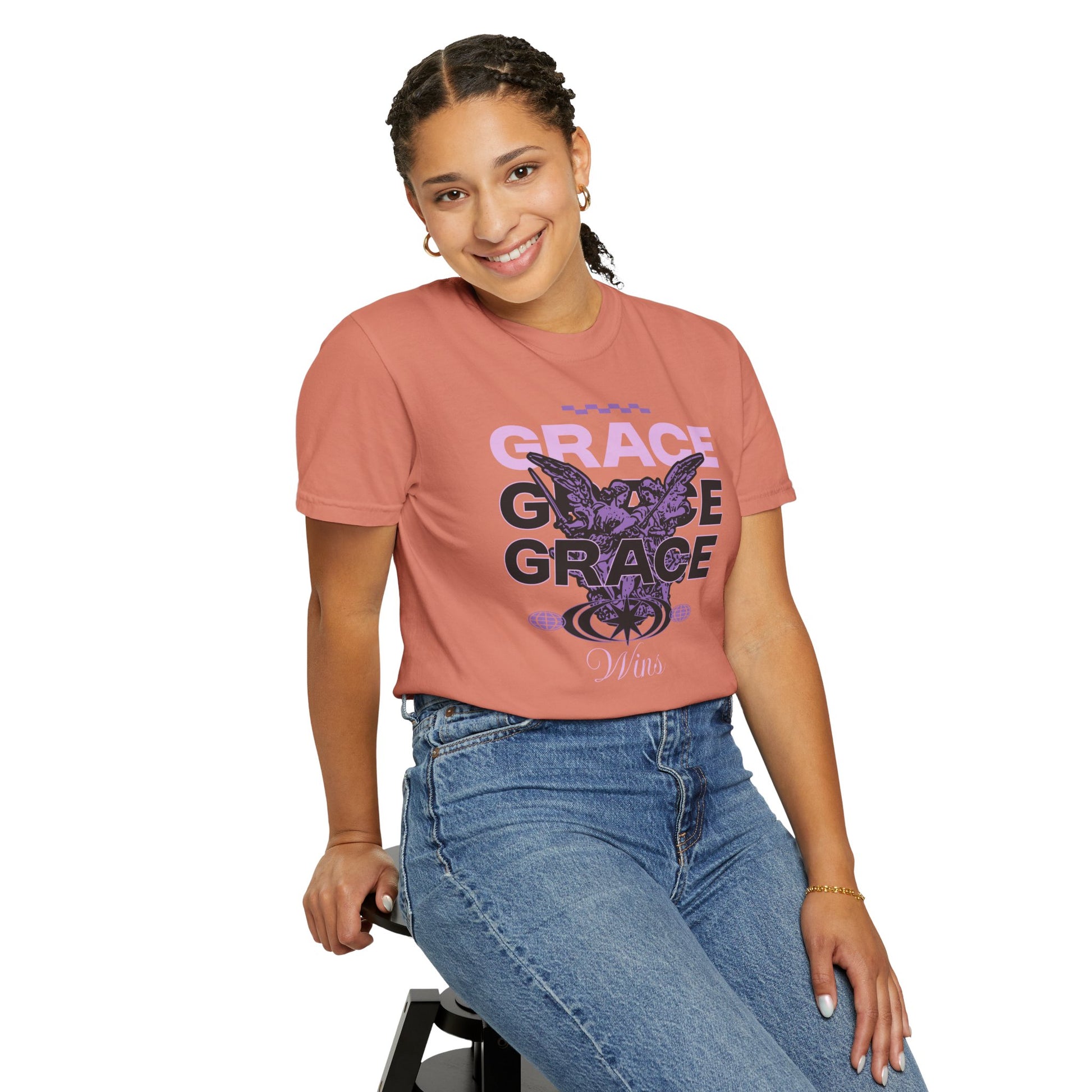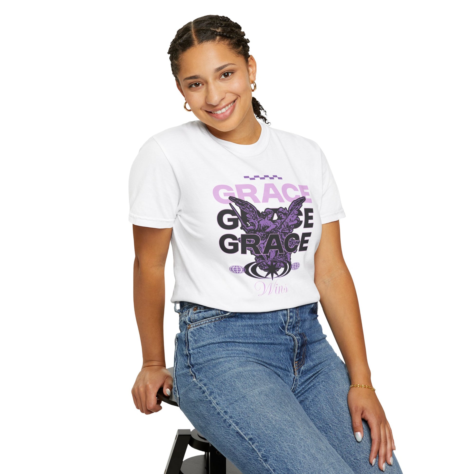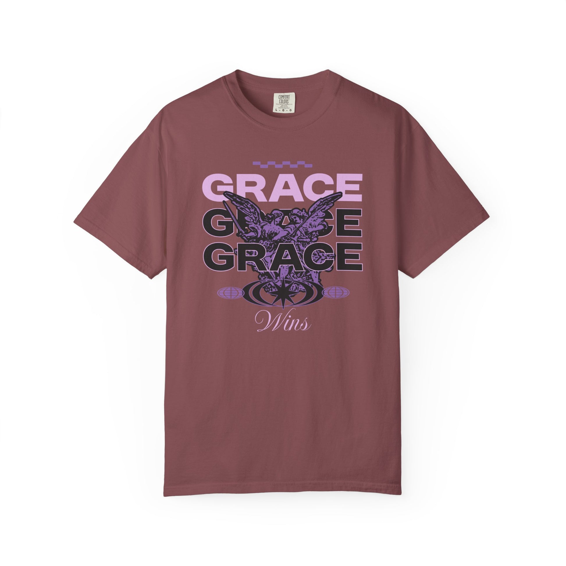 This garment-dyed tee brings a soft, lived-in feel to a bold graphic aesthetic. The relaxed fit and heavyweight 100% ring-spun cotton sit like a familiar favorite, while the layered “GRACE” text and ornate central illustration add a slightly gothic, artful edge. Wear it on slow mornings at the coffee shop or out late at a show — the muted dye and sturdy construction keep it comfortable and dependable as you move through your day. The look reads like street-ready vintage with a thoughtful, handcrafted touch; it settles in easily with denim, layered jackets, or tucked into high-waist bottoms for an effortless, intentional vibe.