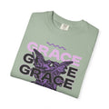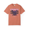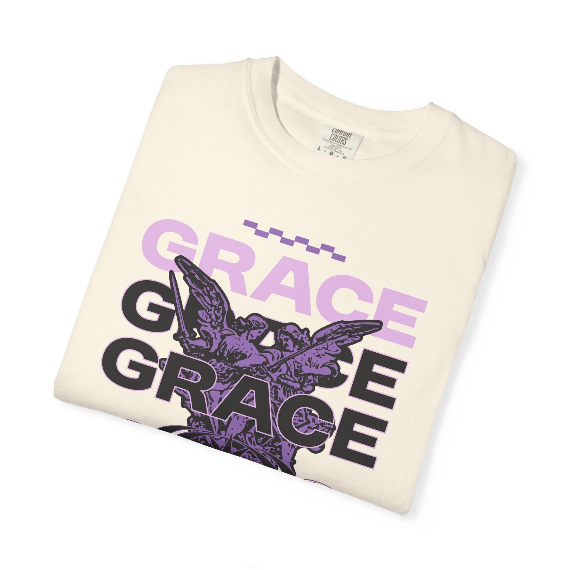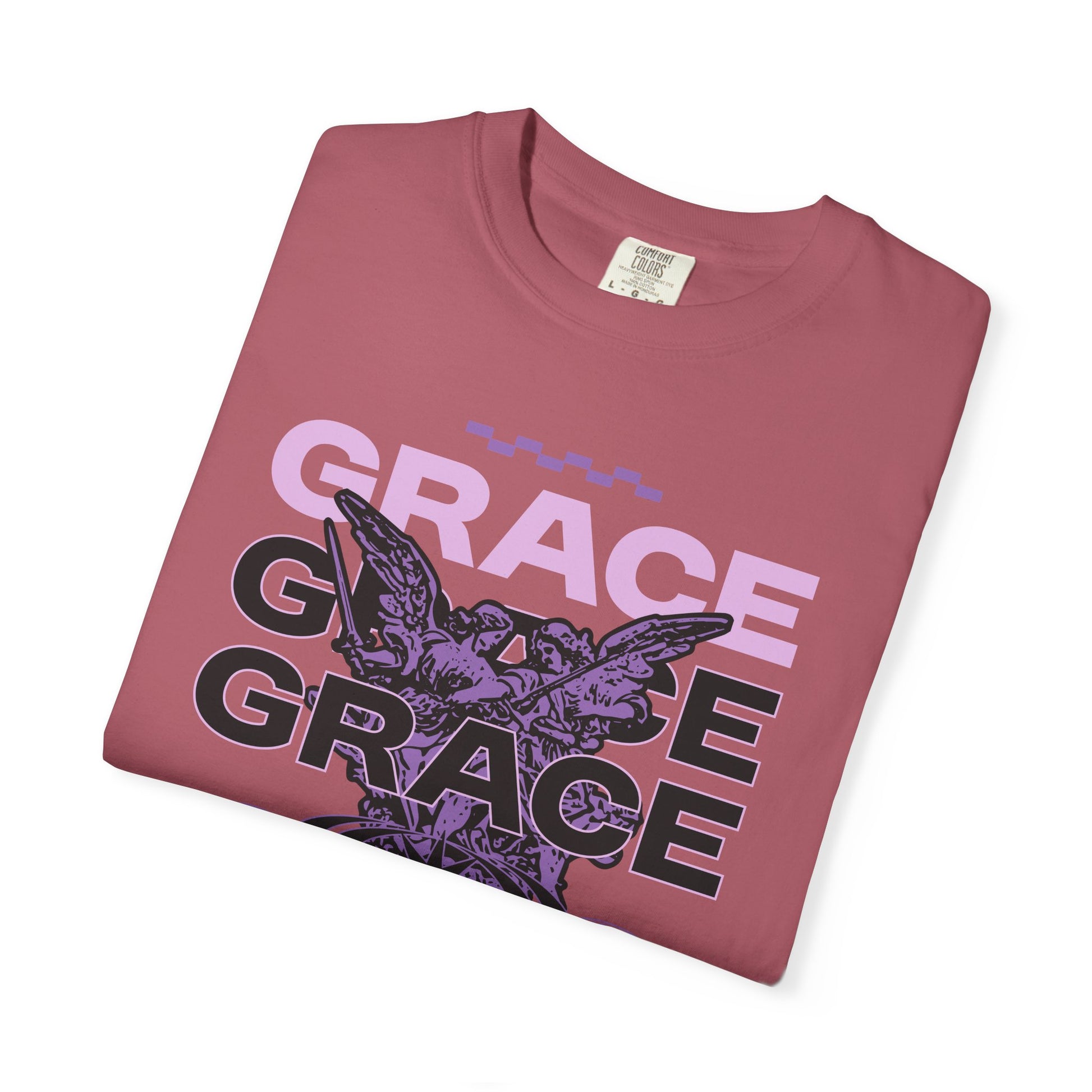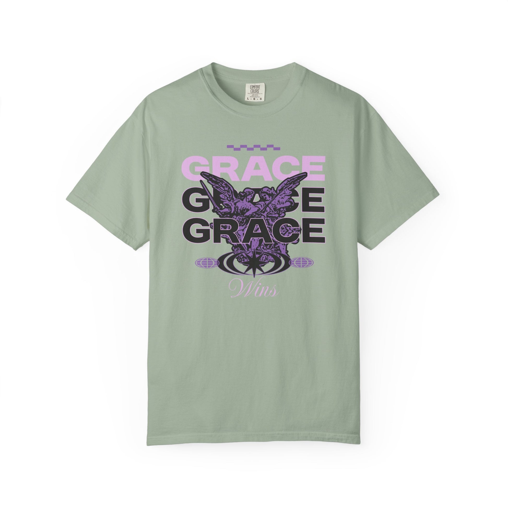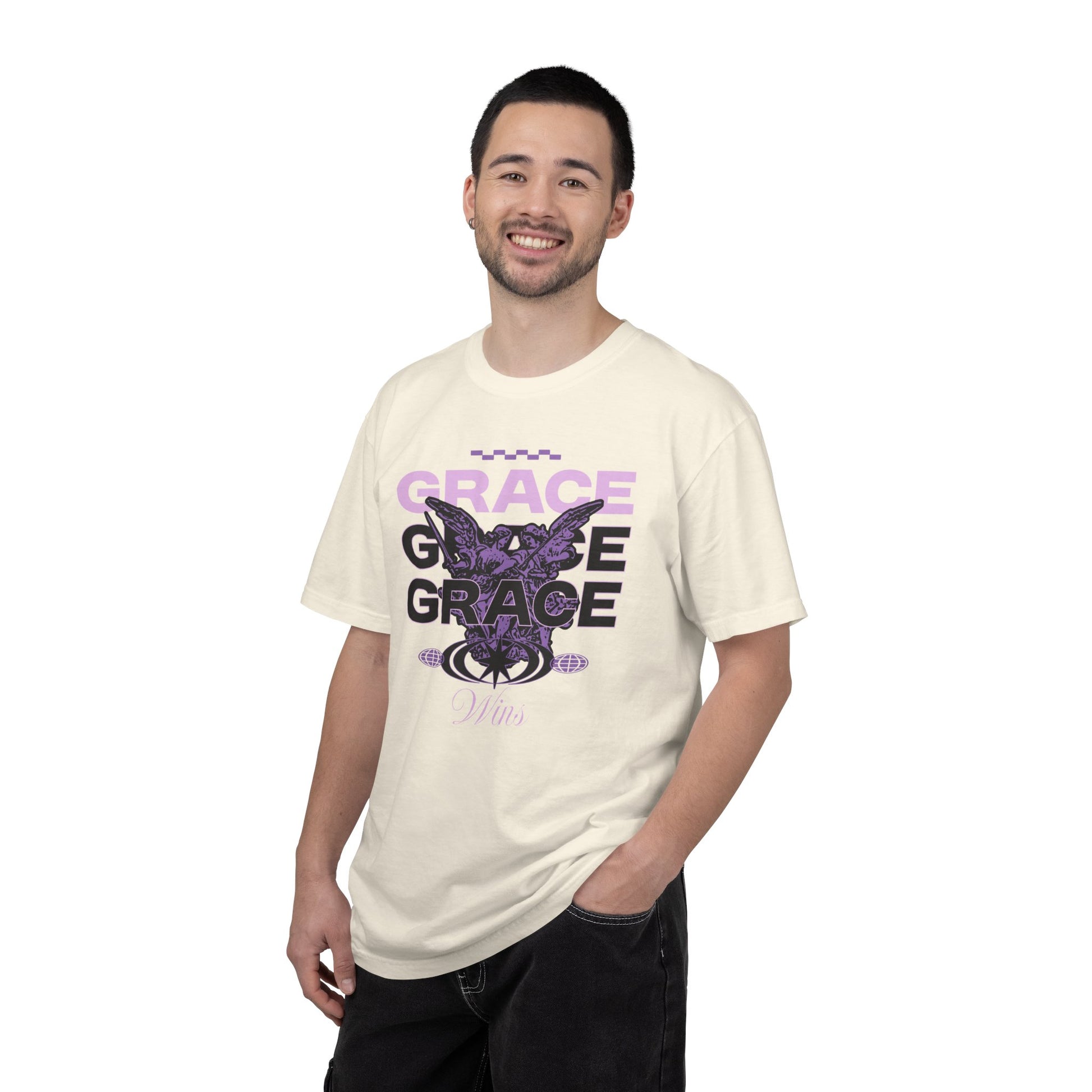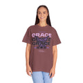 This garment-dyed tee brings a soft, lived-in feel to a bold graphic aesthetic. The relaxed fit and heavyweight 100% ring-spun cotton sit like a familiar favorite, while the layered “GRACE” text and ornate central illustration add a slightly gothic, artful edge. Wear it on slow mornings at the coffee shop or out late at a show — the muted dye and sturdy construction keep it comfortable and dependable as you move through your day. The look reads like street-ready vintage with a thoughtful, handcrafted touch; it settles in easily with denim, layered jackets, or tucked into high-waist bottoms for an effortless, intentional vibe.
