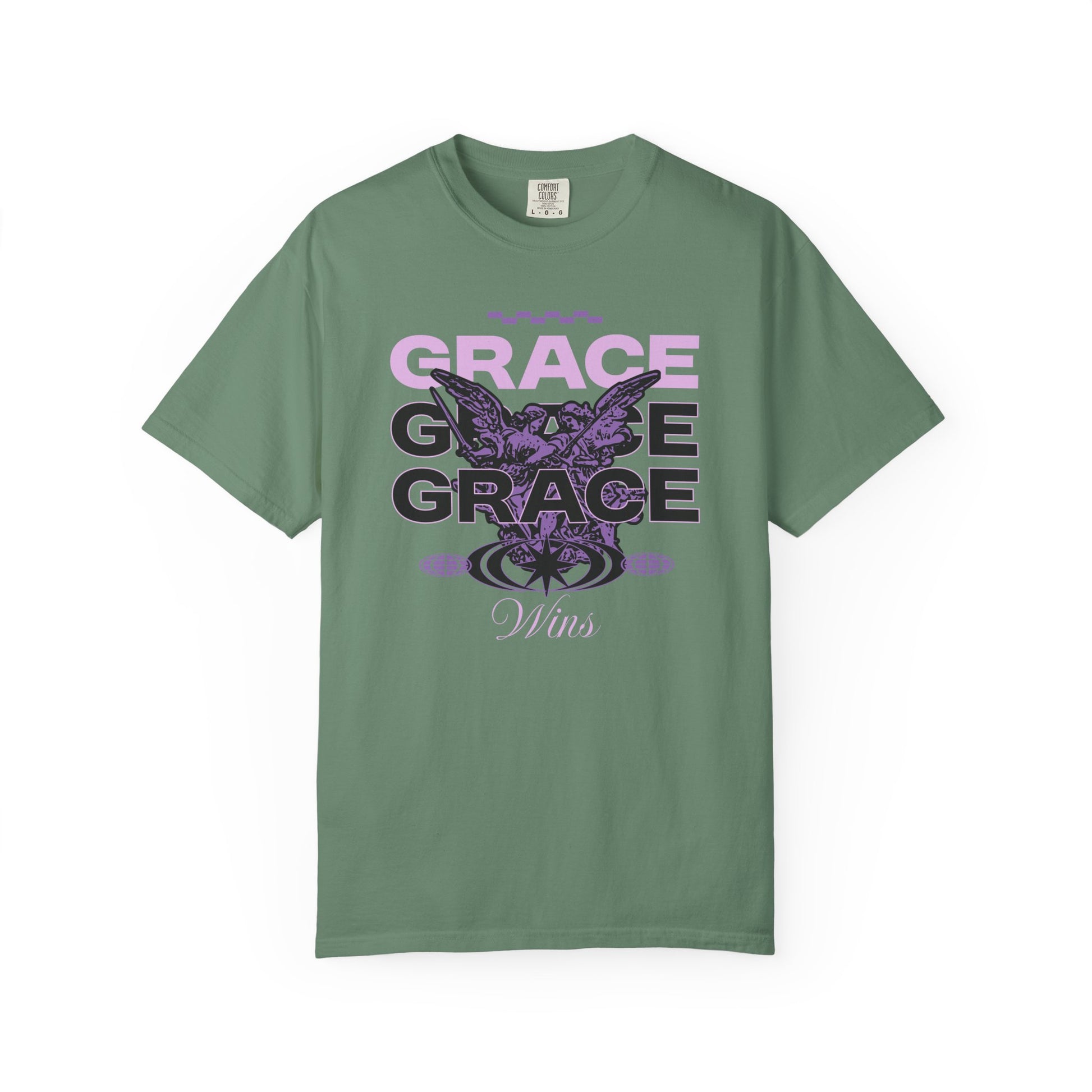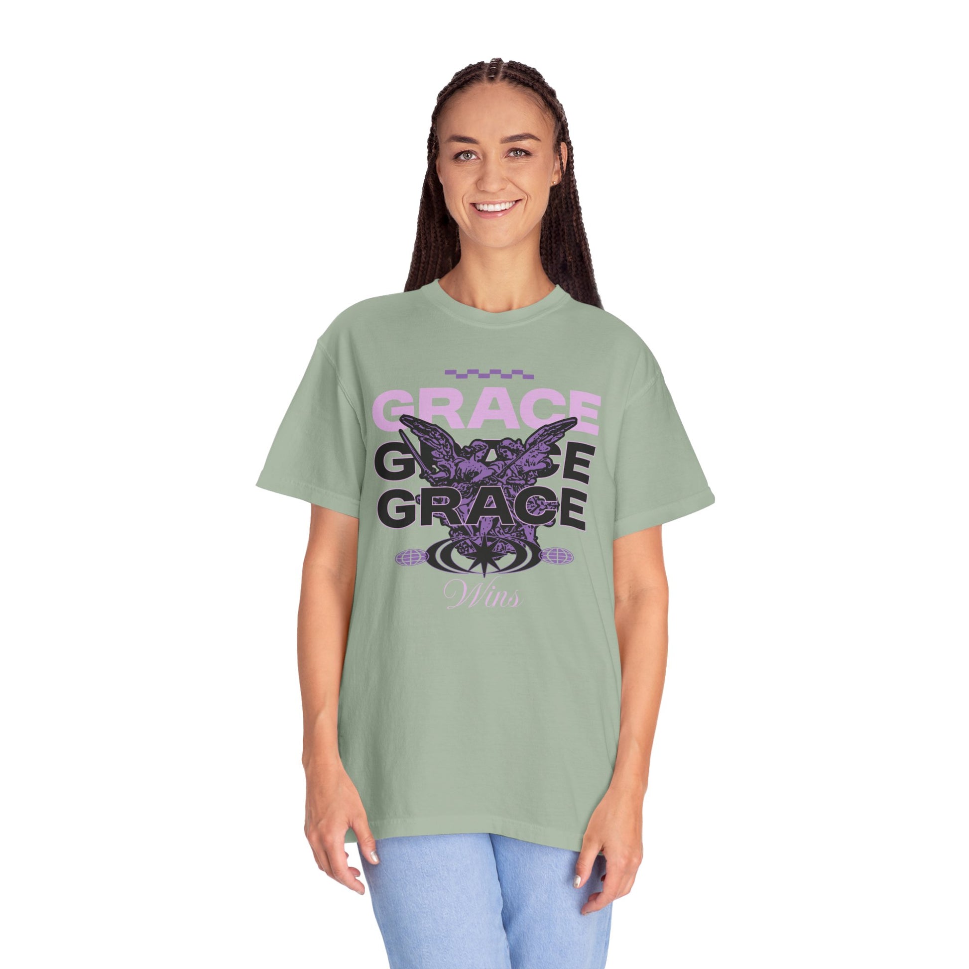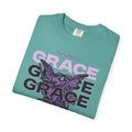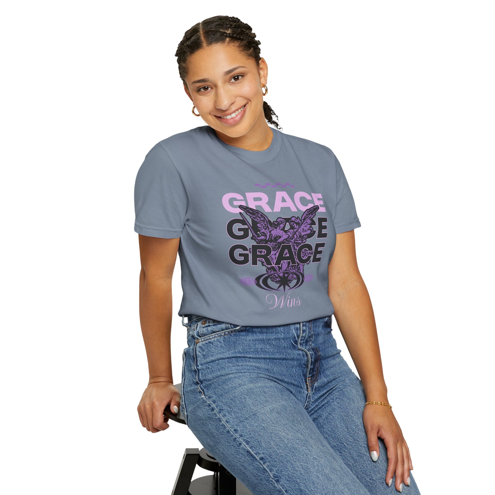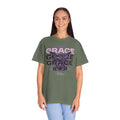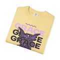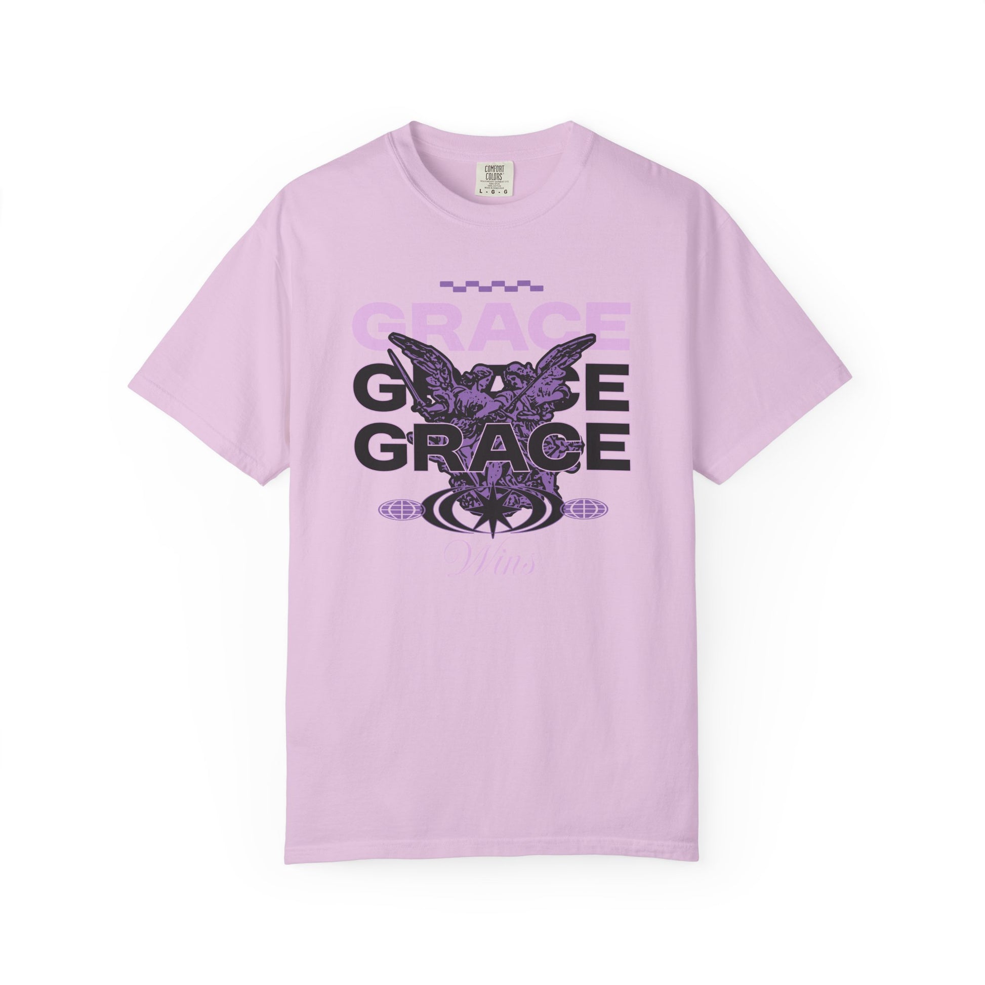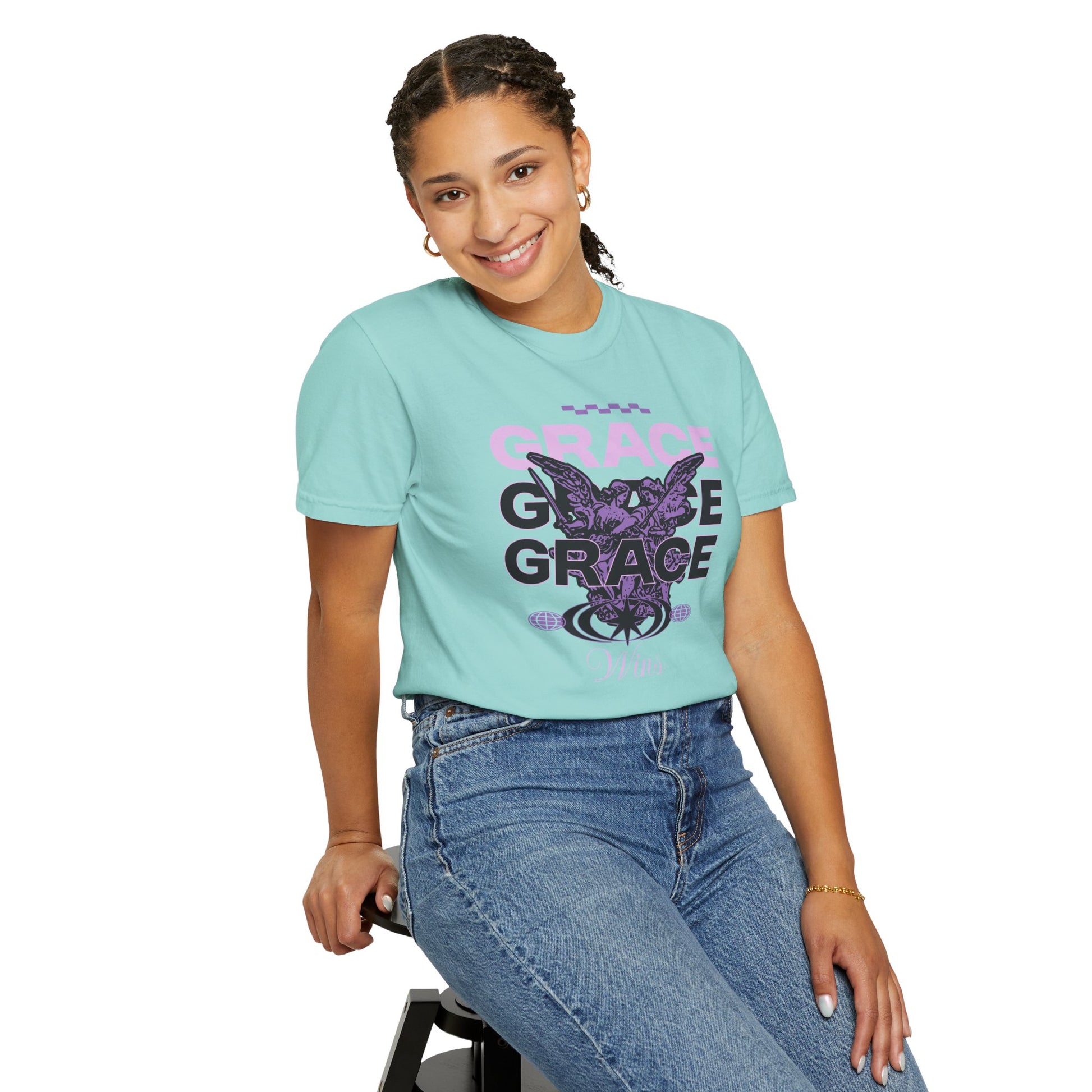 This garment-dyed tee brings a soft, lived-in feel to a bold graphic aesthetic. The relaxed fit and heavyweight 100% ring-spun cotton sit like a familiar favorite, while the layered “GRACE” text and ornate central illustration add a slightly gothic, artful edge. Wear it on slow mornings at the coffee shop or out late at a show — the muted dye and sturdy construction keep it comfortable and dependable as you move through your day. The look reads like street-ready vintage with a thoughtful, handcrafted touch; it settles in easily with denim, layered jackets, or tucked into high-waist bottoms for an effortless, intentional vibe.