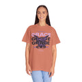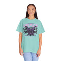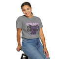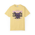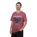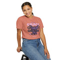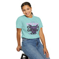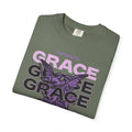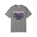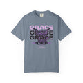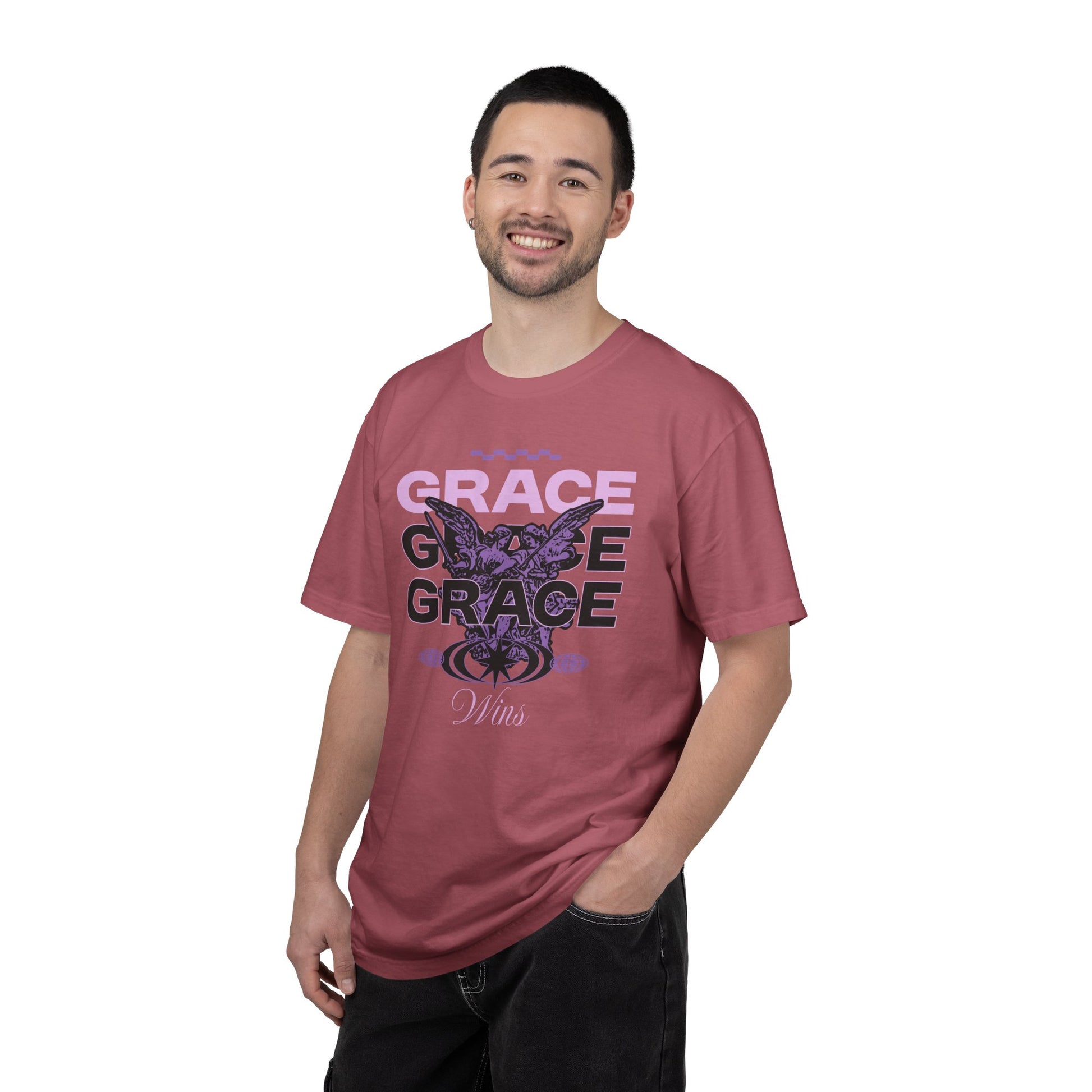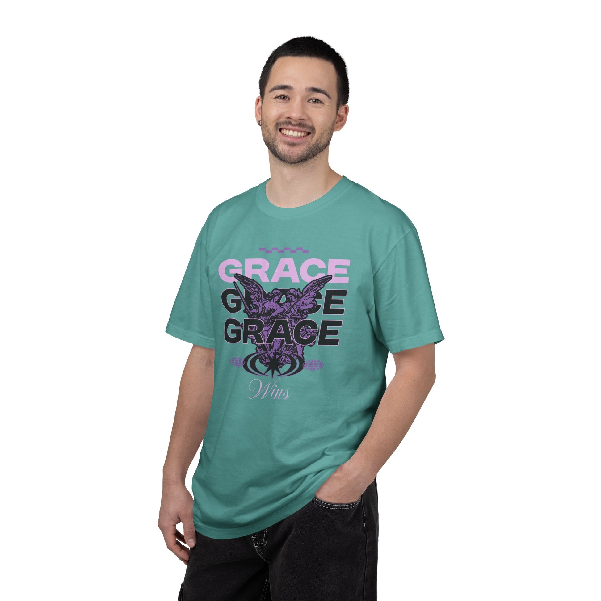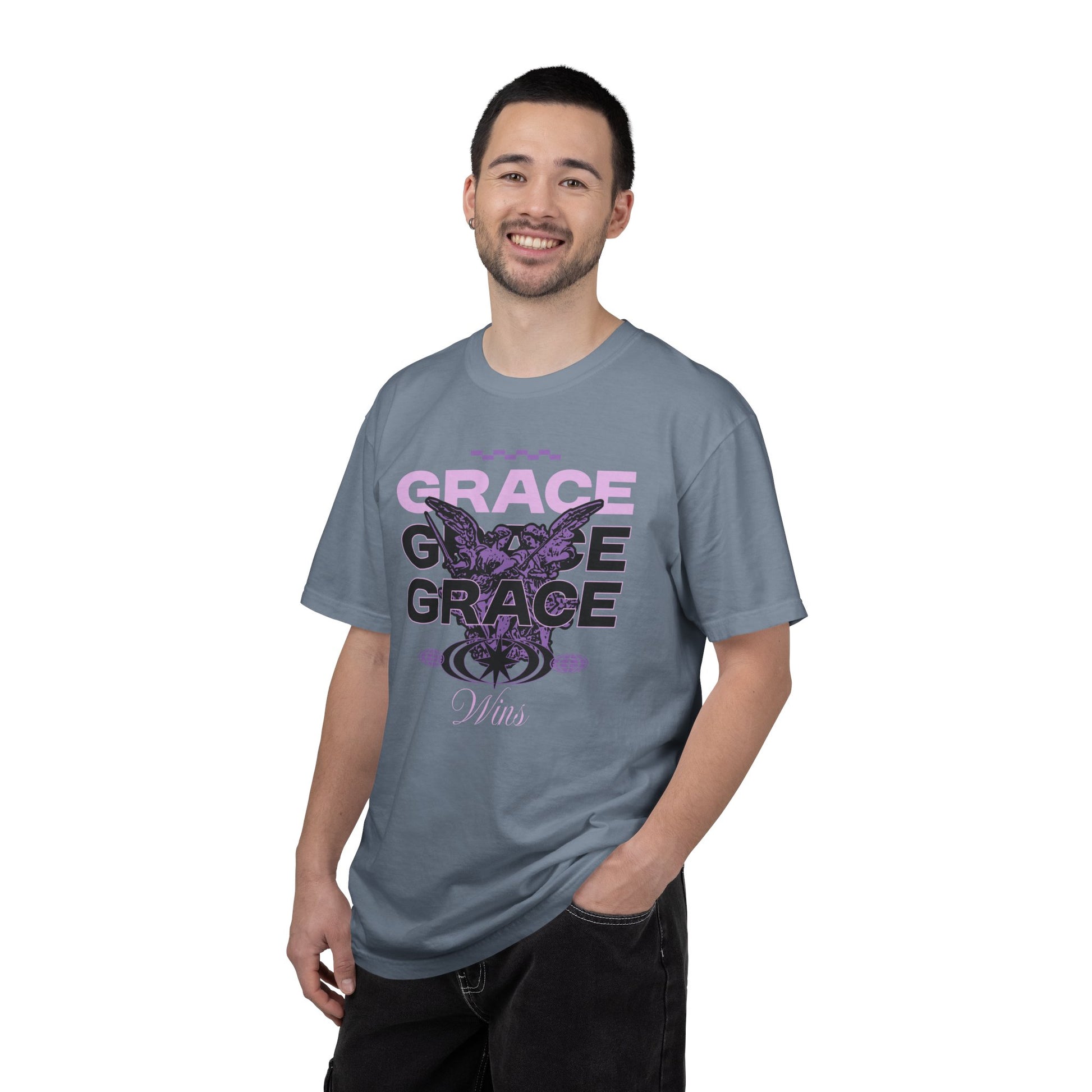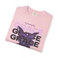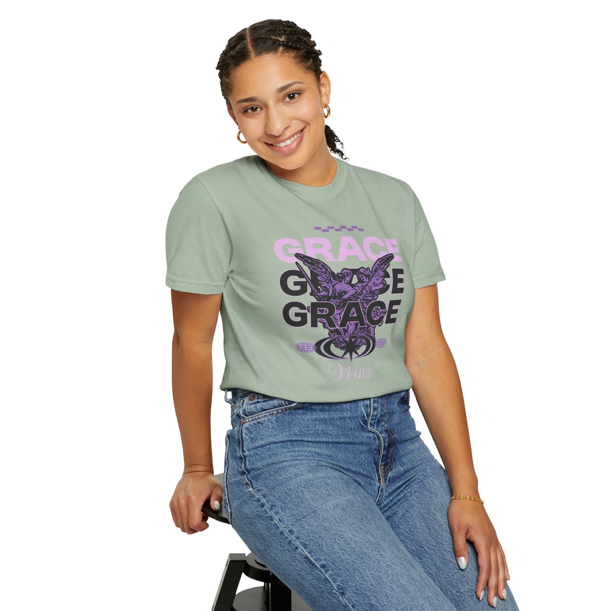 This garment-dyed tee brings a soft, lived-in feel to a bold graphic aesthetic. The relaxed fit and heavyweight 100% ring-spun cotton sit like a familiar favorite, while the layered “GRACE” text and ornate central illustration add a slightly gothic, artful edge. Wear it on slow mornings at the coffee shop or out late at a show — the muted dye and sturdy construction keep it comfortable and dependable as you move through your day. The look reads like street-ready vintage with a thoughtful, handcrafted touch; it settles in easily with denim, layered jackets, or tucked into high-waist bottoms for an effortless, intentional vibe.