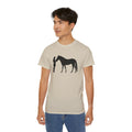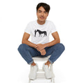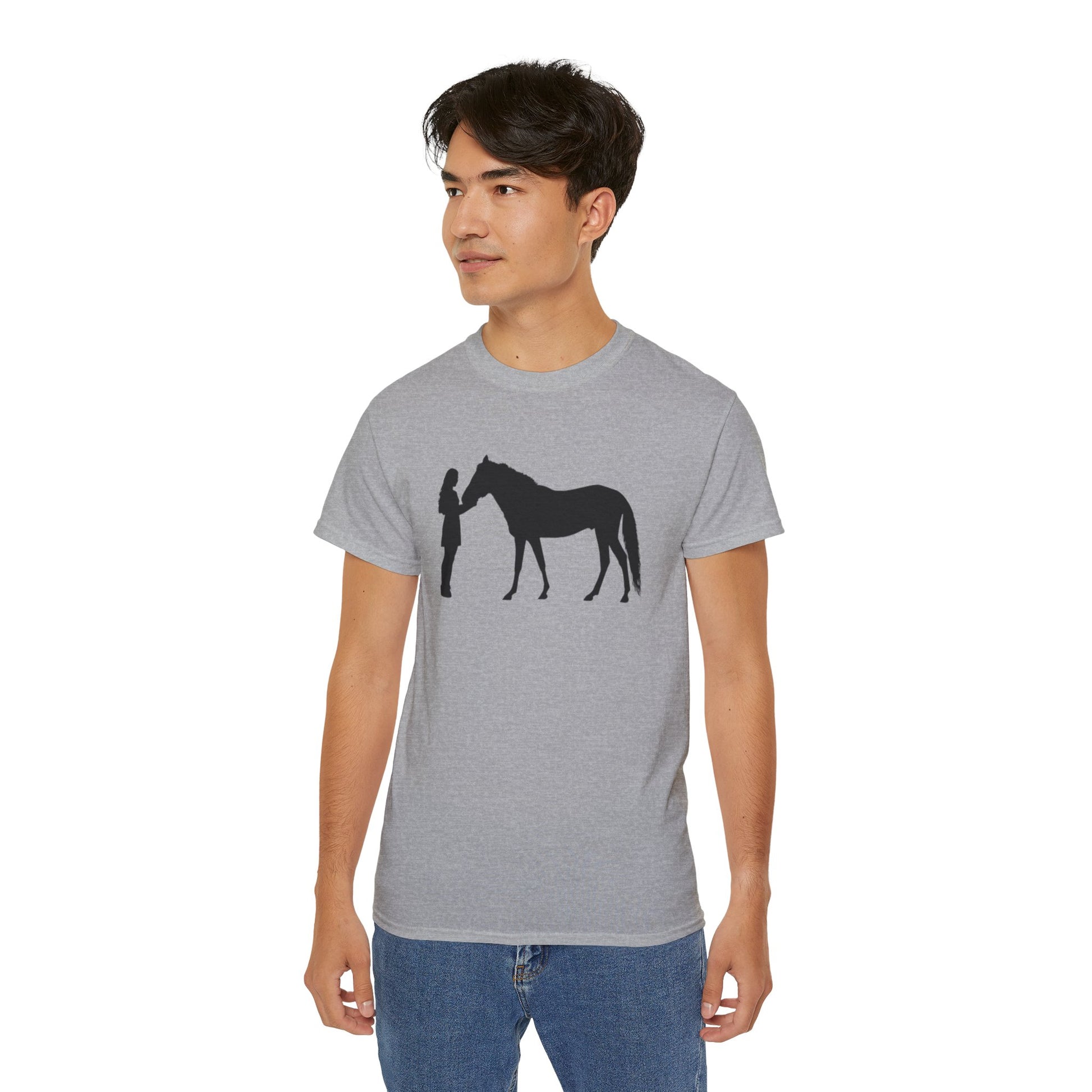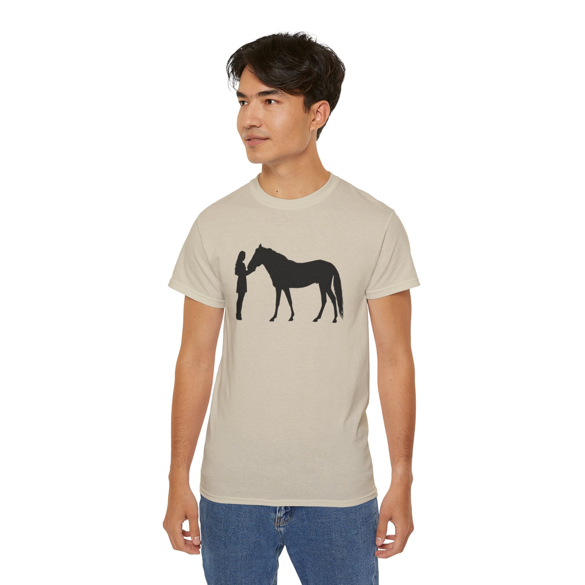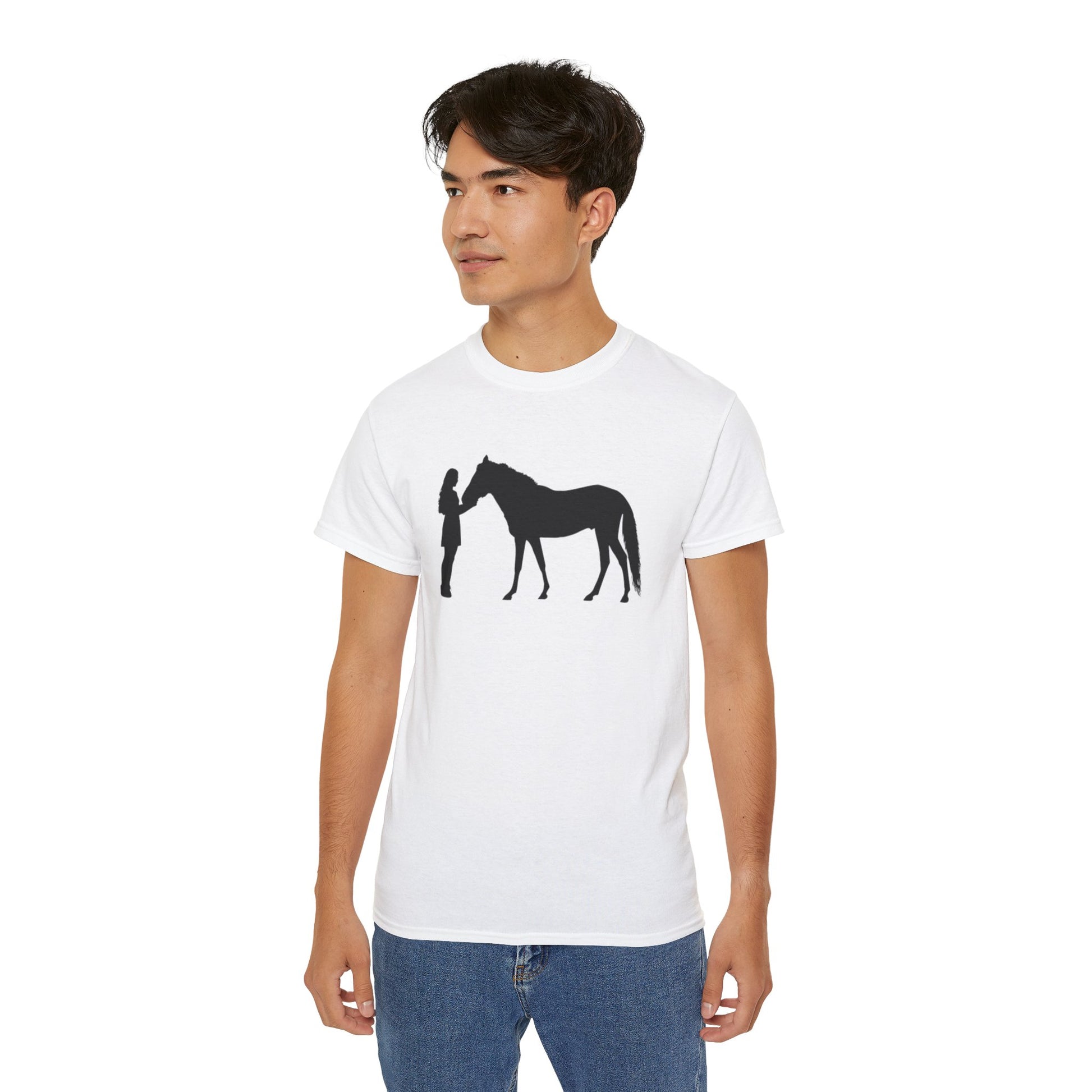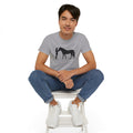 A soft, vintage-feel tee that speaks quietly to anyone who lives for the barn, the trail, or slow mornings with a faithful horse at their side. The front shows a simple black silhouette of a person and horse—intimate and calm—so the shirt reads like a small, everyday tribute to the quiet bond between rider and companion. It sits a little roomy for easy layering over a flannel or under a vest, so it goes from early-morning chores to a casual night around the fire without fuss. Ethically grown U.S. cotton gives the fabric a lived-in weight and subtle texture that only improves over washes. Wear it when you want comfort that feels honest and a design that starts conversations rather than shouting for attention.