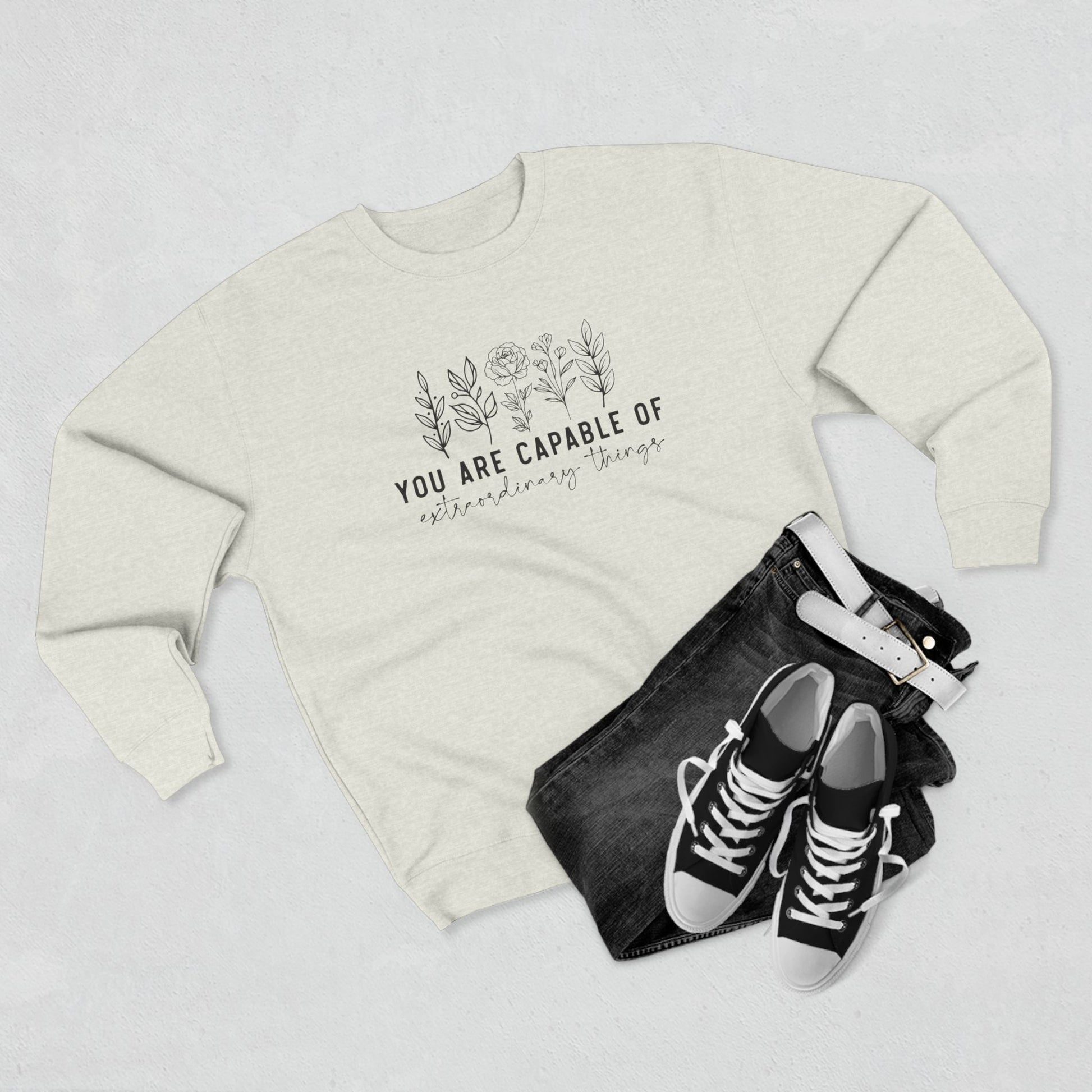 Lightweight, cozy, and quietly encouraging — this crewneck sweatshirt wears like a warm exhale. Soft heather fabric and a relaxed, regular fit wrap you in gentle structure while the subtle floral line art and hand-lettered message, "You are capable of...", sits over the heart. It looks lived-in without losing shape thanks to side seams, ribbed collar, and durable double-needle stitching. Wear it on slow mornings with coffee, layered for evening walks, or as a steady reminder during long workdays. The muted design blends with calm wardrobes and speaks softly to anyone steering through change or rebuilding confidence.