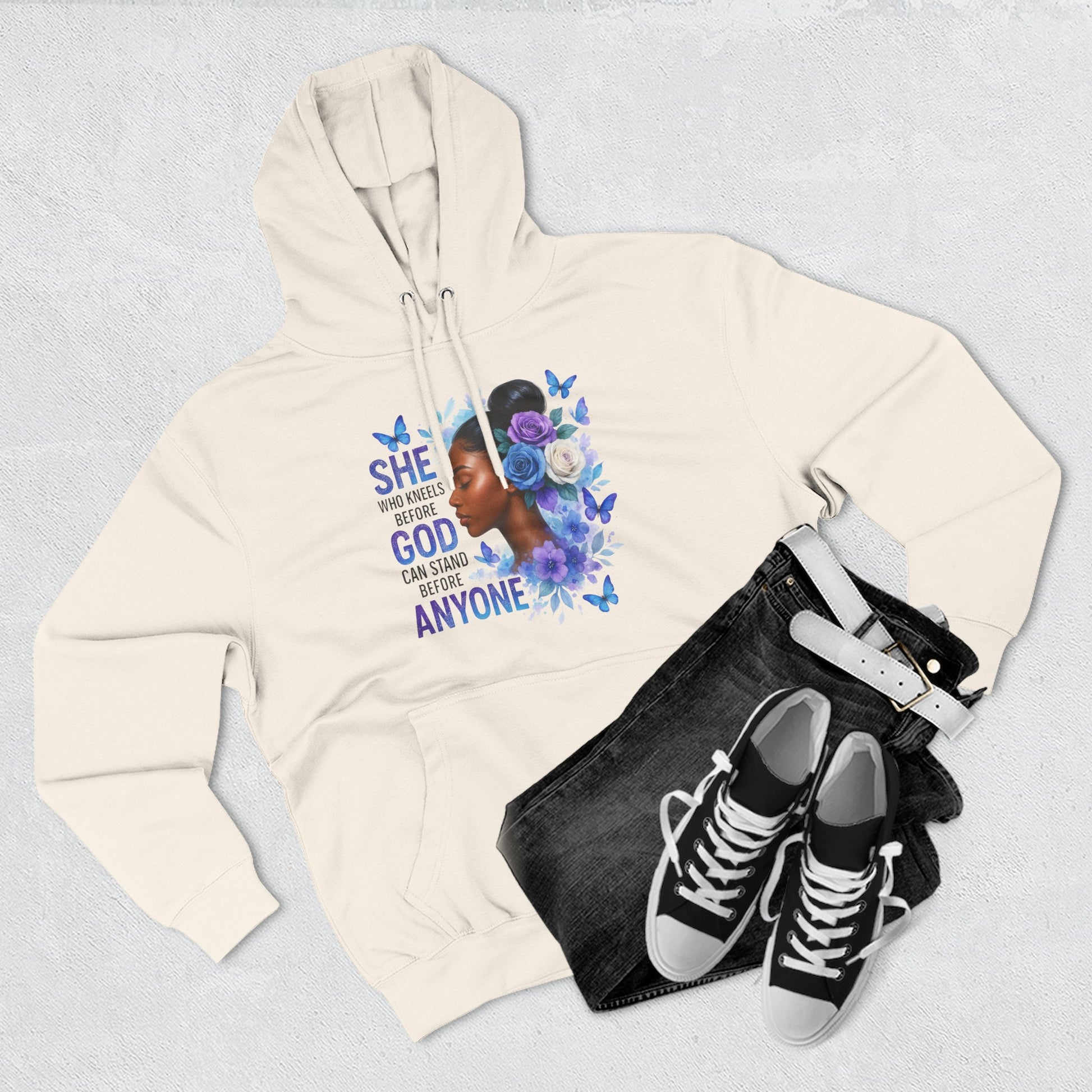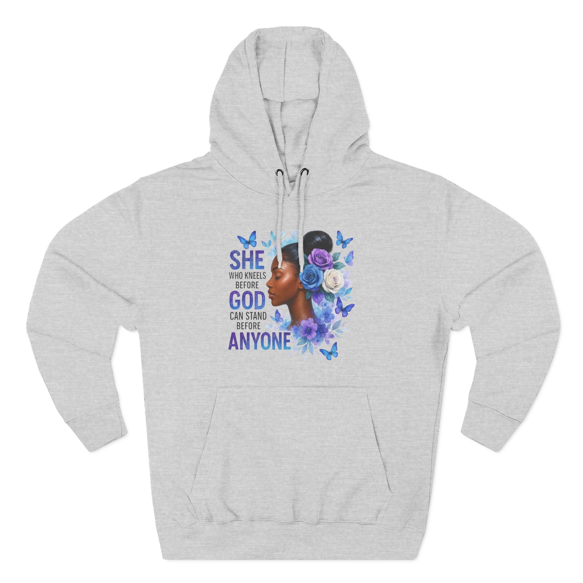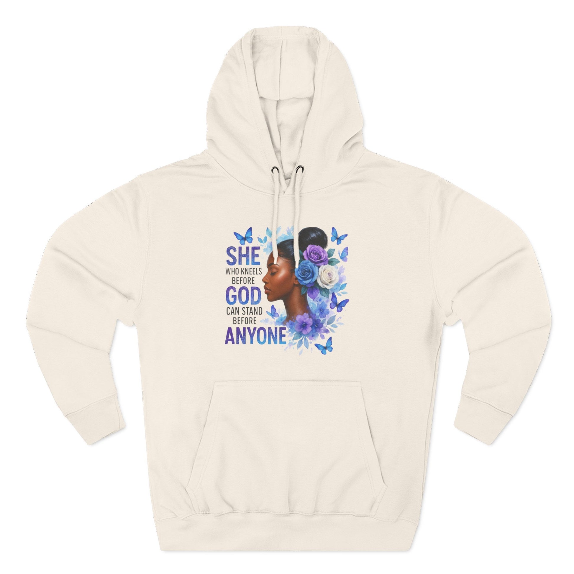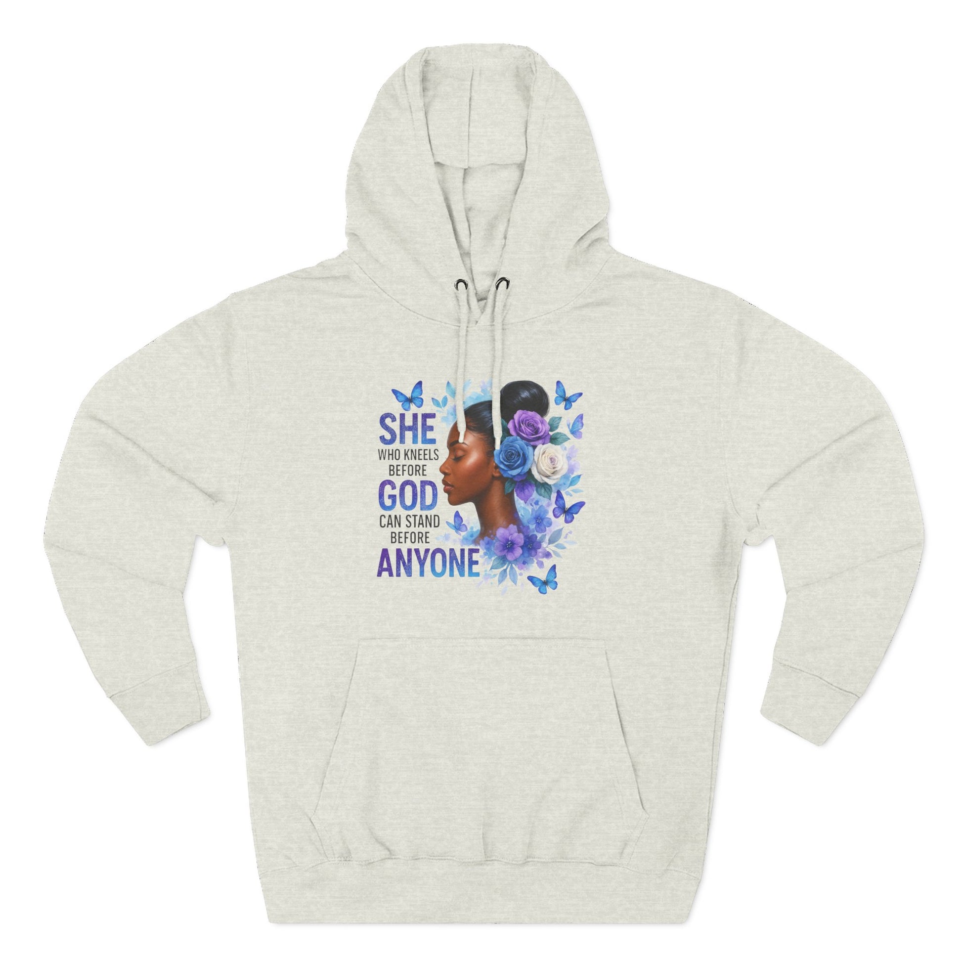 This soft, medium-weight hoodie wraps you in calm strength. A gentle three-panel hood and adjustable drawstrings create a cozy small sanctuary around your head, while the kangaroo pocket keeps hands warm and grounded. The front artwork — a serene, floral-accented portrait with the encouraging line “She who kneels before God can stand before anyone” — pairs with a minimalist, uplifting message printed across the back to carry quiet confidence through the day. Smooth, ring-spun fibers give the fabric a luxurious hand-feel and a clean surface that holds print and embroidery beautifully. Built to move with you, the regular fit, reinforced seams, and stabilizing neck tape keep its shape wash after wash. Wear it to slow mornings, faith-centered meetups, or when you need a visible reminder of resilience.
