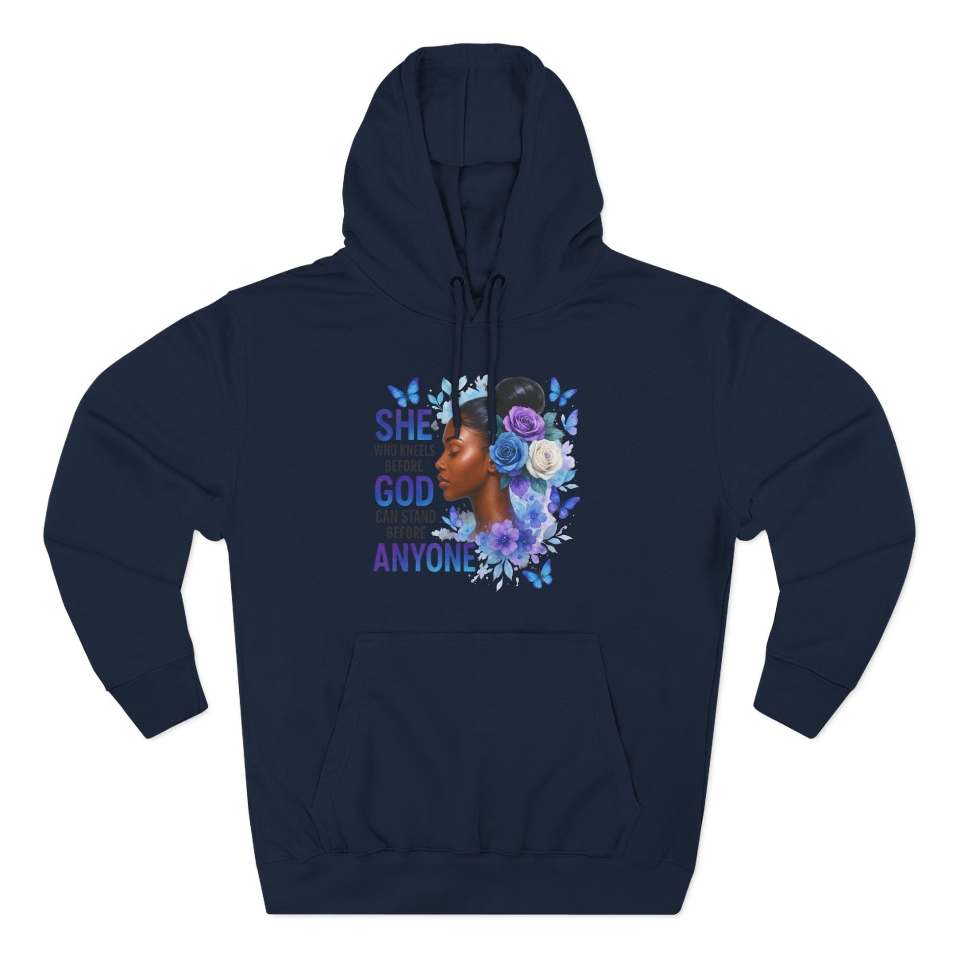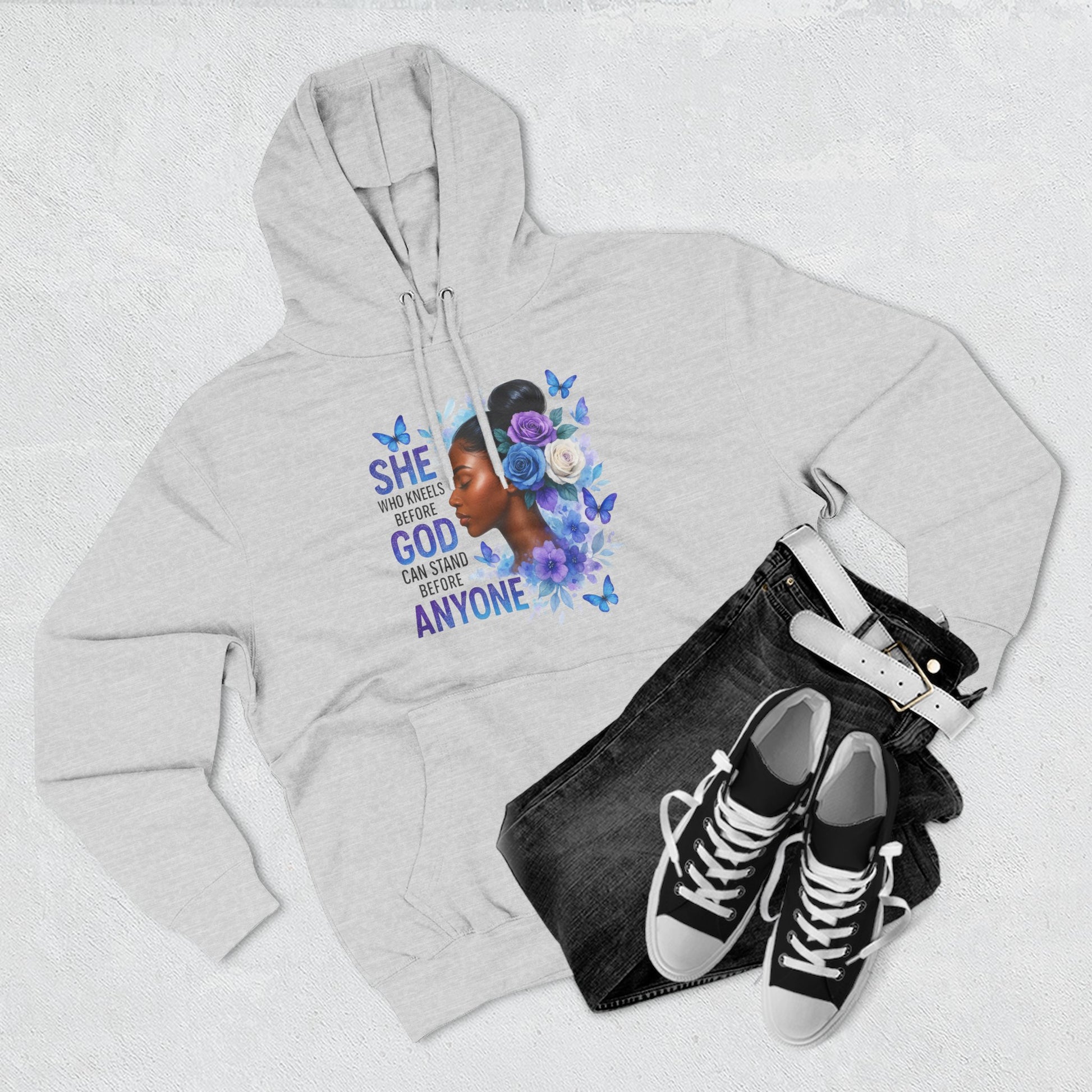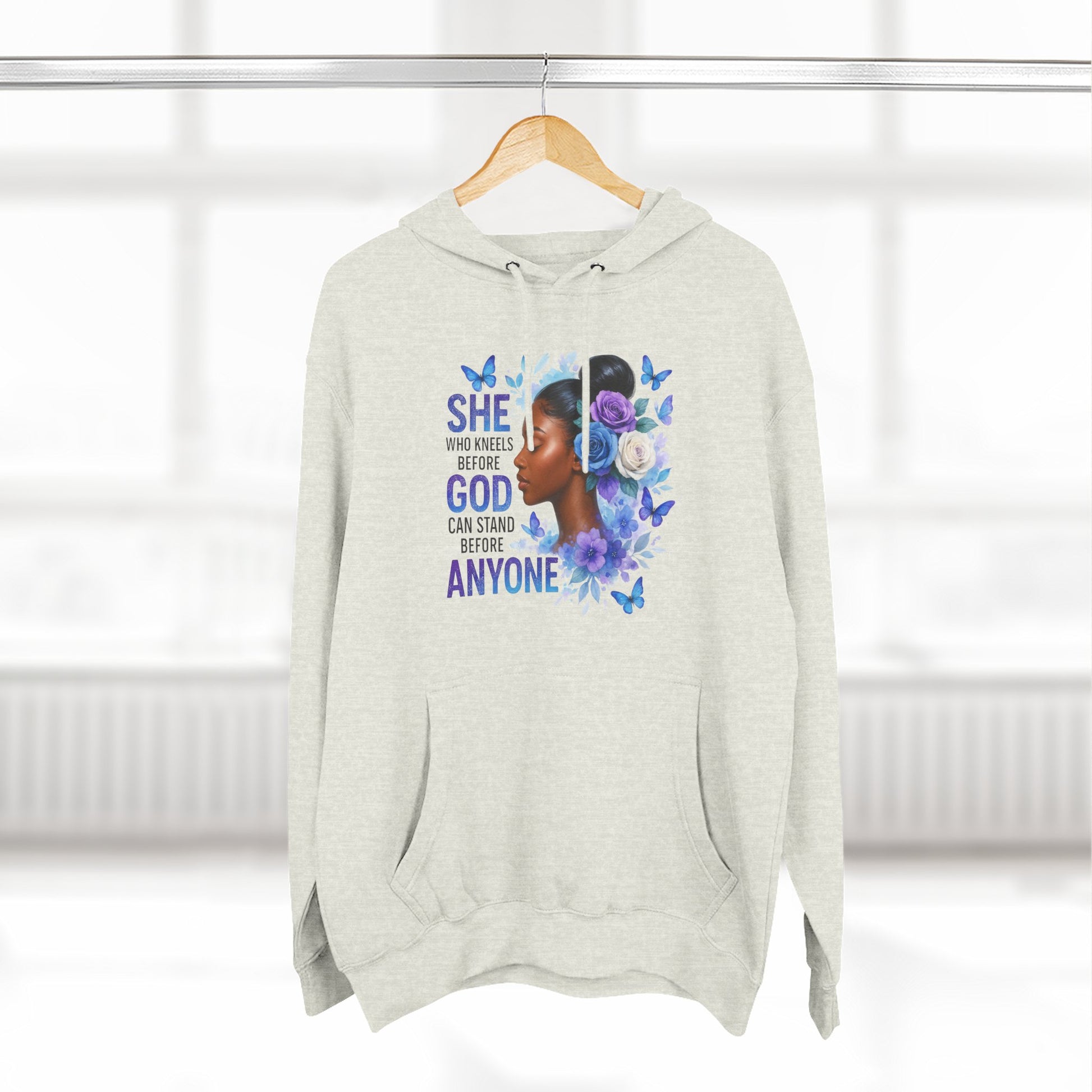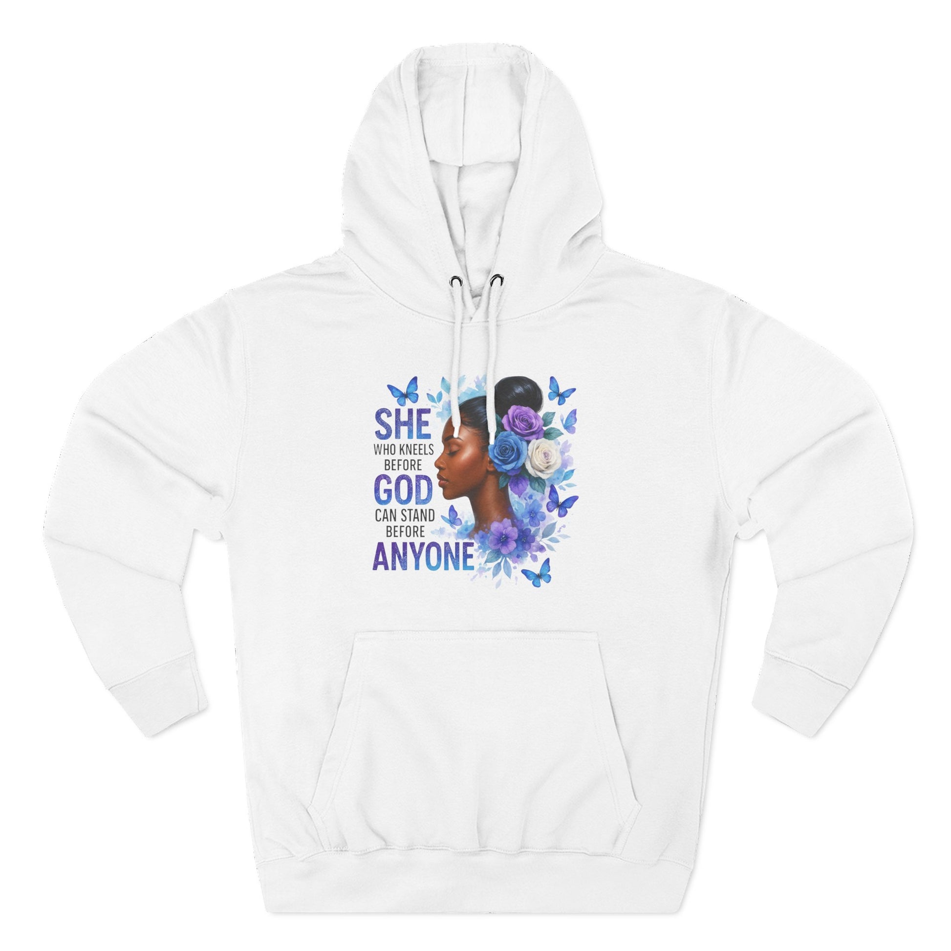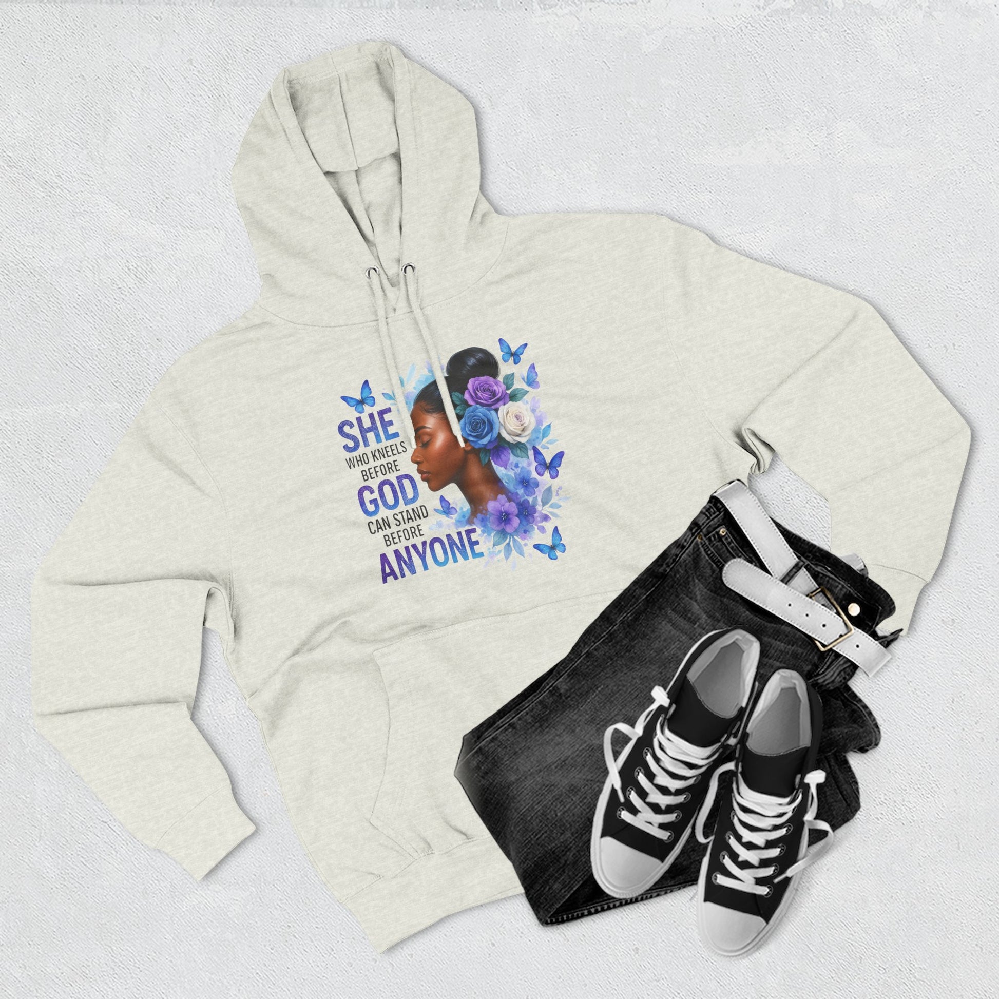 This soft, medium-weight hoodie wraps you in calm strength. A gentle three-panel hood and adjustable drawstrings create a cozy small sanctuary around your head, while the kangaroo pocket keeps hands warm and grounded. The front artwork — a serene, floral-accented portrait with the encouraging line “She who kneels before God can stand before anyone” — pairs with a minimalist, uplifting message printed across the back to carry quiet confidence through the day. Smooth, ring-spun fibers give the fabric a luxurious hand-feel and a clean surface that holds print and embroidery beautifully. Built to move with you, the regular fit, reinforced seams, and stabilizing neck tape keep its shape wash after wash. Wear it to slow mornings, faith-centered meetups, or when you need a visible reminder of resilience.