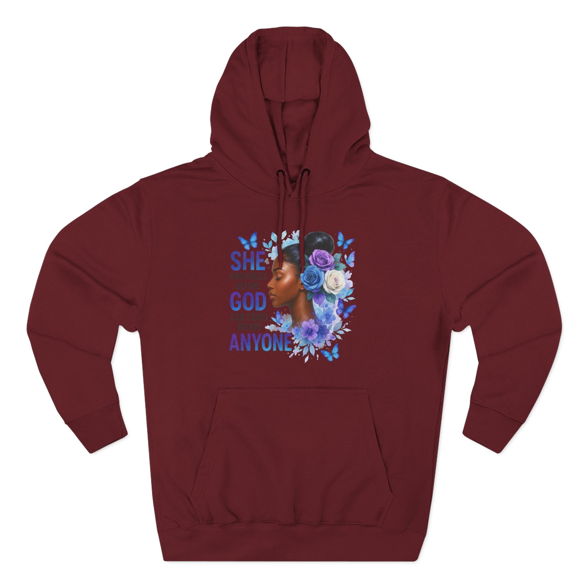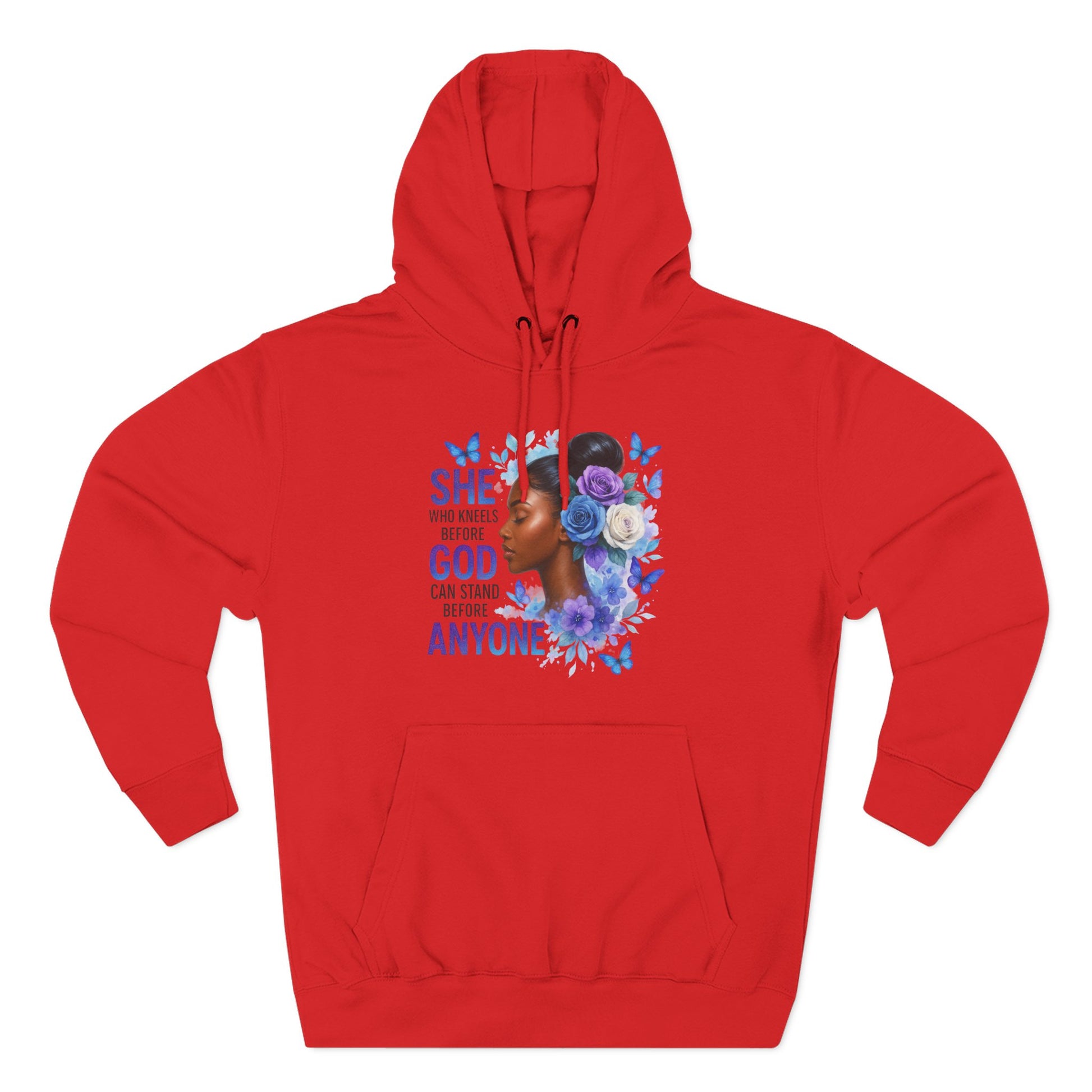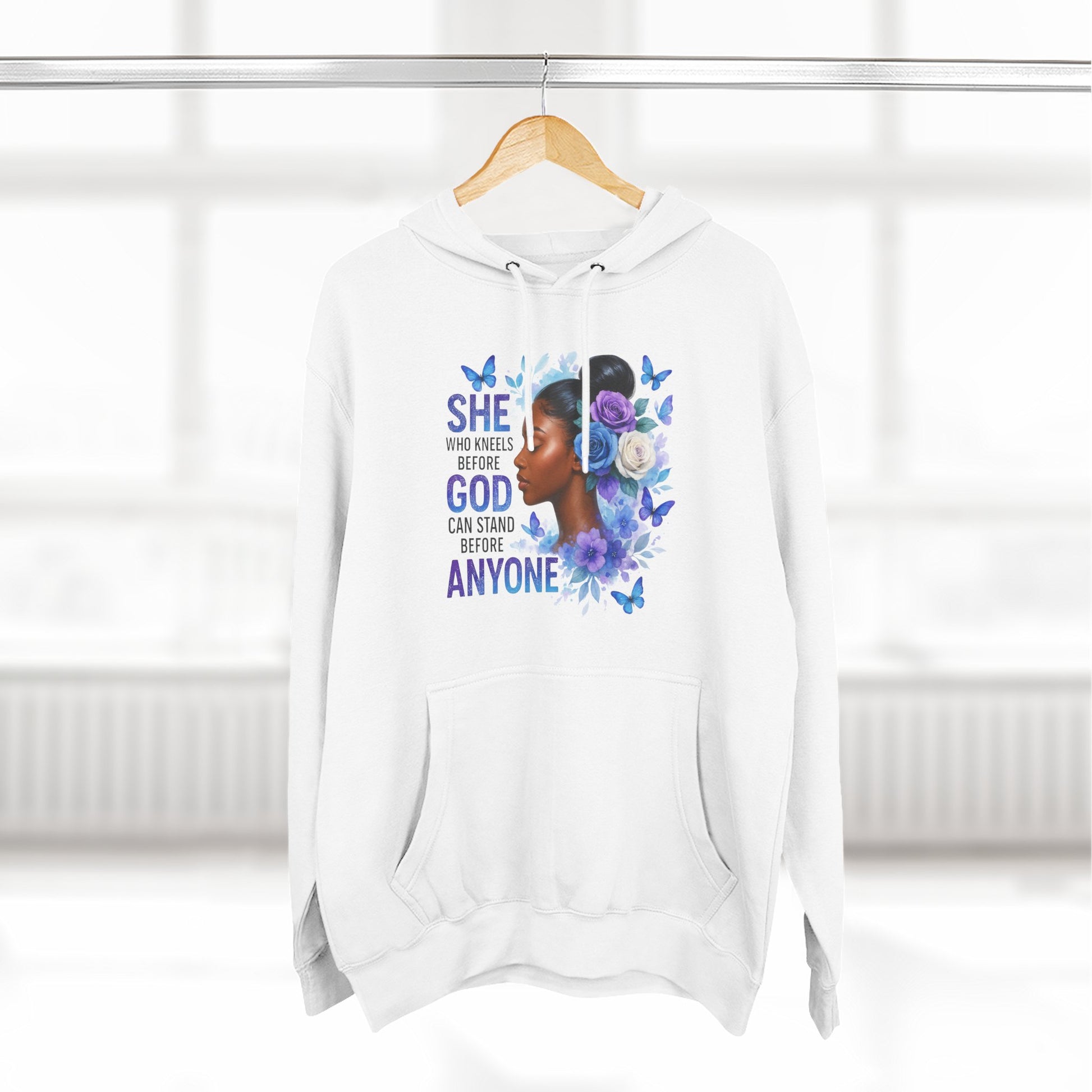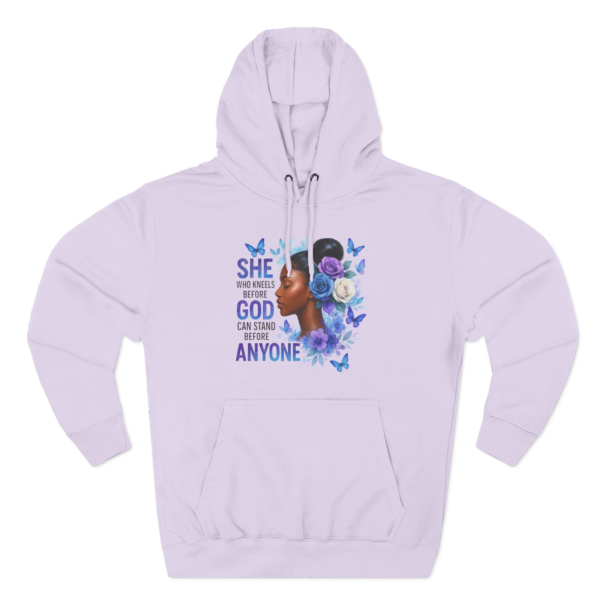 This soft, medium-weight hoodie wraps you in calm strength. A gentle three-panel hood and adjustable drawstrings create a cozy small sanctuary around your head, while the kangaroo pocket keeps hands warm and grounded. The front artwork — a serene, floral-accented portrait with the encouraging line “She who kneels before God can stand before anyone” — pairs with a minimalist, uplifting message printed across the back to carry quiet confidence through the day. Smooth, ring-spun fibers give the fabric a luxurious hand-feel and a clean surface that holds print and embroidery beautifully. Built to move with you, the regular fit, reinforced seams, and stabilizing neck tape keep its shape wash after wash. Wear it to slow mornings, faith-centered meetups, or when you need a visible reminder of resilience.