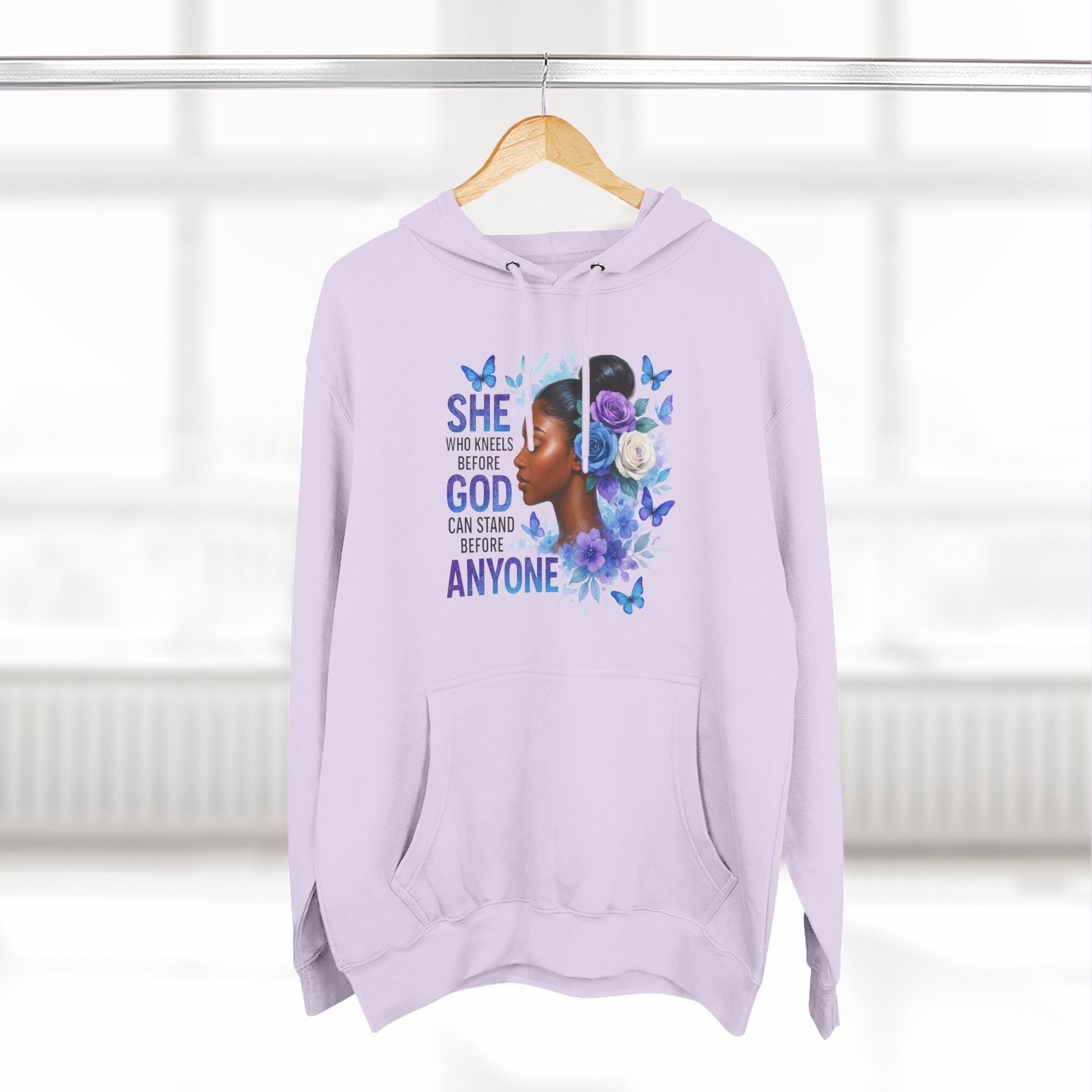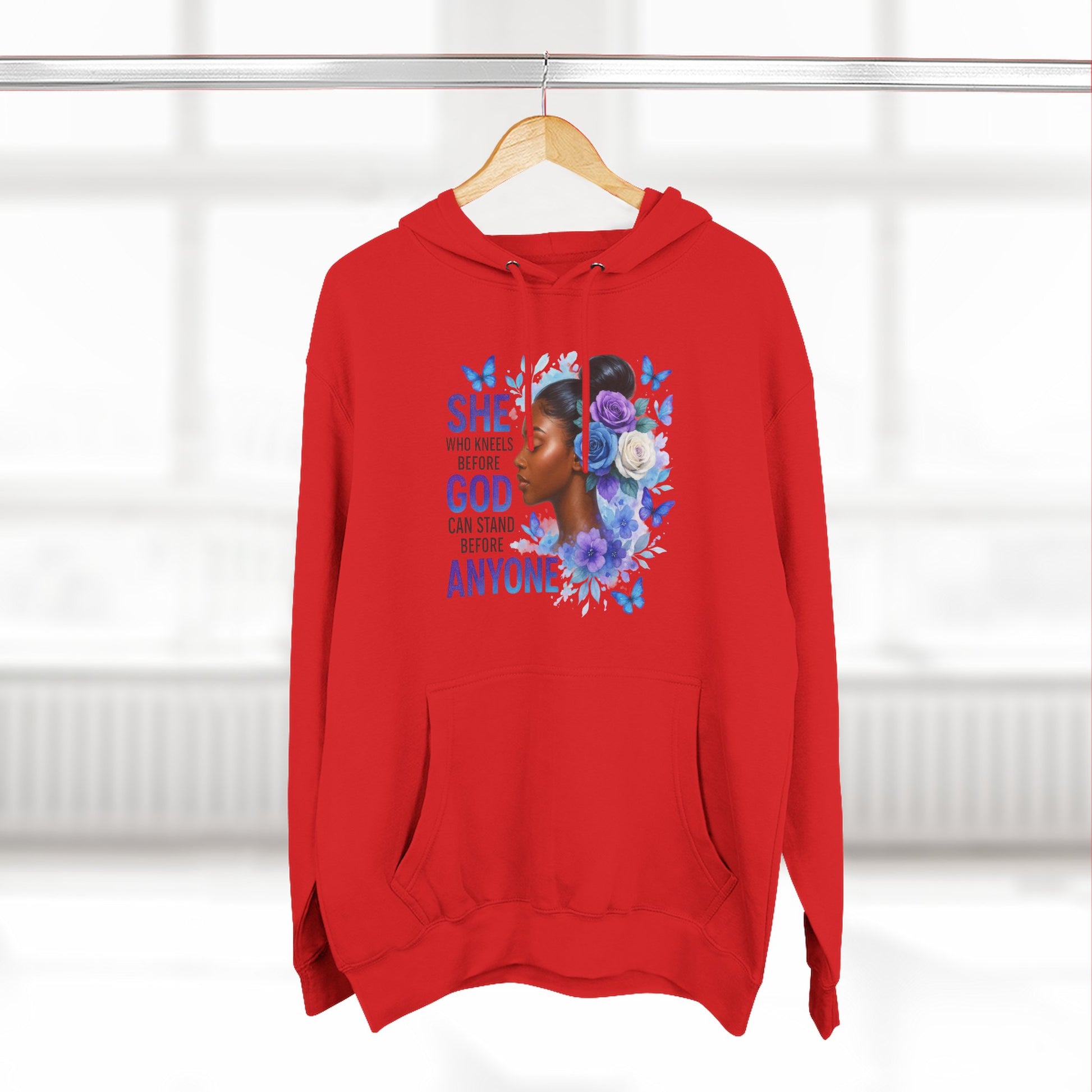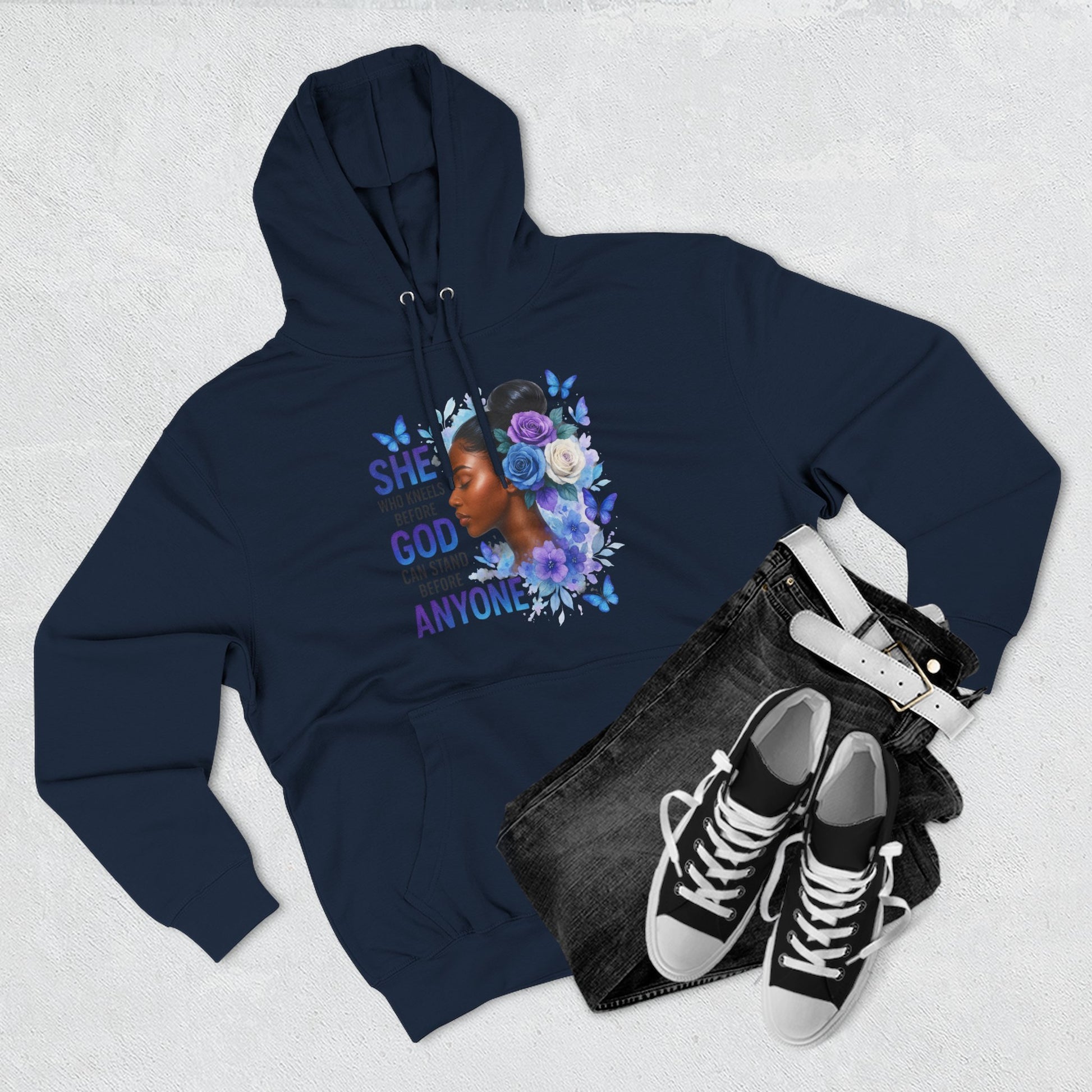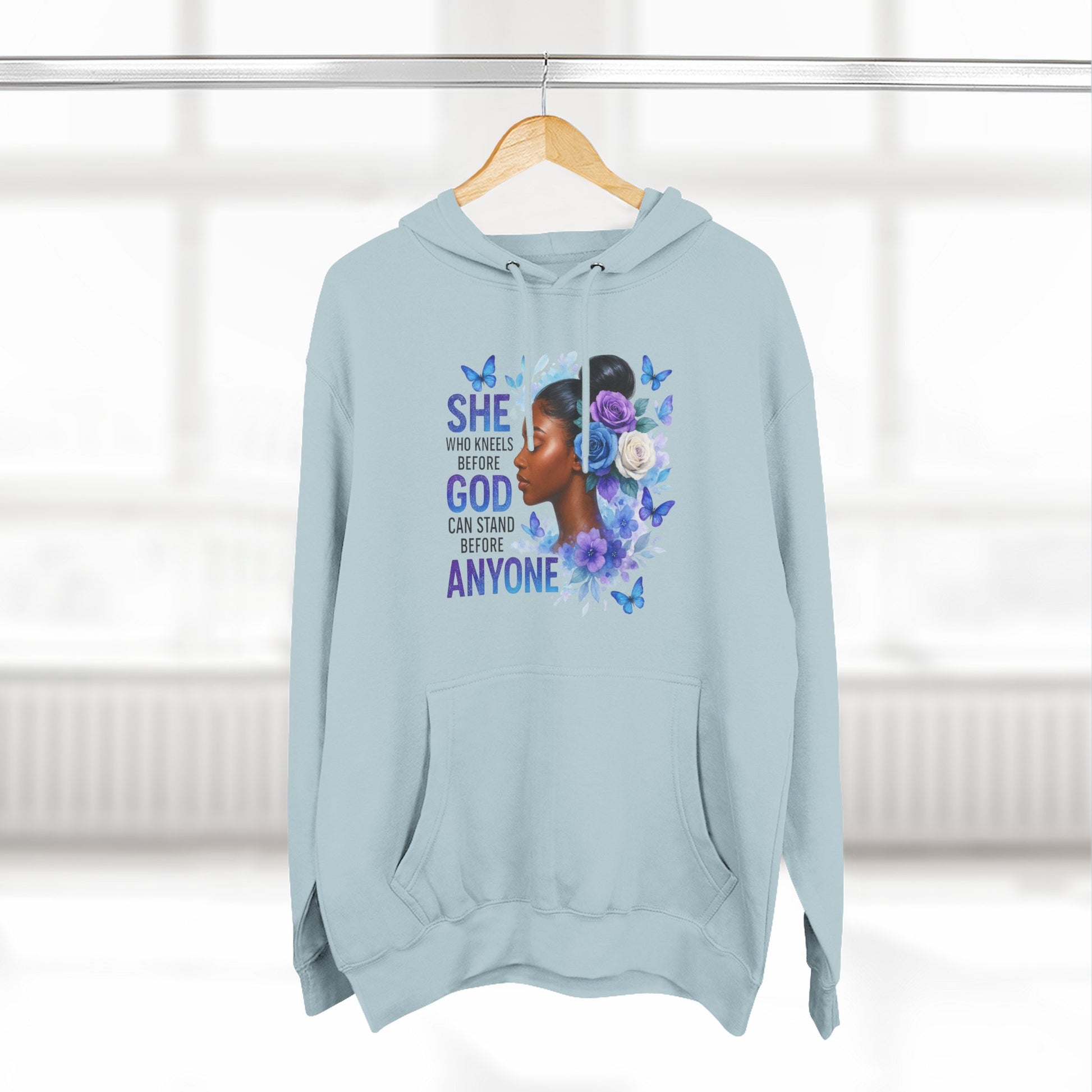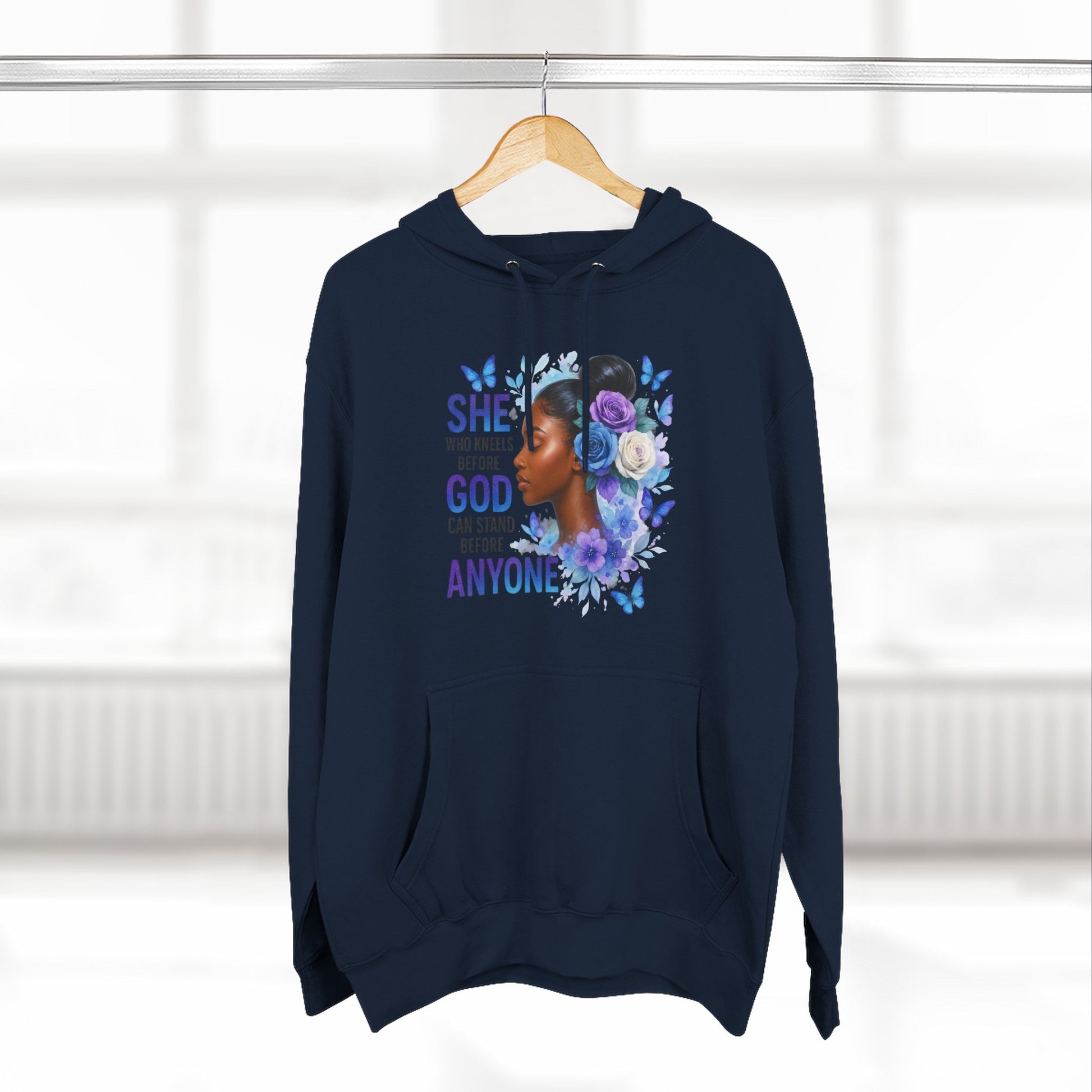 This soft, medium-weight hoodie wraps you in calm strength. A gentle three-panel hood and adjustable drawstrings create a cozy small sanctuary around your head, while the kangaroo pocket keeps hands warm and grounded. The front artwork — a serene, floral-accented portrait with the encouraging line “She who kneels before God can stand before anyone” — pairs with a minimalist, uplifting message printed across the back to carry quiet confidence through the day. Smooth, ring-spun fibers give the fabric a luxurious hand-feel and a clean surface that holds print and embroidery beautifully. Built to move with you, the regular fit, reinforced seams, and stabilizing neck tape keep its shape wash after wash. Wear it to slow mornings, faith-centered meetups, or when you need a visible reminder of resilience.