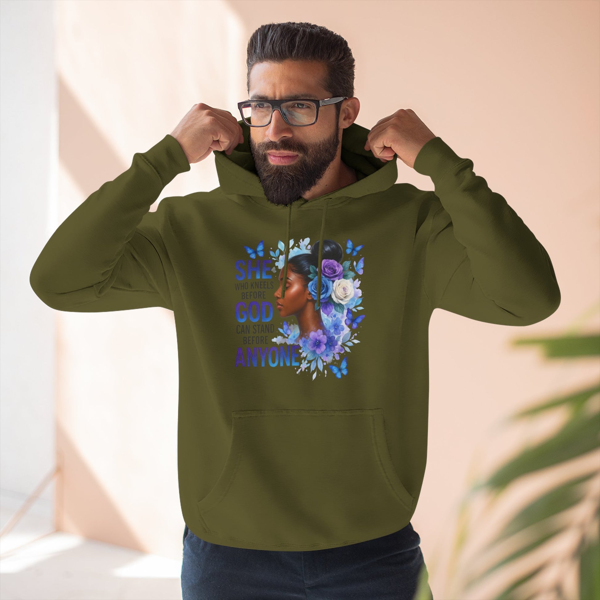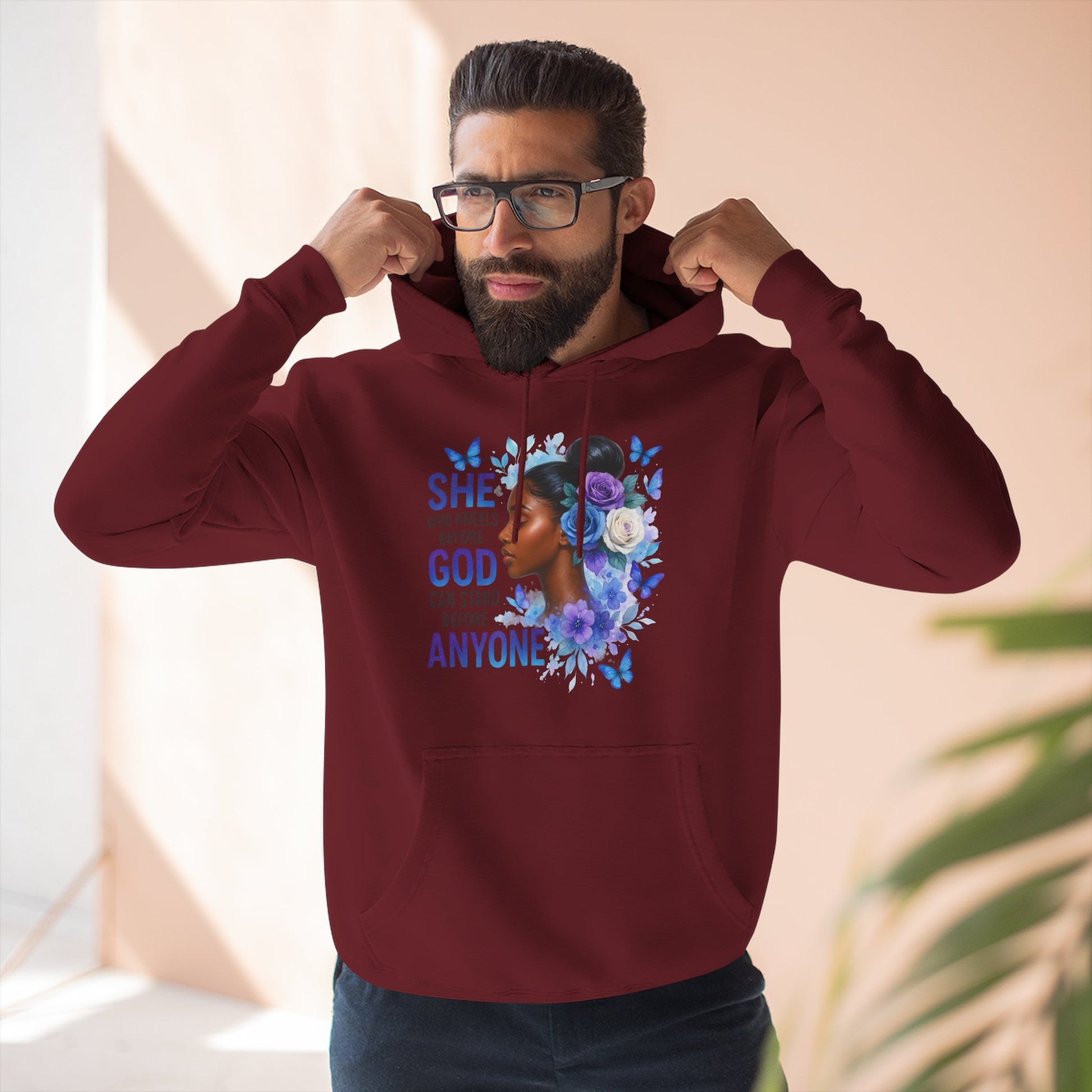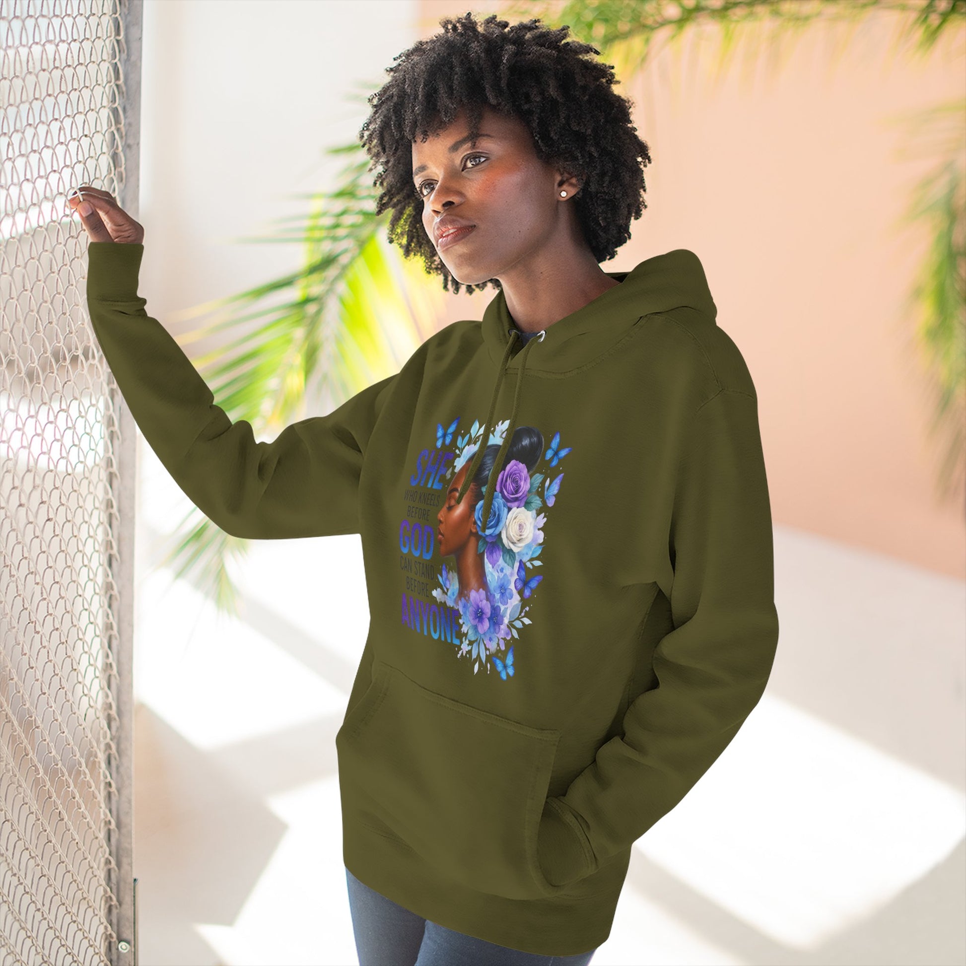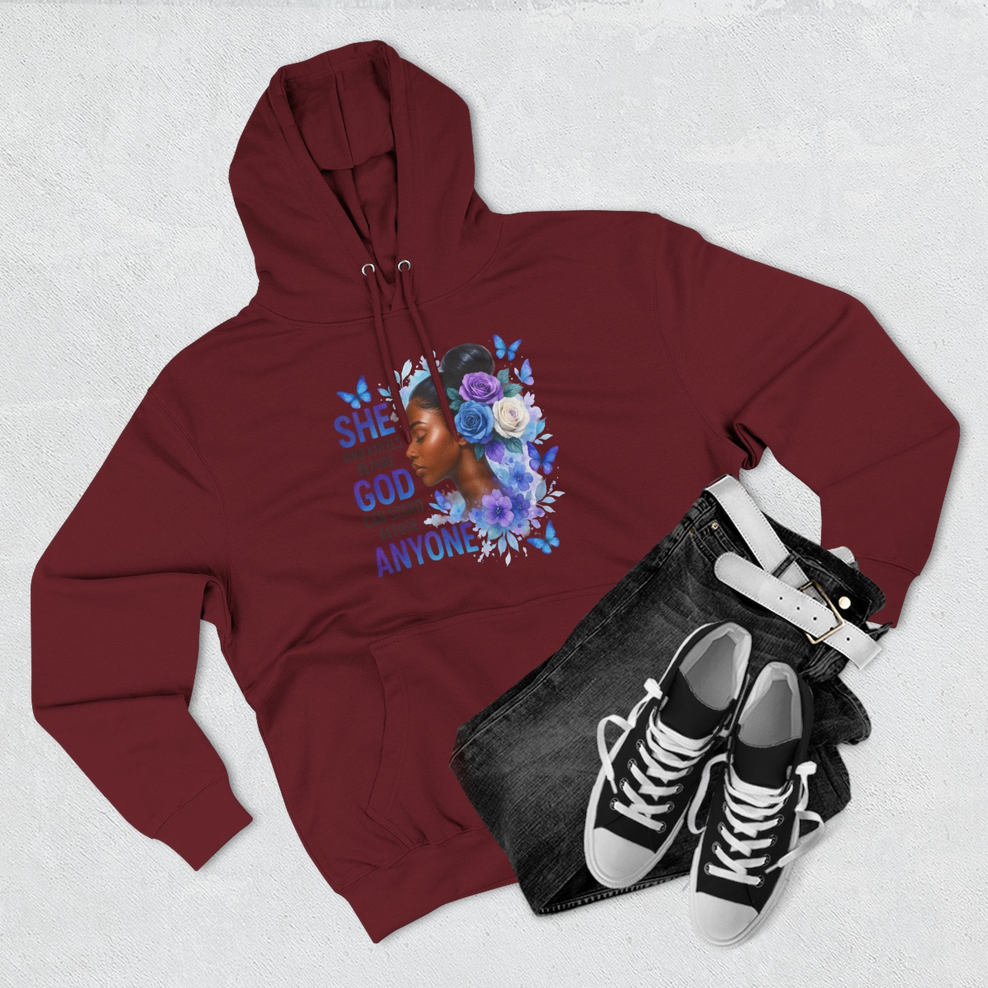 This soft, medium-weight hoodie wraps you in calm strength. A gentle three-panel hood and adjustable drawstrings create a cozy small sanctuary around your head, while the kangaroo pocket keeps hands warm and grounded. The front artwork — a serene, floral-accented portrait with the encouraging line “She who kneels before God can stand before anyone” — pairs with a minimalist, uplifting message printed across the back to carry quiet confidence through the day. Smooth, ring-spun fibers give the fabric a luxurious hand-feel and a clean surface that holds print and embroidery beautifully. Built to move with you, the regular fit, reinforced seams, and stabilizing neck tape keep its shape wash after wash. Wear it to slow mornings, faith-centered meetups, or when you need a visible reminder of resilience.