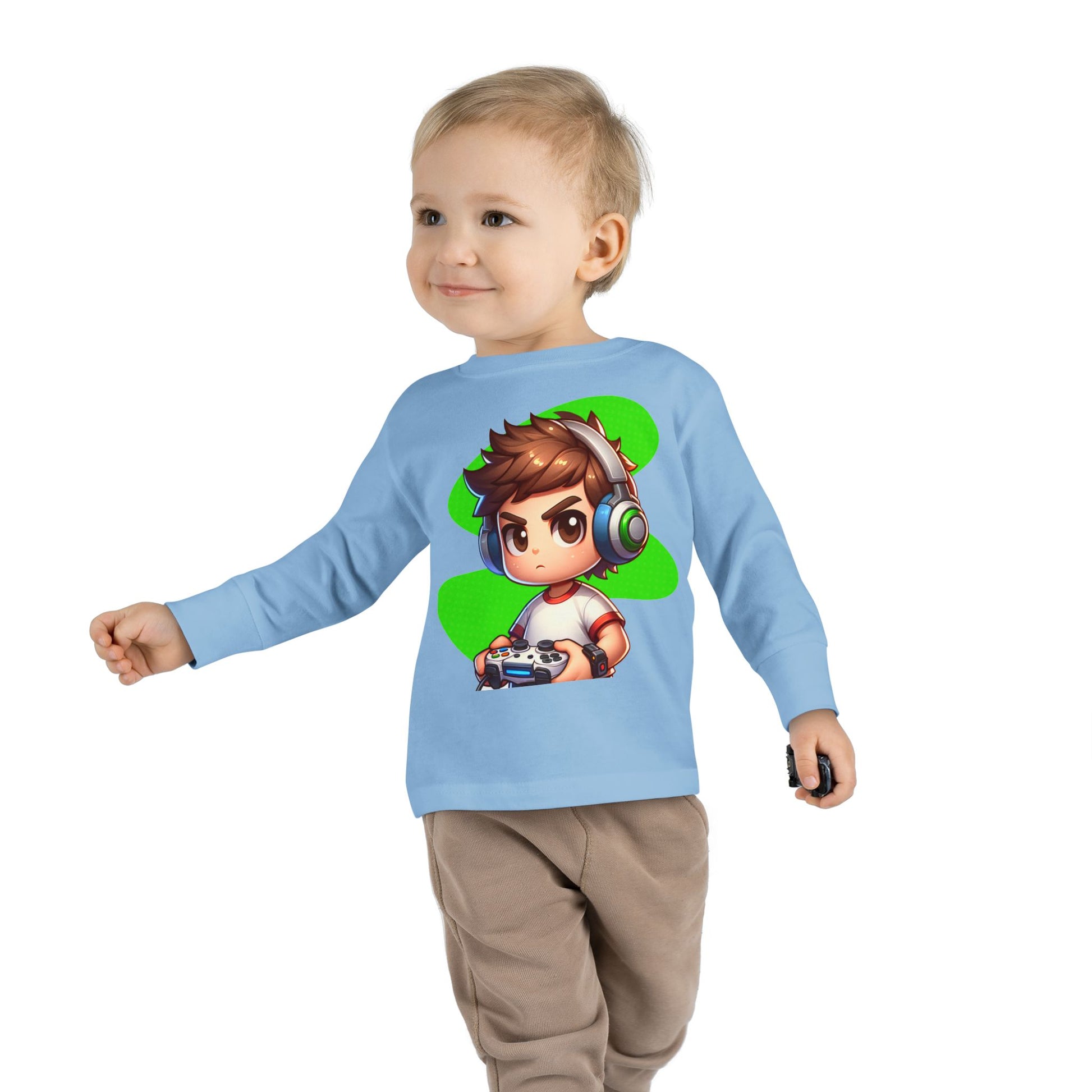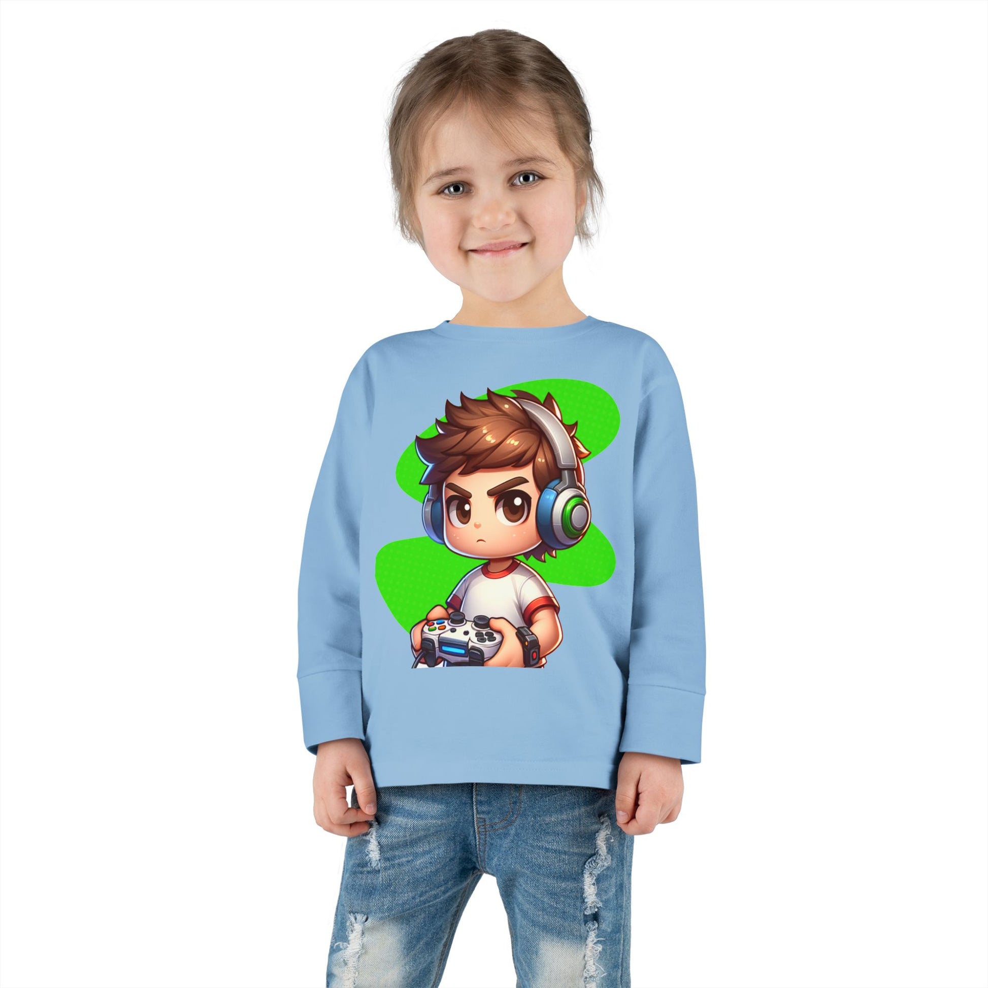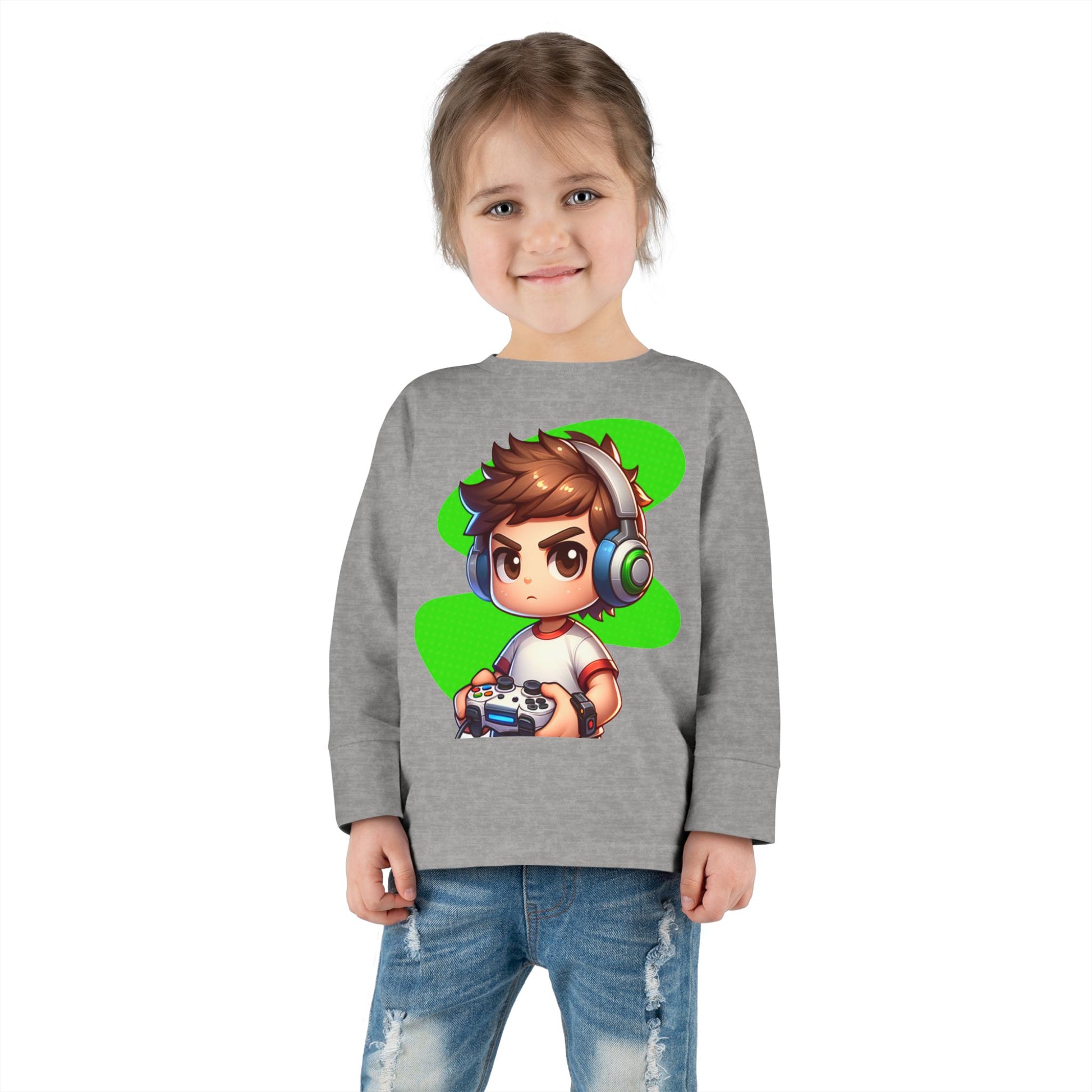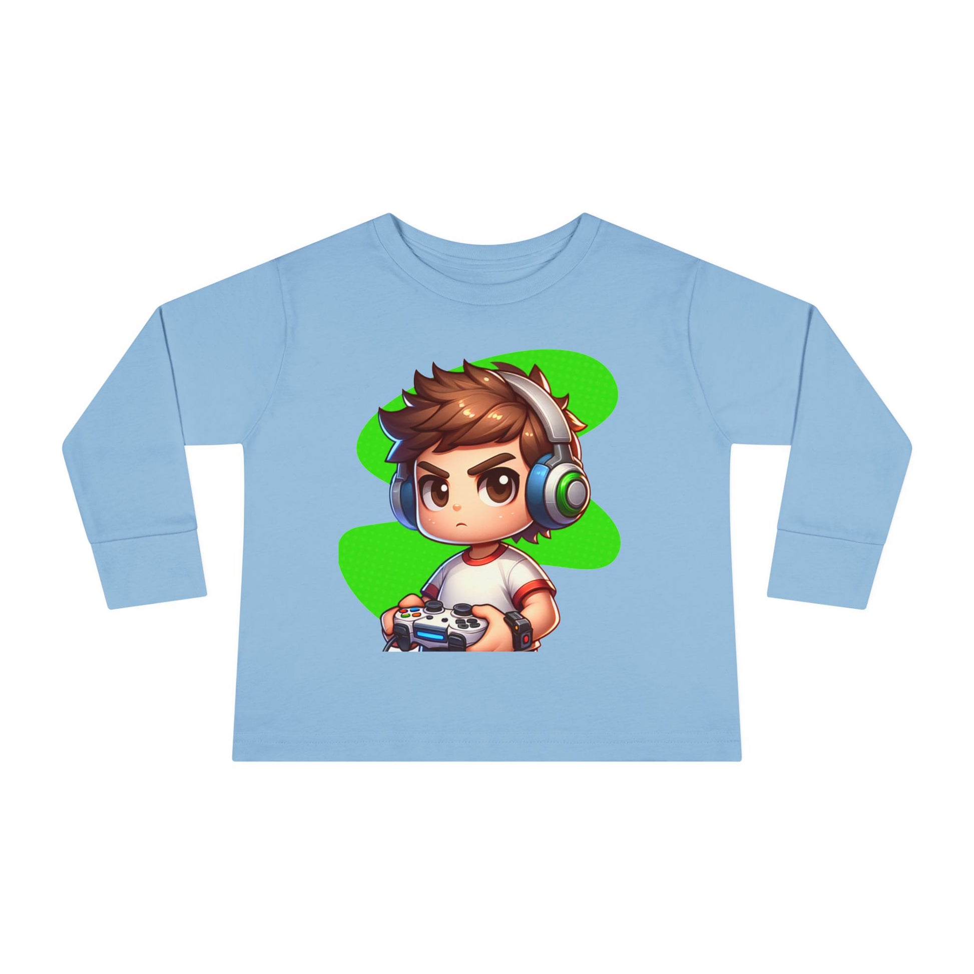 Kids Gamer Long Sleeve Tee — Cute Cartoon Boy with Headset & Controller
