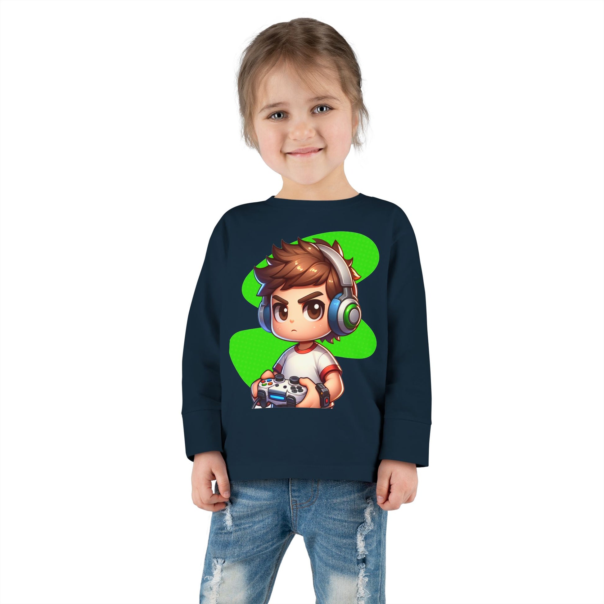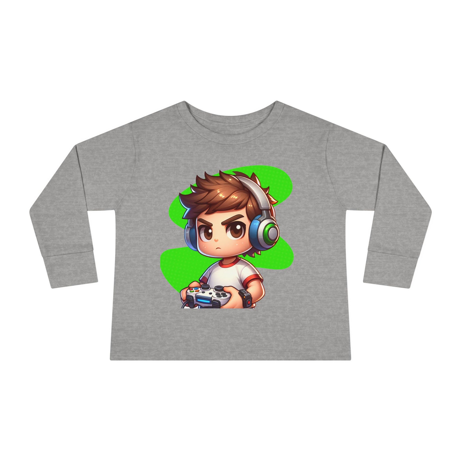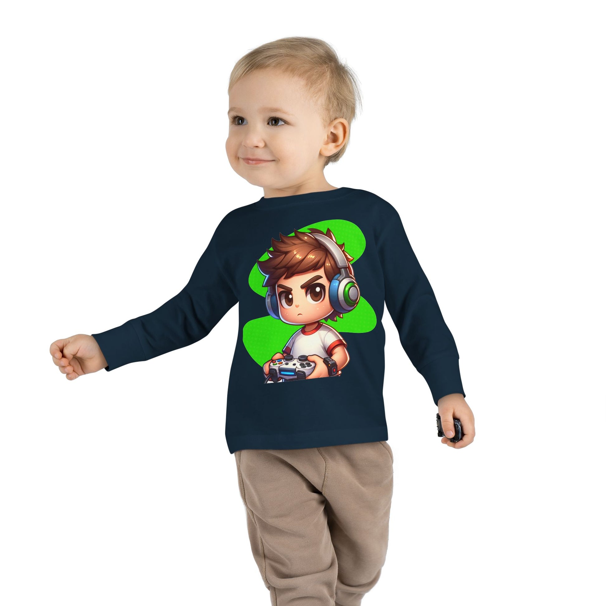 Kids Gamer Long Sleeve Tee — Cute Cartoon Boy with Headset & Controller