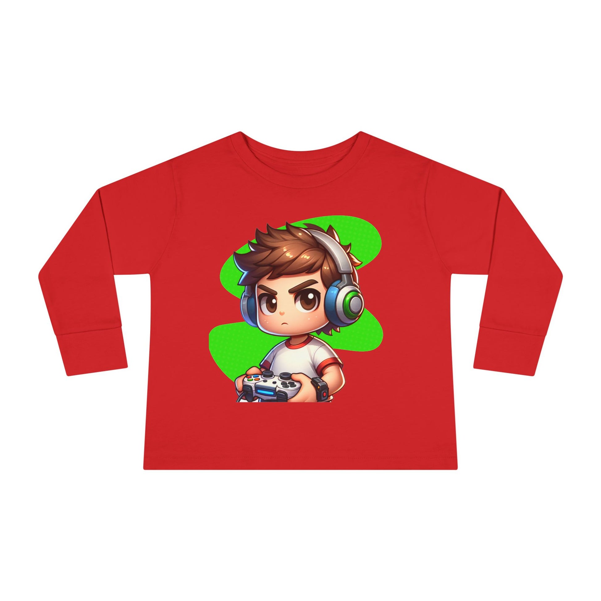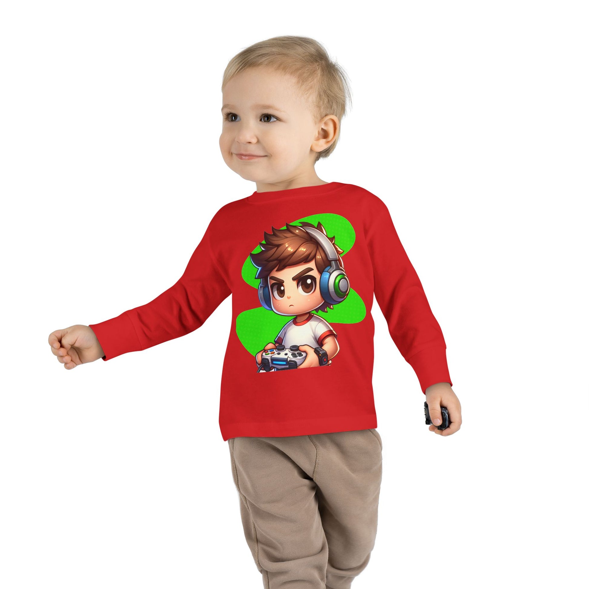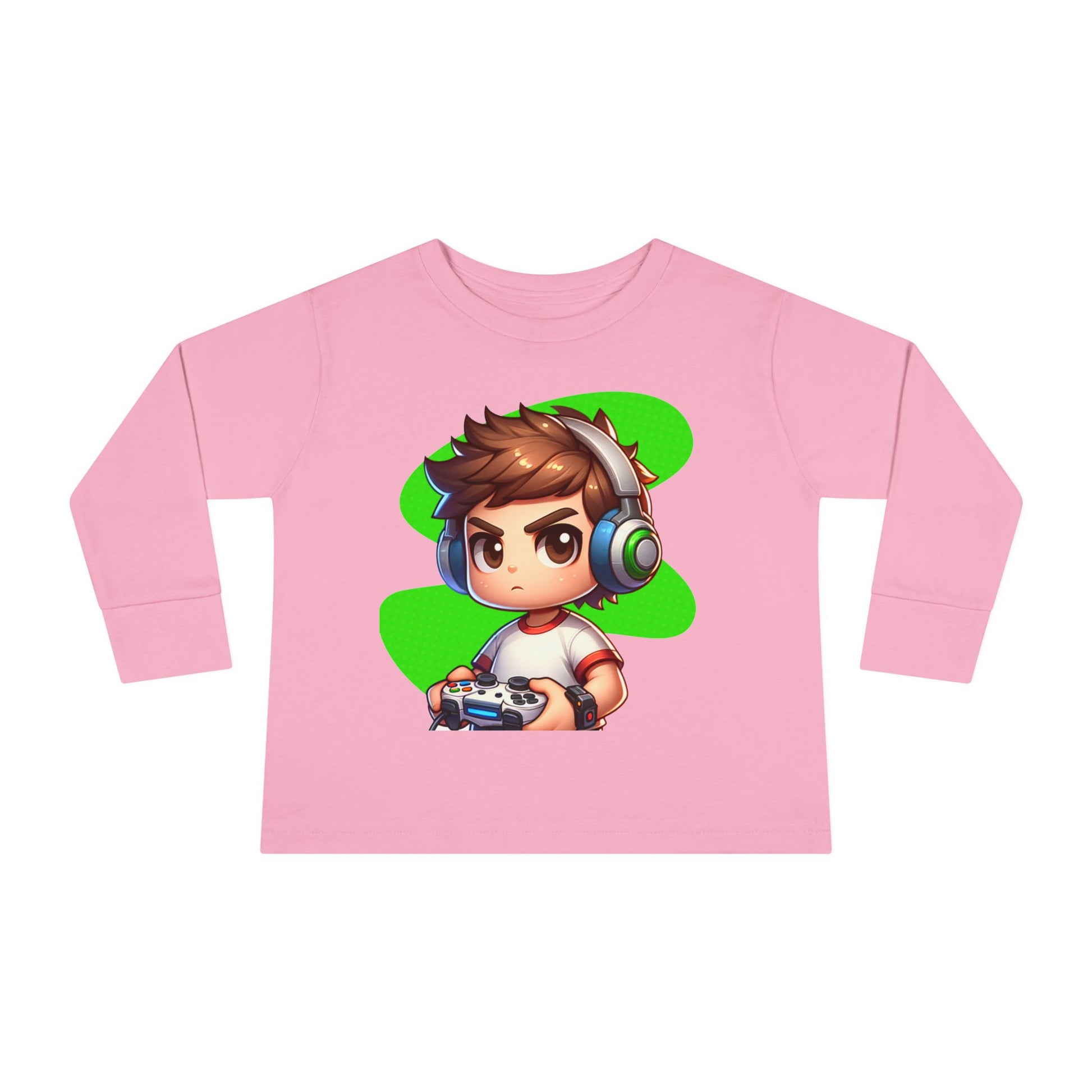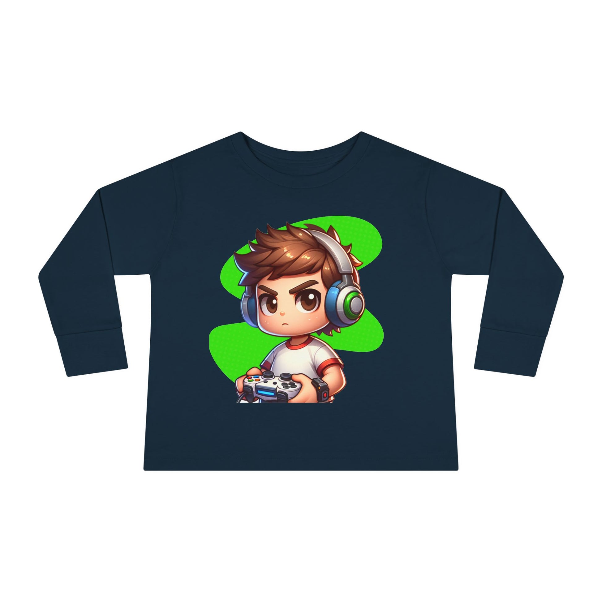 Kids Gamer Long Sleeve Tee — Cute Cartoon Boy with Headset & Controller