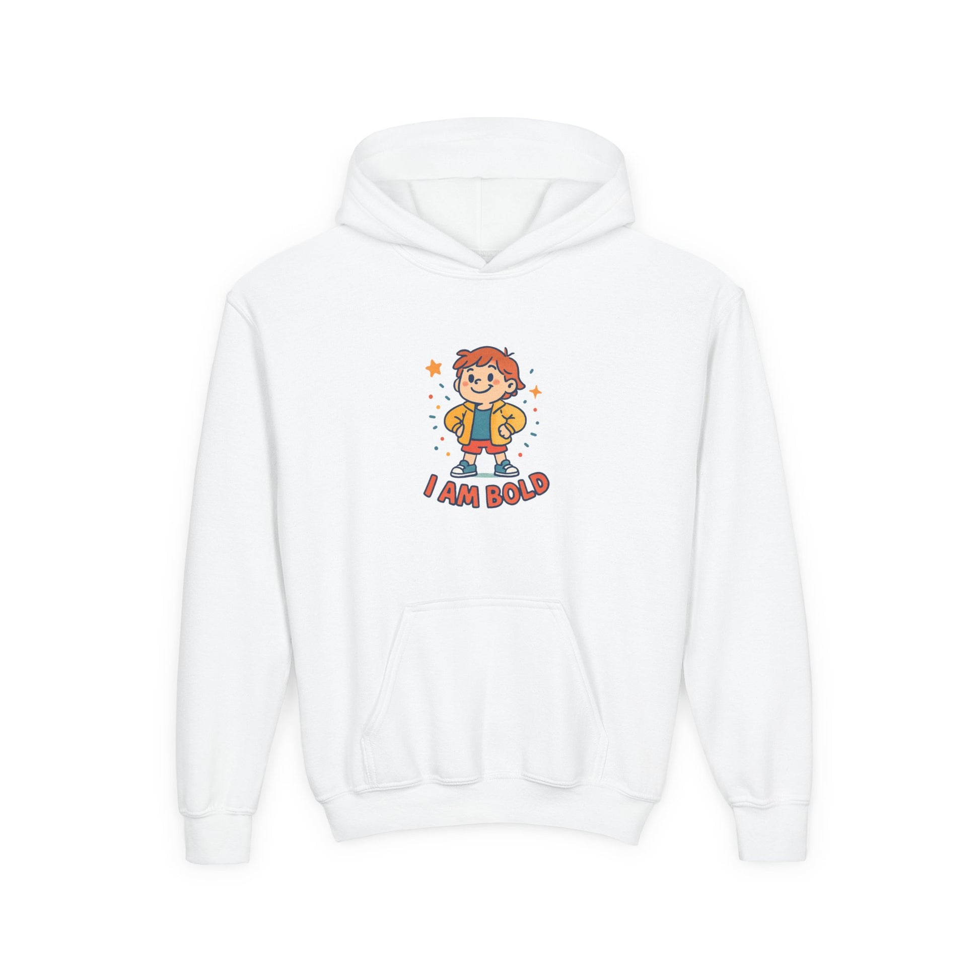 Soft, cozy, and a little bit brave — this youth hoodie carries a tiny hero ready for big days. The cheerful, vintage-style character and “I AM BOLD” lettering sit warm and bright on a medium-weight sweatshirt that keeps its shape through play and wash. The roomy kangaroo pocket holds small treasures or chilly hands. Subtle details like twill necktape and a sewn-in label add durability and comfort, while the balanced cotton/poly blend gives a smooth surface for vivid printing. Made with safety-compliant materials and available with optional embroidered chest accents or wrist prints, this hoodie feels like encouragement you can wear.