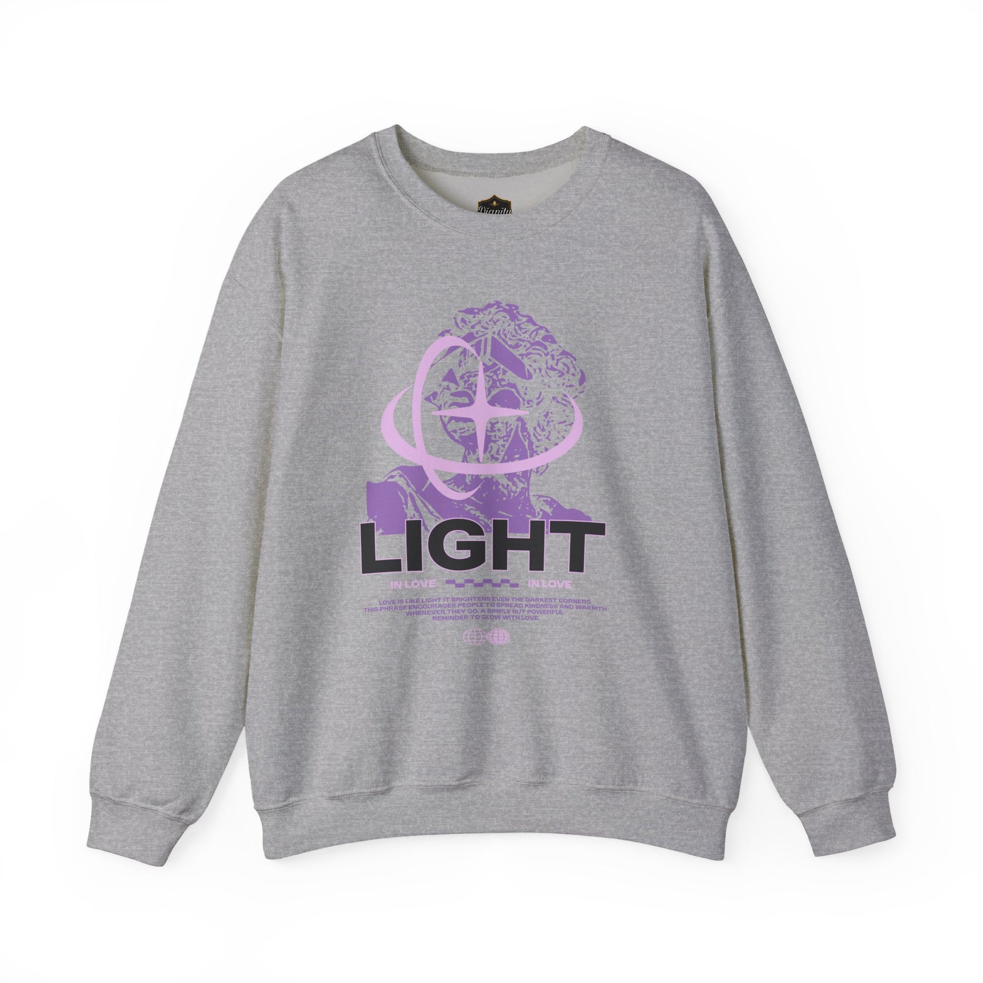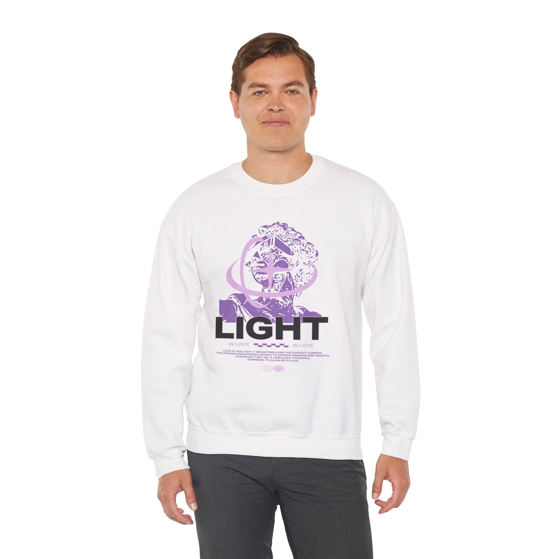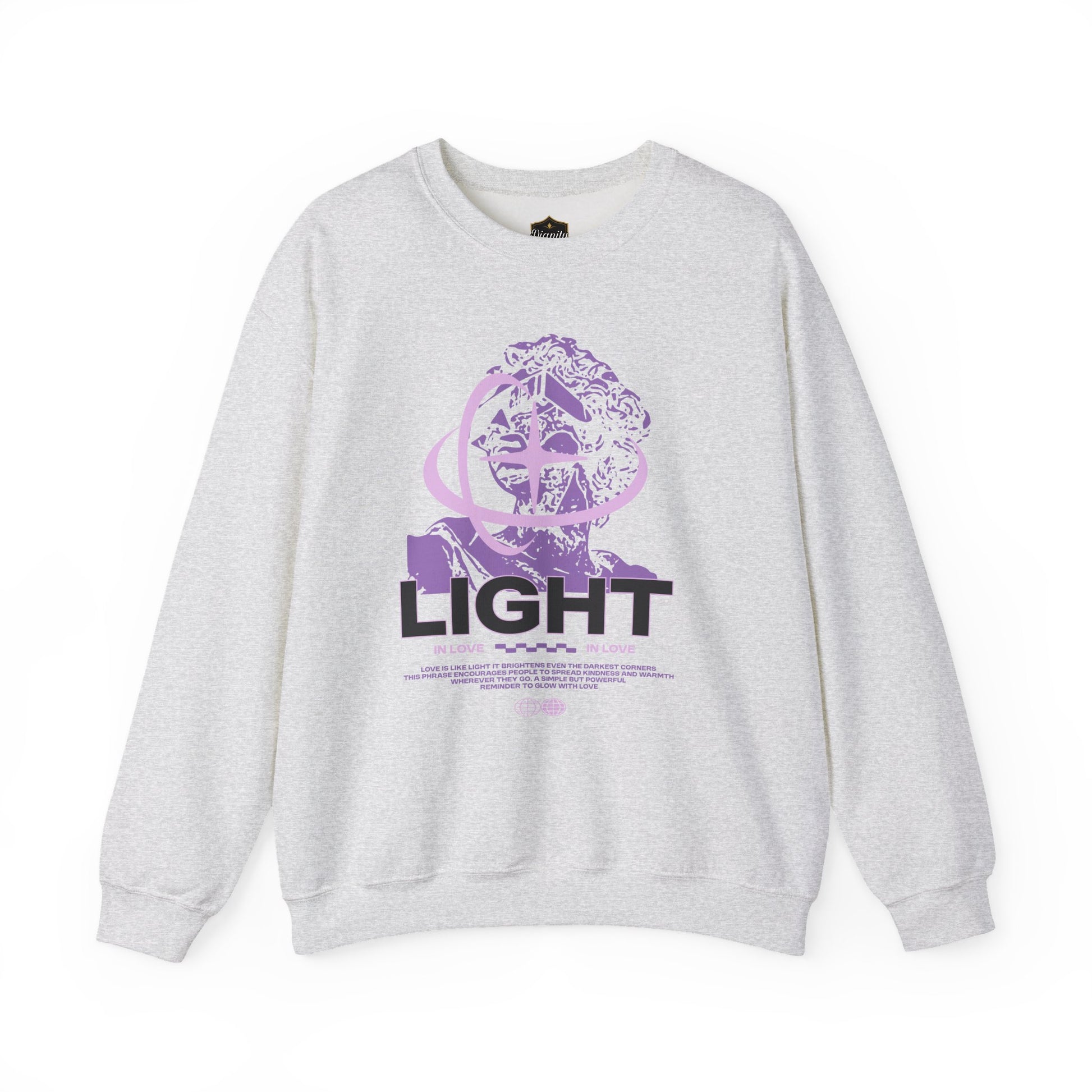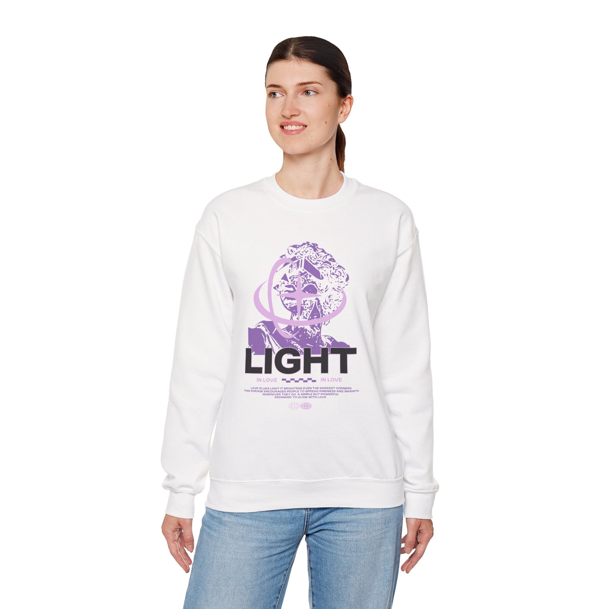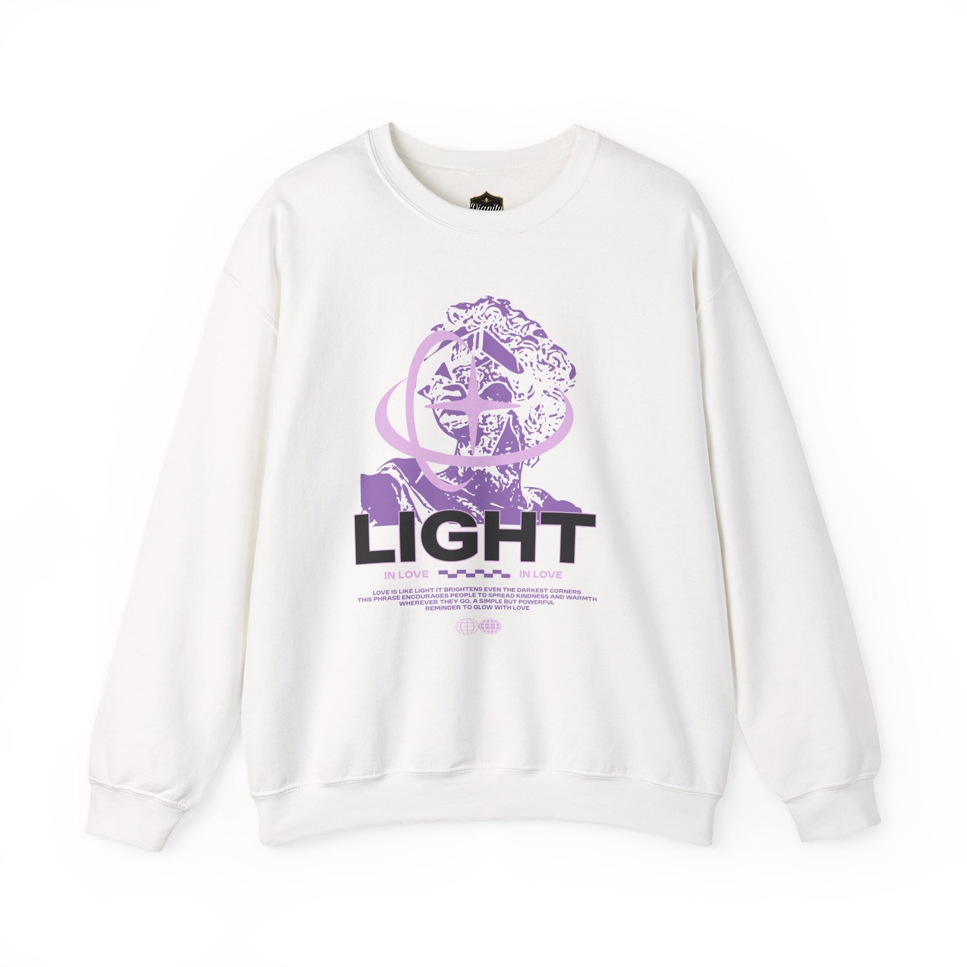 This cozy crewneck sweatshirt carries a quiet, modern vibe — a soft white canvas with a lavender-toned graphic that reads LIGHT beneath an abstract, layered illustration. It feels like an early-morning walk through a city just waking up: calm energy, a little mystery, and a gentle optimism. The medium-heavy cotton blend holds structure while remaining soft against the skin. Wear it on slow weekends, for late-night studio sessions, or layered under a coat for crisp evenings. The pared-back colorway and clean silhouette make it easy to pair with denim or joggers, while the graphic gives a subtle, artful edge that speaks to people who favor thoughtful, understated style.