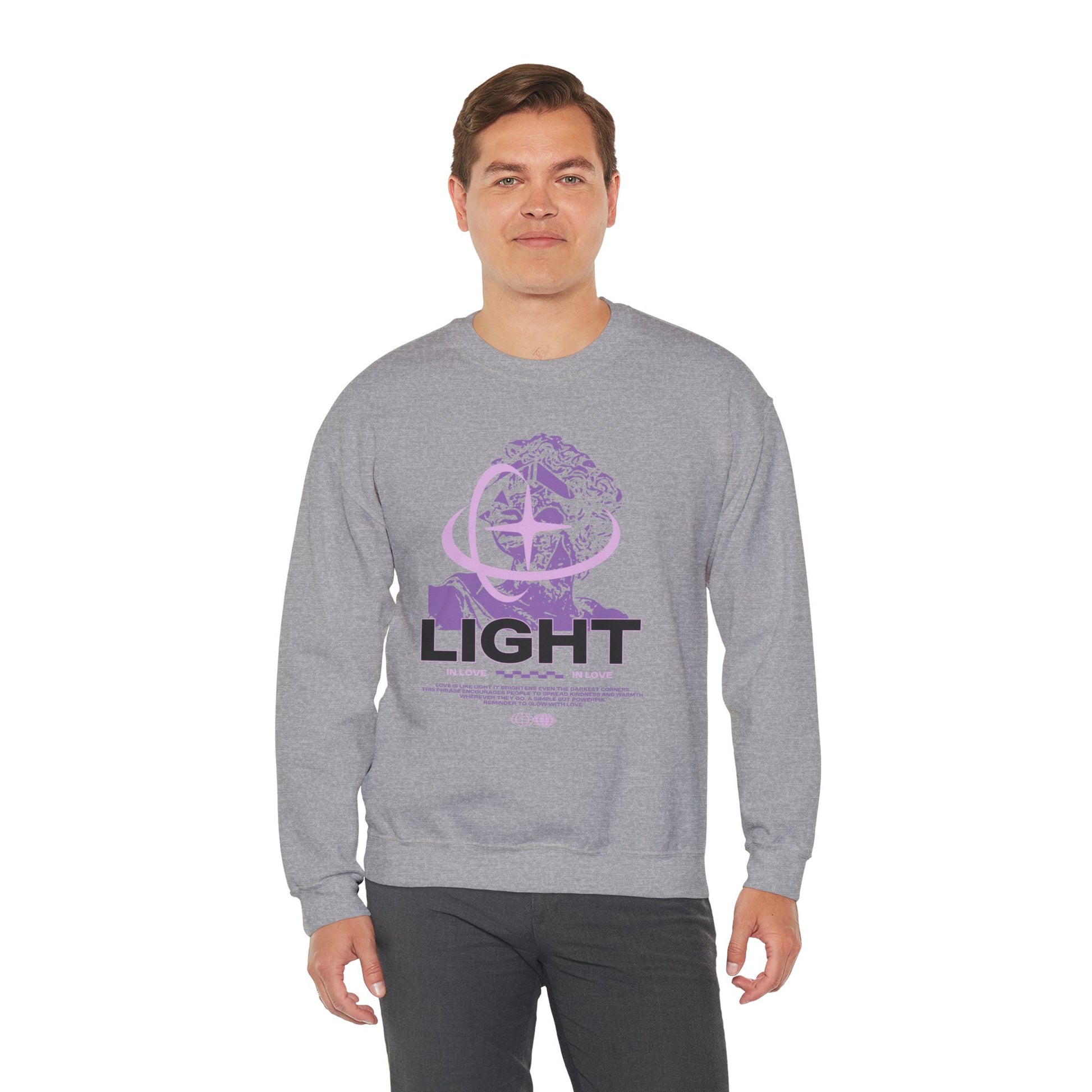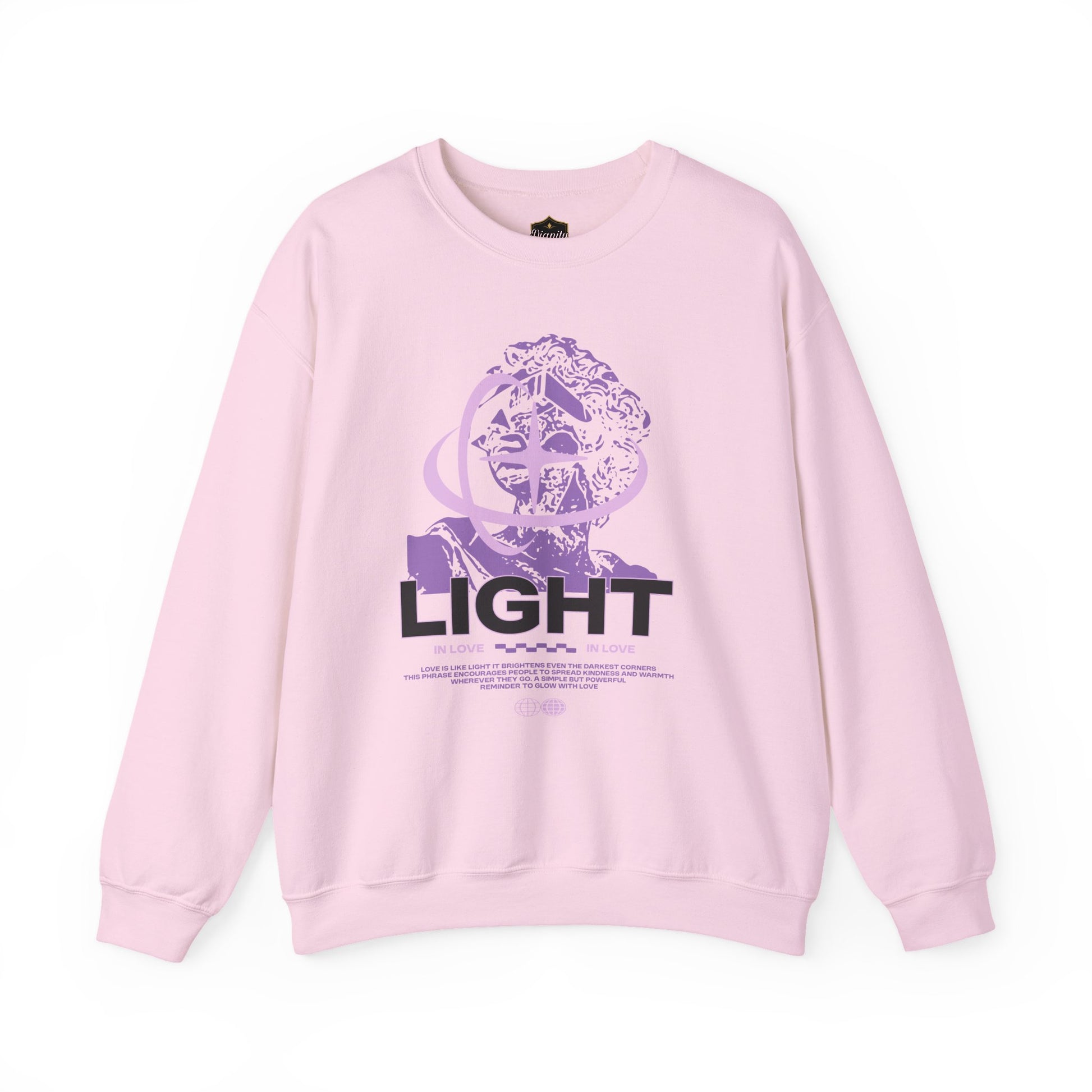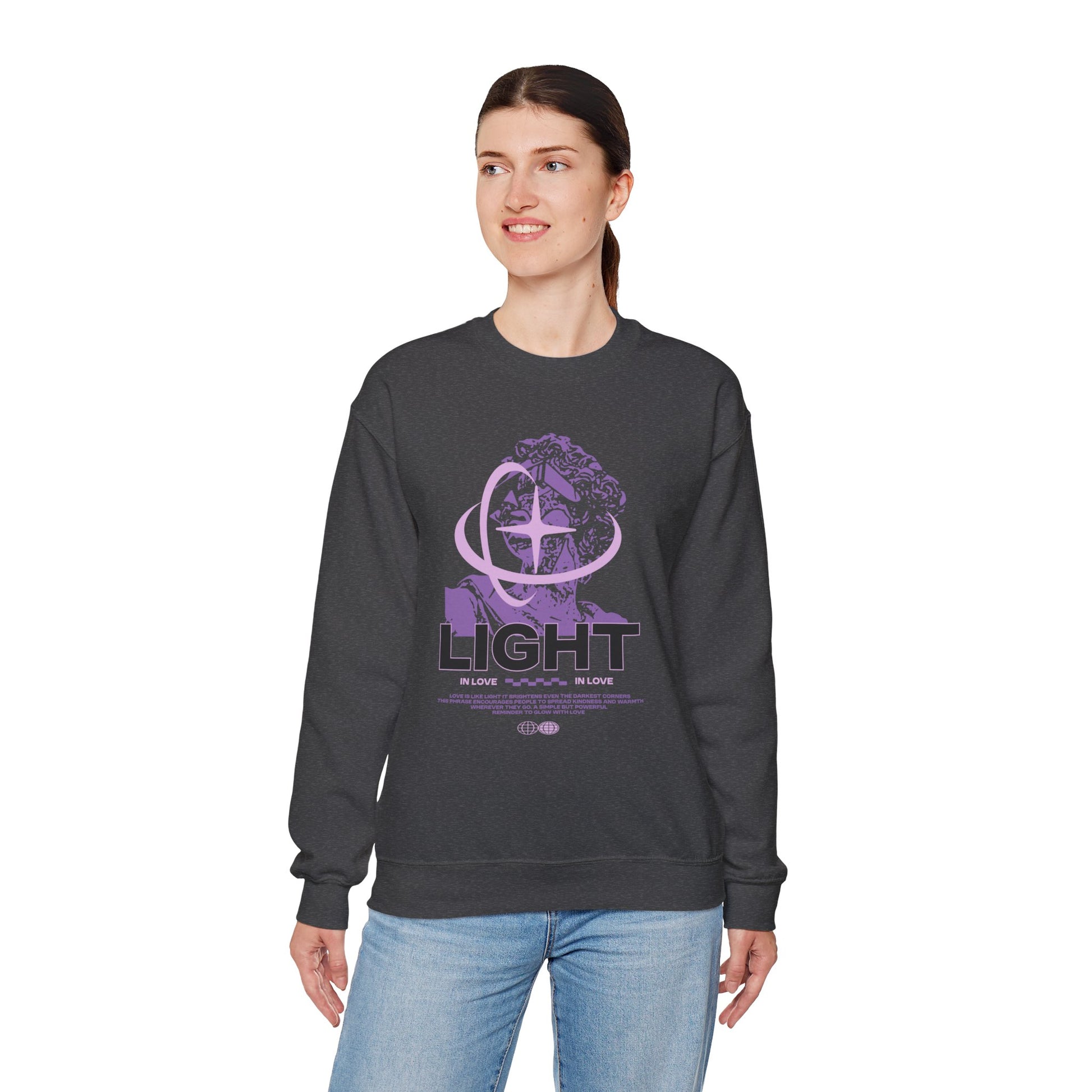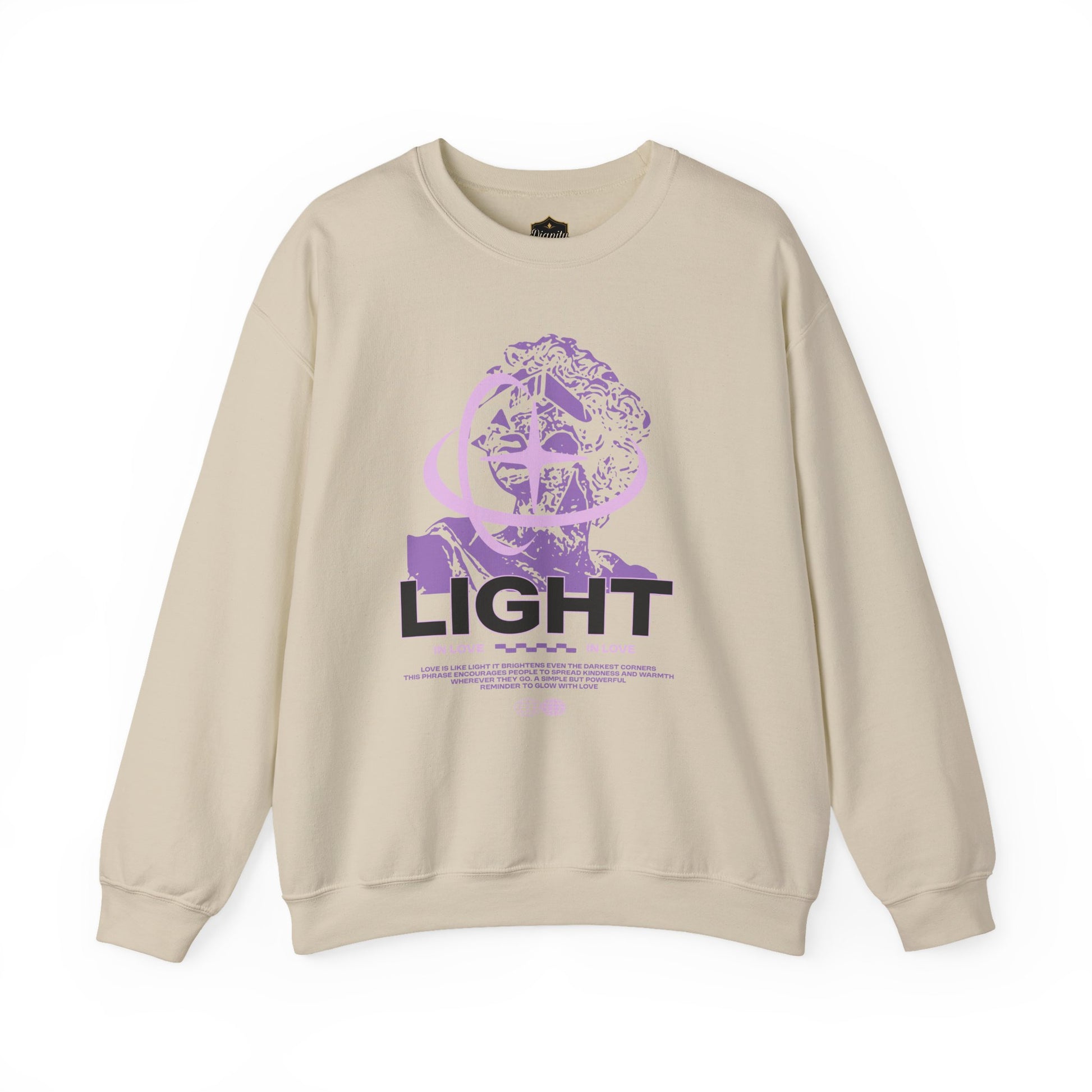 This cozy crewneck sweatshirt carries a quiet, modern vibe — a soft white canvas with a lavender-toned graphic that reads LIGHT beneath an abstract, layered illustration. It feels like an early-morning walk through a city just waking up: calm energy, a little mystery, and a gentle optimism. The medium-heavy cotton blend holds structure while remaining soft against the skin. Wear it on slow weekends, for late-night studio sessions, or layered under a coat for crisp evenings. The pared-back colorway and clean silhouette make it easy to pair with denim or joggers, while the graphic gives a subtle, artful edge that speaks to people who favor thoughtful, understated style.