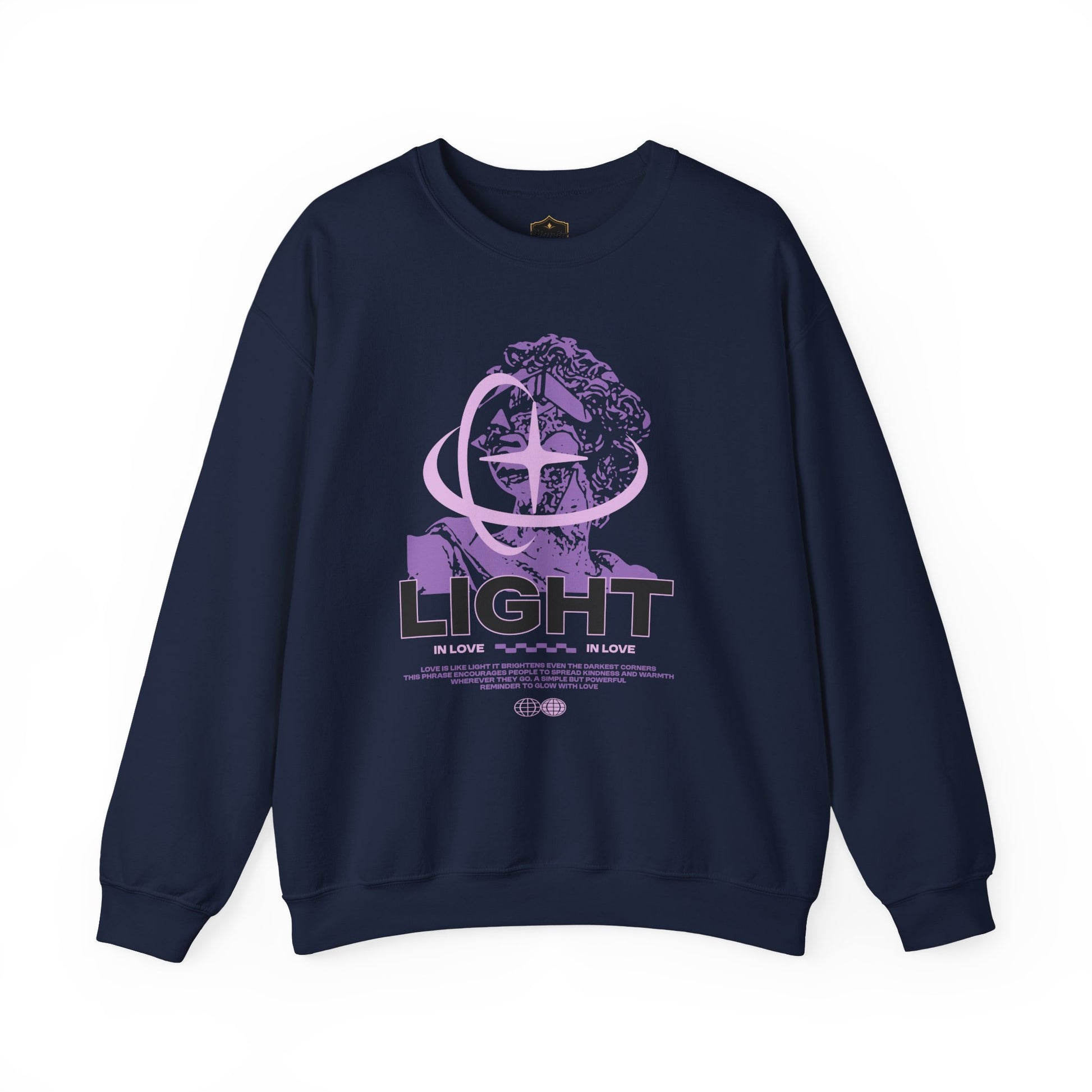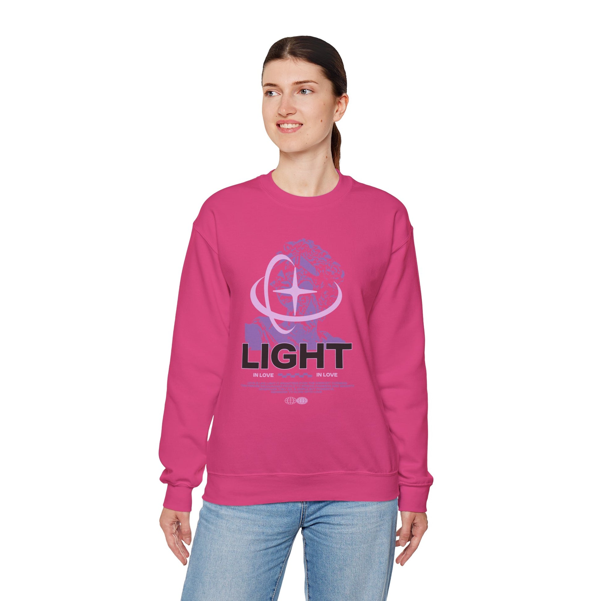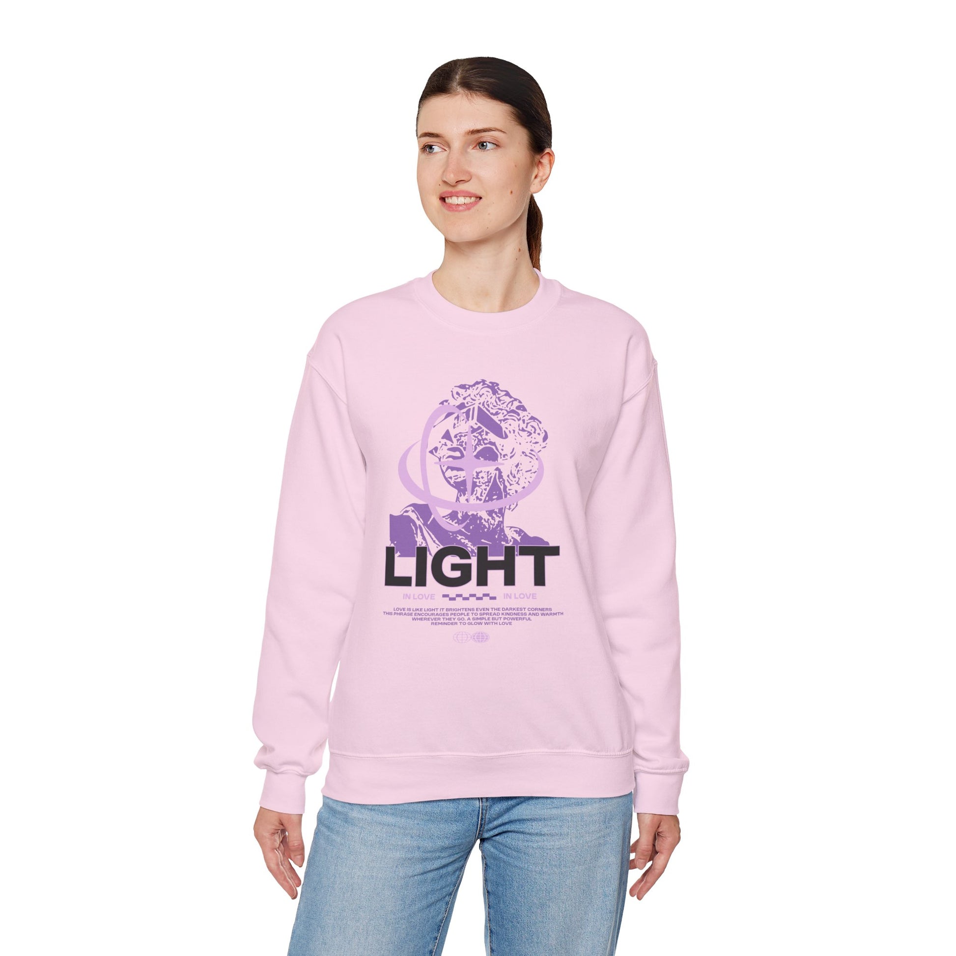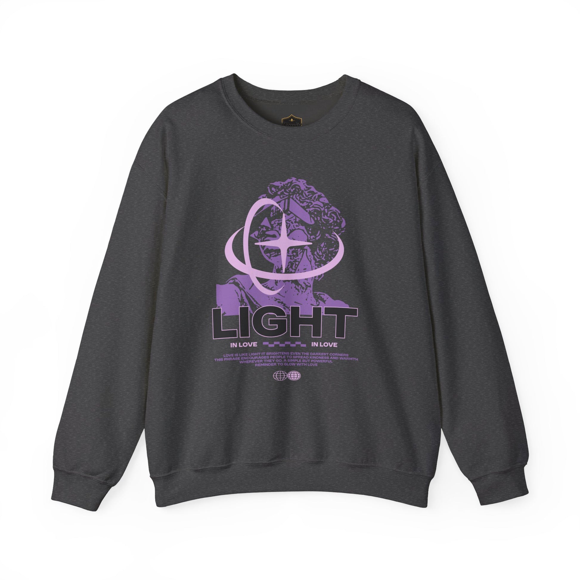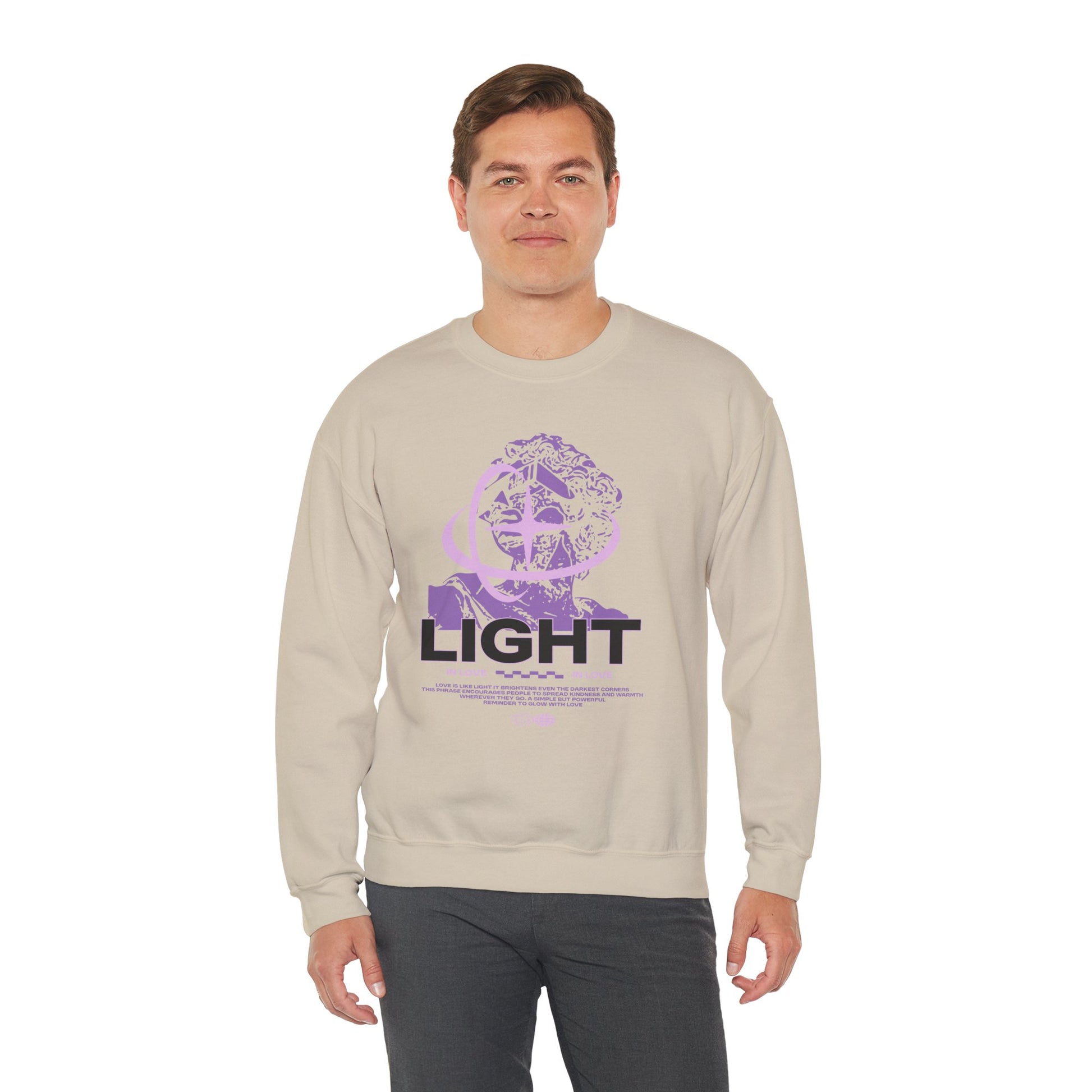 This cozy crewneck sweatshirt carries a quiet, modern vibe — a soft white canvas with a lavender-toned graphic that reads LIGHT beneath an abstract, layered illustration. It feels like an early-morning walk through a city just waking up: calm energy, a little mystery, and a gentle optimism. The medium-heavy cotton blend holds structure while remaining soft against the skin. Wear it on slow weekends, for late-night studio sessions, or layered under a coat for crisp evenings. The pared-back colorway and clean silhouette make it easy to pair with denim or joggers, while the graphic gives a subtle, artful edge that speaks to people who favor thoughtful, understated style.
