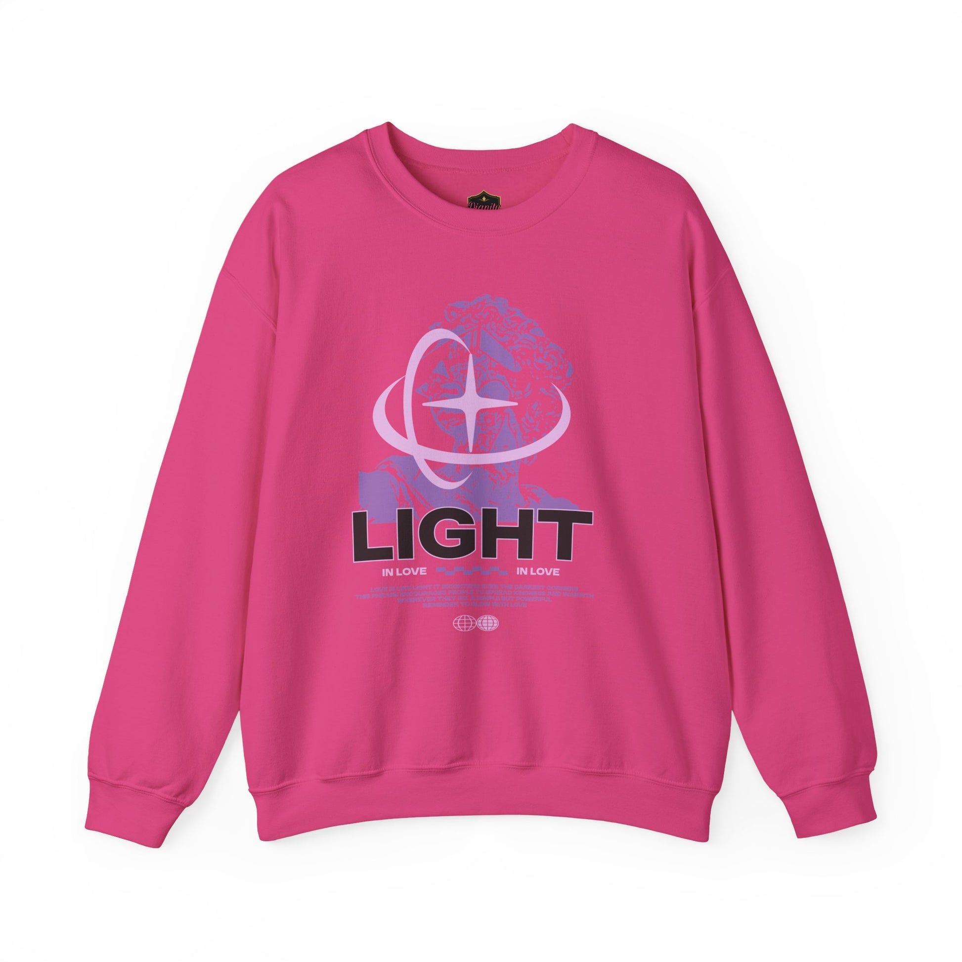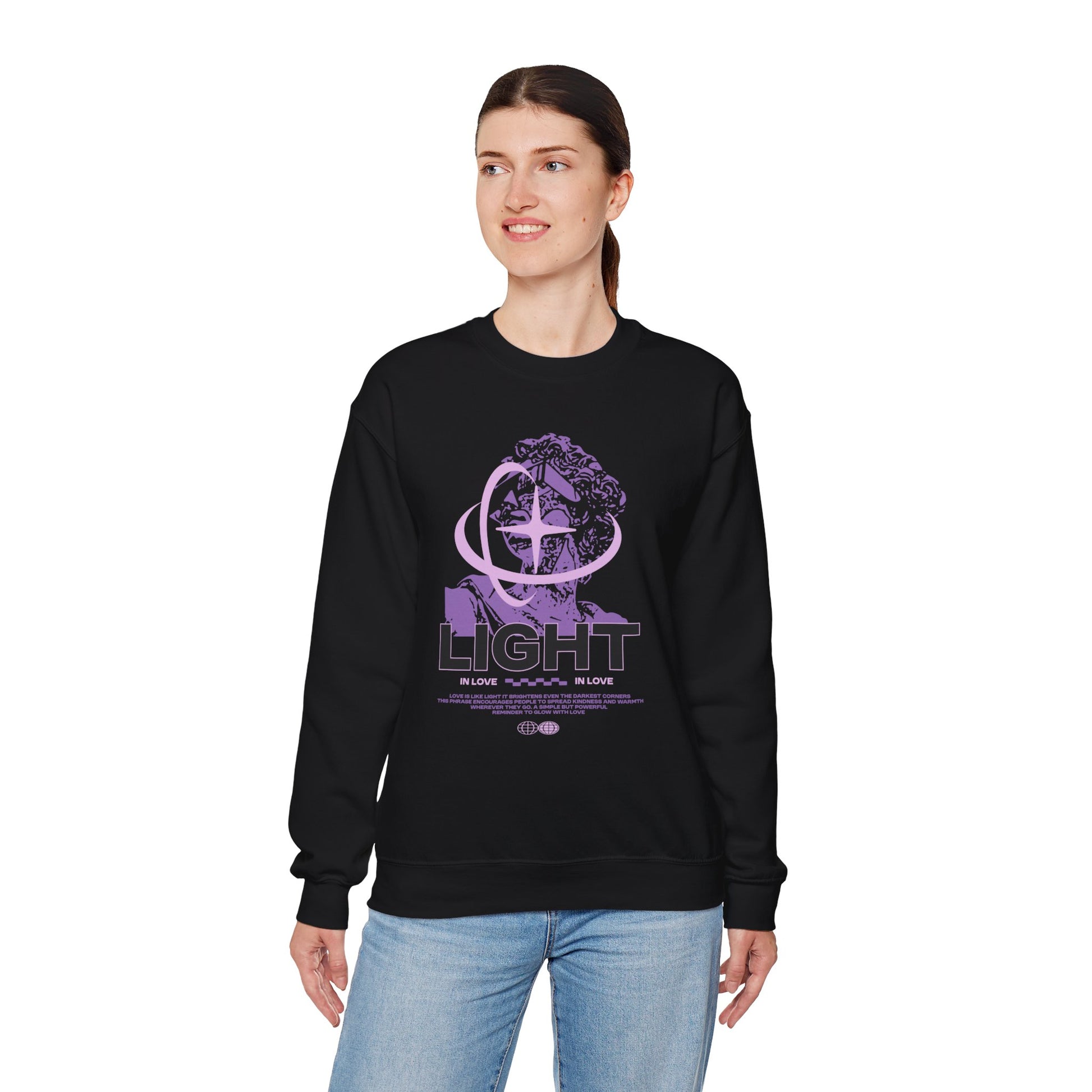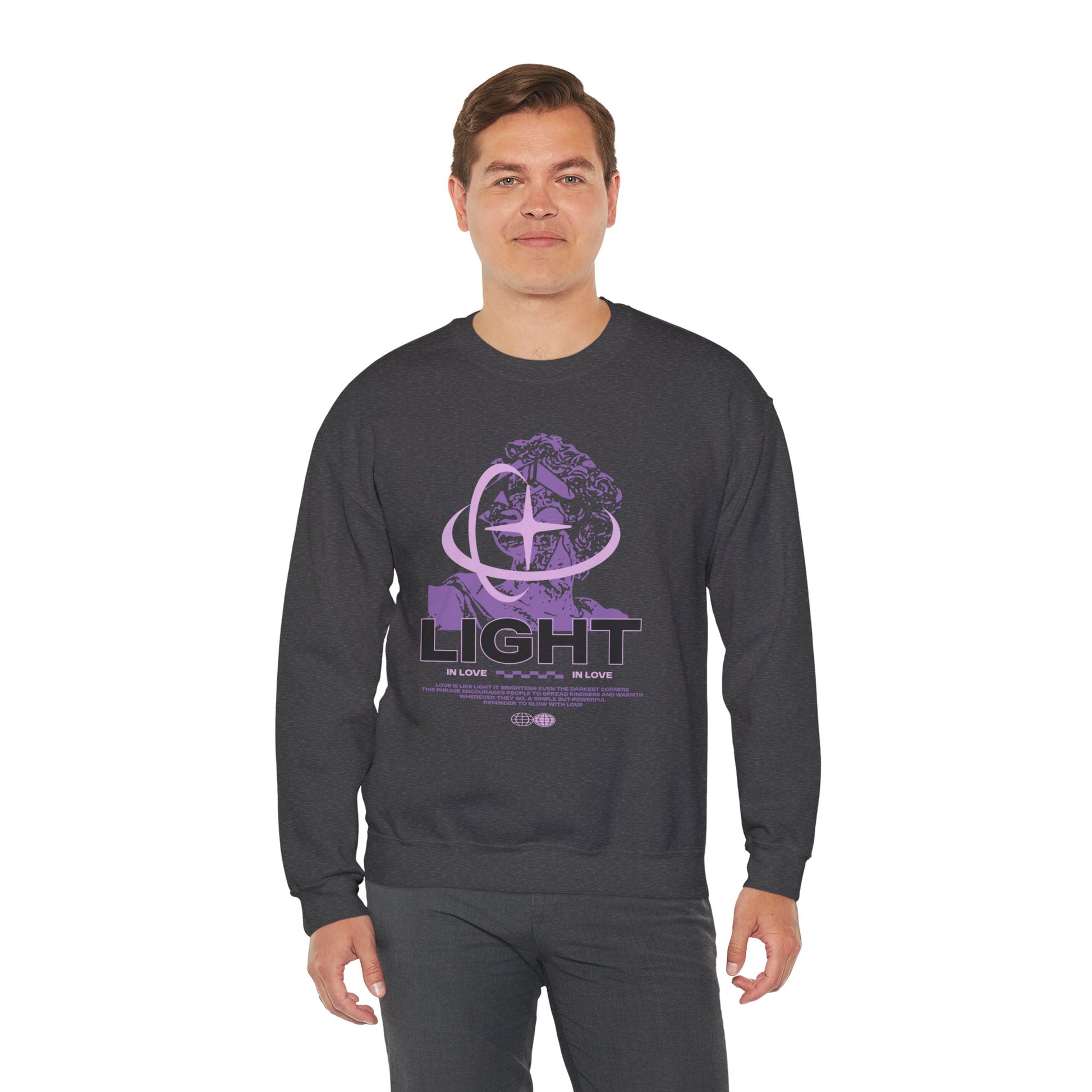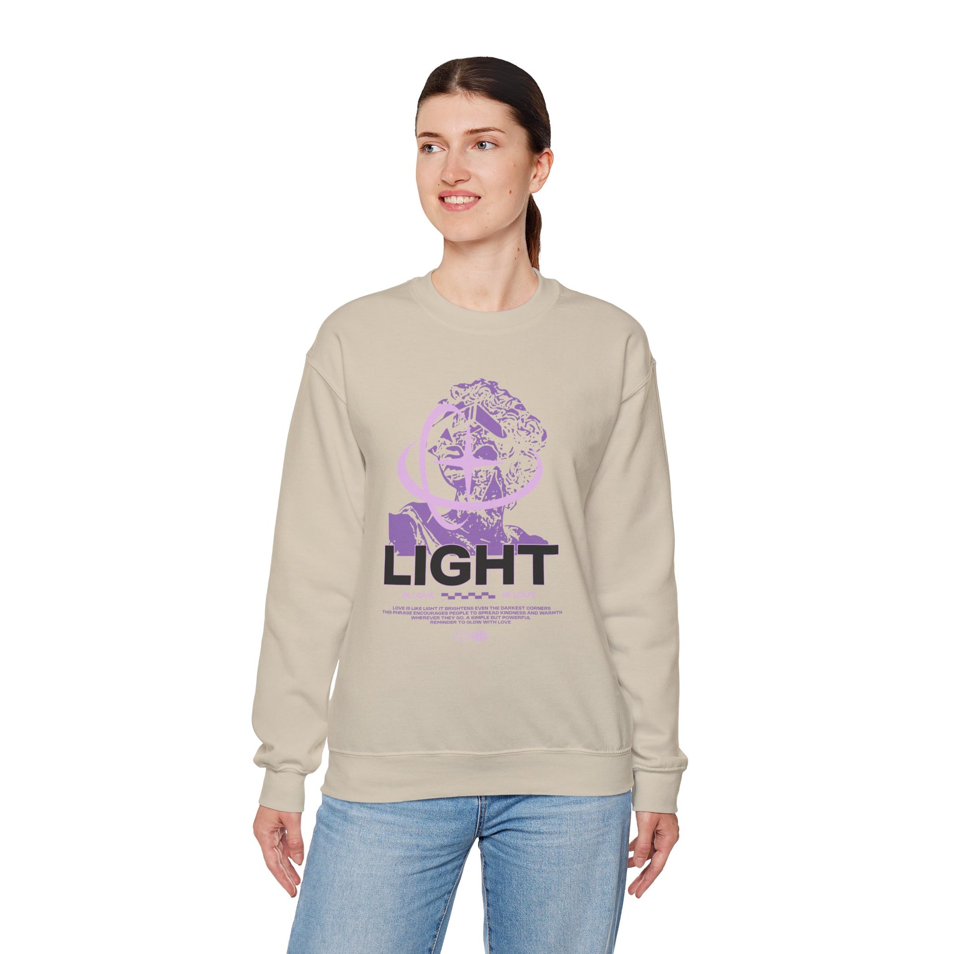 This cozy crewneck sweatshirt carries a quiet, modern vibe — a soft white canvas with a lavender-toned graphic that reads LIGHT beneath an abstract, layered illustration. It feels like an early-morning walk through a city just waking up: calm energy, a little mystery, and a gentle optimism. The medium-heavy cotton blend holds structure while remaining soft against the skin. Wear it on slow weekends, for late-night studio sessions, or layered under a coat for crisp evenings. The pared-back colorway and clean silhouette make it easy to pair with denim or joggers, while the graphic gives a subtle, artful edge that speaks to people who favor thoughtful, understated style.