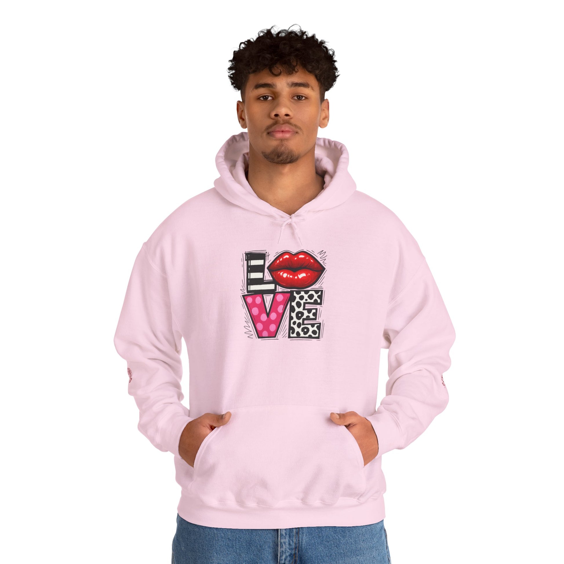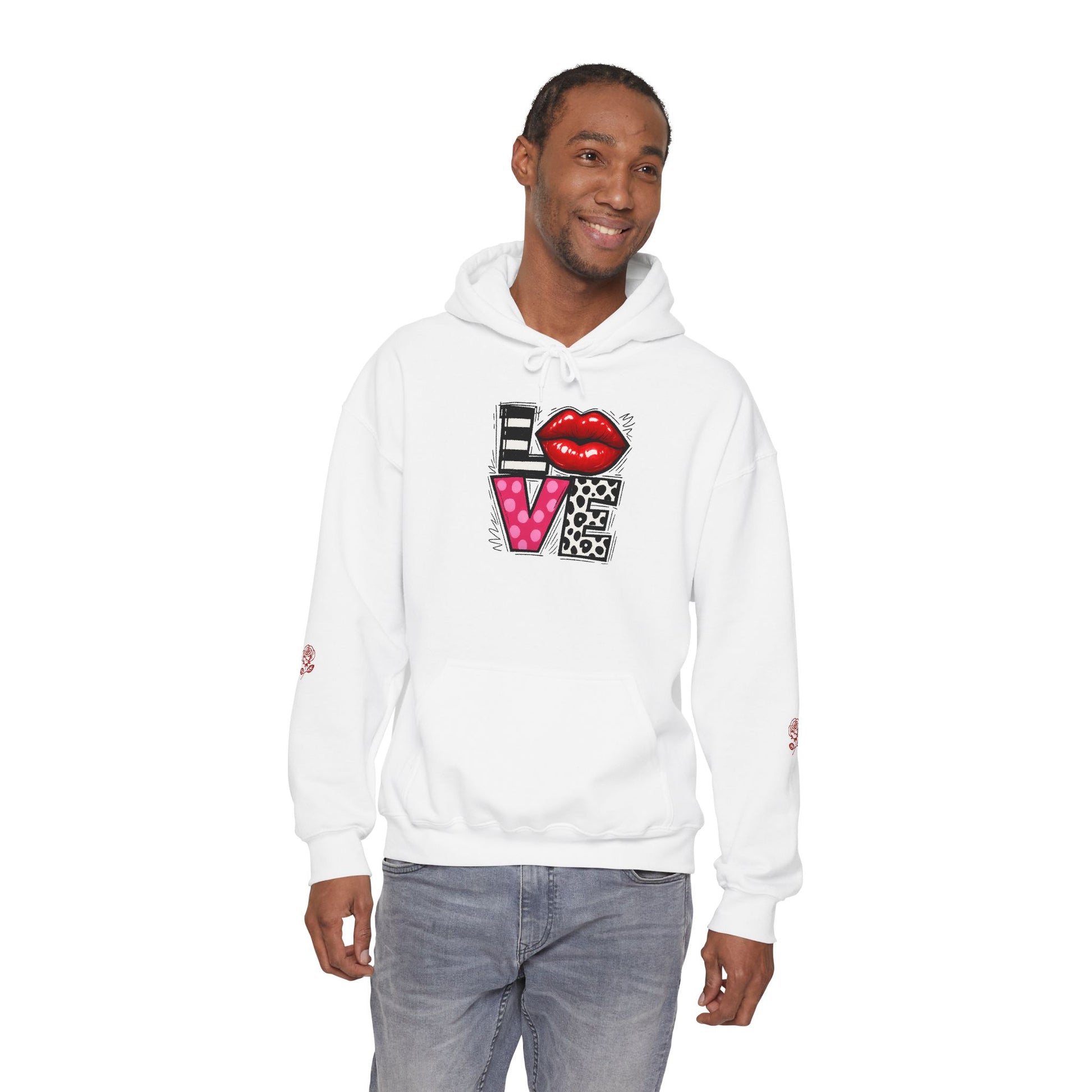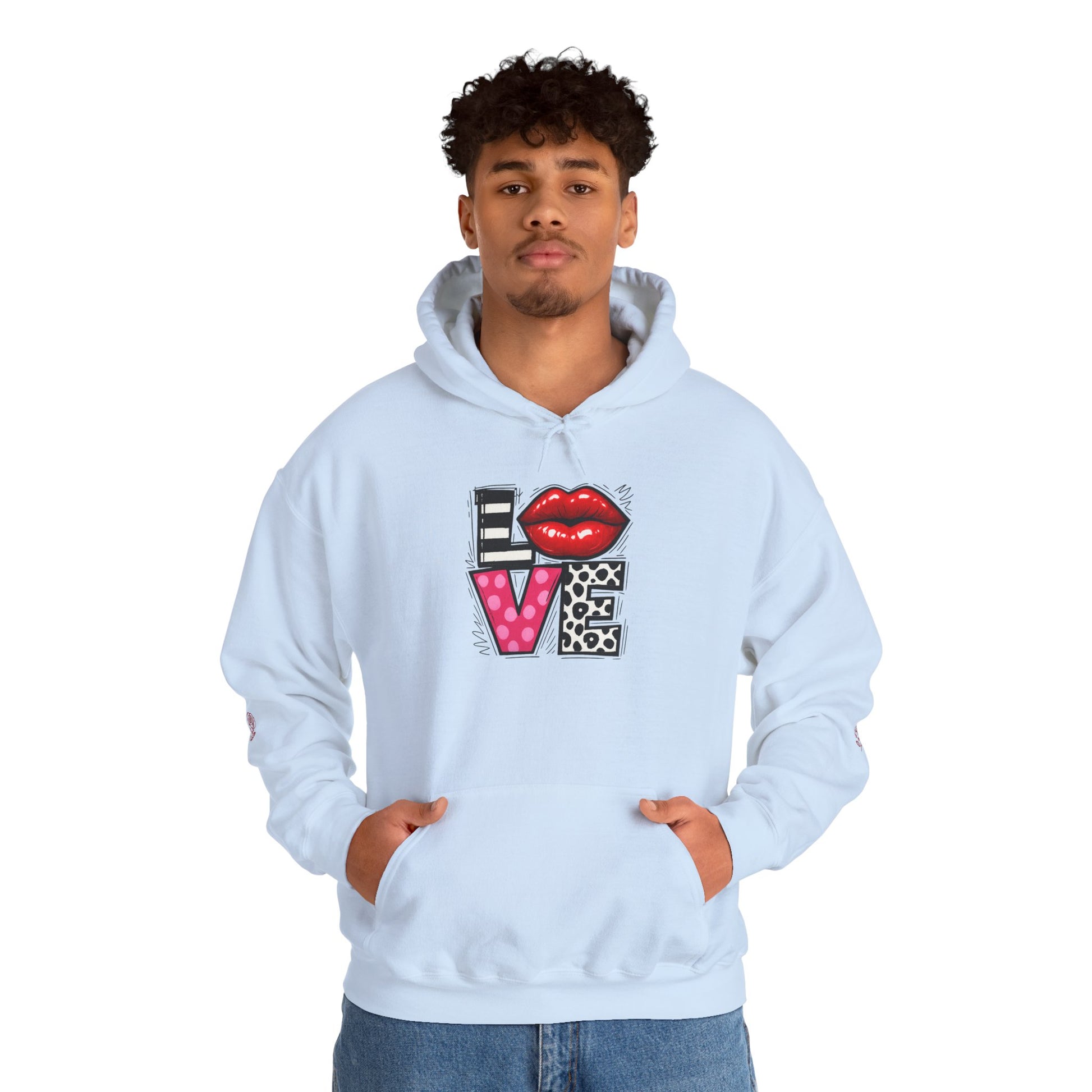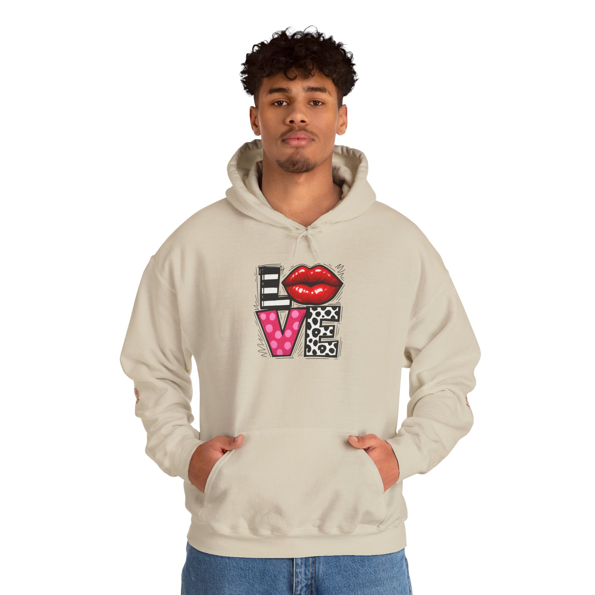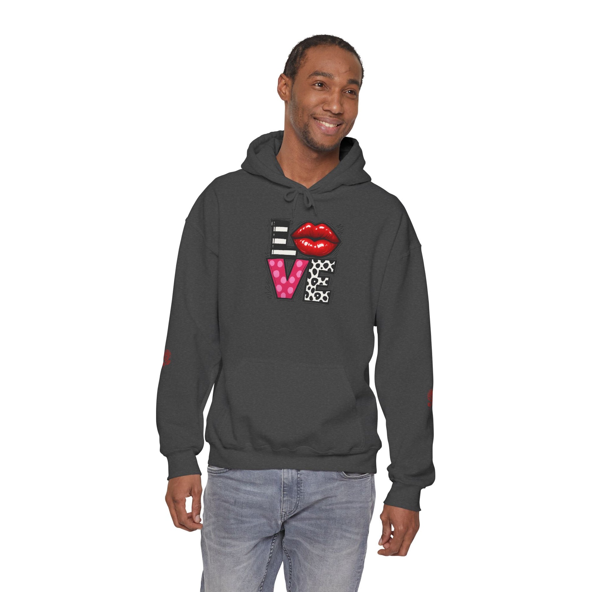 This cozy hoodie carries a playful, artsy take on love—bold lip art and patterned letter blocks on the front, and a painterly heart brushed across the back. It feels like slipping into a warm studio moment: soft, slightly oversized, and made to be lived in. Wear it when you want a touch of personality with everyday comfort—layer over a tee for errands, drape it on after a long day, or pull it on for a casual date night. The kangaroo pocket and double-lined hood add practical warmth, while the subtle wrist and sleeve details extend the artwork in a low-key, stylish way.