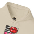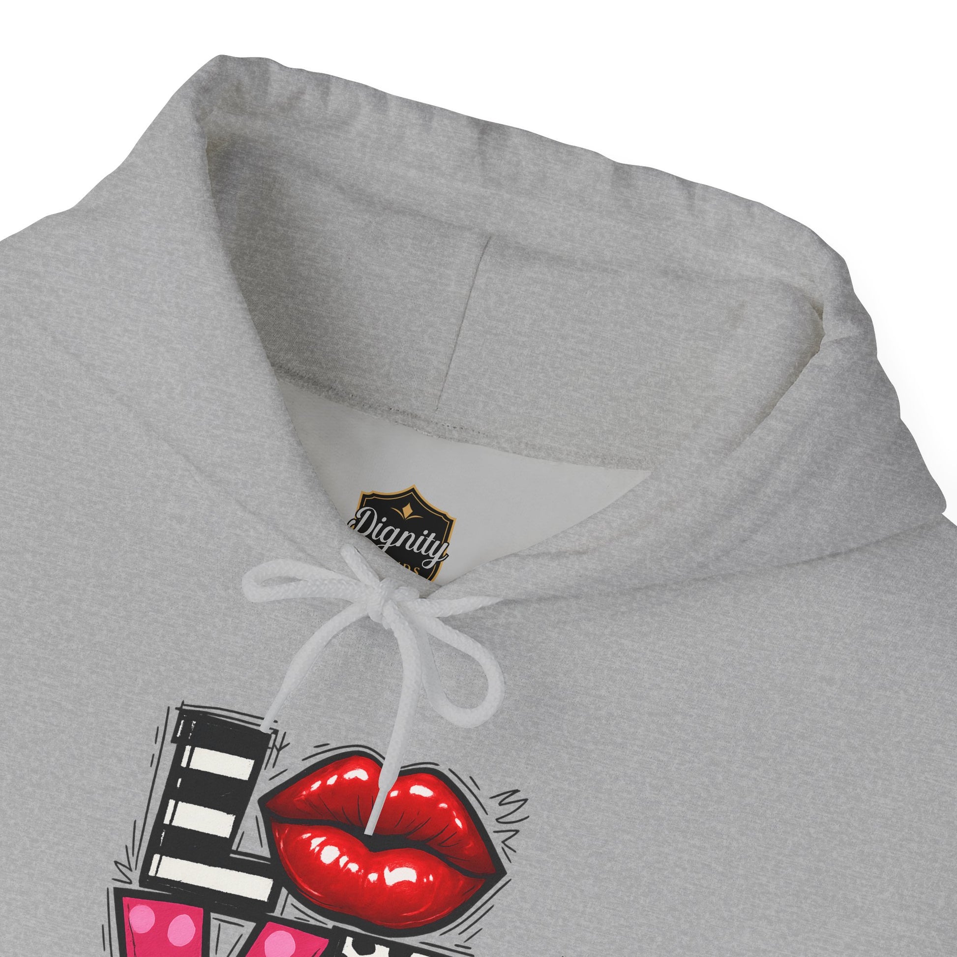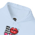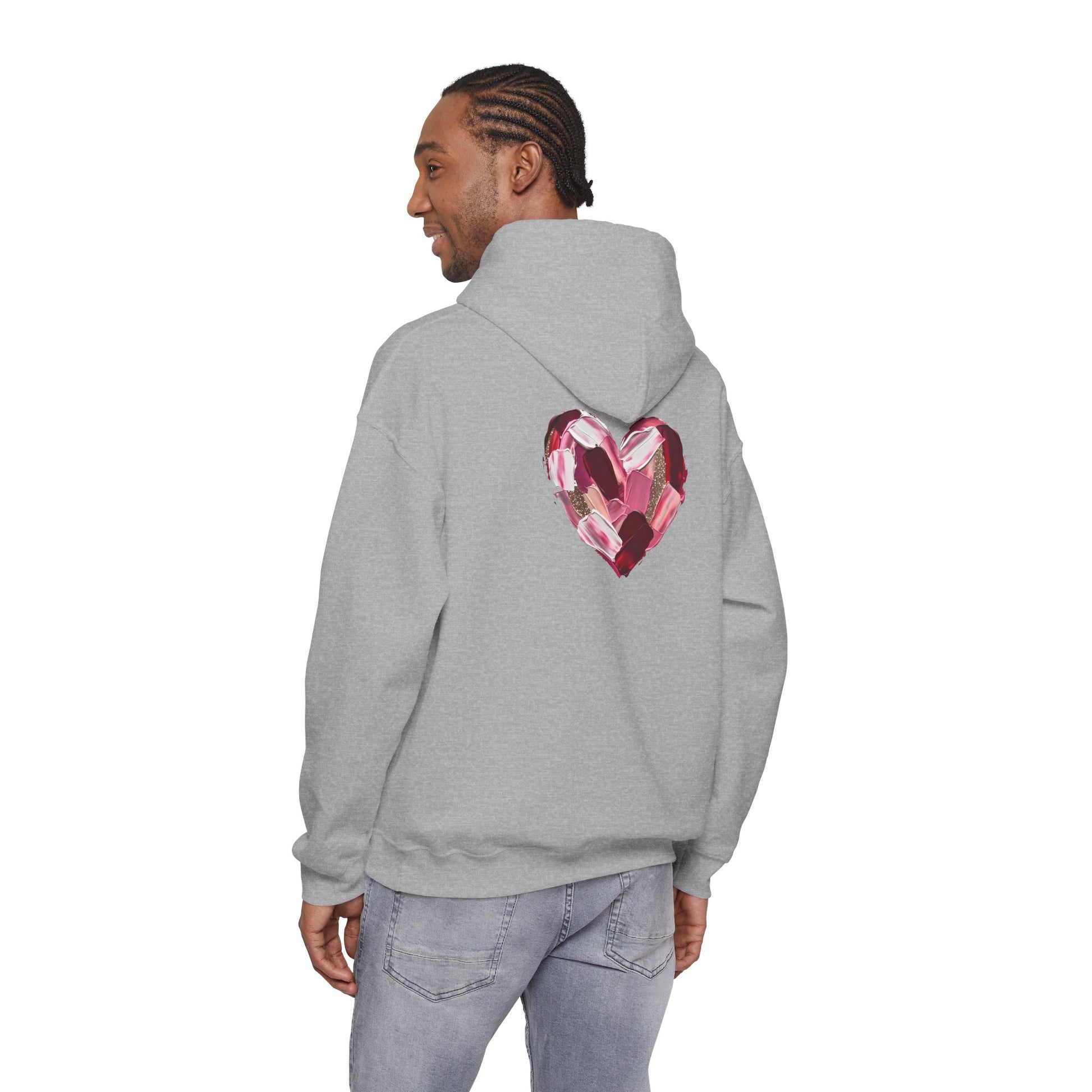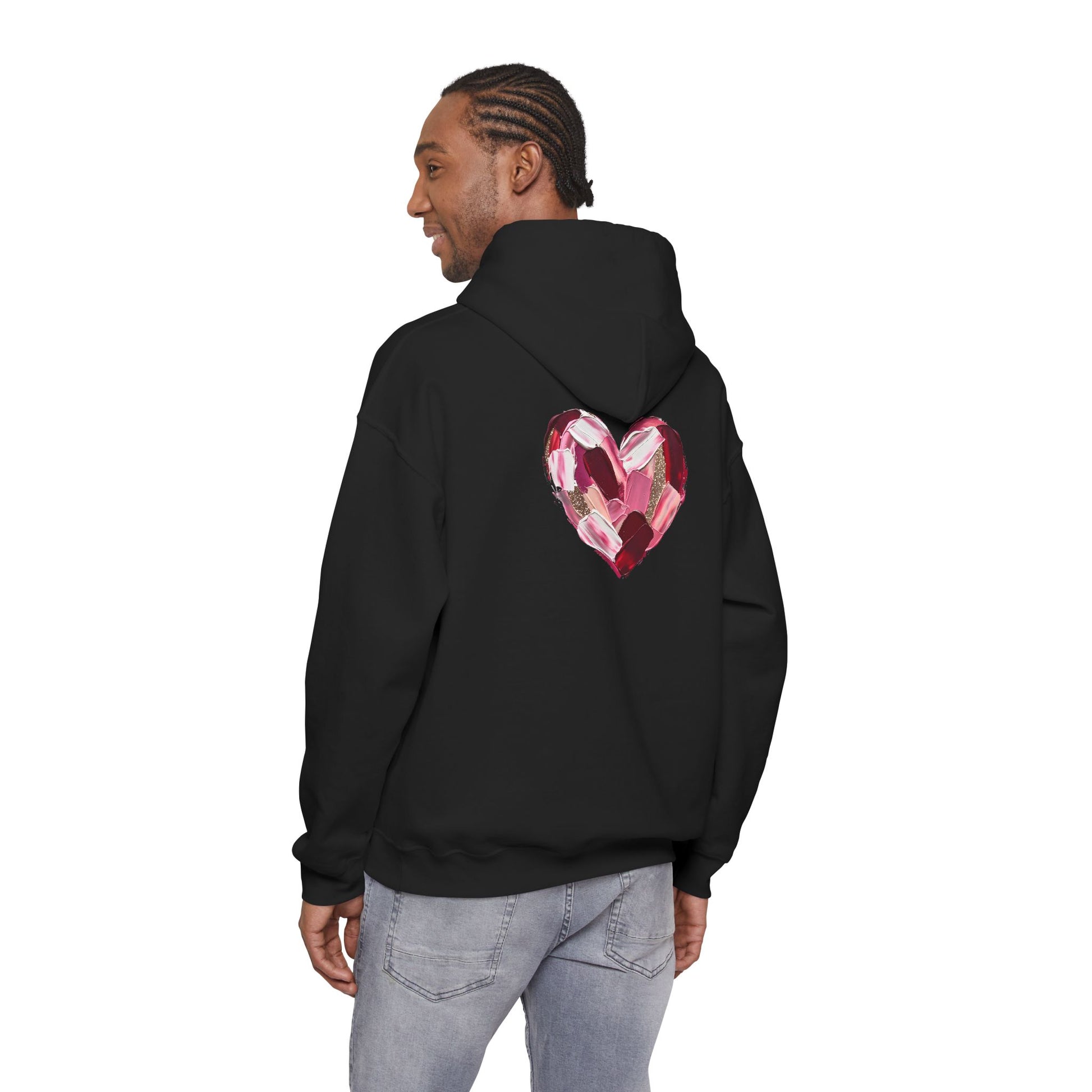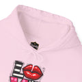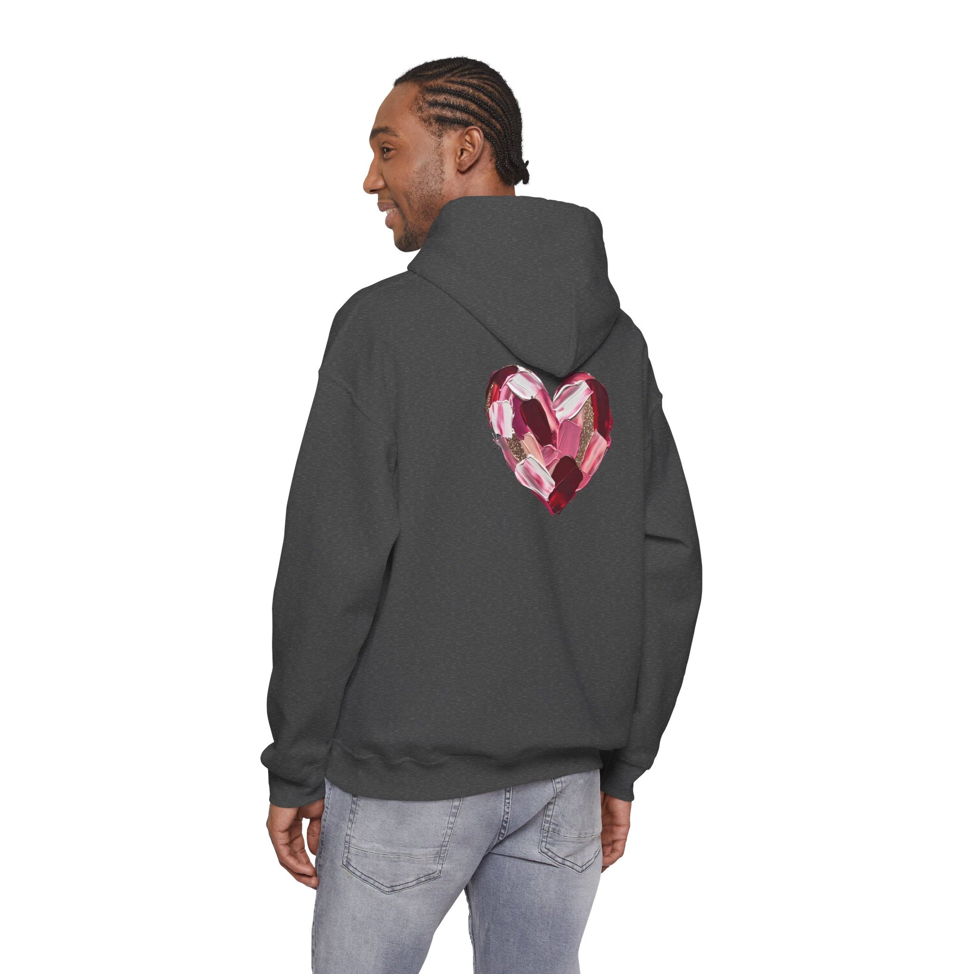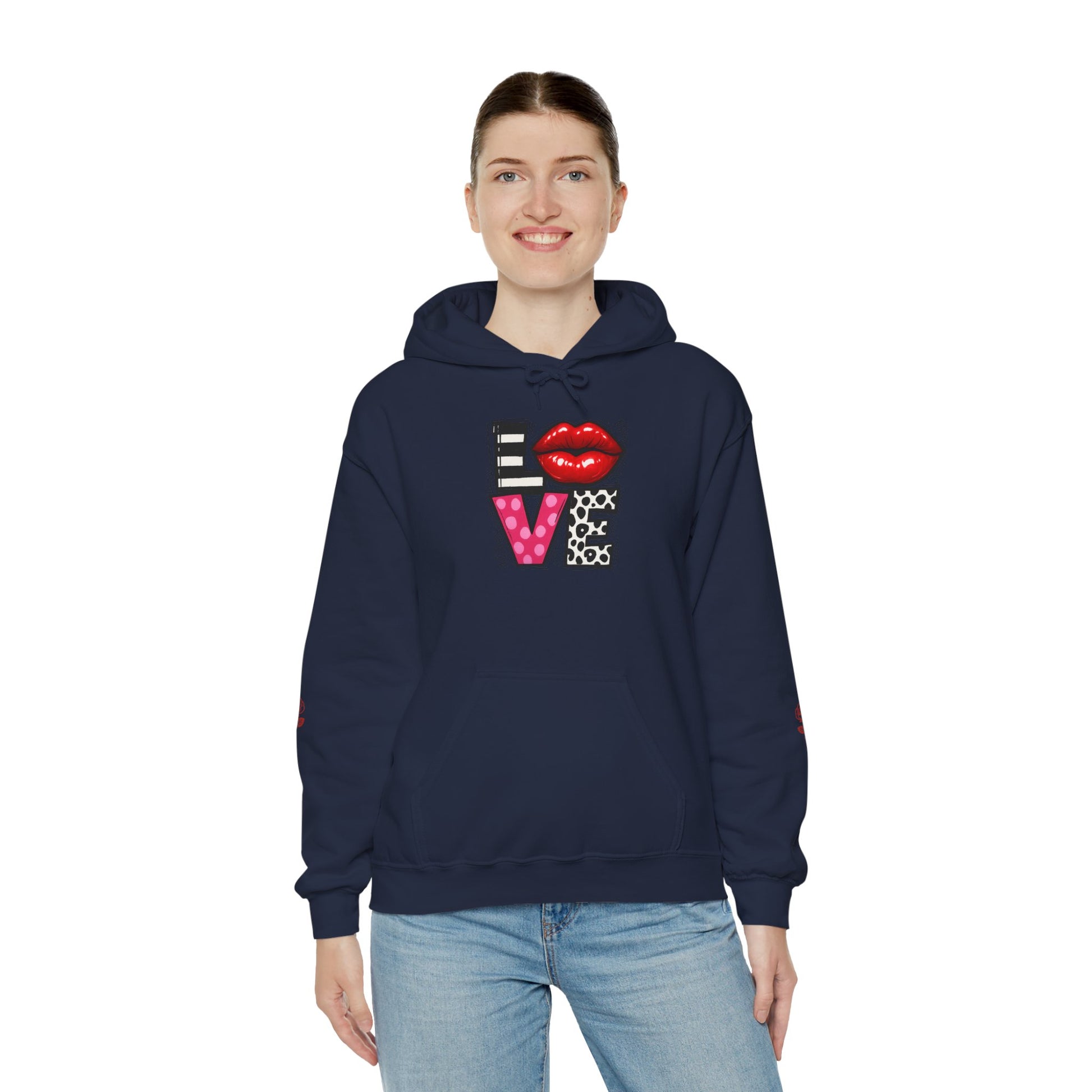This cozy hoodie carries a playful, artsy take on love—bold lip art and patterned letter blocks on the front, and a painterly heart brushed across the back. It feels like slipping into a warm studio moment: soft, slightly oversized, and made to be lived in. Wear it when you want a touch of personality with everyday comfort—layer over a tee for errands, drape it on after a long day, or pull it on for a casual date night. The kangaroo pocket and double-lined hood add practical warmth, while the subtle wrist and sleeve details extend the artwork in a low-key, stylish way.