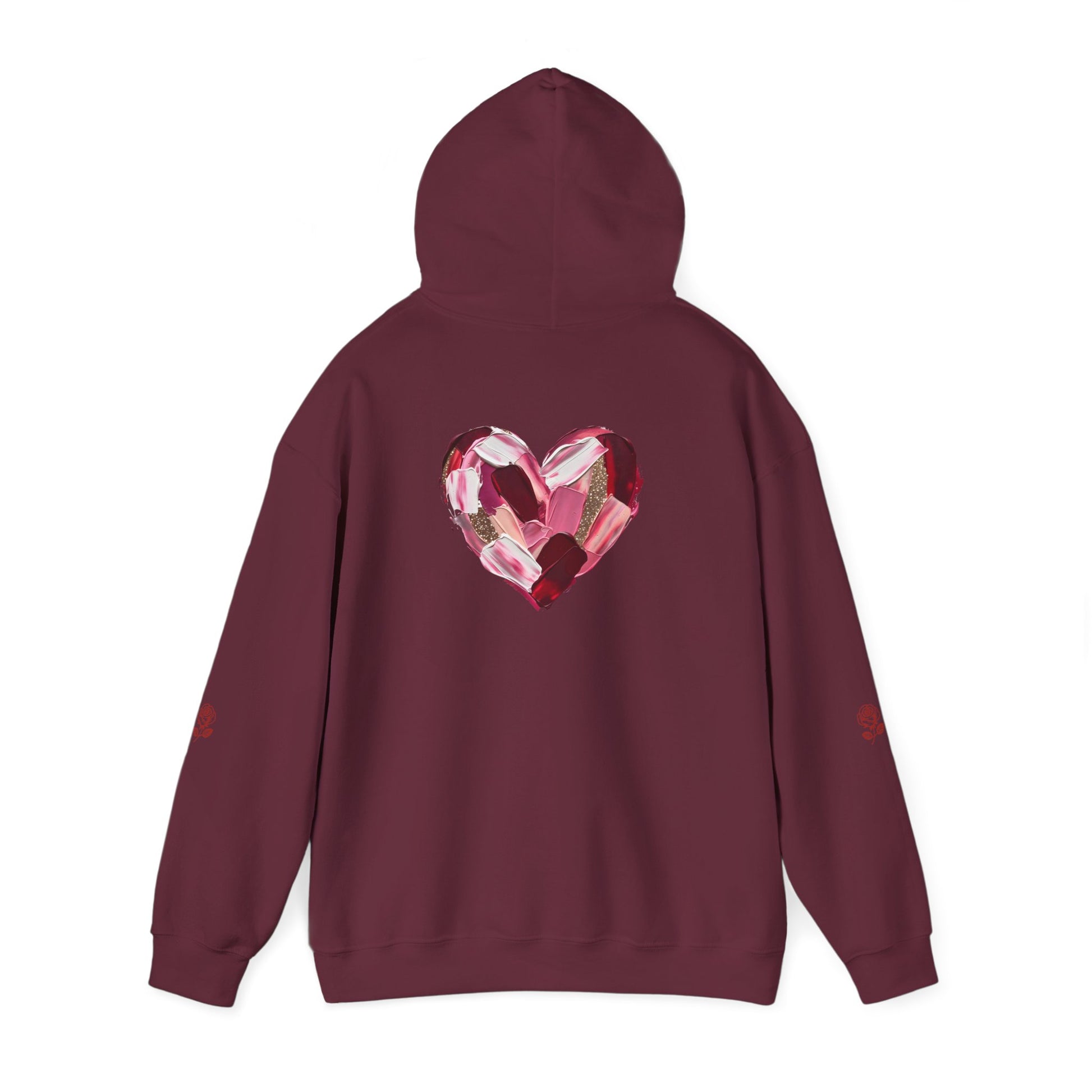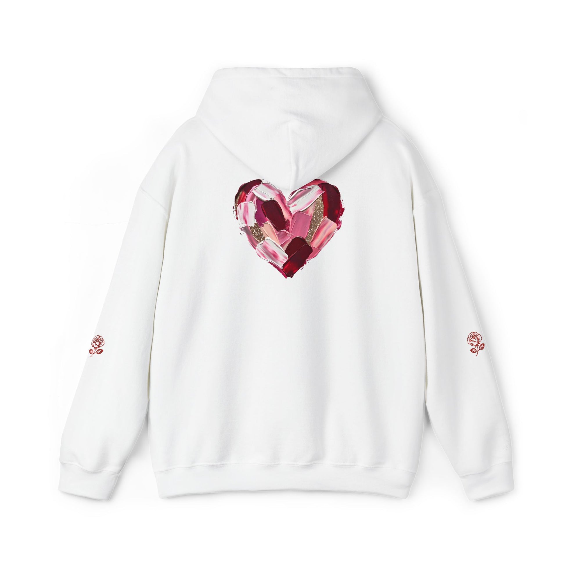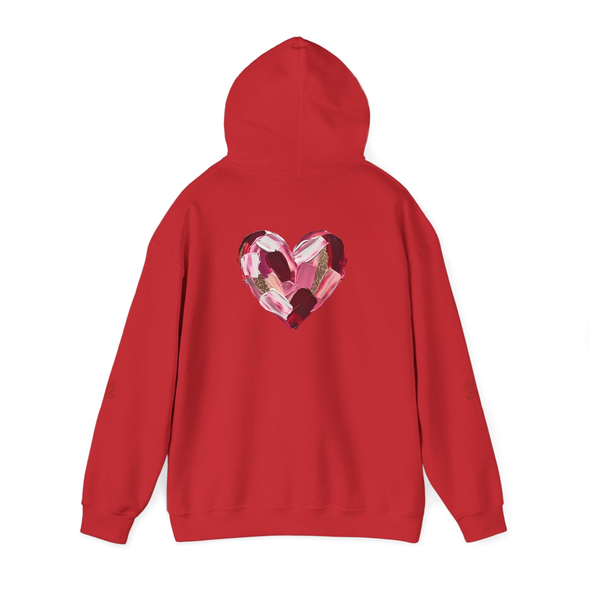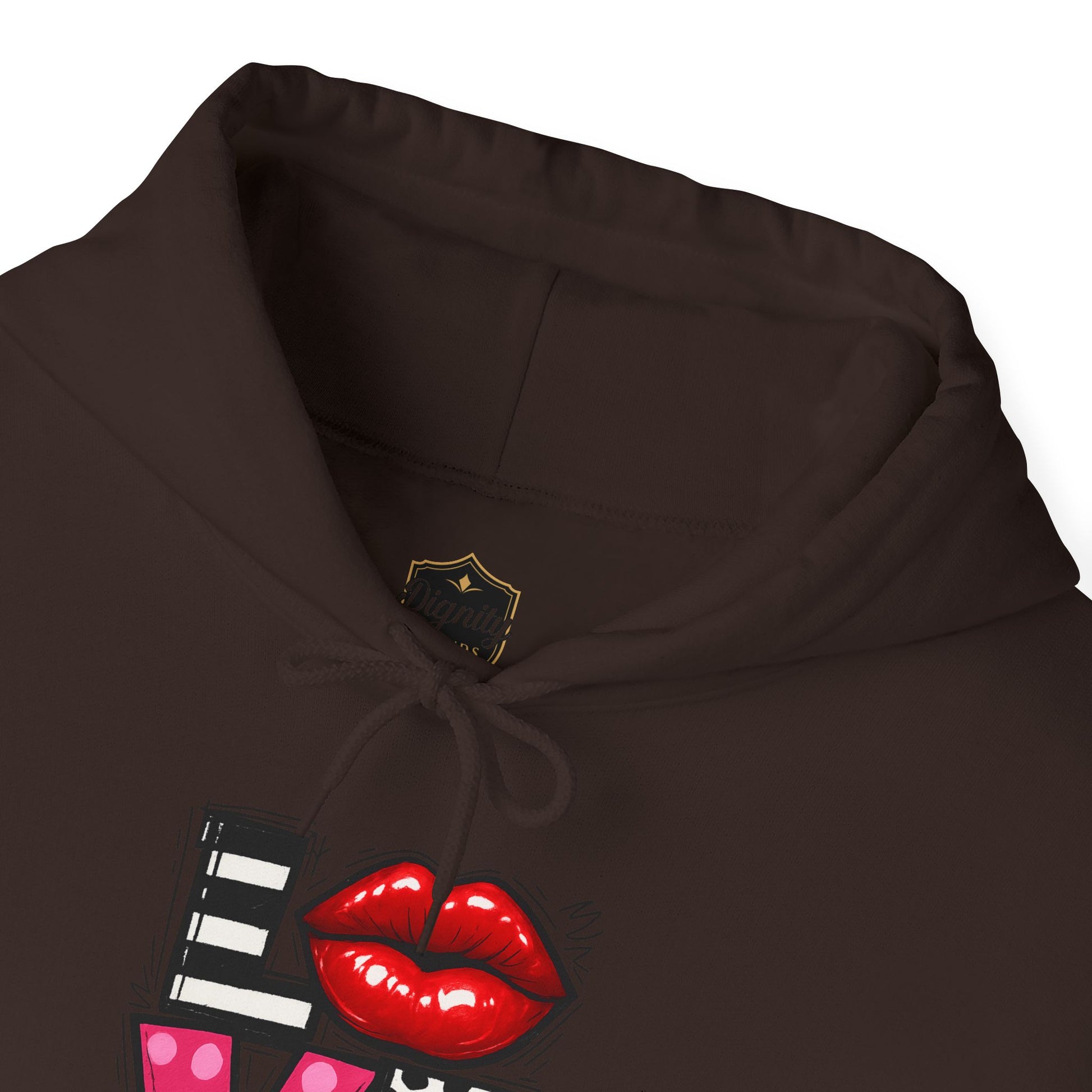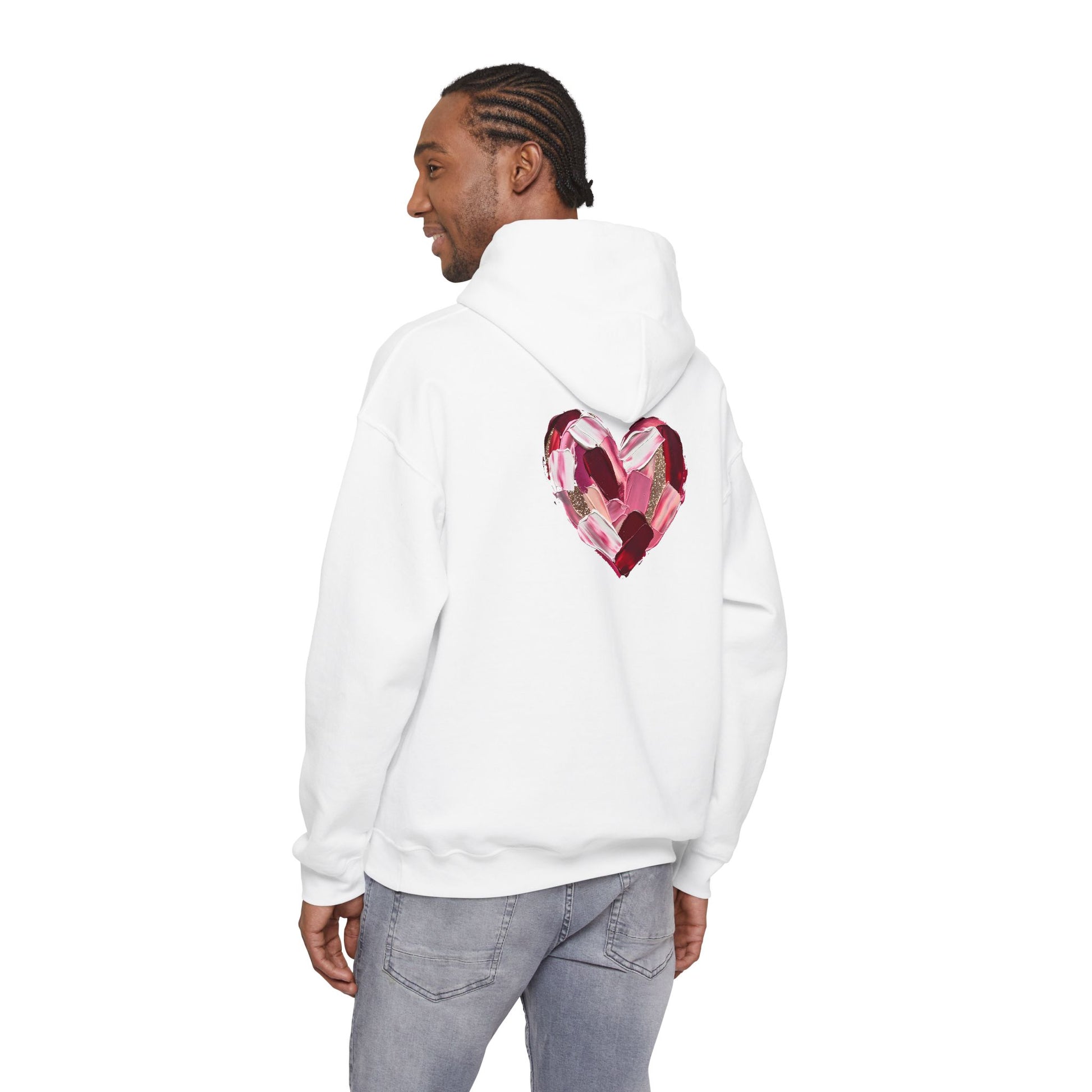 This cozy hoodie carries a playful, artsy take on love—bold lip art and patterned letter blocks on the front, and a painterly heart brushed across the back. It feels like slipping into a warm studio moment: soft, slightly oversized, and made to be lived in. Wear it when you want a touch of personality with everyday comfort—layer over a tee for errands, drape it on after a long day, or pull it on for a casual date night. The kangaroo pocket and double-lined hood add practical warmth, while the subtle wrist and sleeve details extend the artwork in a low-key, stylish way.