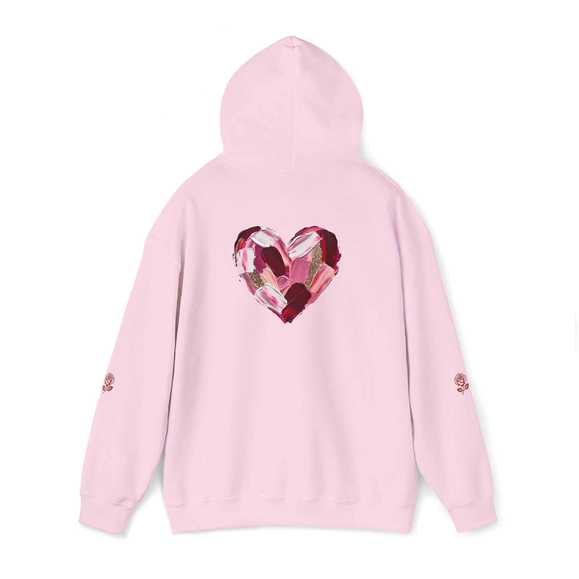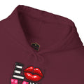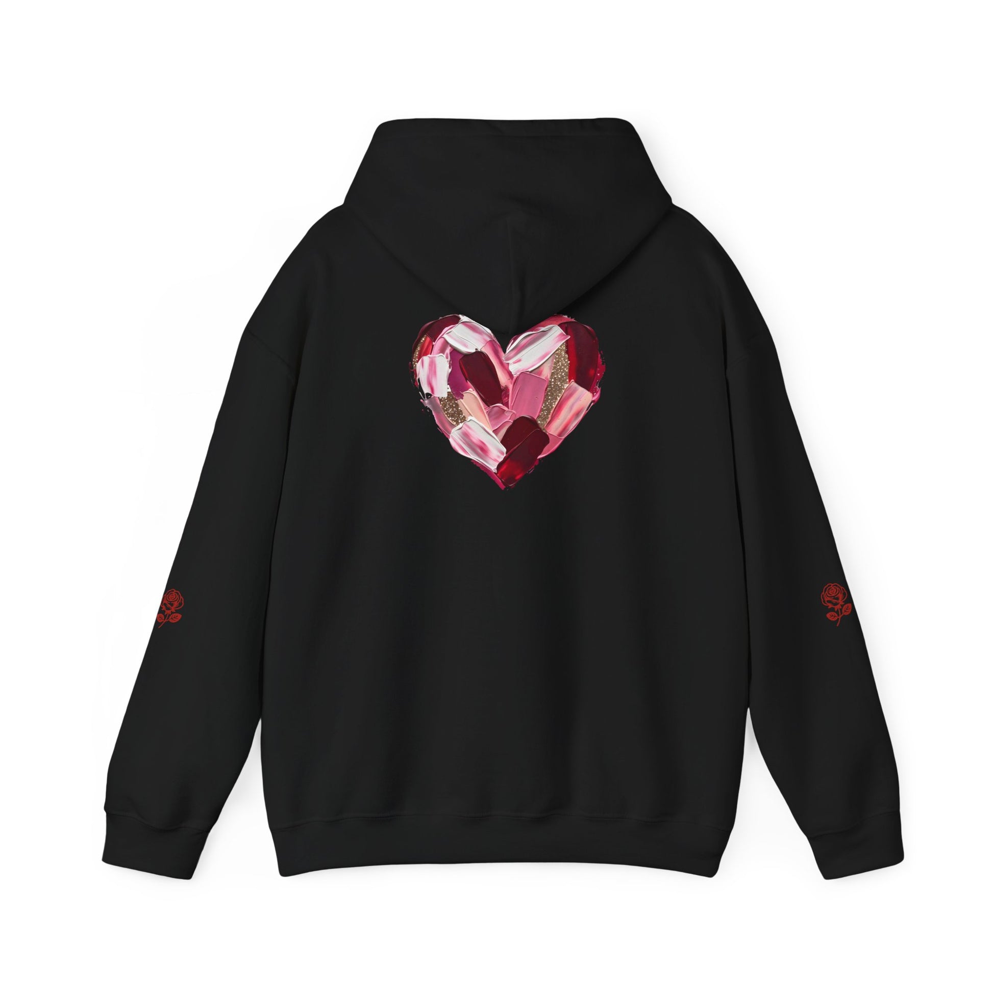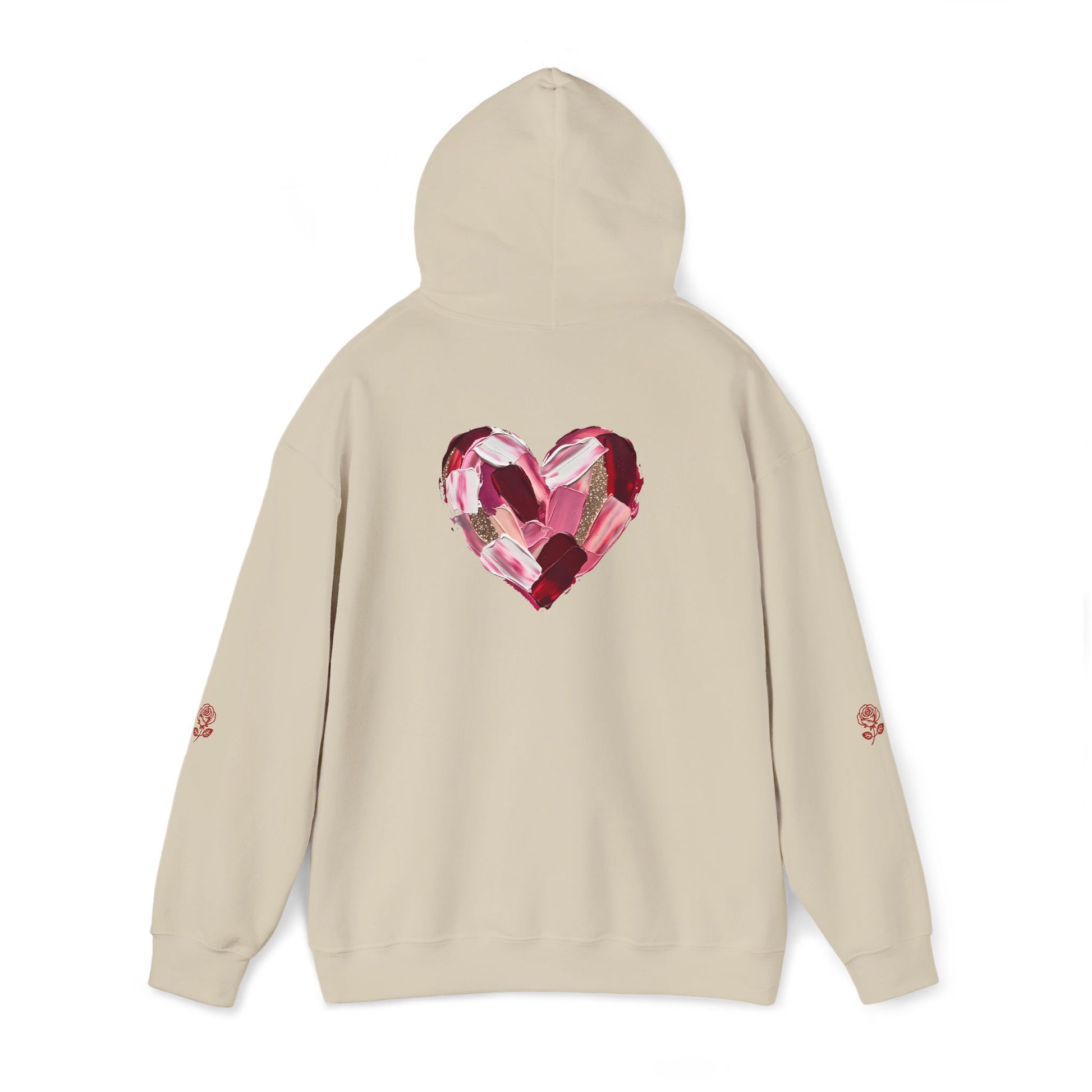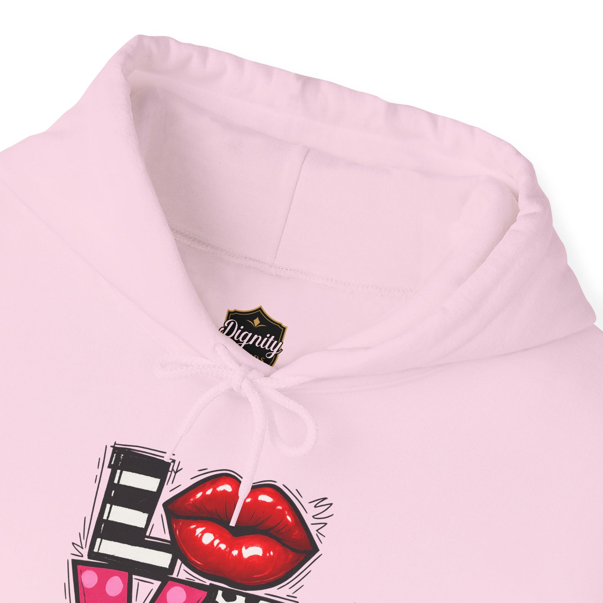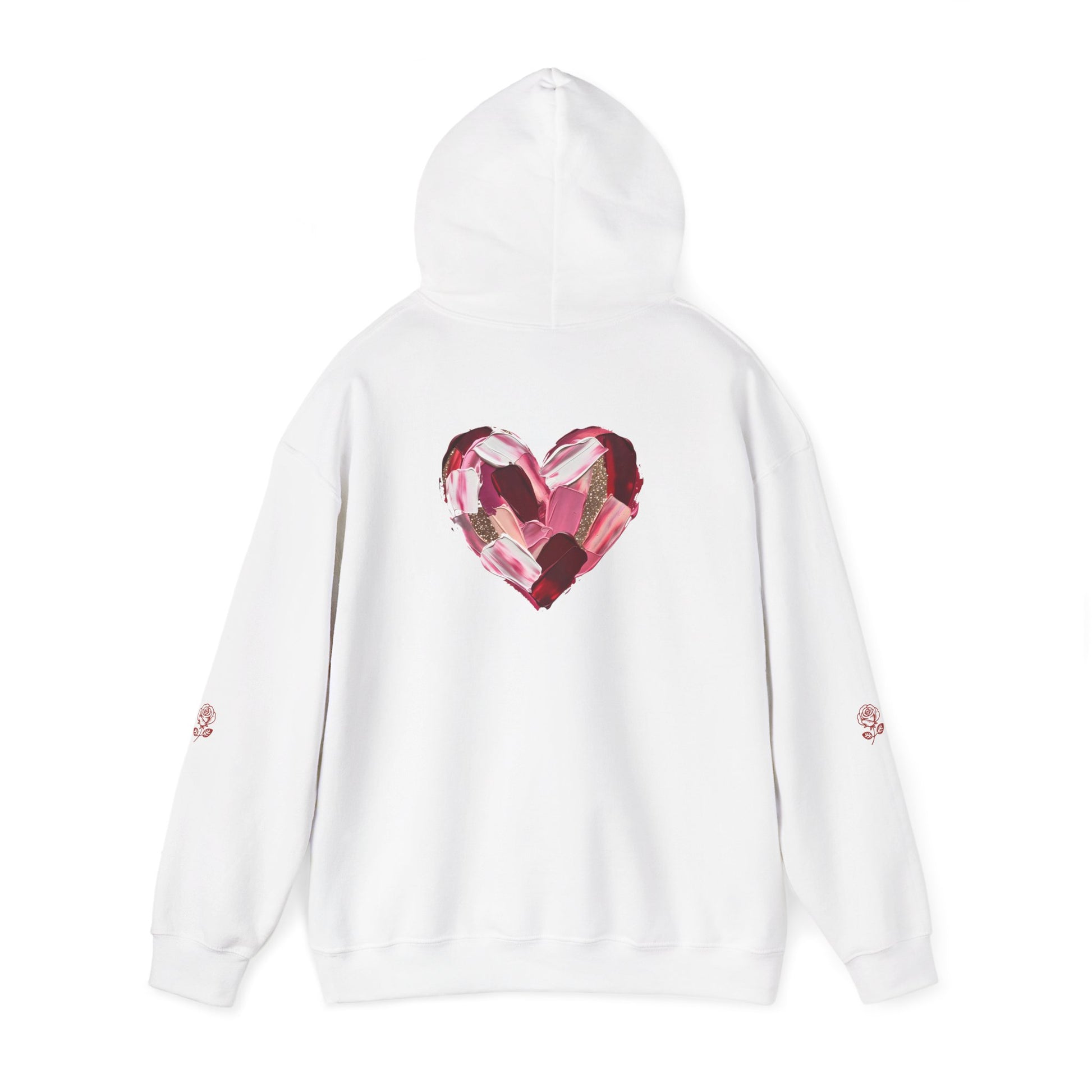 This cozy hoodie carries a playful, artsy take on love—bold lip art and patterned letter blocks on the front, and a painterly heart brushed across the back. It feels like slipping into a warm studio moment: soft, slightly oversized, and made to be lived in. Wear it when you want a touch of personality with everyday comfort—layer over a tee for errands, drape it on after a long day, or pull it on for a casual date night. The kangaroo pocket and double-lined hood add practical warmth, while the subtle wrist and sleeve details extend the artwork in a low-key, stylish way.