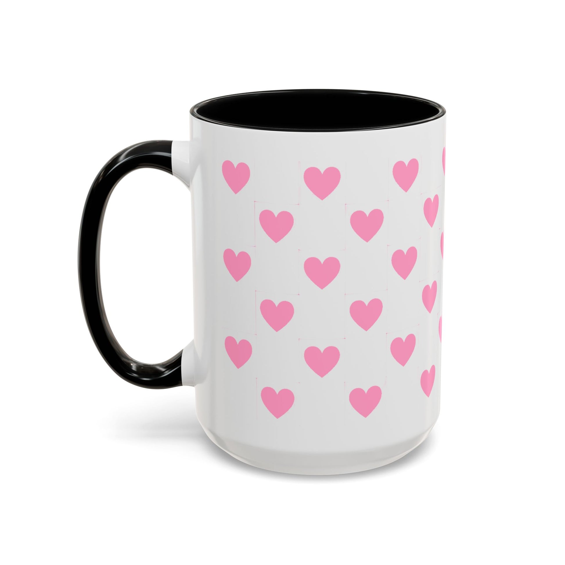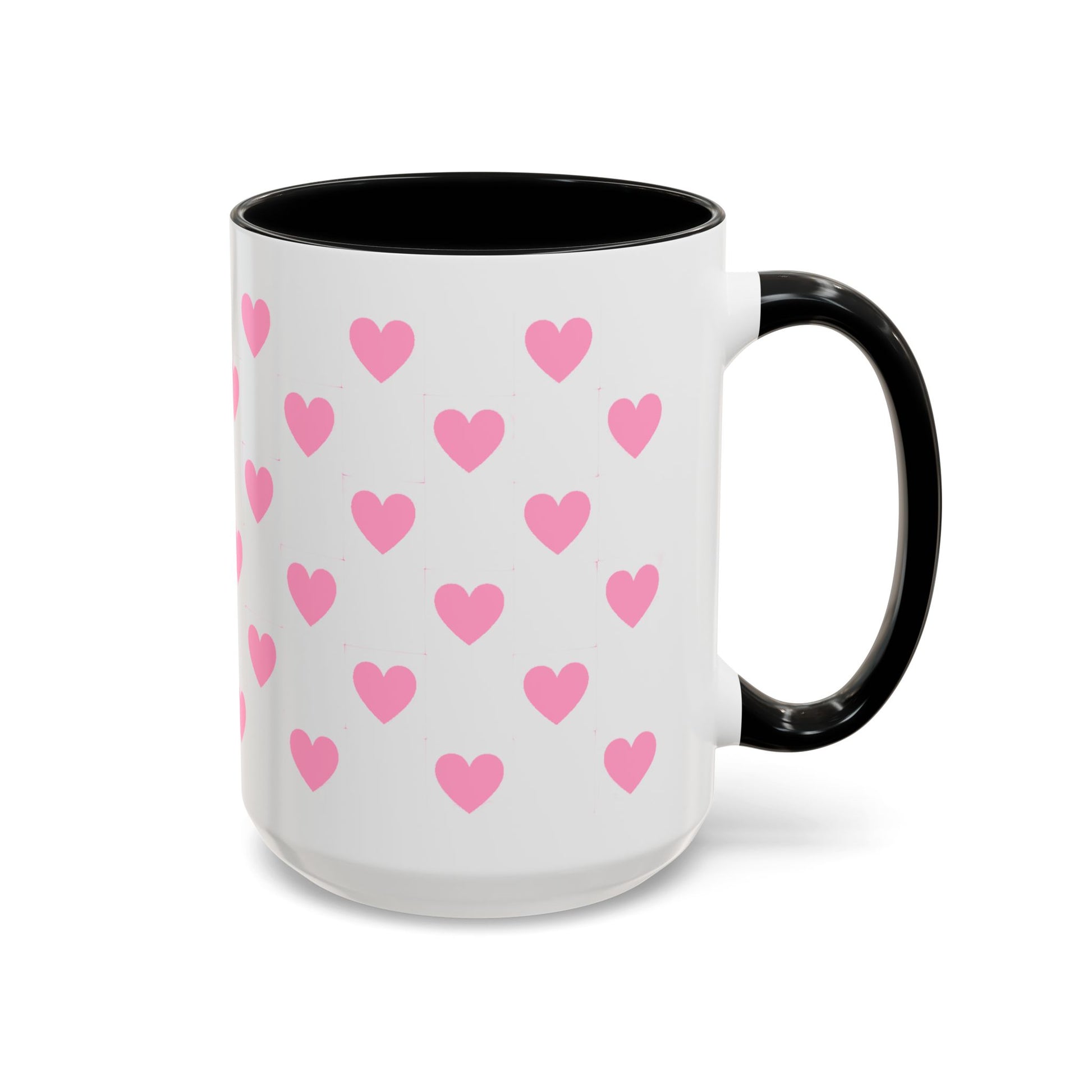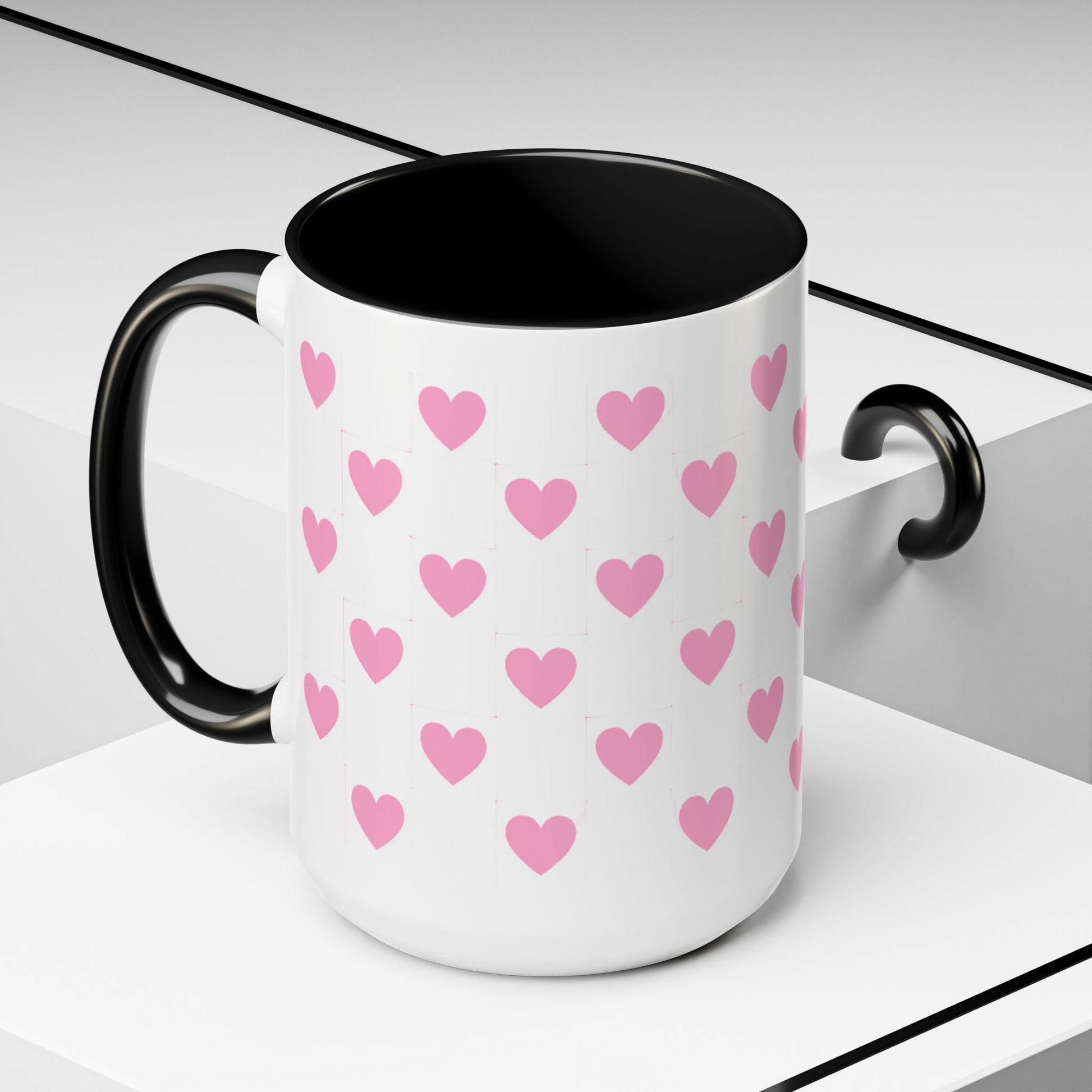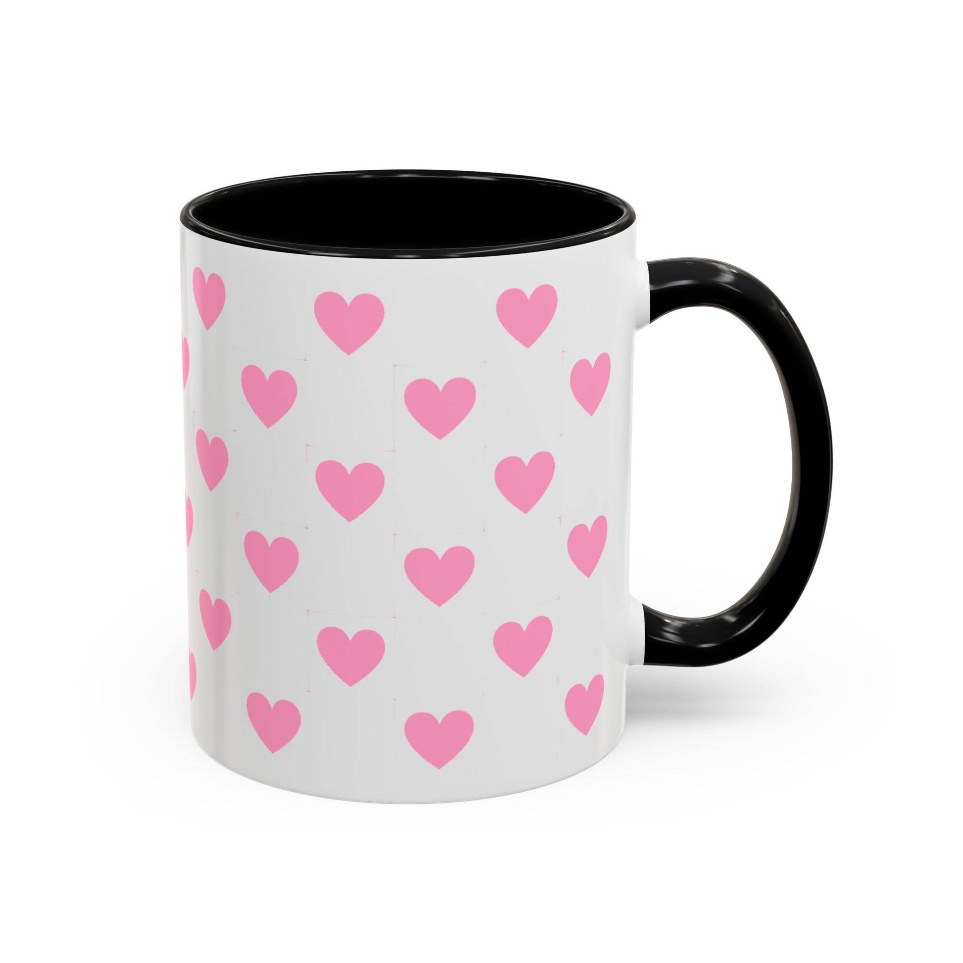 A glossy ceramic mug that adds a playful burst of pink to quiet mornings and cozy evenings. Each white mug is wrapped in a scatter of soft pink hearts, with a contrasting black interior and handle that makes the pattern pop. It feels cheerful in your hands — warm coffee, tea, or cocoa becomes a gentle ritual. This mug suits anyone who likes cute, minimalist patterns and small bursts of color in their kitchen. Choose 11oz or 15oz and pick the interior/handle color that matches your mood or shelf. Durable, microwave- and dishwasher-safe, it keeps the design bright through everyday use.