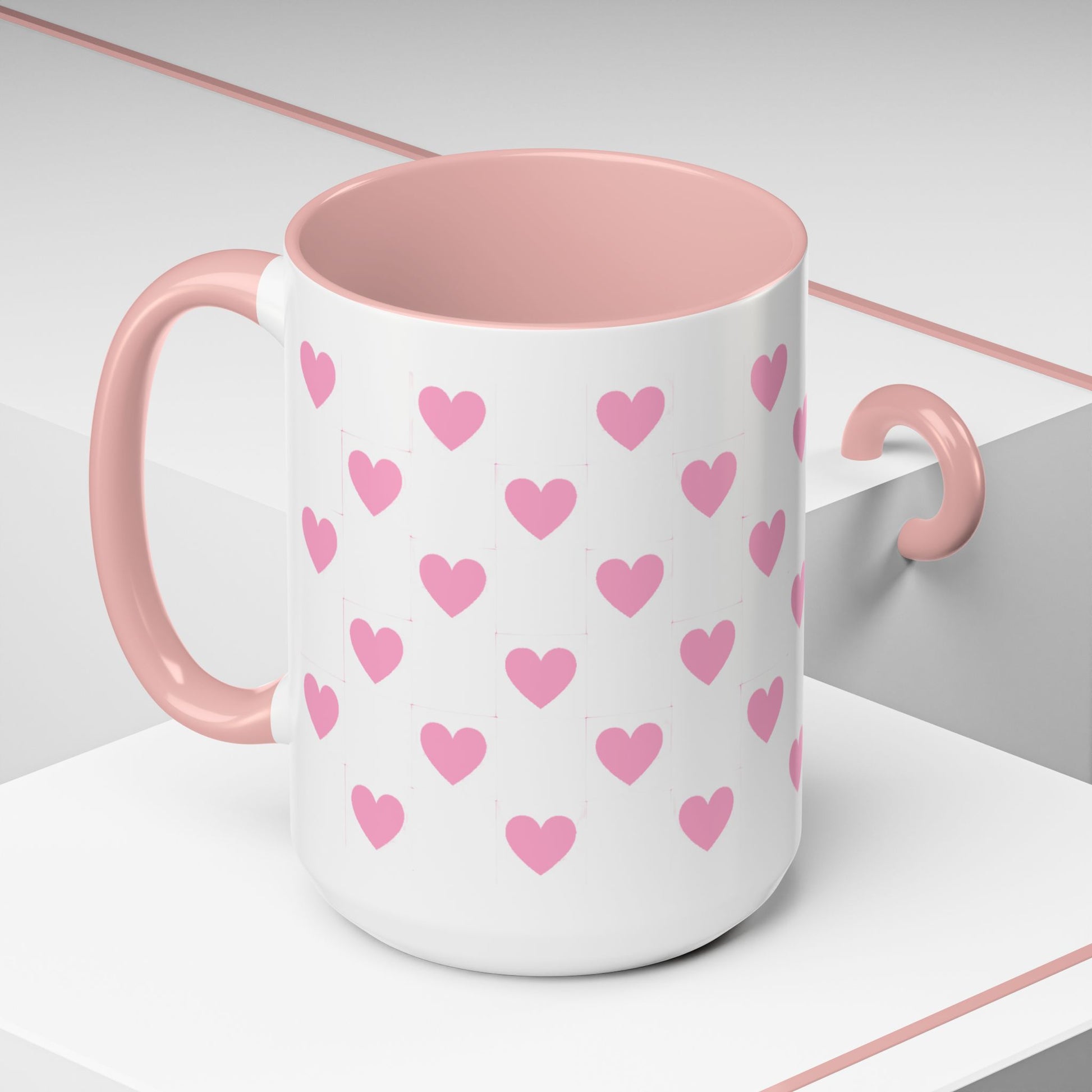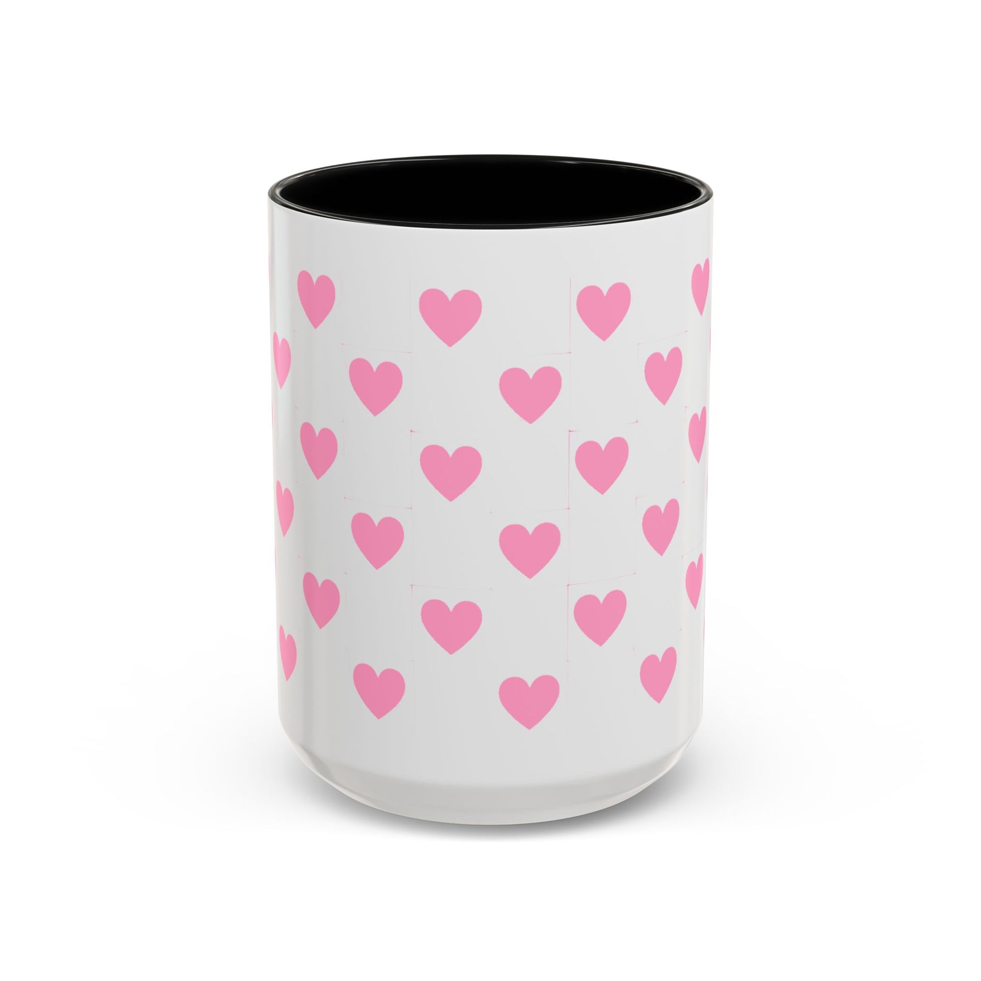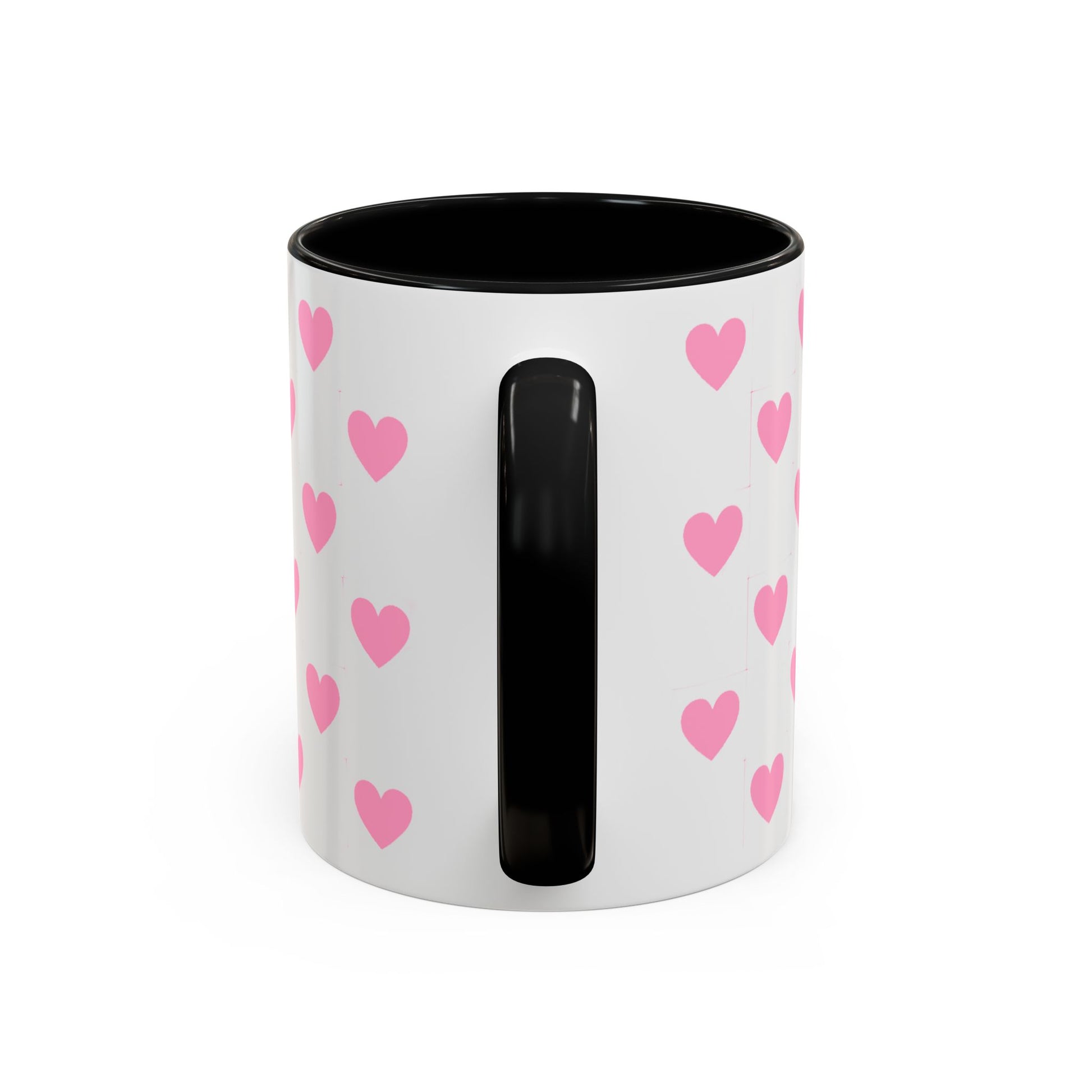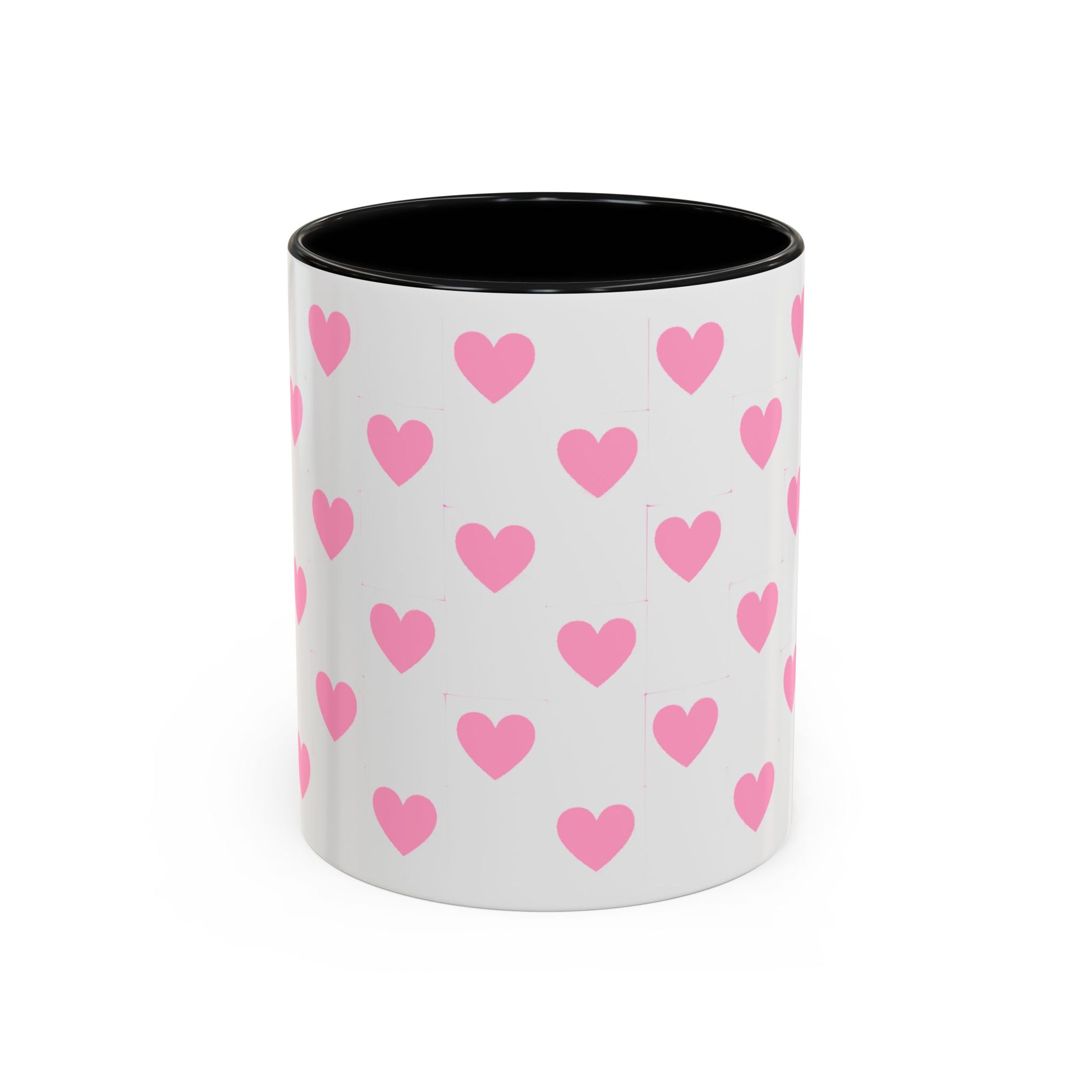 A glossy ceramic mug that adds a playful burst of pink to quiet mornings and cozy evenings. Each white mug is wrapped in a scatter of soft pink hearts, with a contrasting black interior and handle that makes the pattern pop. It feels cheerful in your hands — warm coffee, tea, or cocoa becomes a gentle ritual. This mug suits anyone who likes cute, minimalist patterns and small bursts of color in their kitchen. Choose 11oz or 15oz and pick the interior/handle color that matches your mood or shelf. Durable, microwave- and dishwasher-safe, it keeps the design bright through everyday use.