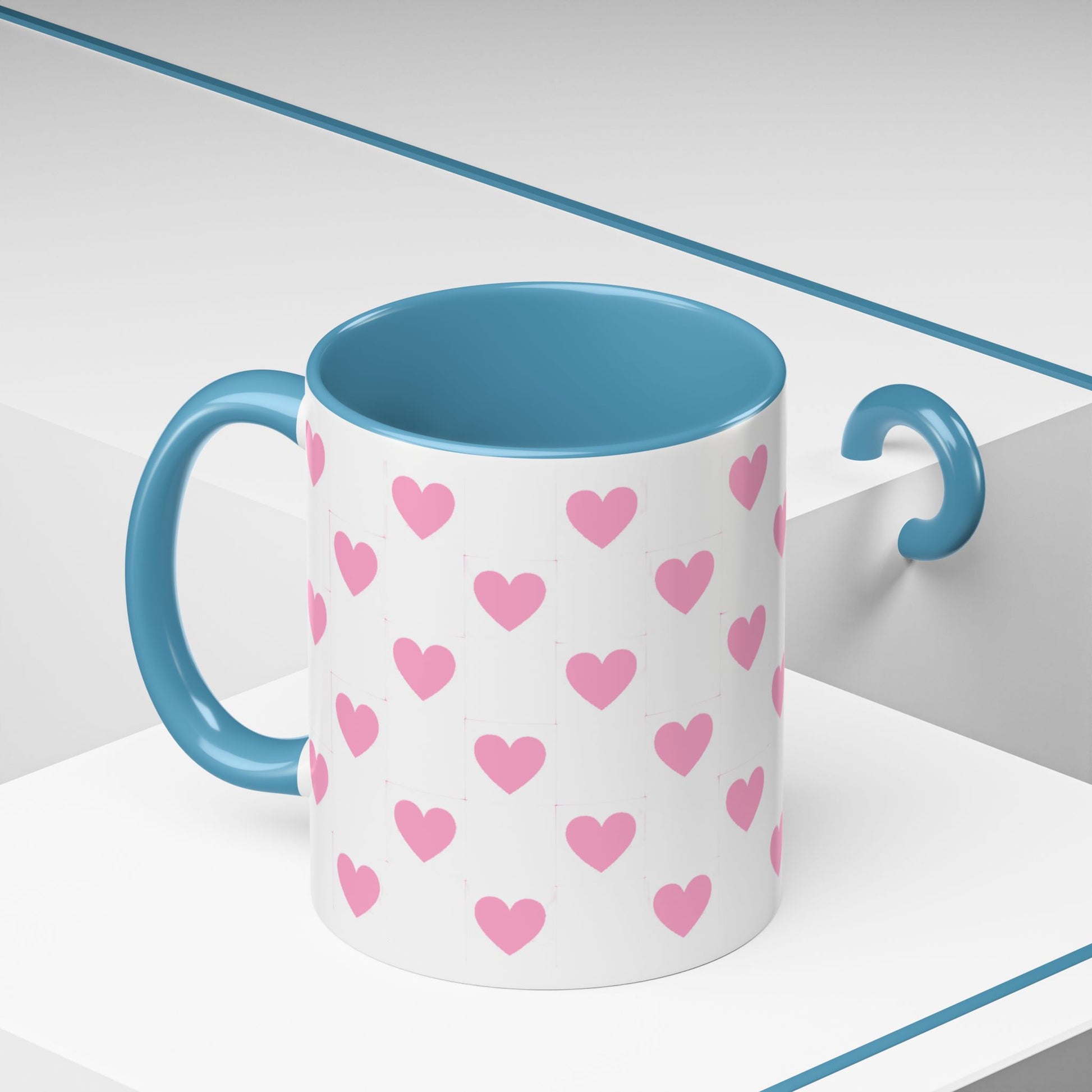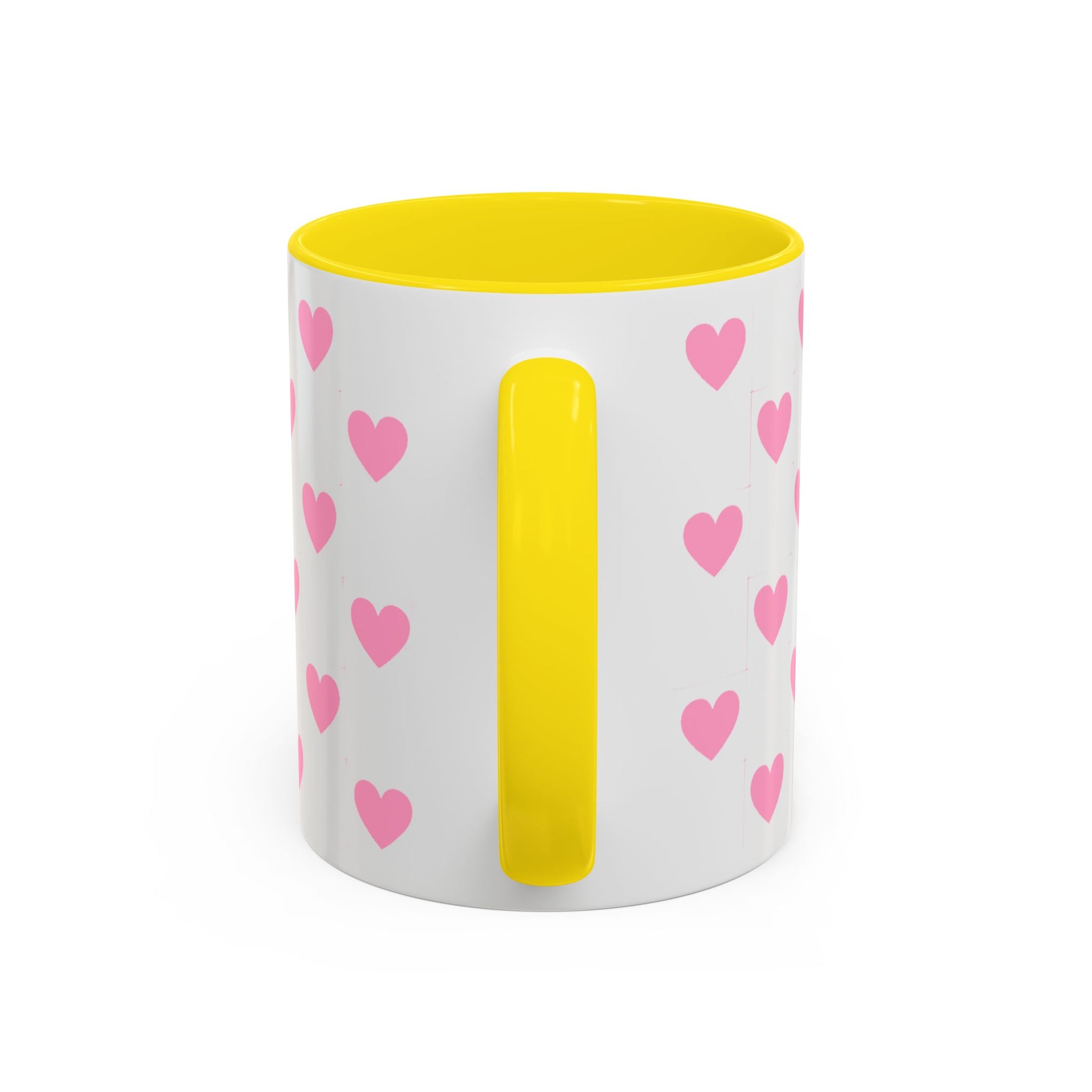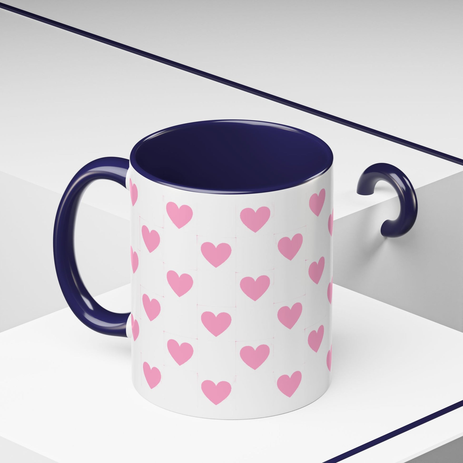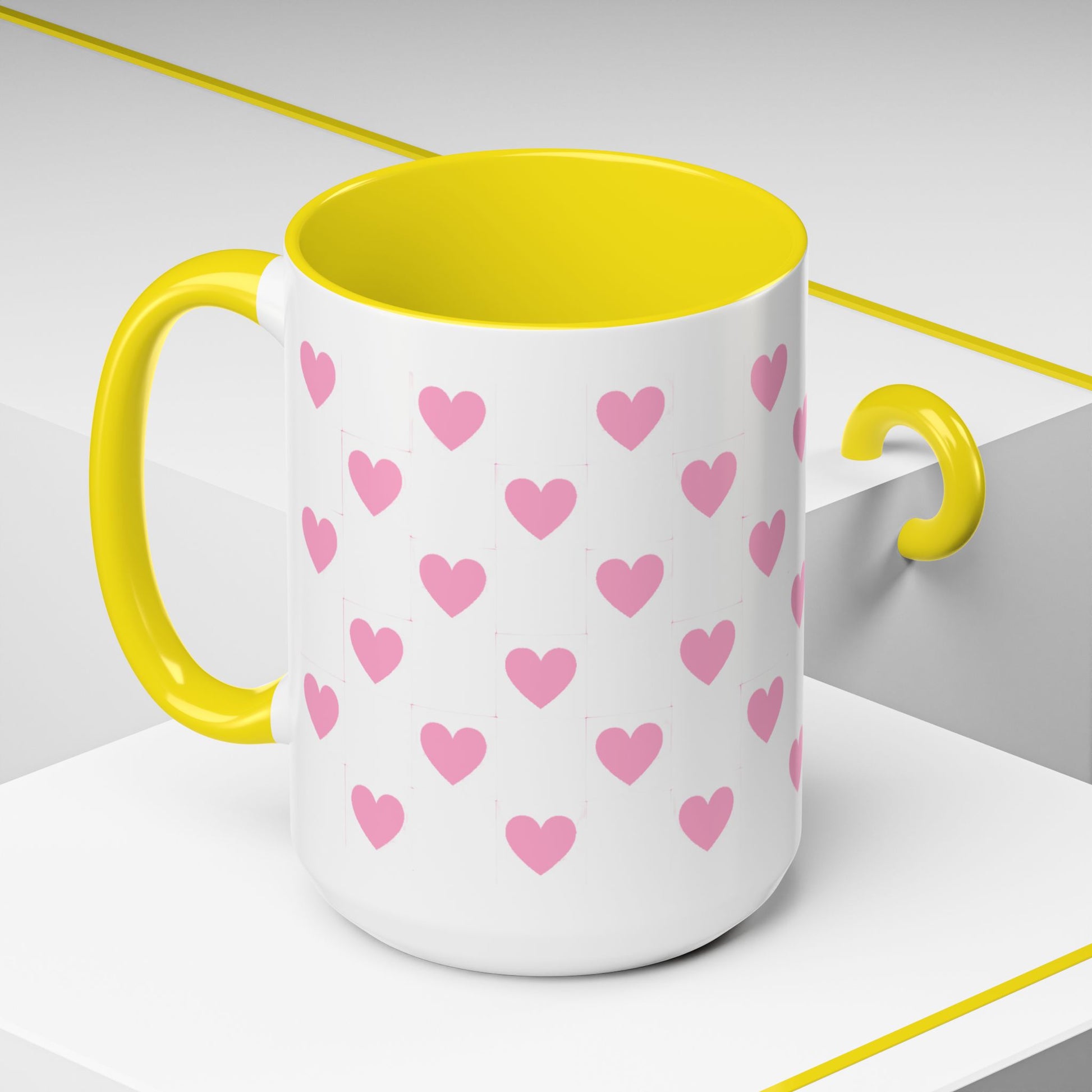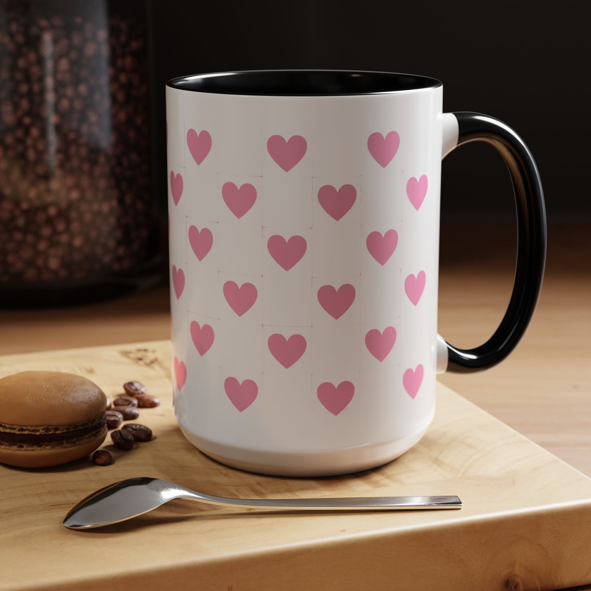 A glossy ceramic mug that adds a playful burst of pink to quiet mornings and cozy evenings. Each white mug is wrapped in a scatter of soft pink hearts, with a contrasting black interior and handle that makes the pattern pop. It feels cheerful in your hands — warm coffee, tea, or cocoa becomes a gentle ritual. This mug suits anyone who likes cute, minimalist patterns and small bursts of color in their kitchen. Choose 11oz or 15oz and pick the interior/handle color that matches your mood or shelf. Durable, microwave- and dishwasher-safe, it keeps the design bright through everyday use.