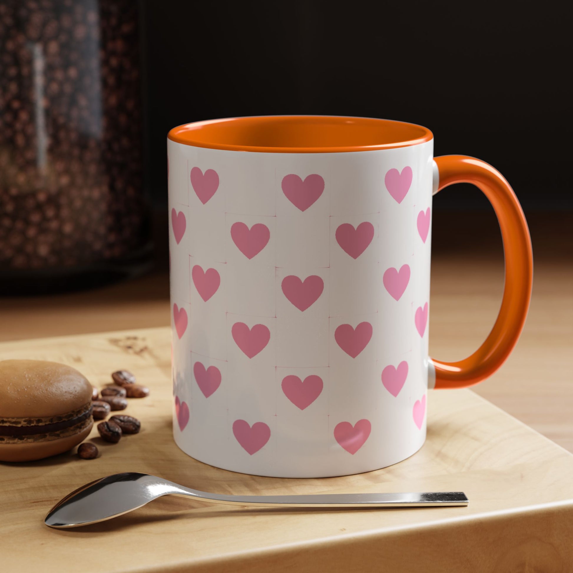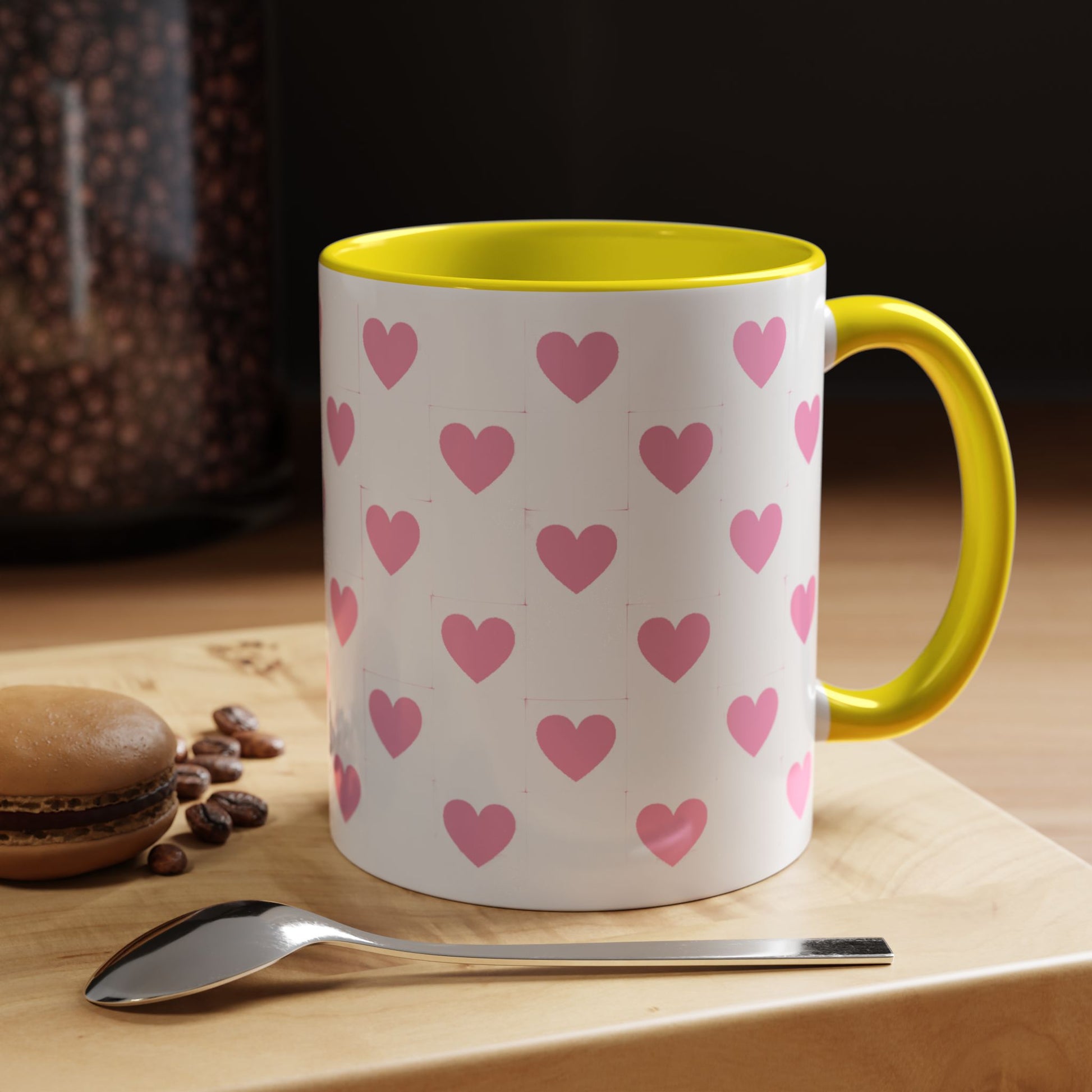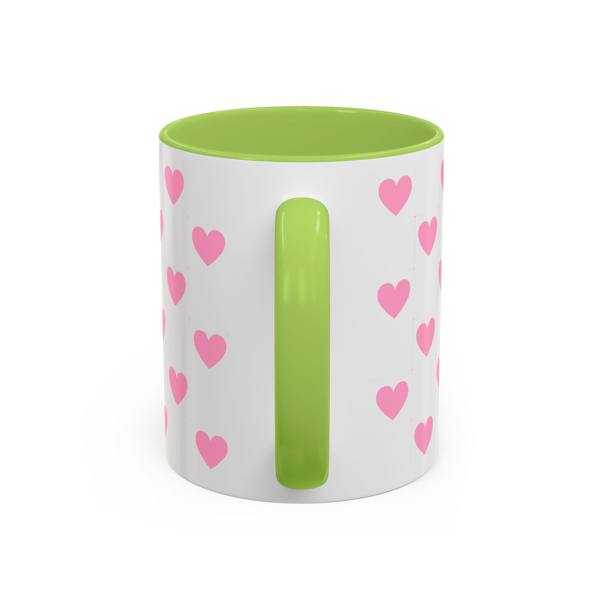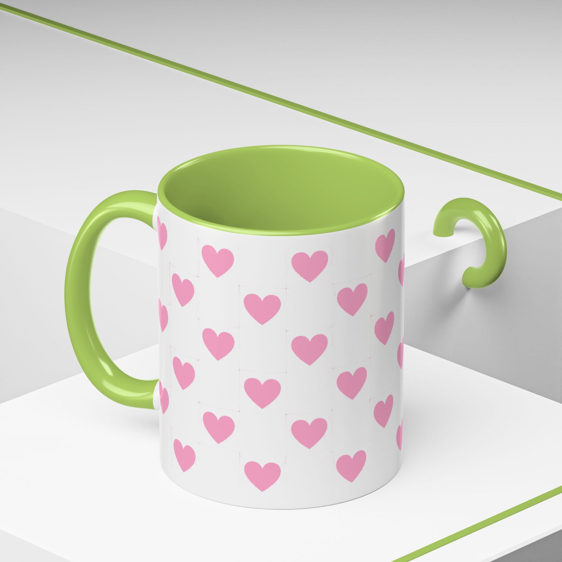 A glossy ceramic mug that adds a playful burst of pink to quiet mornings and cozy evenings. Each white mug is wrapped in a scatter of soft pink hearts, with a contrasting black interior and handle that makes the pattern pop. It feels cheerful in your hands — warm coffee, tea, or cocoa becomes a gentle ritual. This mug suits anyone who likes cute, minimalist patterns and small bursts of color in their kitchen. Choose 11oz or 15oz and pick the interior/handle color that matches your mood or shelf. Durable, microwave- and dishwasher-safe, it keeps the design bright through everyday use.