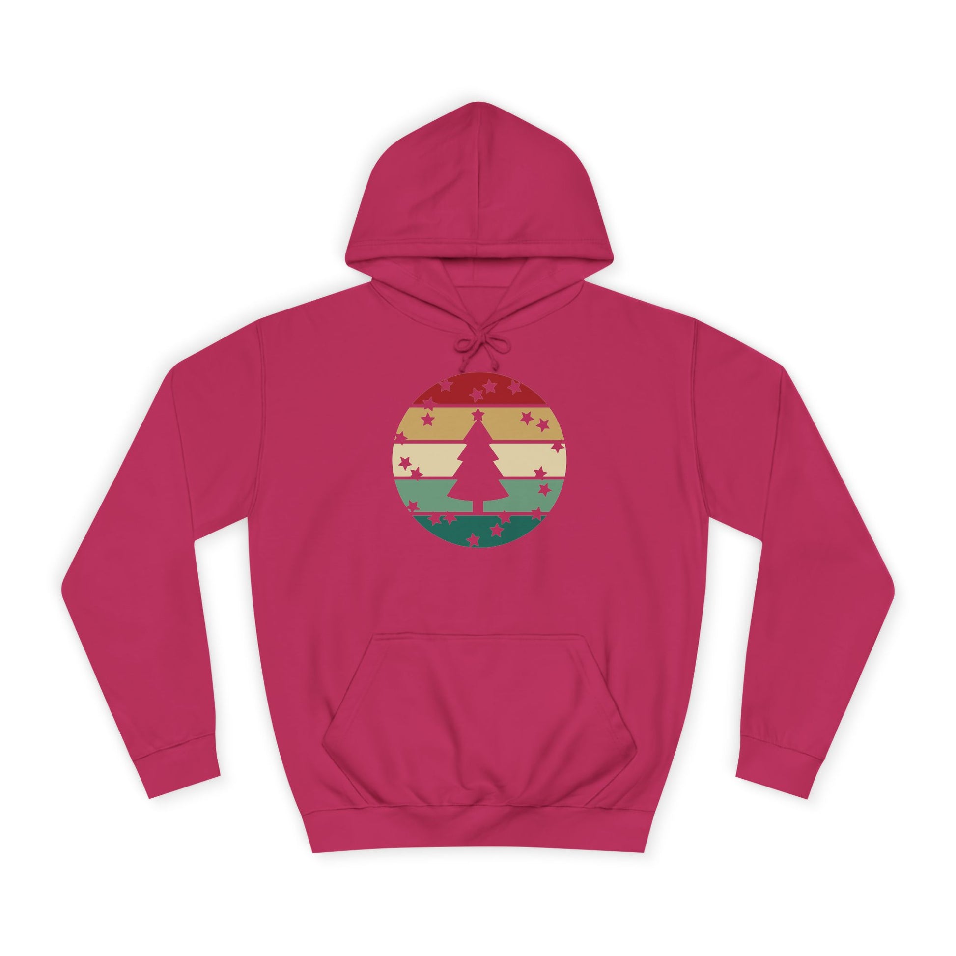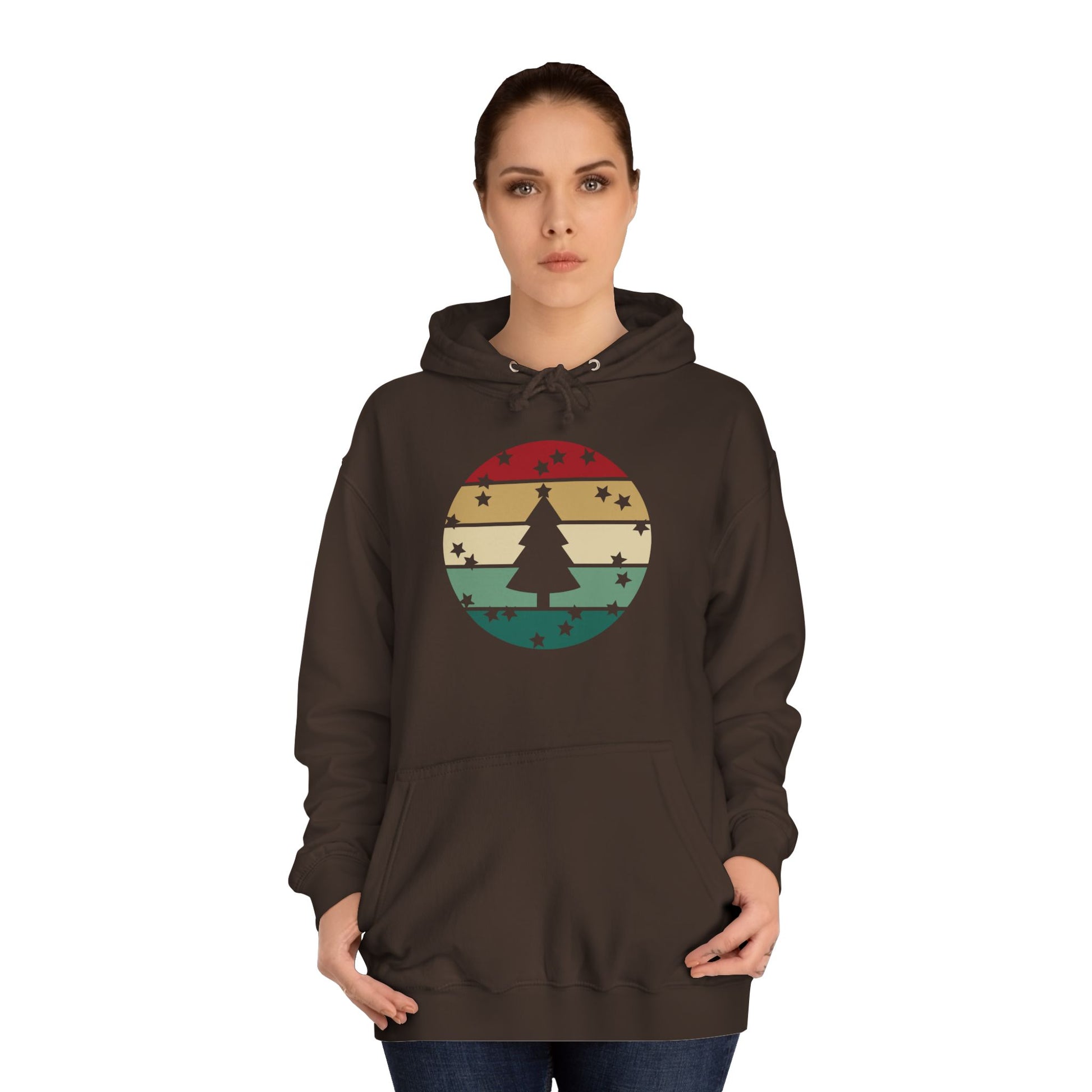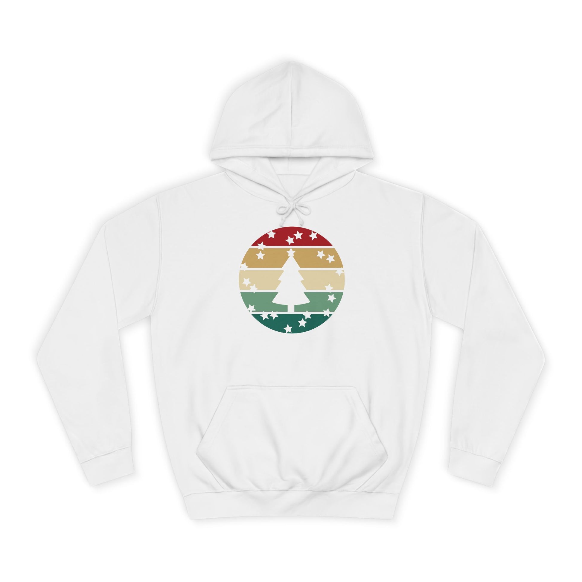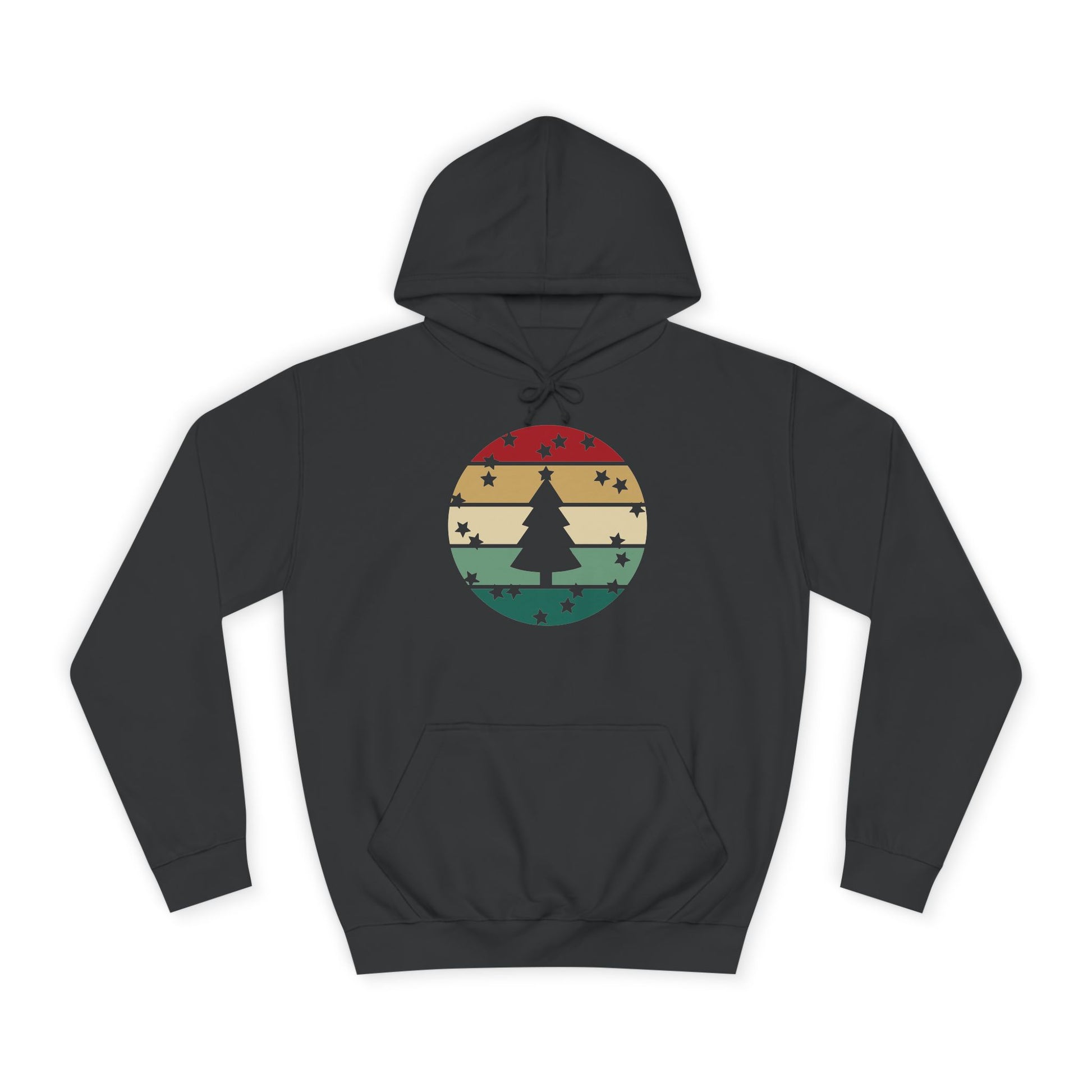 Soft, roomy, and warmly nostalgic — this hoodie carries a quiet winter spirit. The front features a retro-striped circular motif with a stylized evergreen silhouette, its muted red, tan and forest-green bands evoking slow walks through frosted neighborhoods and low-light evenings by a string of warm bulbs. The loose fit and medium-heavy fabric make it great for layer-up days: slip it over a tee between classes, pull the hood up on breezy evenings, or use the kangaroo pocket to warm your hands while you wander. Thoughtfully constructed with side seams for shape retention, a drawstring hood with metal grommets, and a tear-away label for comfort. Ethically produced with WRAP, Sedex and PETA certifications, this hoodie blends a lived-in vintage look with practical everyday wear.