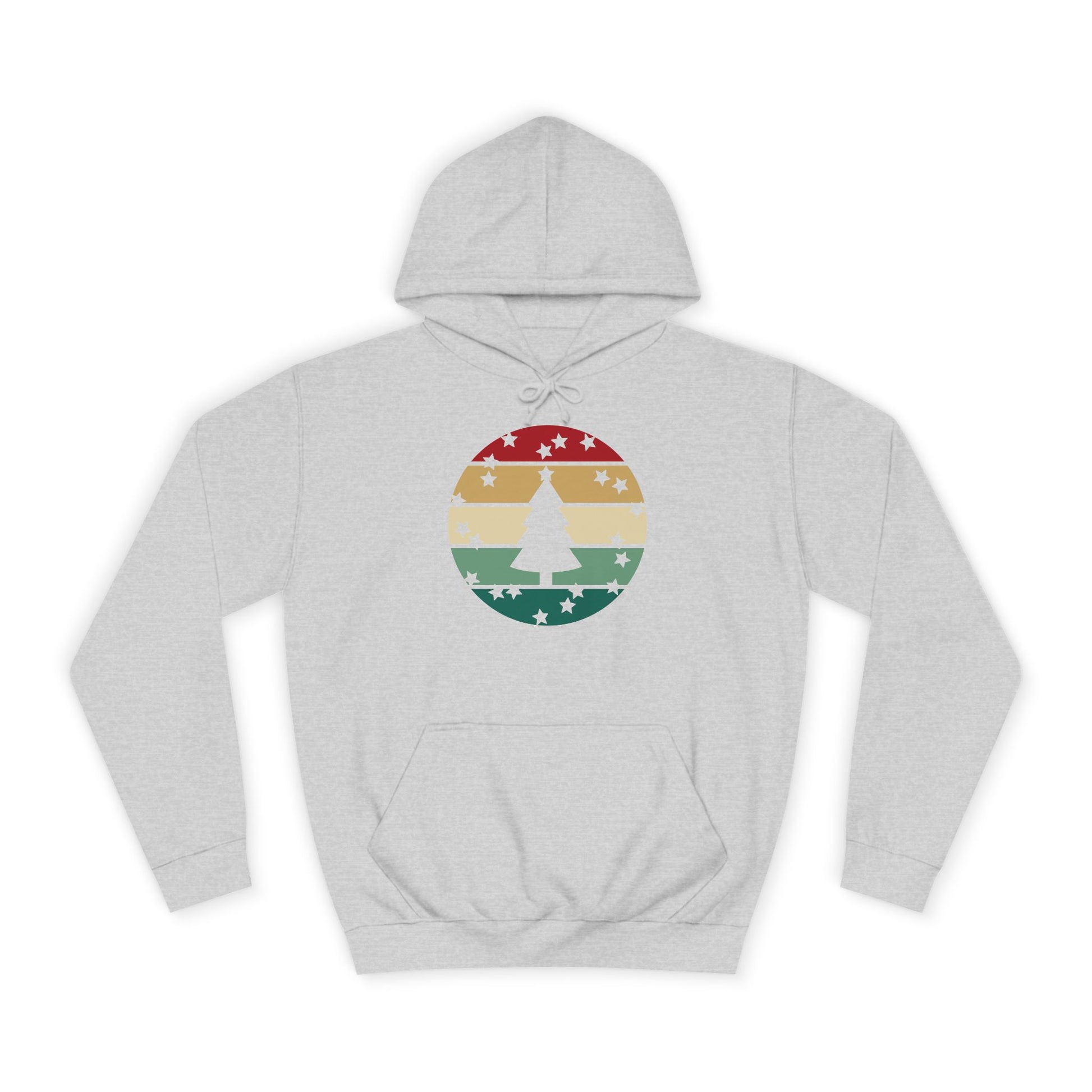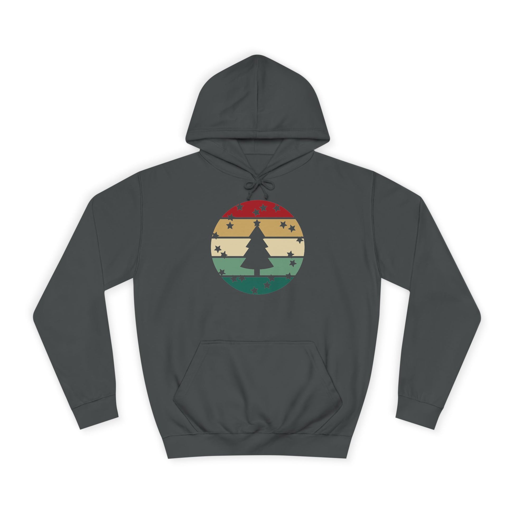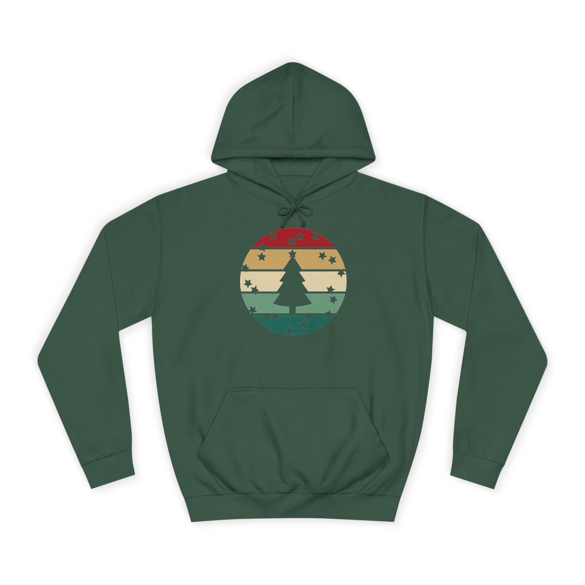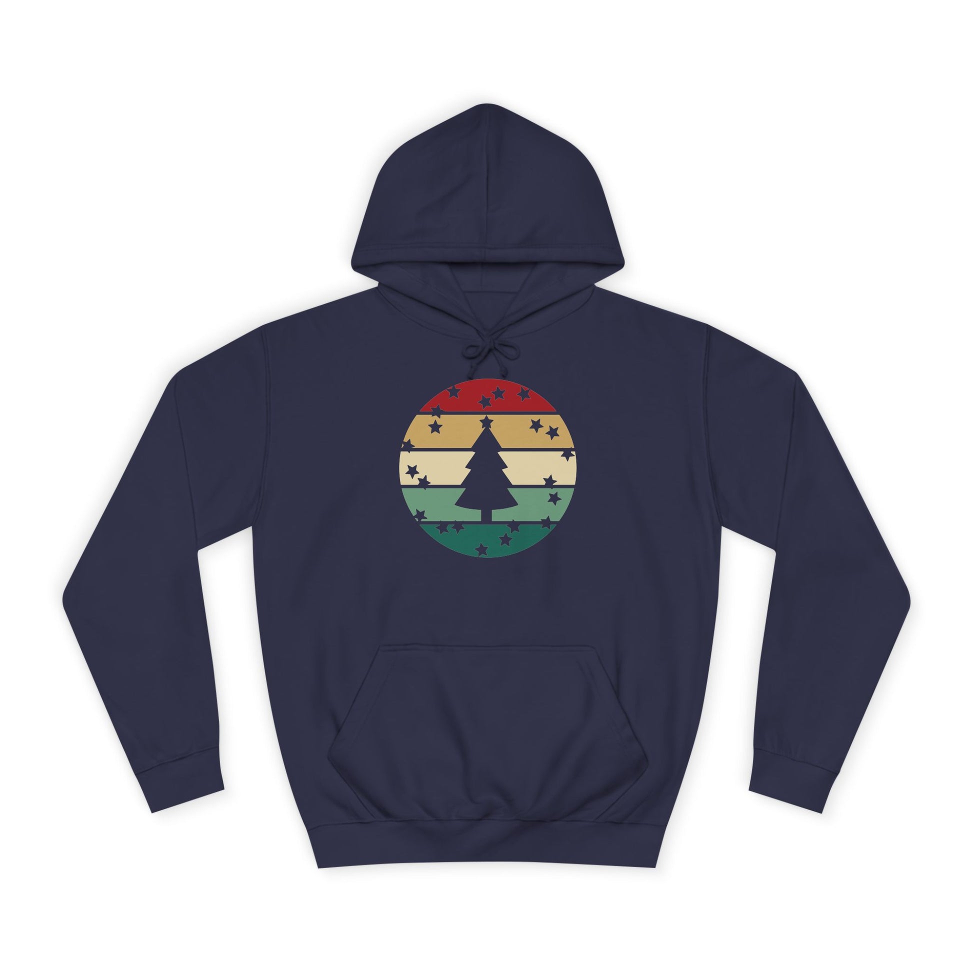 Soft, roomy, and warmly nostalgic — this hoodie carries a quiet winter spirit. The front features a retro-striped circular motif with a stylized evergreen silhouette, its muted red, tan and forest-green bands evoking slow walks through frosted neighborhoods and low-light evenings by a string of warm bulbs. The loose fit and medium-heavy fabric make it great for layer-up days: slip it over a tee between classes, pull the hood up on breezy evenings, or use the kangaroo pocket to warm your hands while you wander. Thoughtfully constructed with side seams for shape retention, a drawstring hood with metal grommets, and a tear-away label for comfort. Ethically produced with WRAP, Sedex and PETA certifications, this hoodie blends a lived-in vintage look with practical everyday wear.