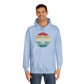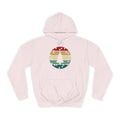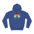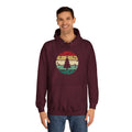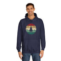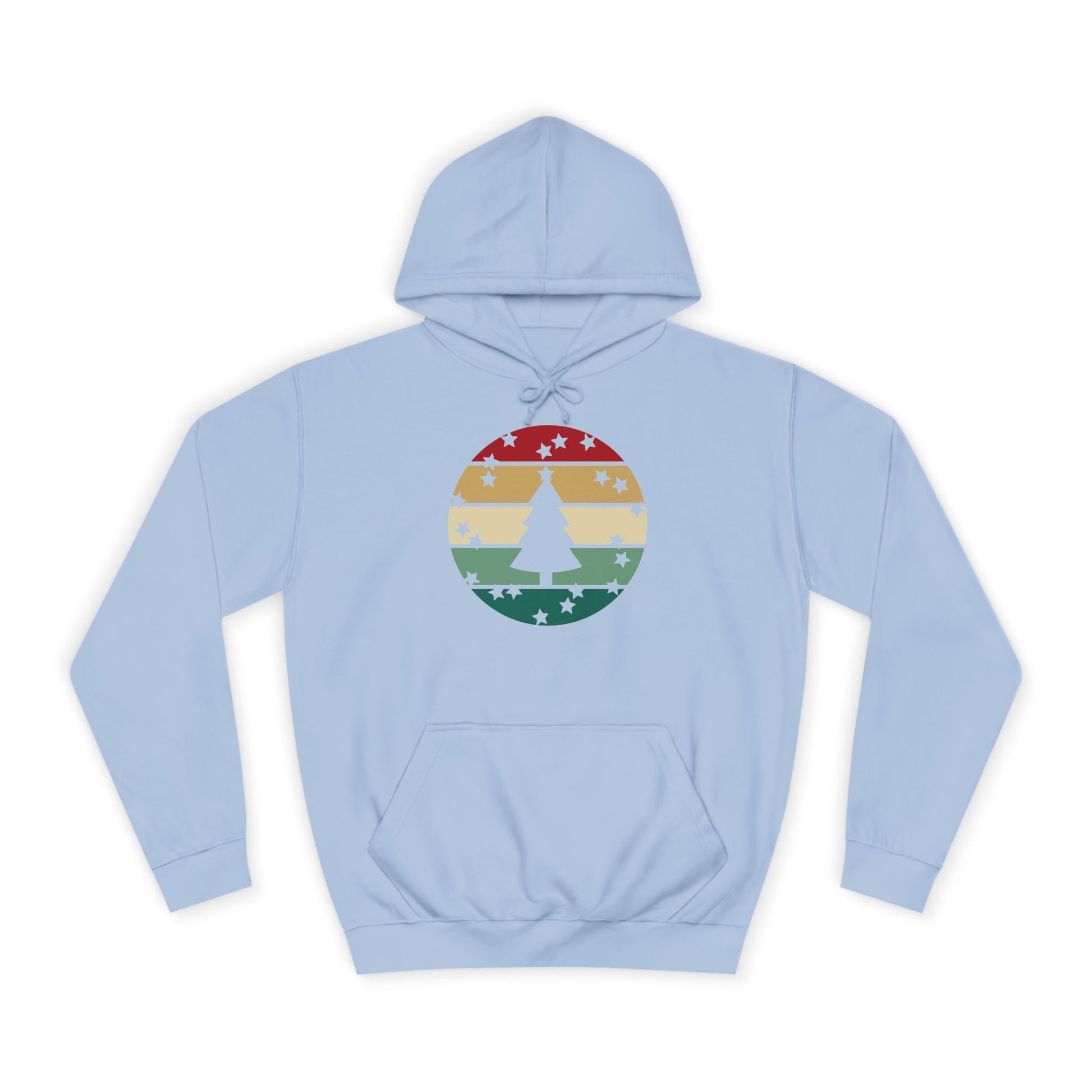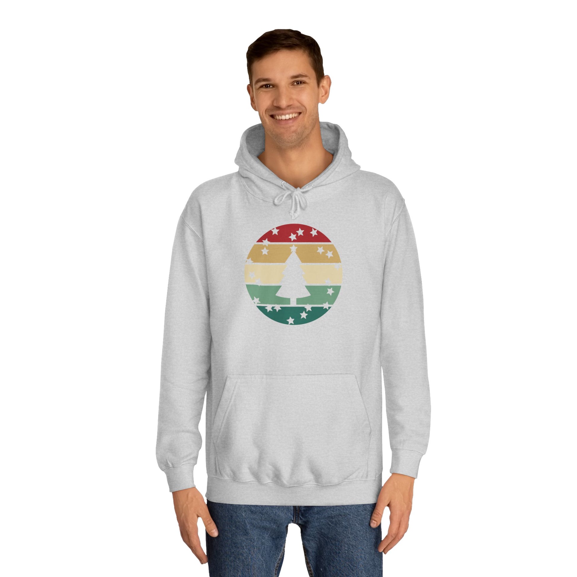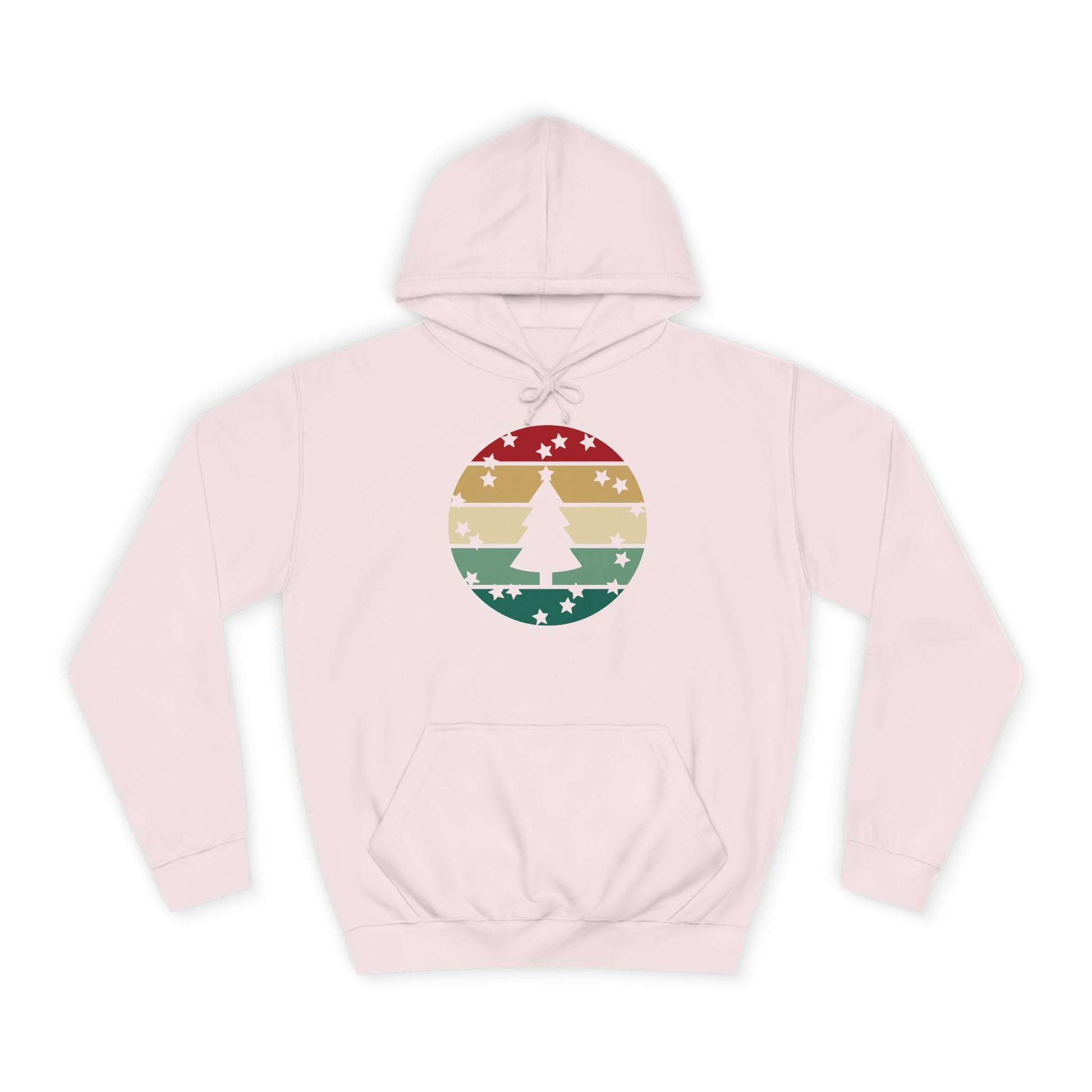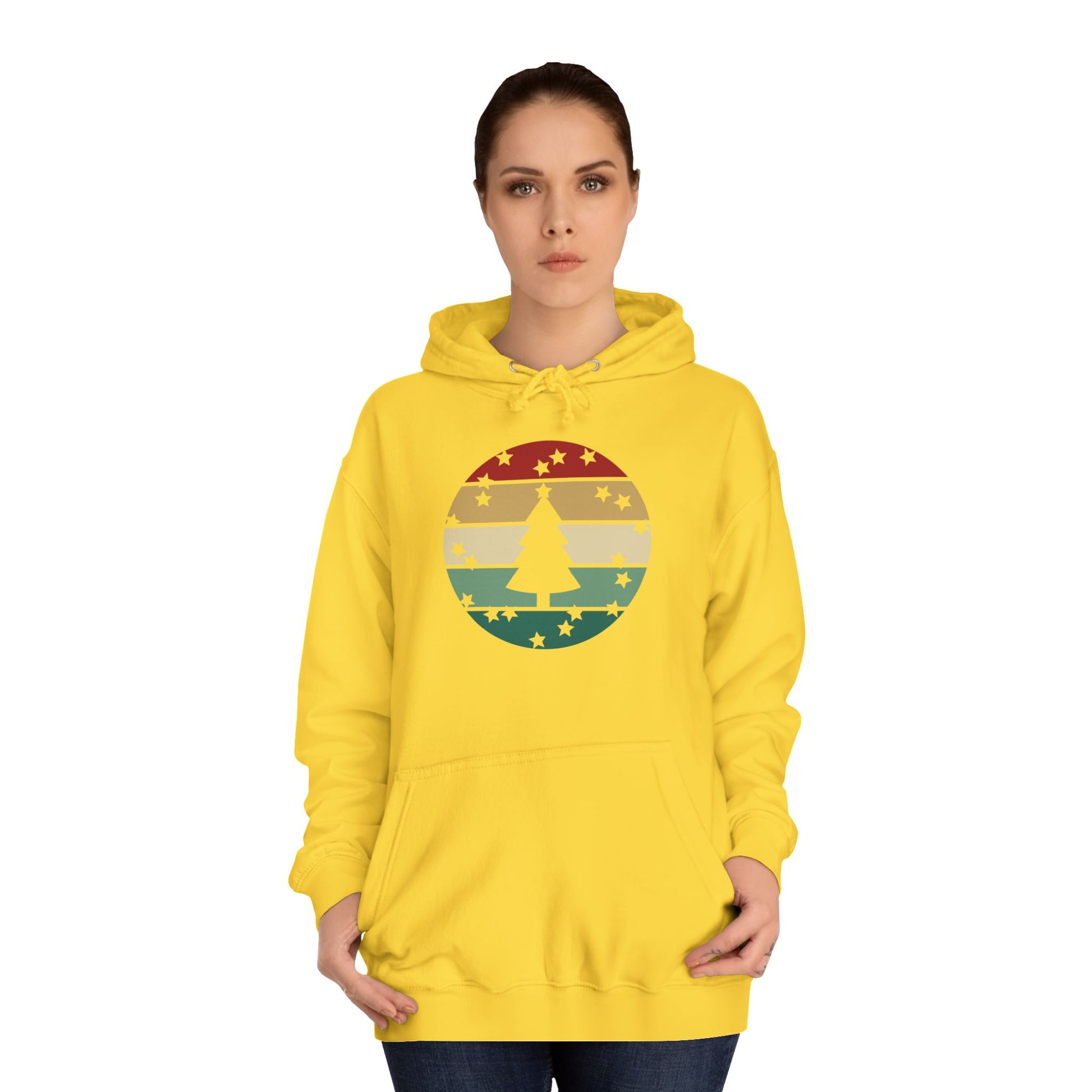 Soft, roomy, and warmly nostalgic — this hoodie carries a quiet winter spirit. The front features a retro-striped circular motif with a stylized evergreen silhouette, its muted red, tan and forest-green bands evoking slow walks through frosted neighborhoods and low-light evenings by a string of warm bulbs. The loose fit and medium-heavy fabric make it great for layer-up days: slip it over a tee between classes, pull the hood up on breezy evenings, or use the kangaroo pocket to warm your hands while you wander. Thoughtfully constructed with side seams for shape retention, a drawstring hood with metal grommets, and a tear-away label for comfort. Ethically produced with WRAP, Sedex and PETA certifications, this hoodie blends a lived-in vintage look with practical everyday wear.
