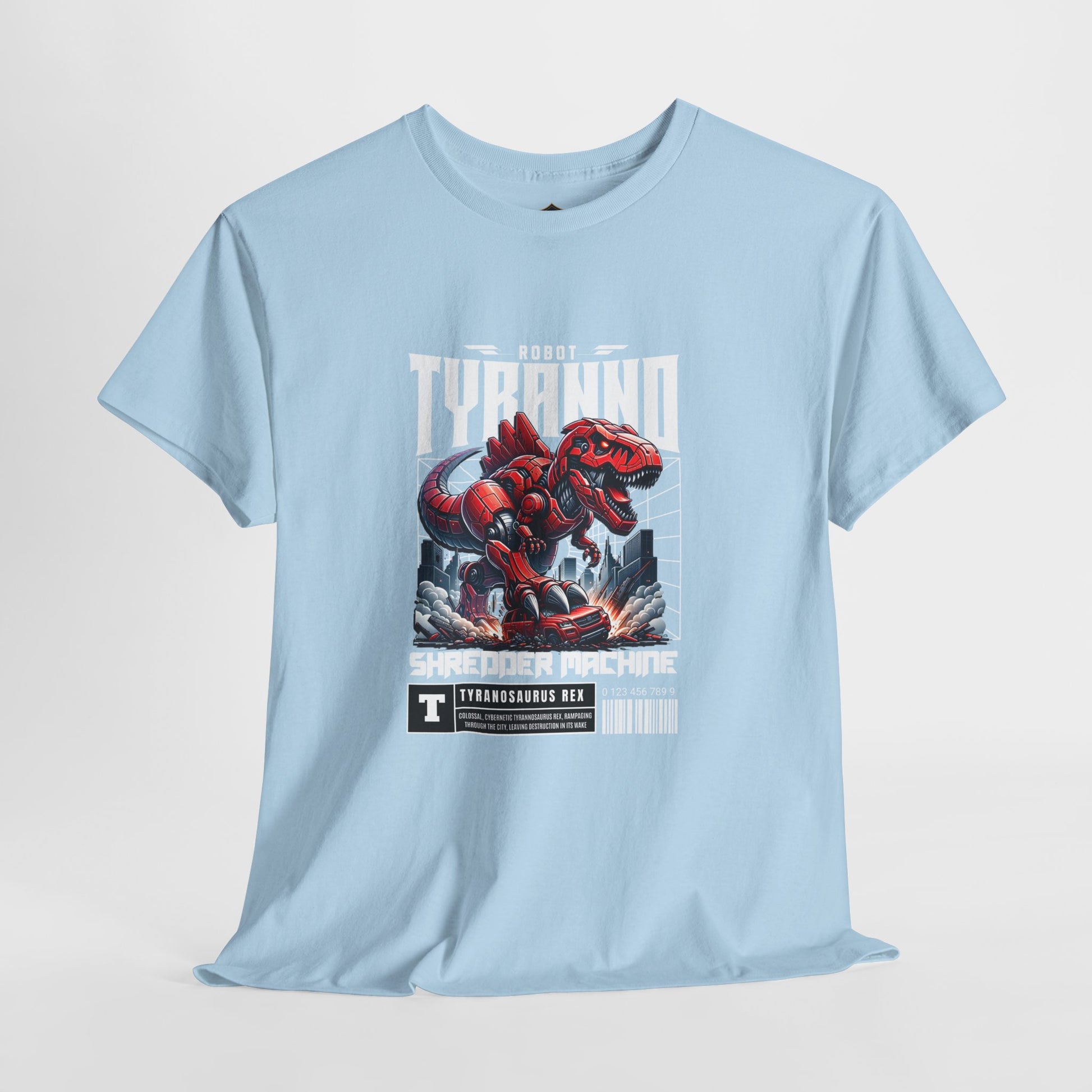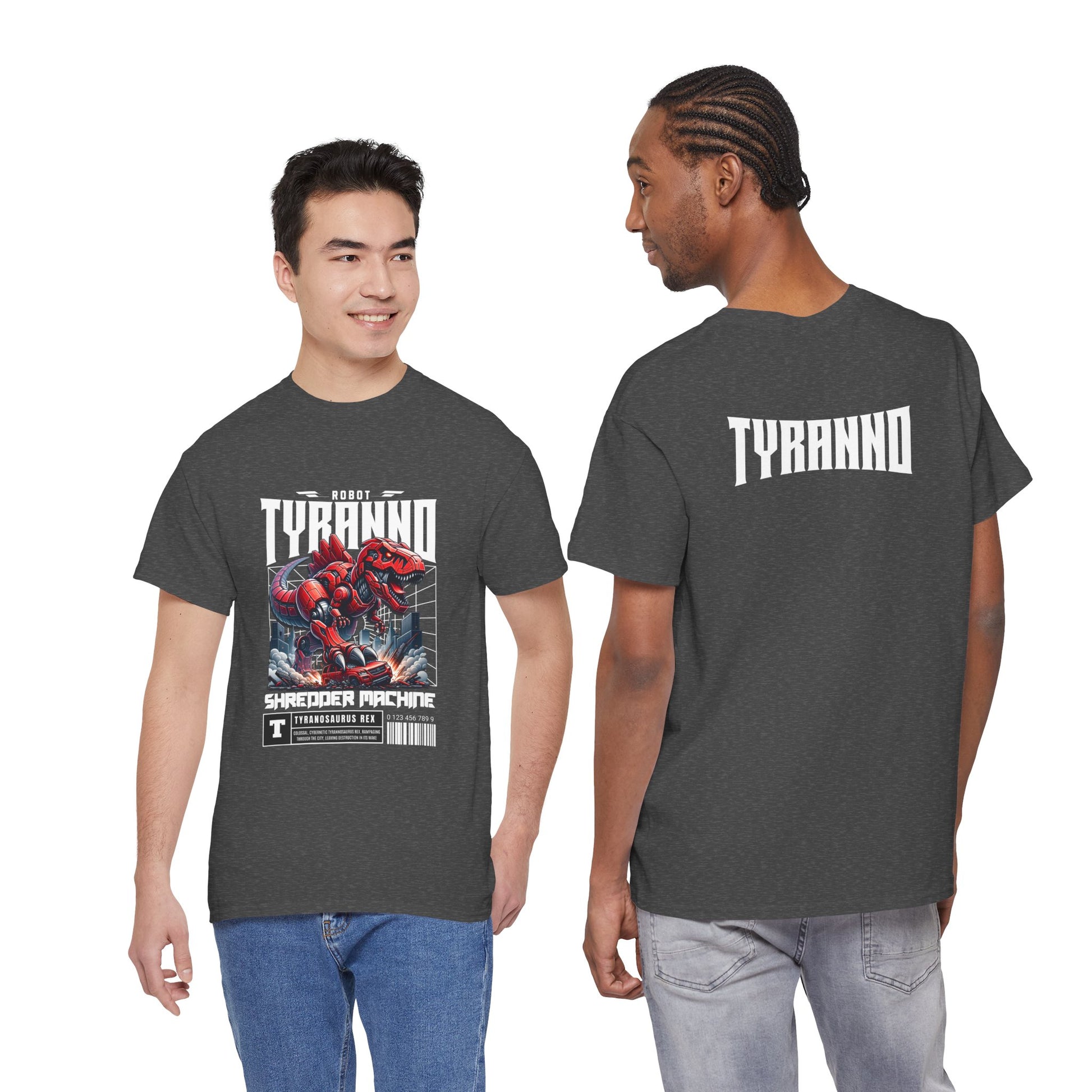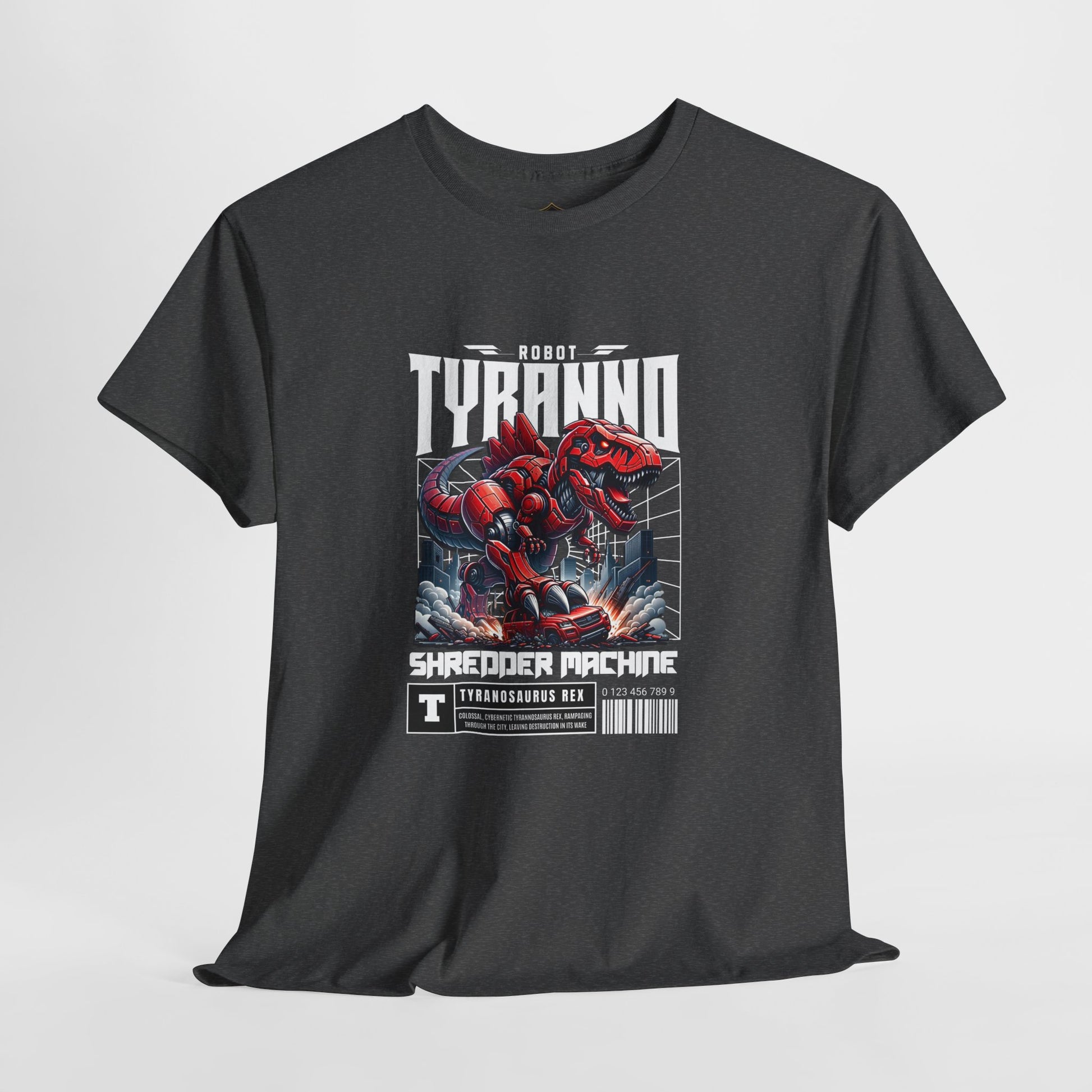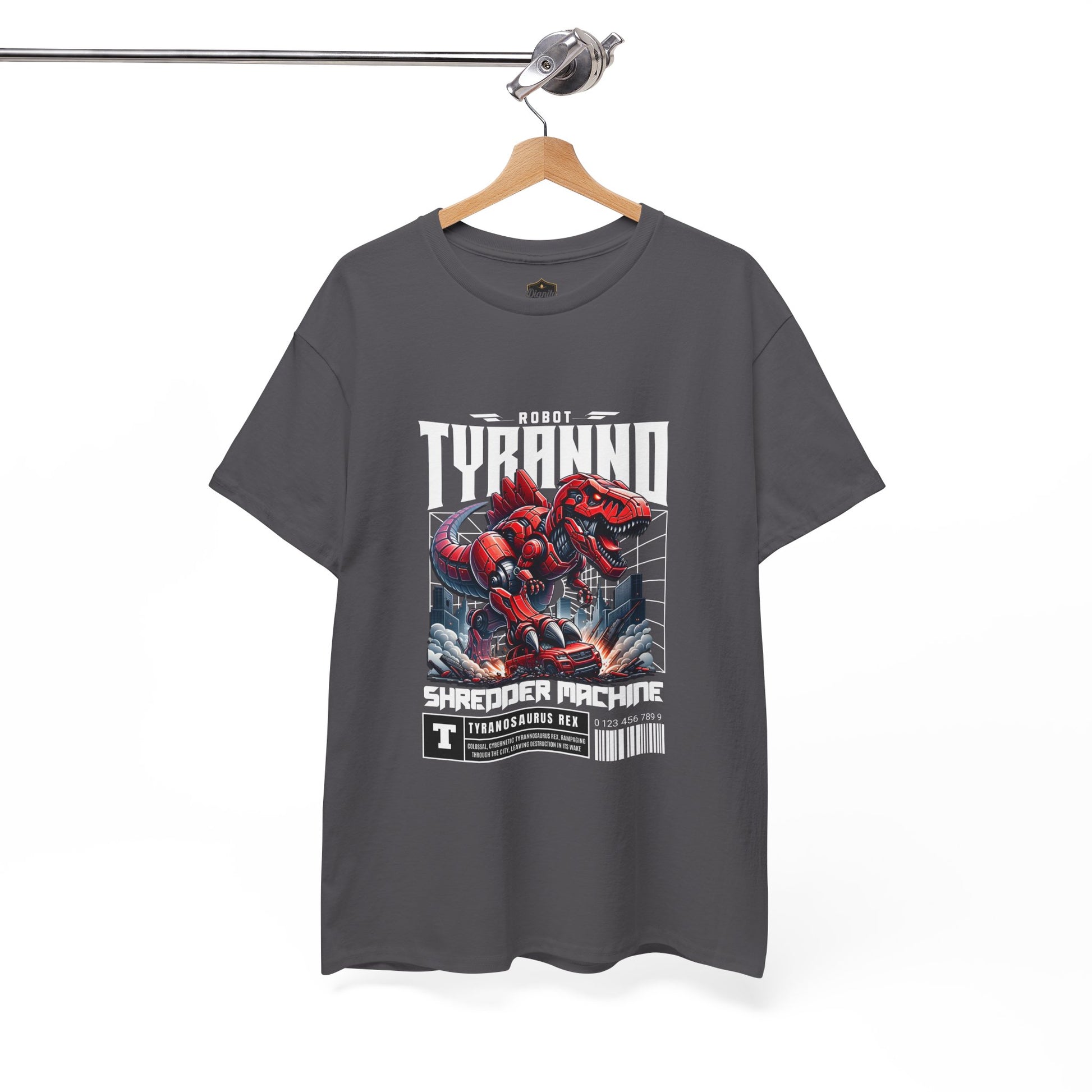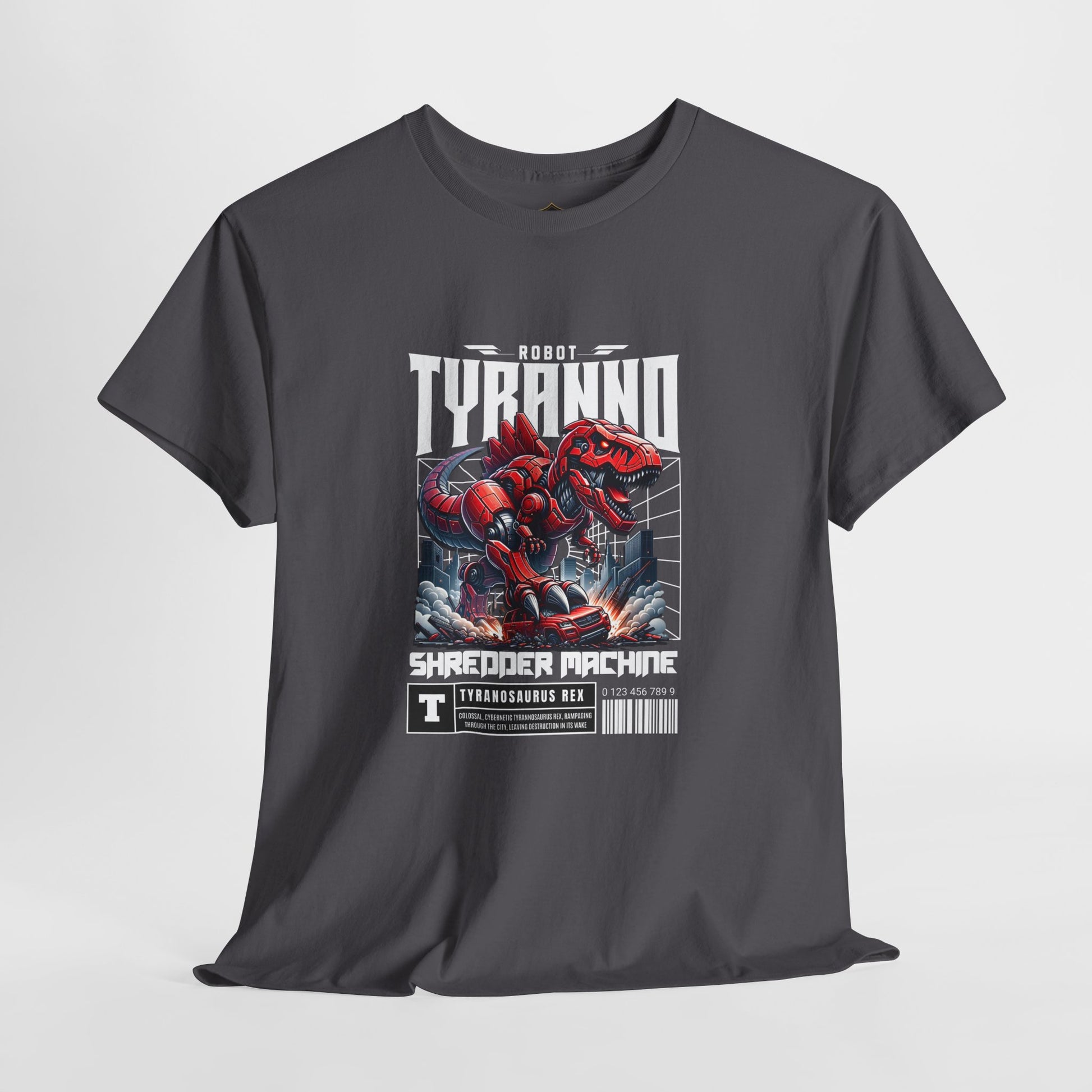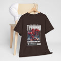 This heavyweight cotton tee brings loud, in-your-face energy to a casual wardrobe. A bold, illustrated centerpiece on the chest shows a chrome-clad Tyranno shredding through metal and sparks — retro arcade and metal-poster vibes collide. Clean, arched lettering on the upper back balances the front art so the shirt reads like a vintage concert or game-card collectible. The thicker 180 g/m² fabric and classic crew cut give it structure and a laid-back silhouette that wears well layered under a flannel or alone with distressed denim. Wear it to shows, game nights, or whenever you want apparel that feels like an anthem: gritty, graphic, and unapologetically loud.