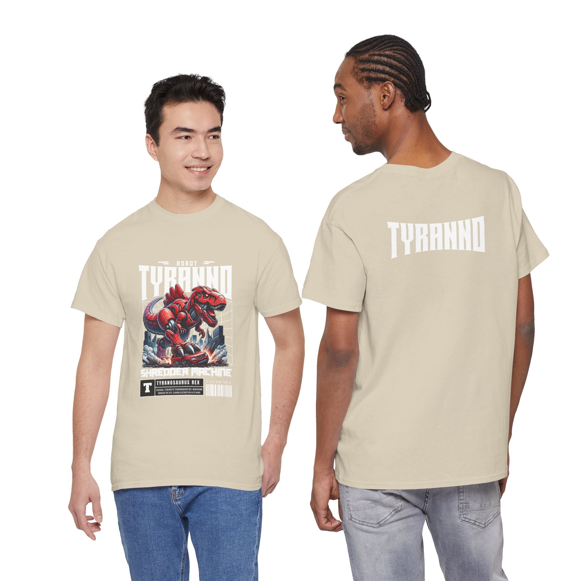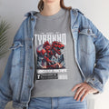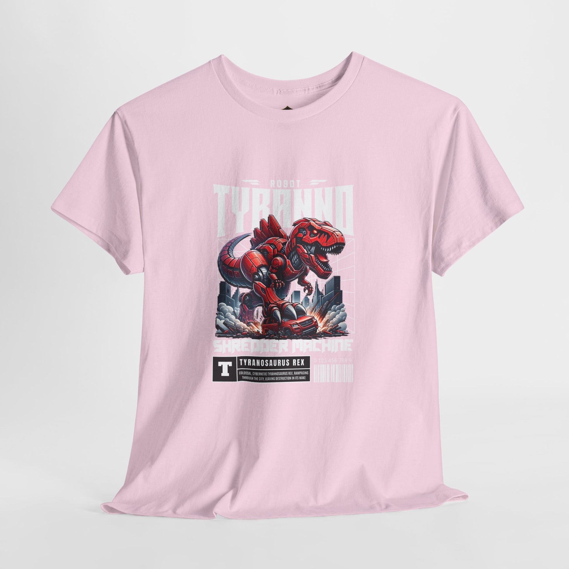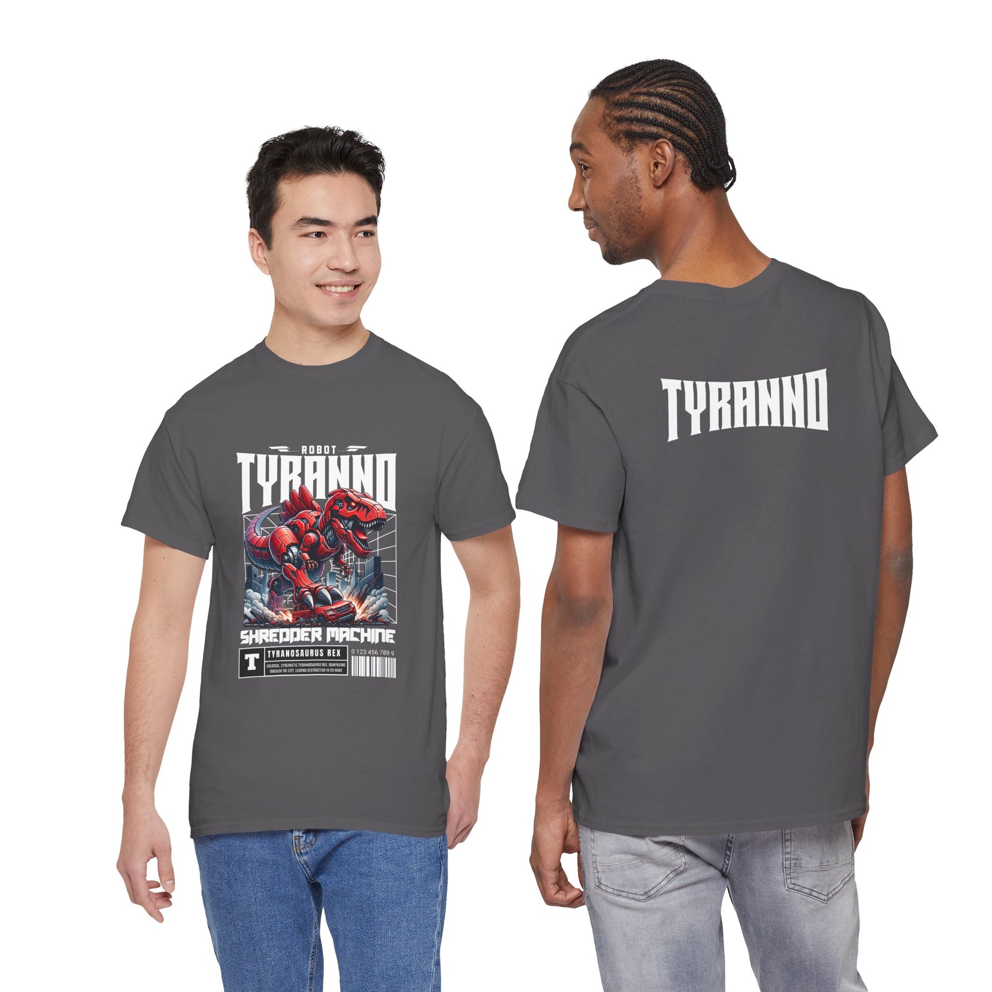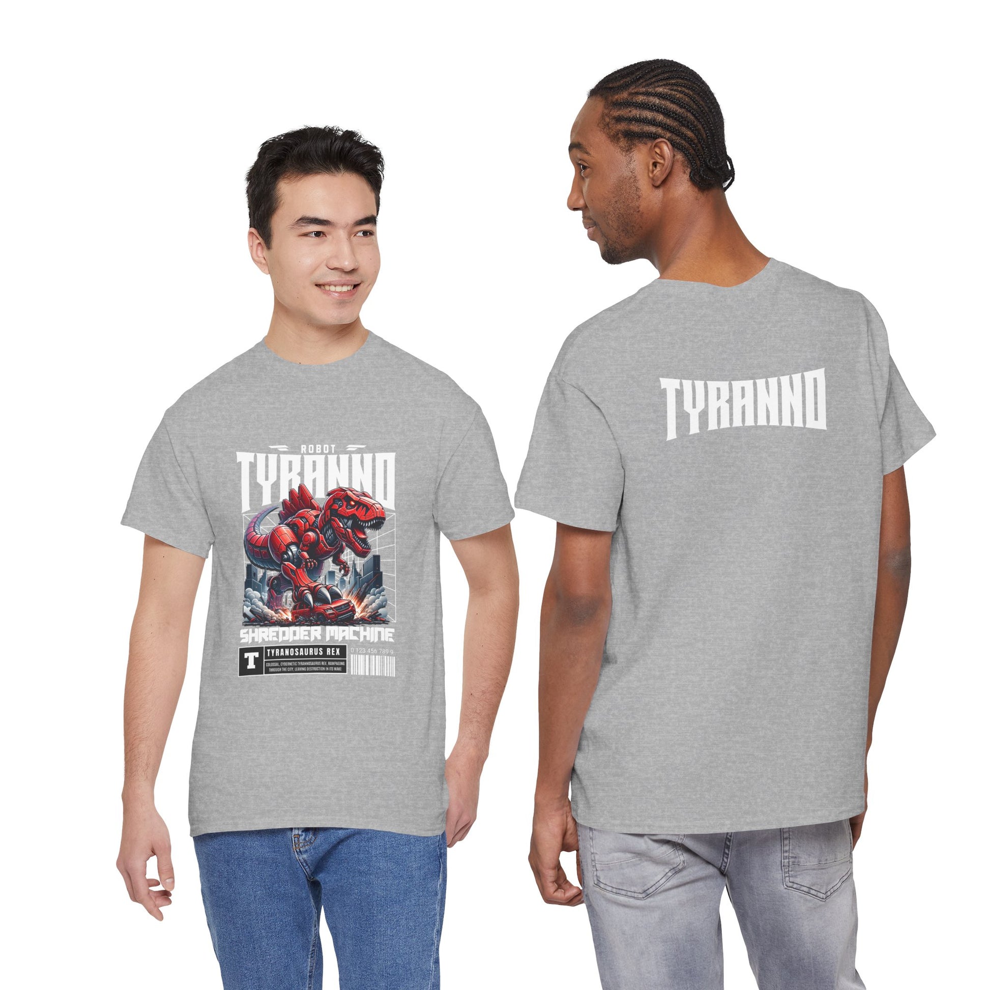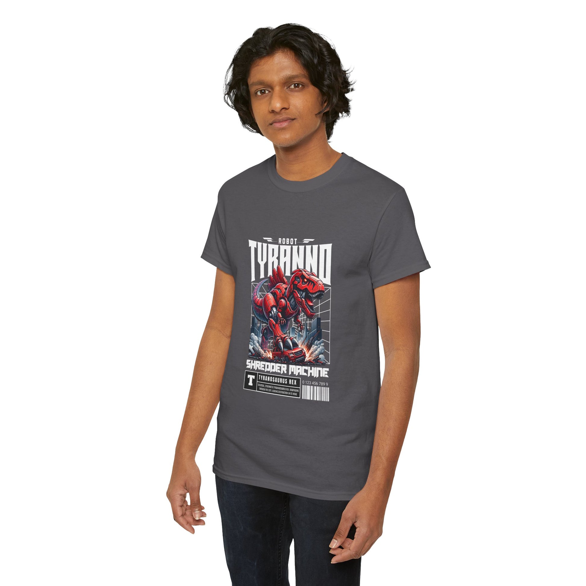 This heavyweight cotton tee brings loud, in-your-face energy to a casual wardrobe. A bold, illustrated centerpiece on the chest shows a chrome-clad Tyranno shredding through metal and sparks — retro arcade and metal-poster vibes collide. Clean, arched lettering on the upper back balances the front art so the shirt reads like a vintage concert or game-card collectible. The thicker 180 g/m² fabric and classic crew cut give it structure and a laid-back silhouette that wears well layered under a flannel or alone with distressed denim. Wear it to shows, game nights, or whenever you want apparel that feels like an anthem: gritty, graphic, and unapologetically loud.
