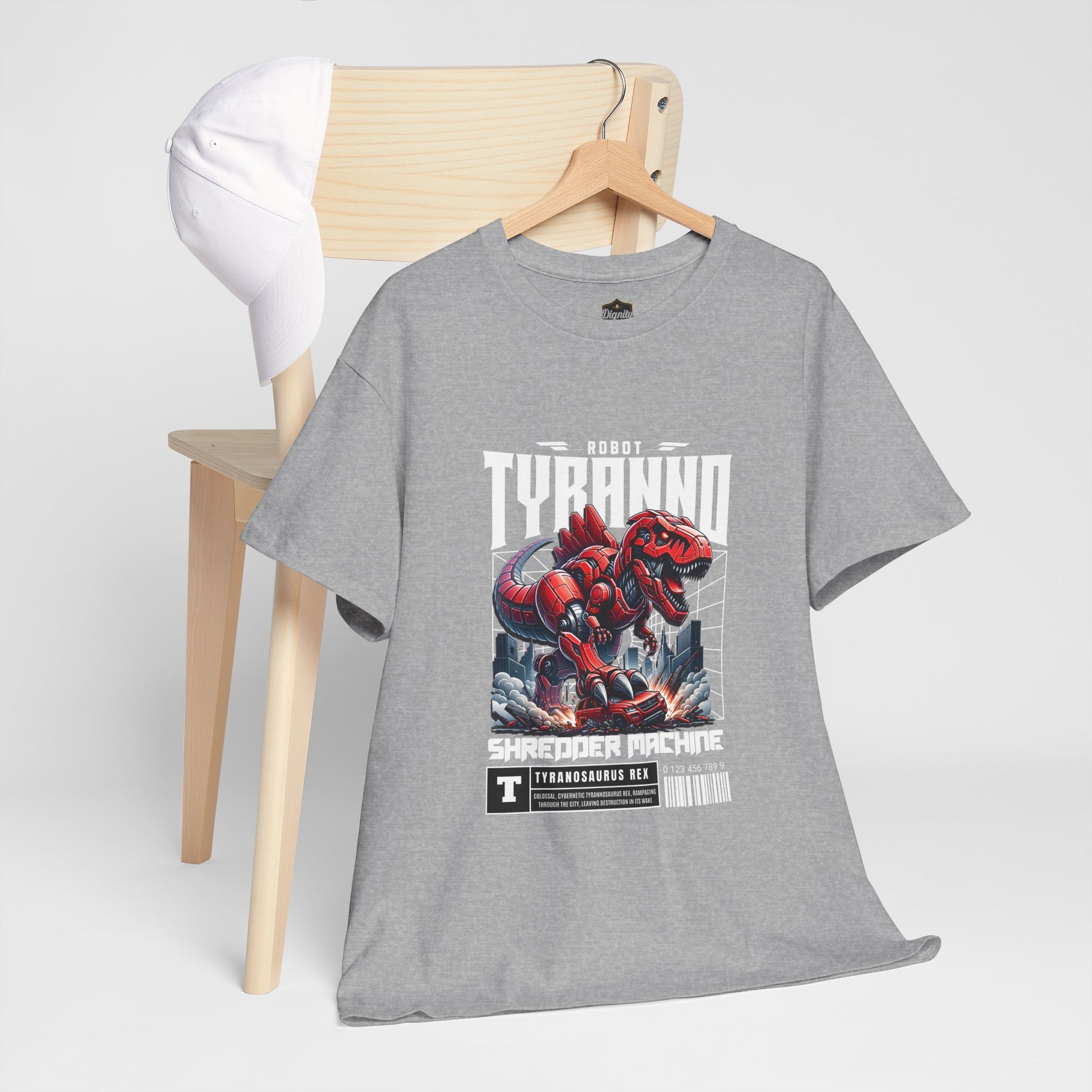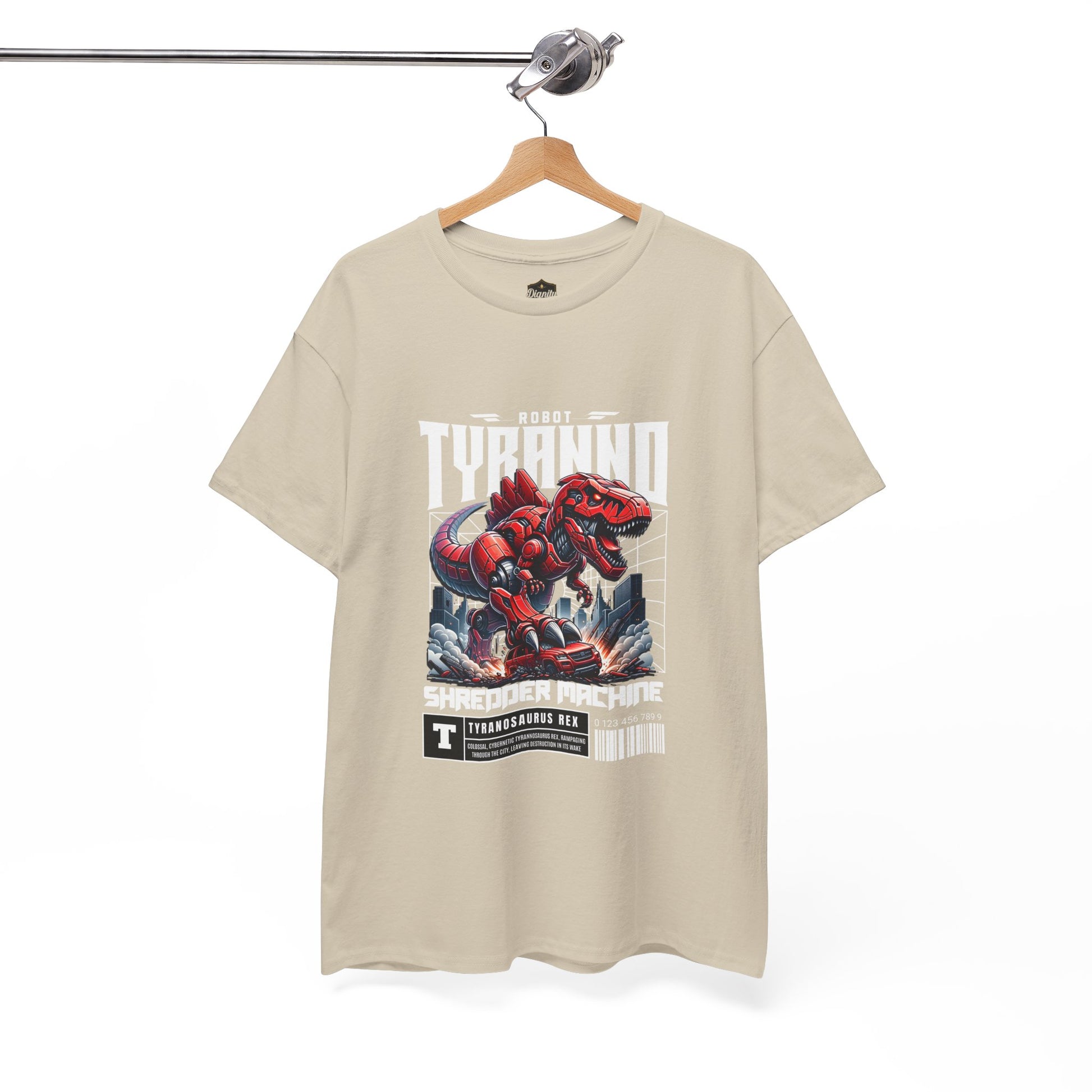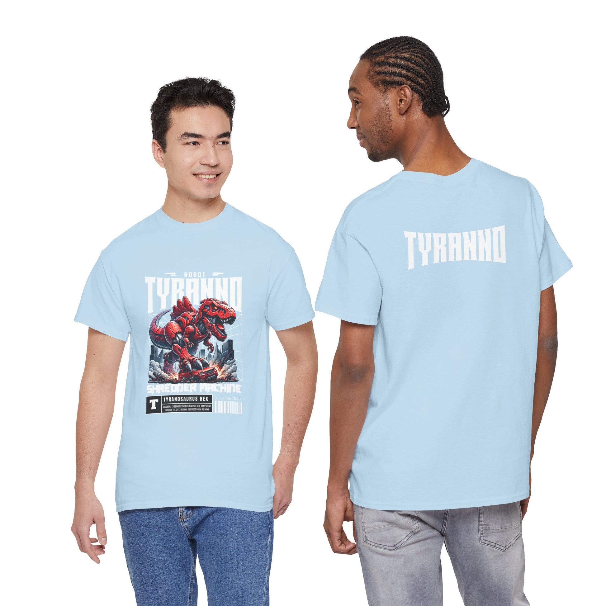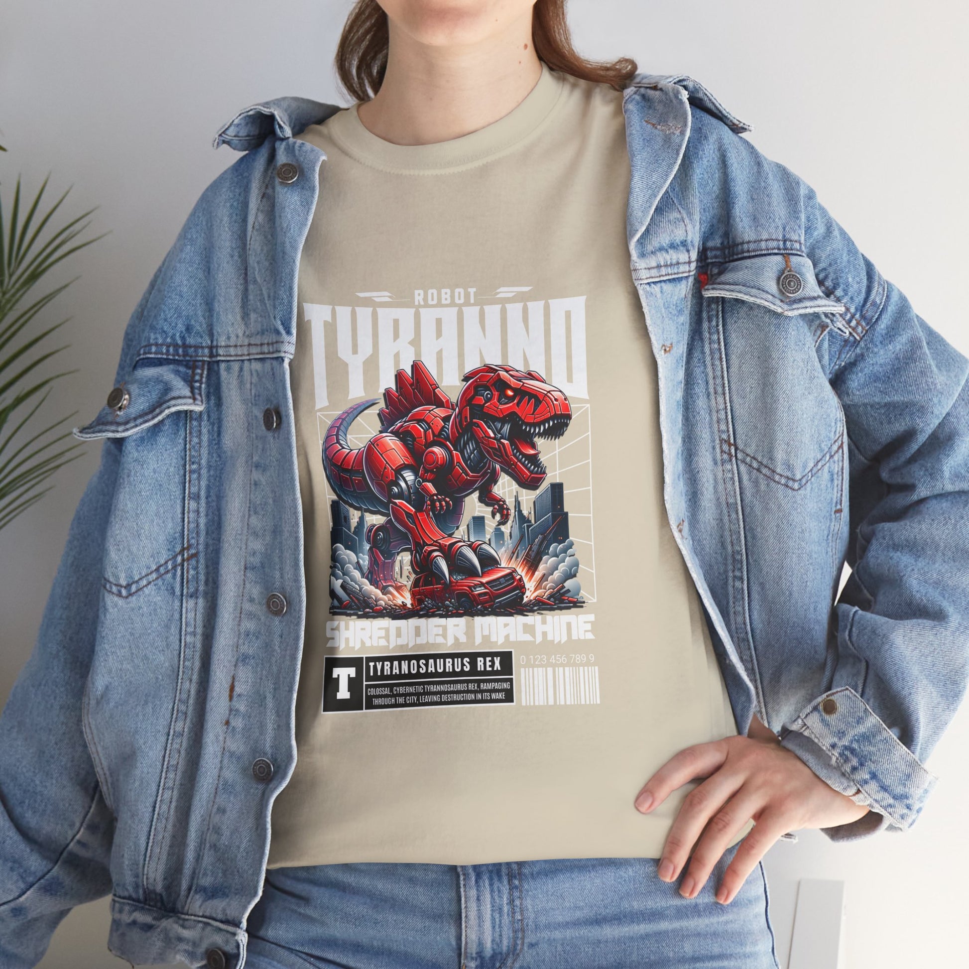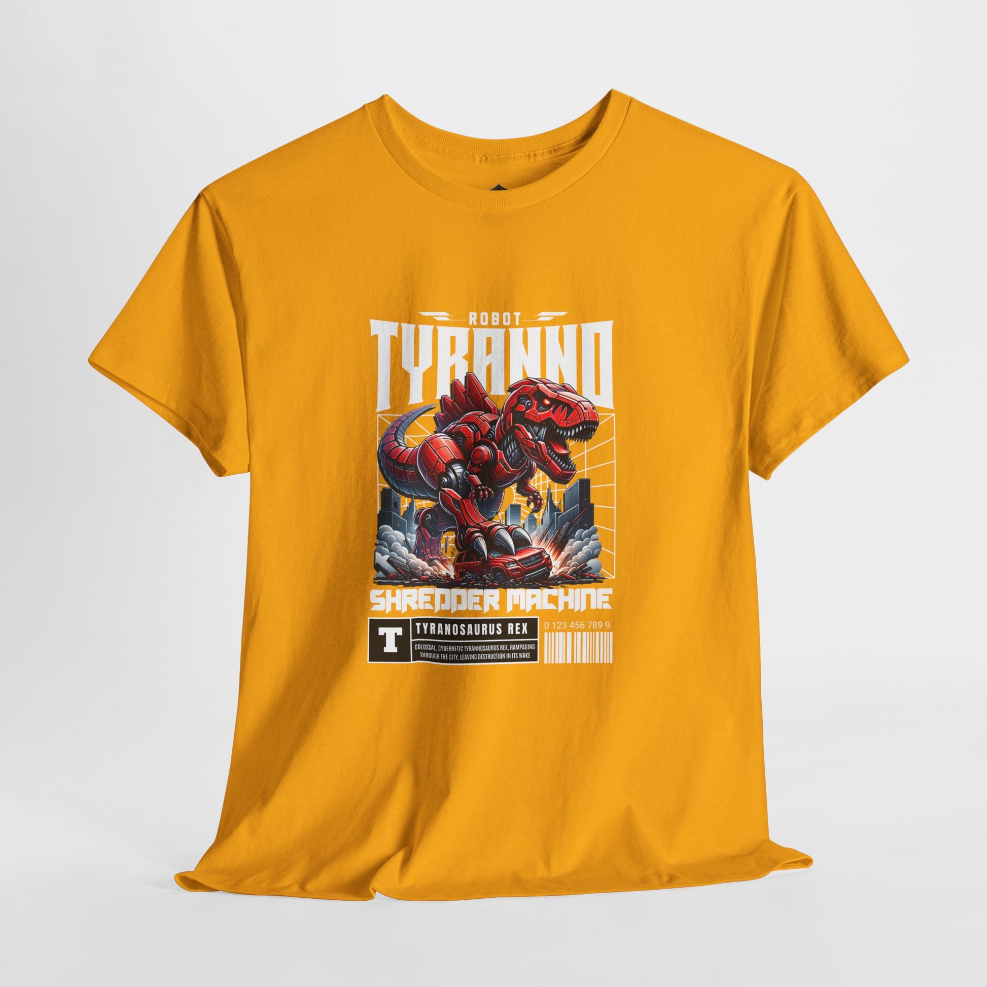 This heavyweight cotton tee brings loud, in-your-face energy to a casual wardrobe. A bold, illustrated centerpiece on the chest shows a chrome-clad Tyranno shredding through metal and sparks — retro arcade and metal-poster vibes collide. Clean, arched lettering on the upper back balances the front art so the shirt reads like a vintage concert or game-card collectible. The thicker 180 g/m² fabric and classic crew cut give it structure and a laid-back silhouette that wears well layered under a flannel or alone with distressed denim. Wear it to shows, game nights, or whenever you want apparel that feels like an anthem: gritty, graphic, and unapologetically loud.