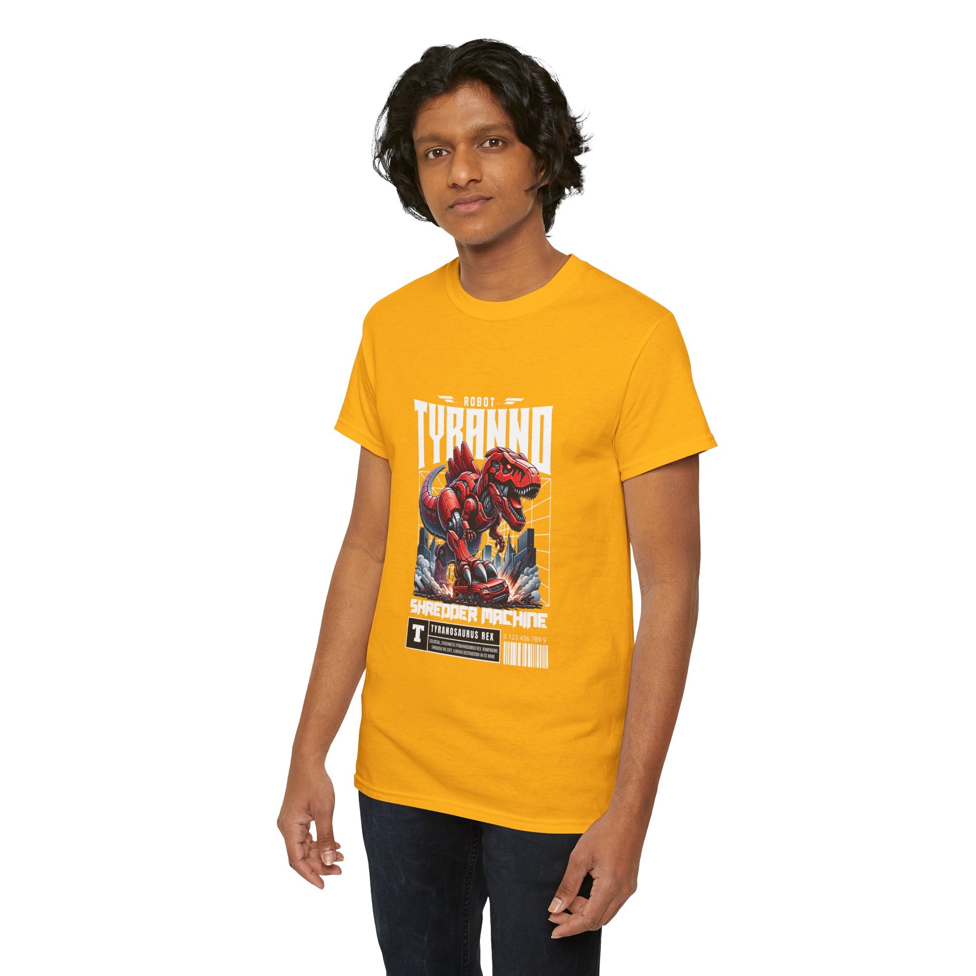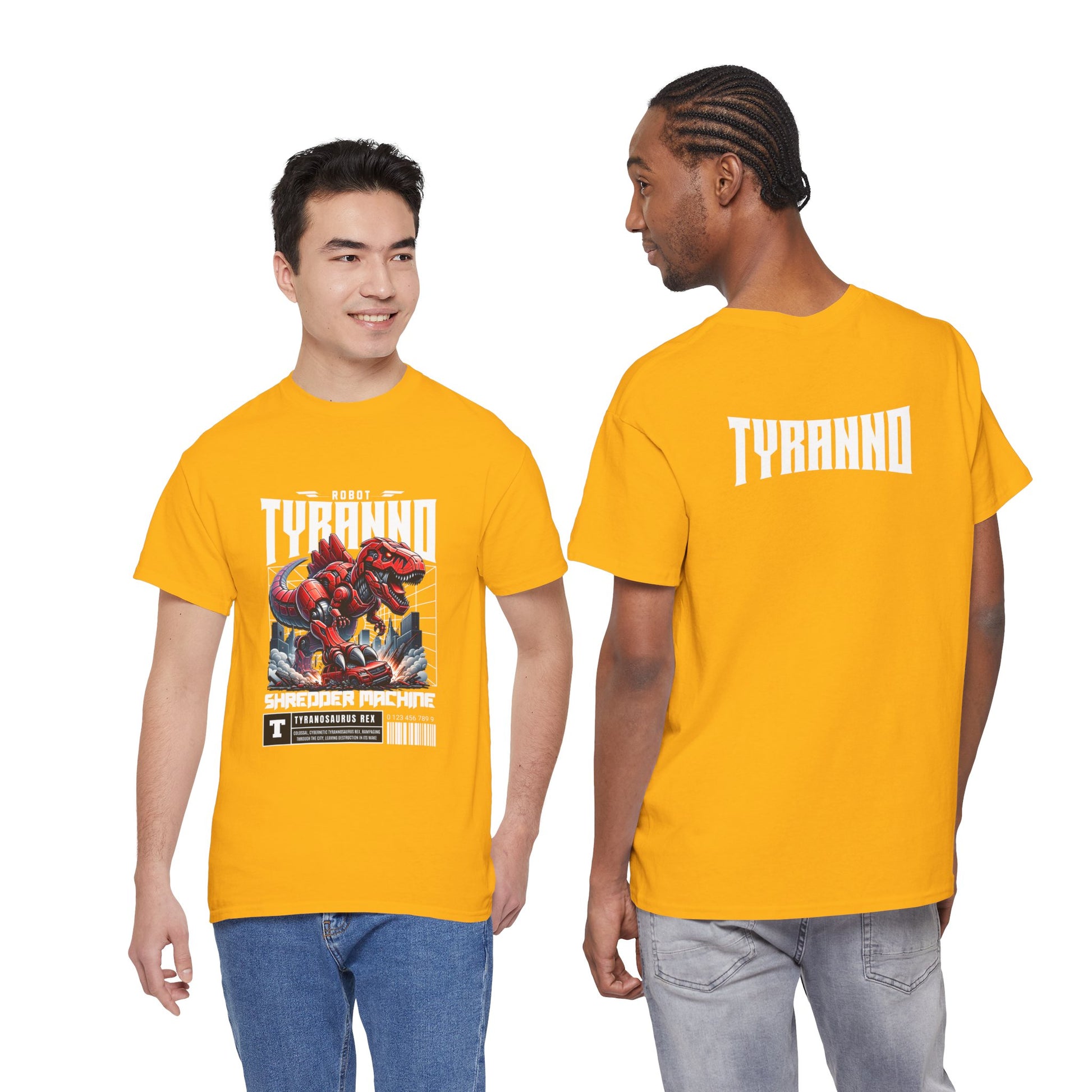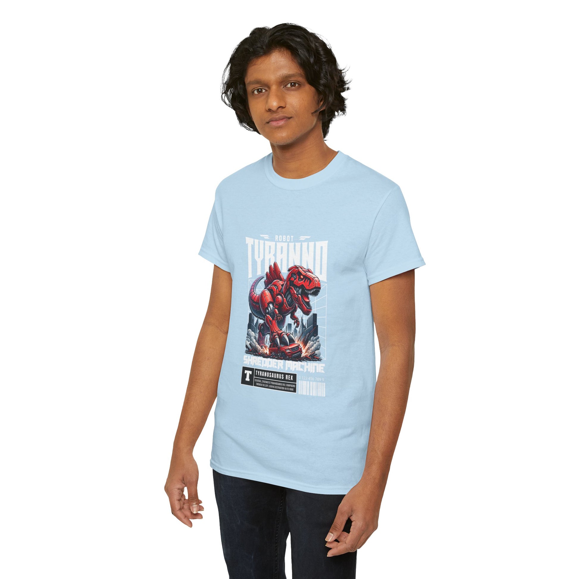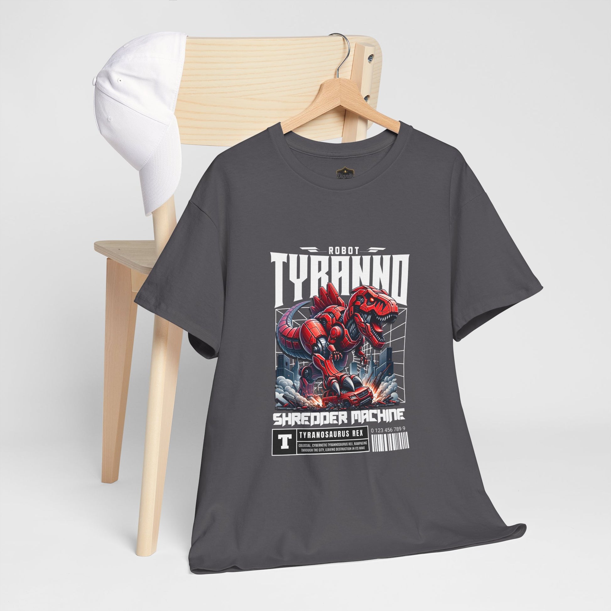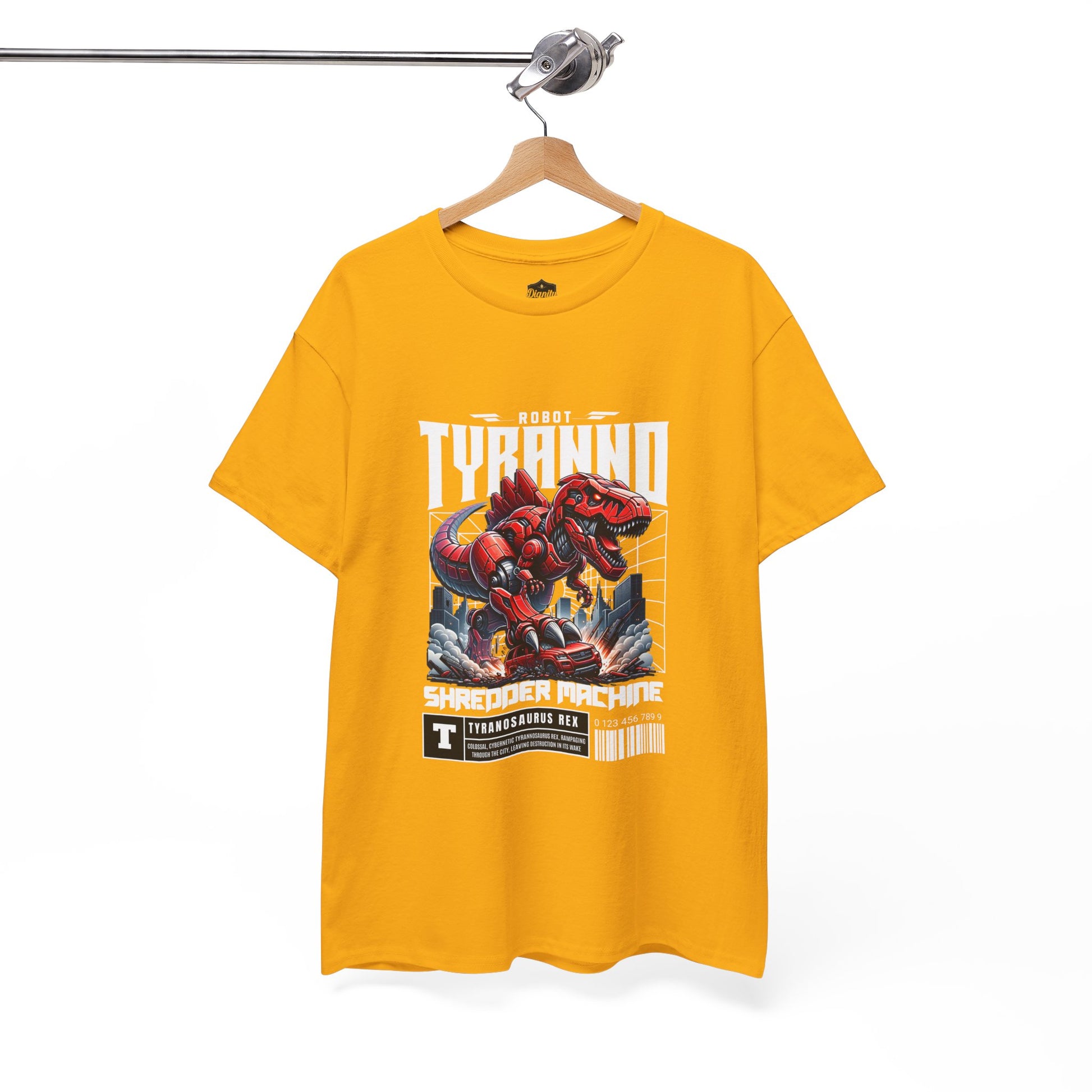 This heavyweight cotton tee brings loud, in-your-face energy to a casual wardrobe. A bold, illustrated centerpiece on the chest shows a chrome-clad Tyranno shredding through metal and sparks — retro arcade and metal-poster vibes collide. Clean, arched lettering on the upper back balances the front art so the shirt reads like a vintage concert or game-card collectible. The thicker 180 g/m² fabric and classic crew cut give it structure and a laid-back silhouette that wears well layered under a flannel or alone with distressed denim. Wear it to shows, game nights, or whenever you want apparel that feels like an anthem: gritty, graphic, and unapologetically loud.